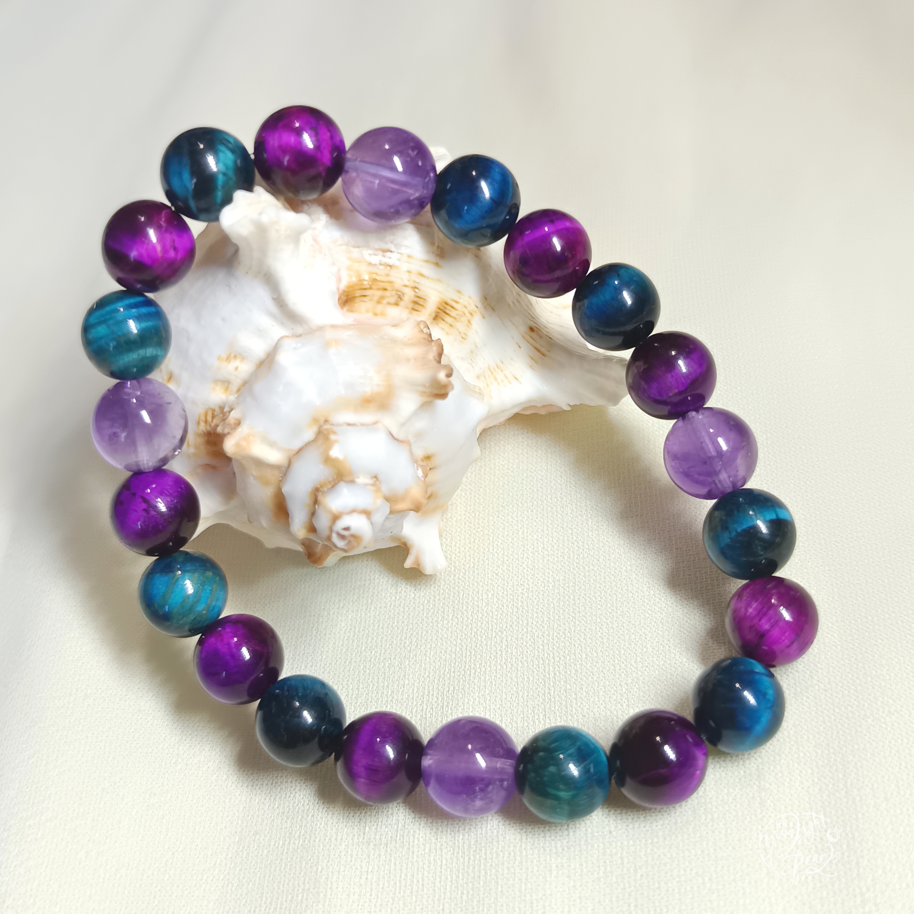天然藍/紫虎眼石+紫水晶暮光森林彈力手鍊