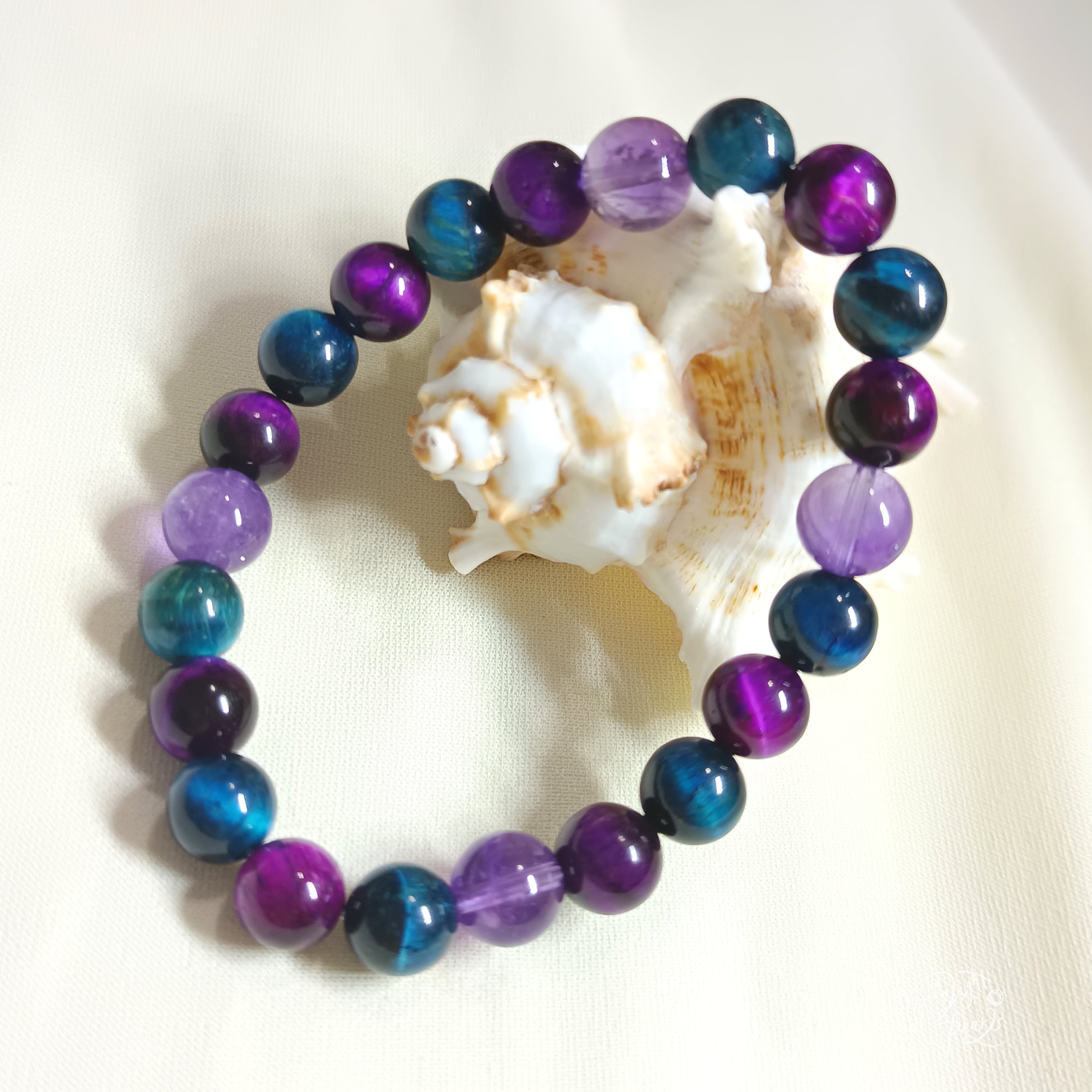 水晶尺寸8mm 手鍊適合手圍16-17cm(亦可私信店主改長度) 天然紫色/藍色虎眼拼紫水晶,色系繽紛冷豔,日常配衫百搭,戴上手時尚又個性👍