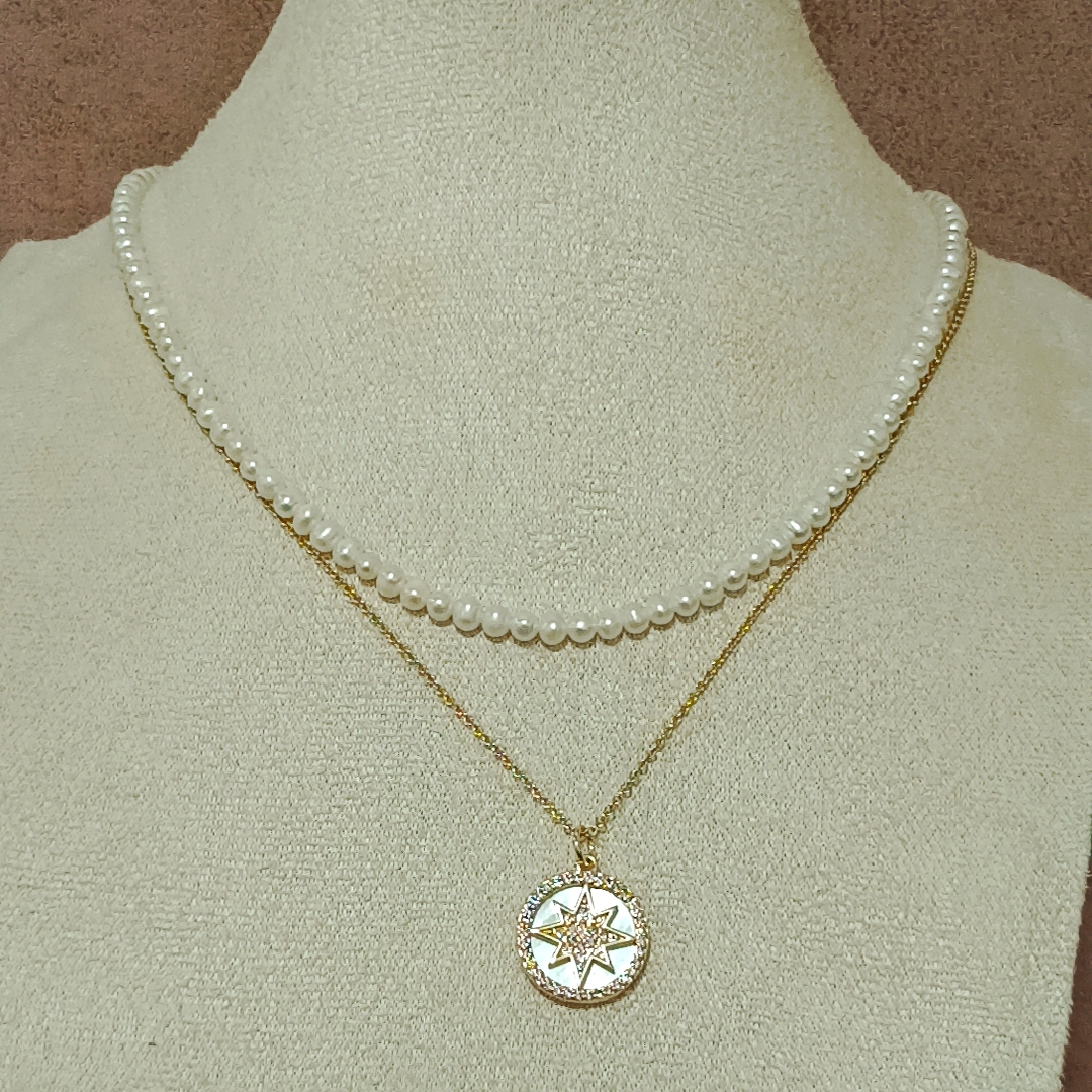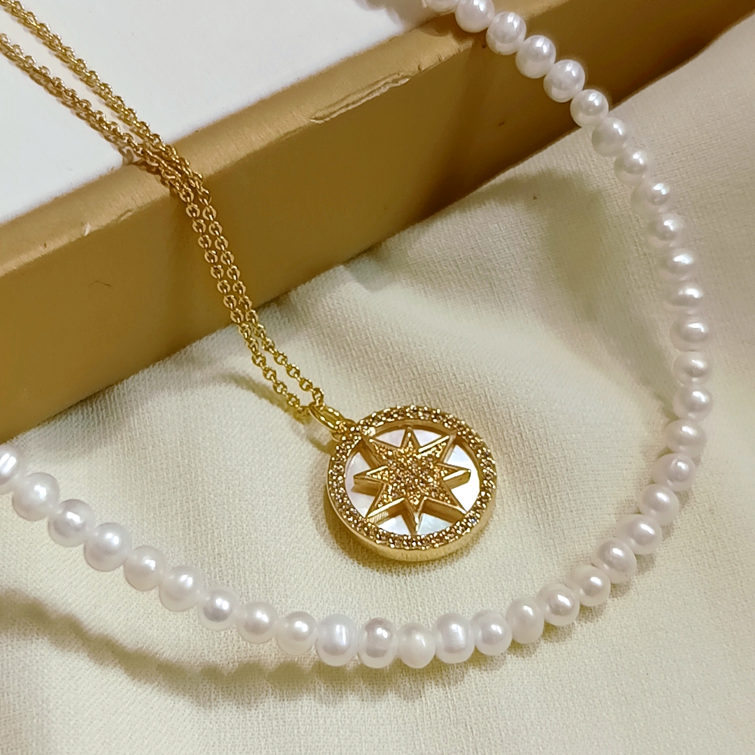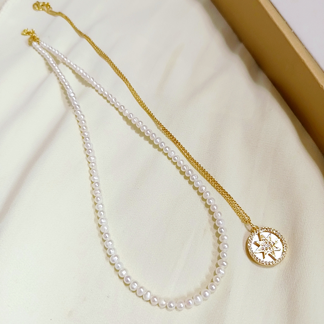 新貨促銷‼️近圓強光淡水無核baby珍珠鎖骨鍊+貝殼六芒星吊墜套鍊