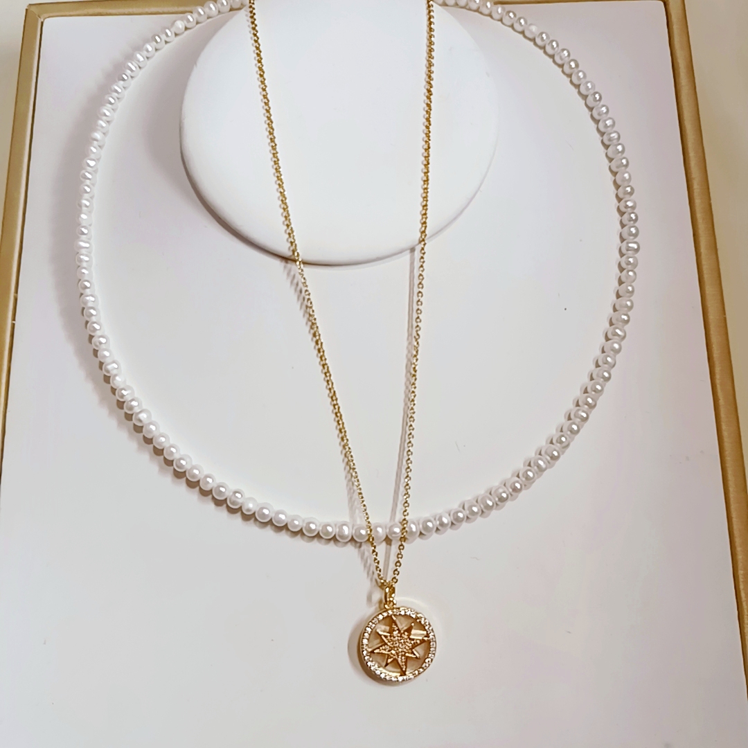 珍珠尺寸3-4mm 珍珠鍊長度40+5cm尾鍊 六芒星套鍊長度45cm 近圓強光淡水baby珍珠,細微瑕,配六芒星套鍊,可單戴疊戴,佩戴時尚甜美氣質!