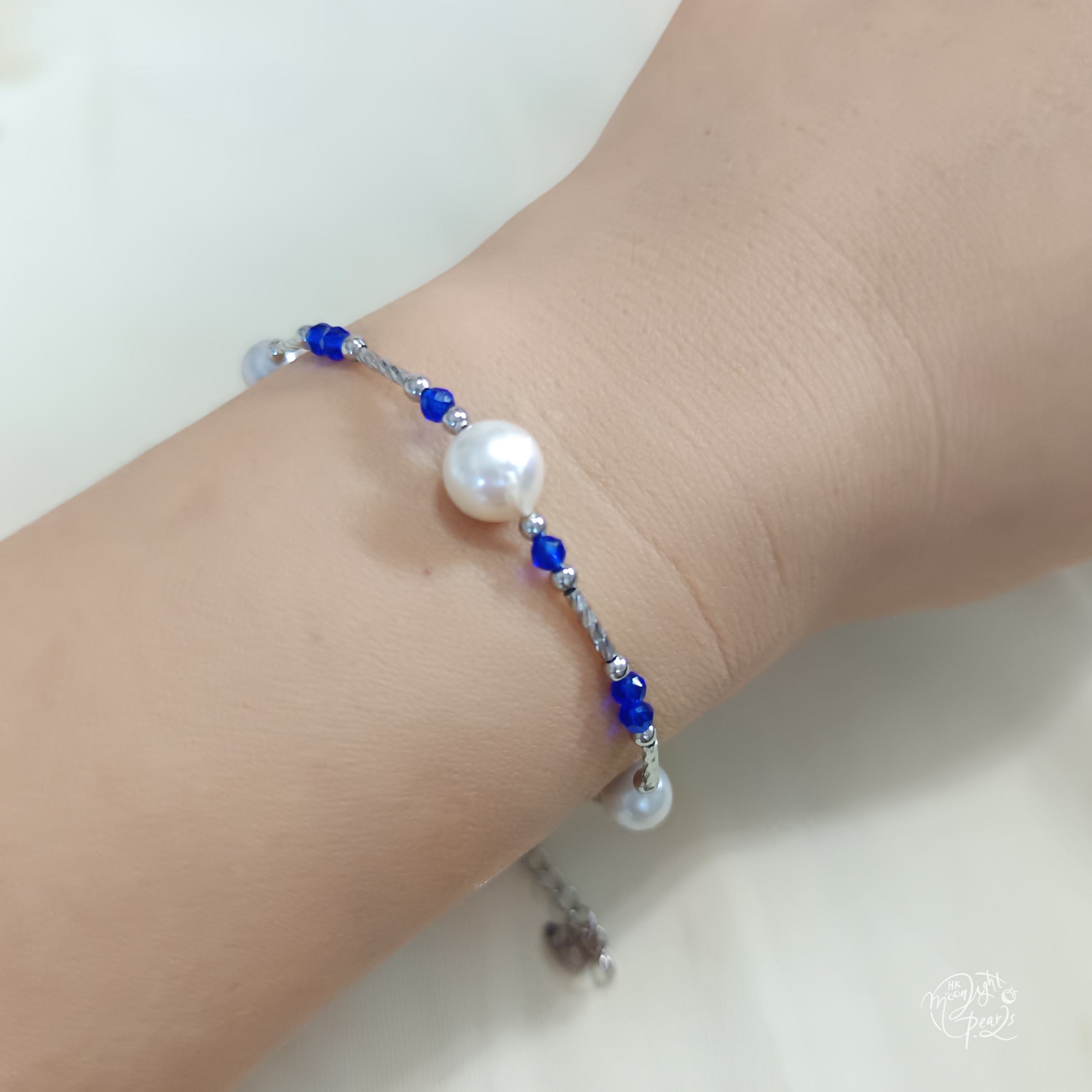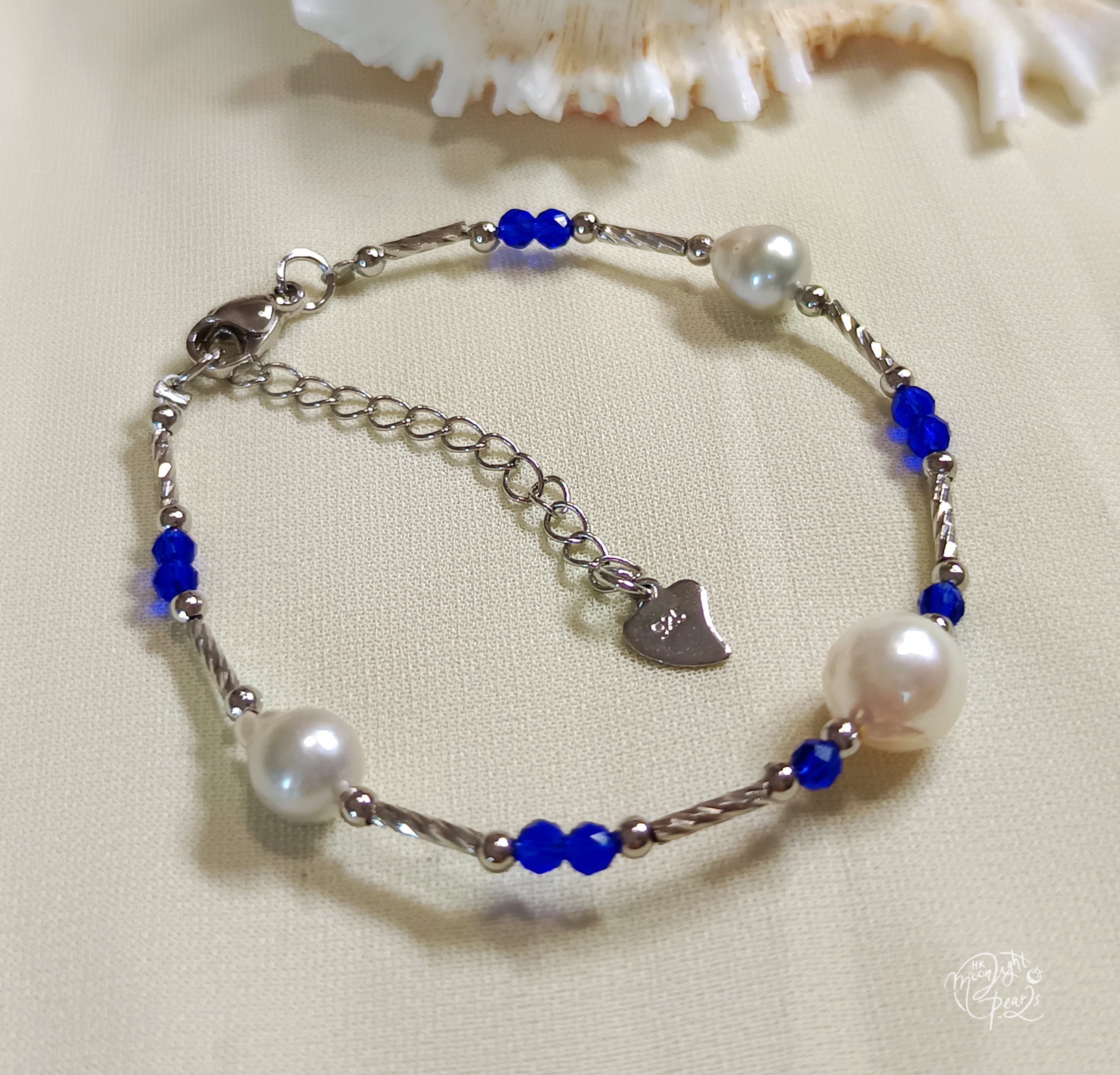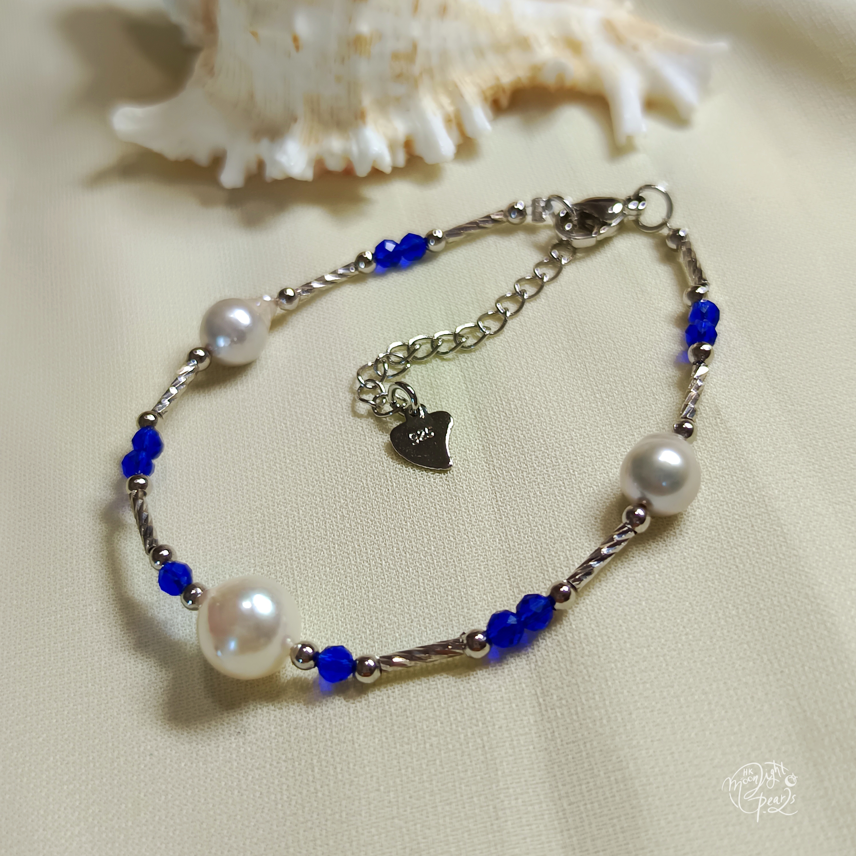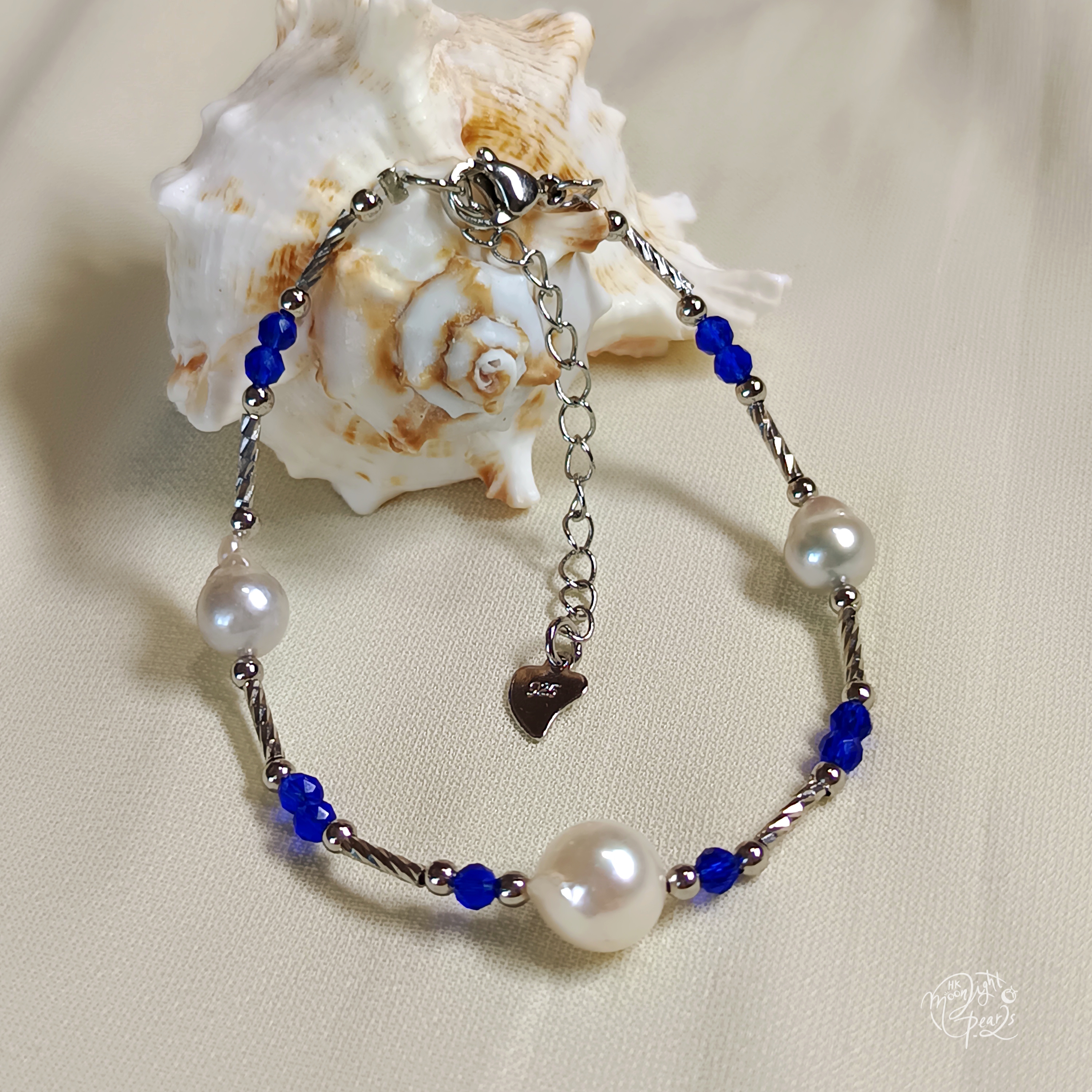 珍珠尺寸6-7mm,8-9mm 尖晶石尺寸3mm 手鍊長度16+5cm尾鍊 日本akoya 巴洛克海水珍珠,皮滑珠光亮,配深藍尖晶石,色系時尚,上手甜美氣質