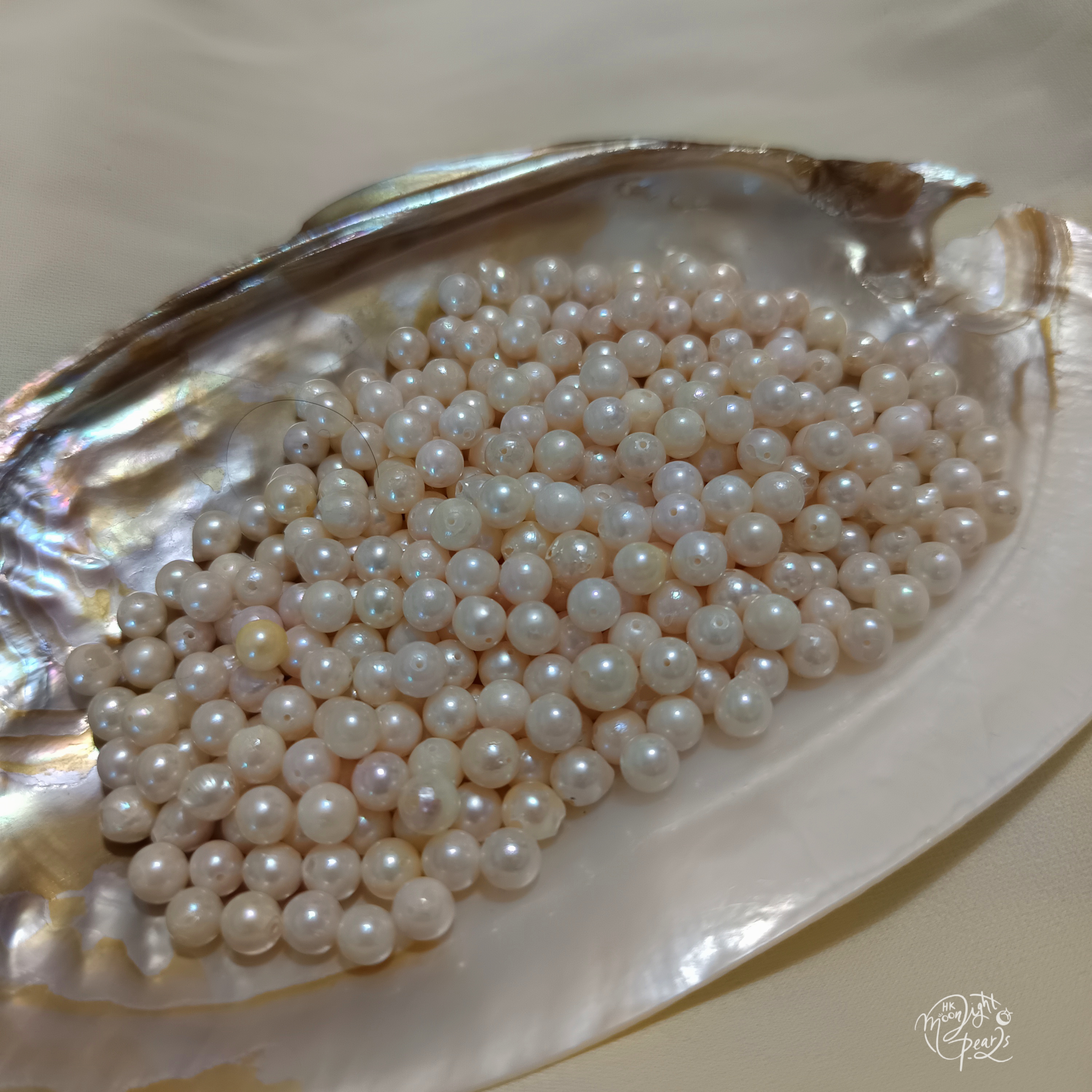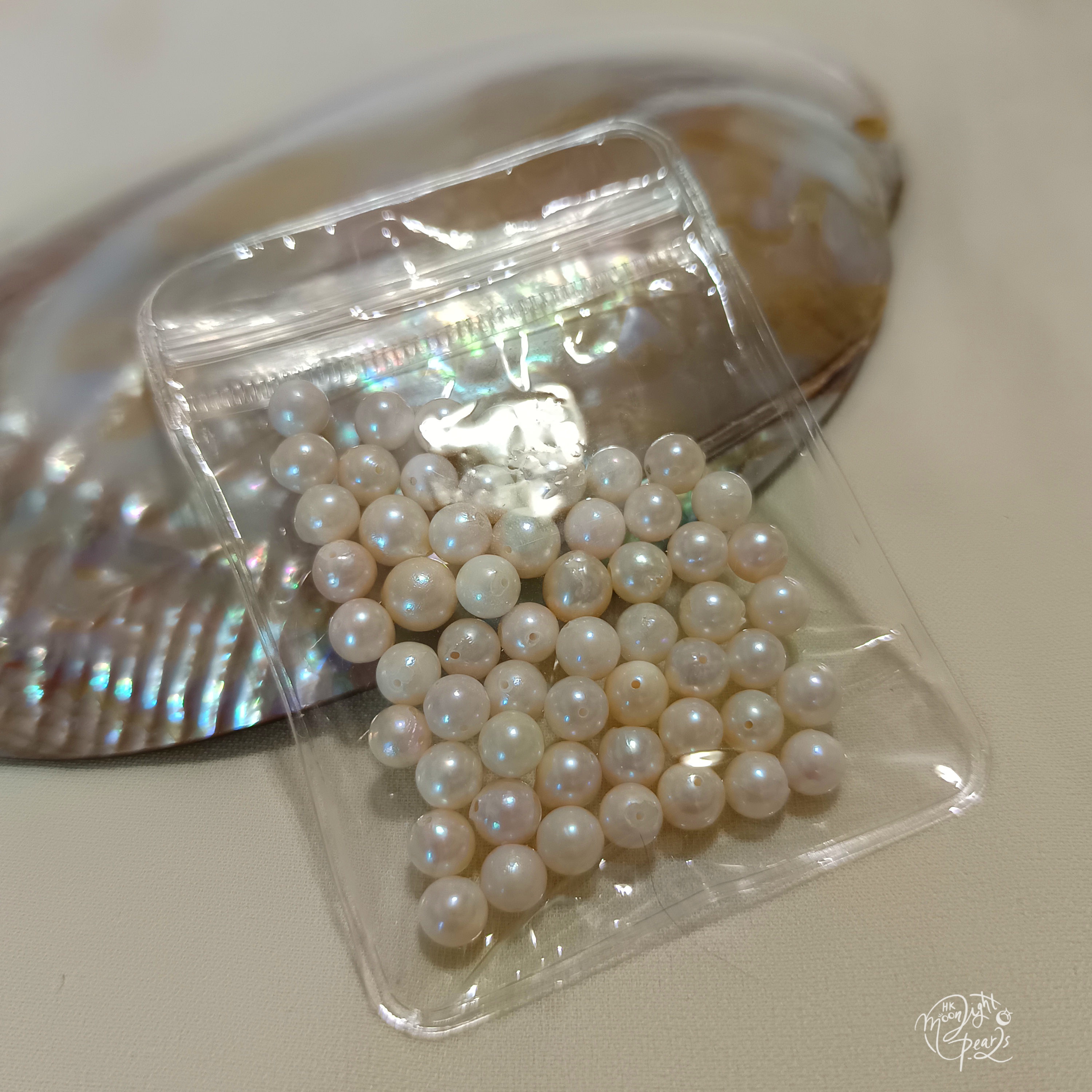 珍珠尺寸5-6mm左右 日本akoya海水珍珠,大部份正圓,少量尖頭珠,偏粉光,珠層薄,部分微瑕疵,一包50粒,再額外送5粒,珍珠已打好通孔,可直接DIY手鍊項鍊等。