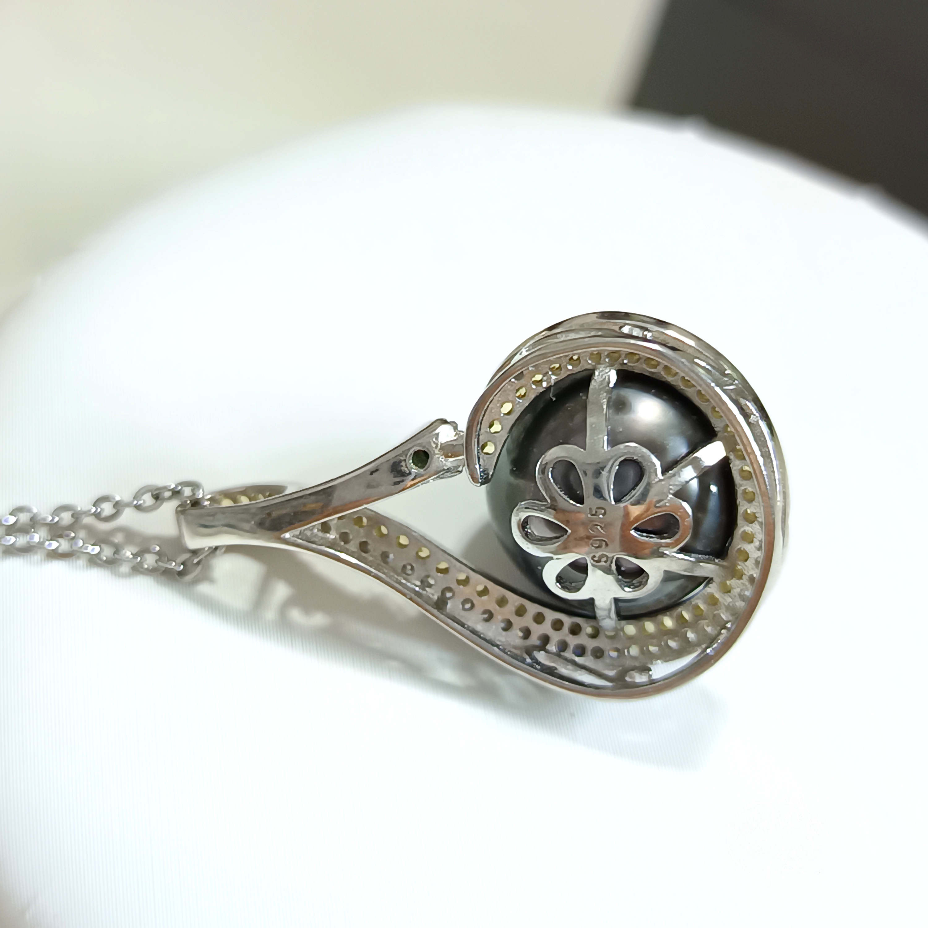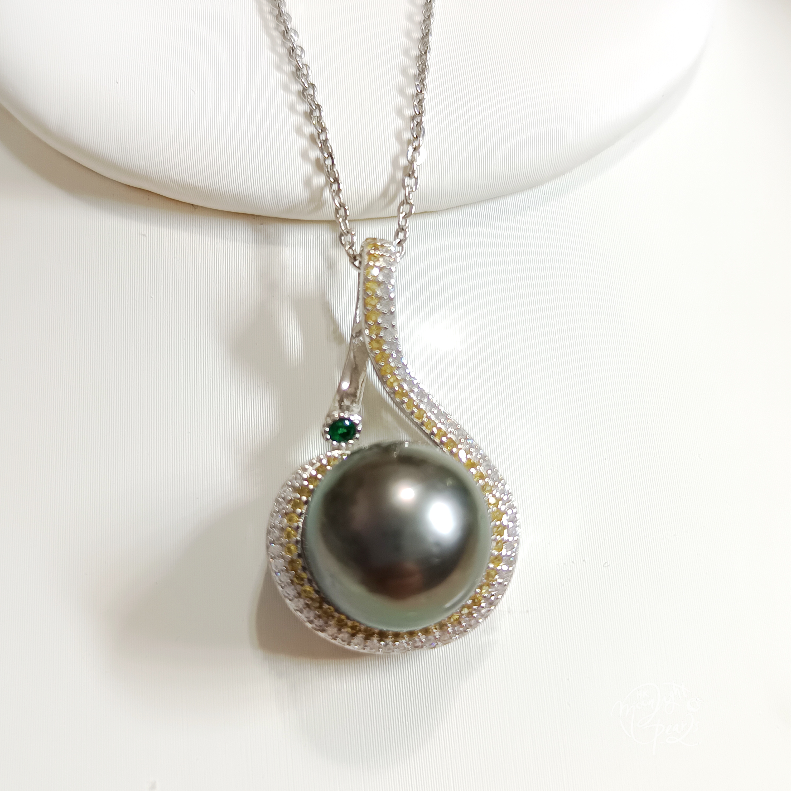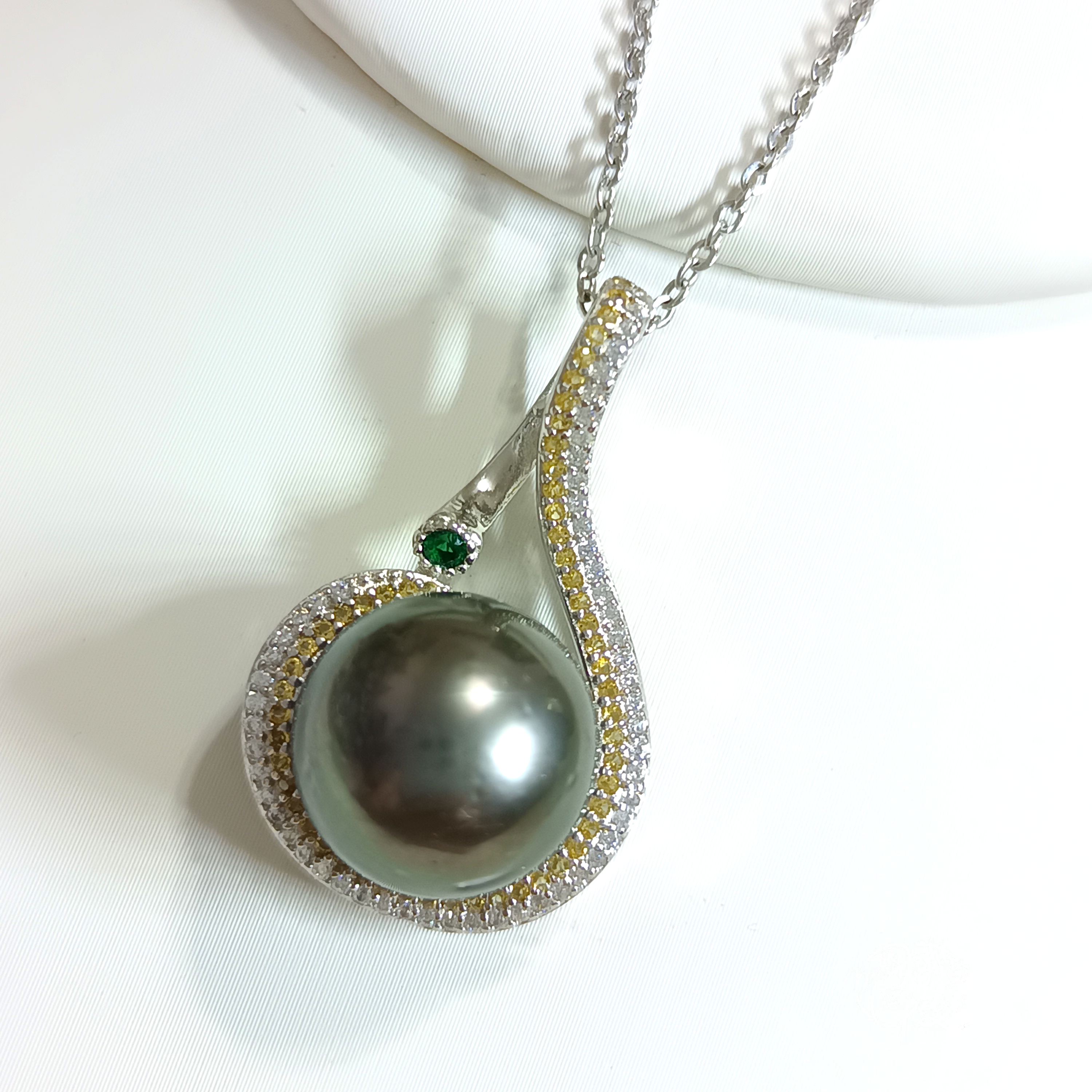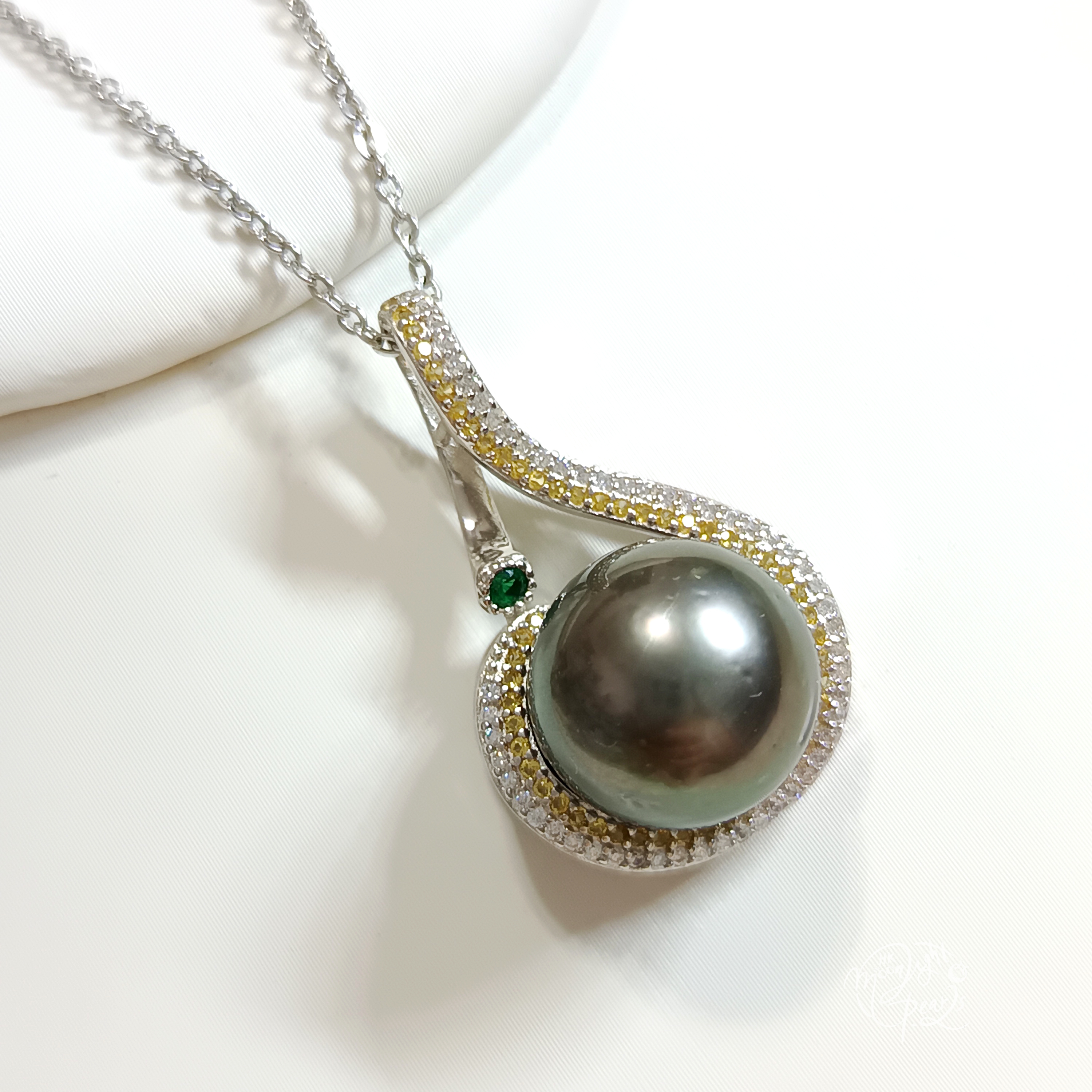正圓強光大溪地孔雀綠海水珍珠精工s925銀微鑲鋯石吊墜(送注白金鍊)