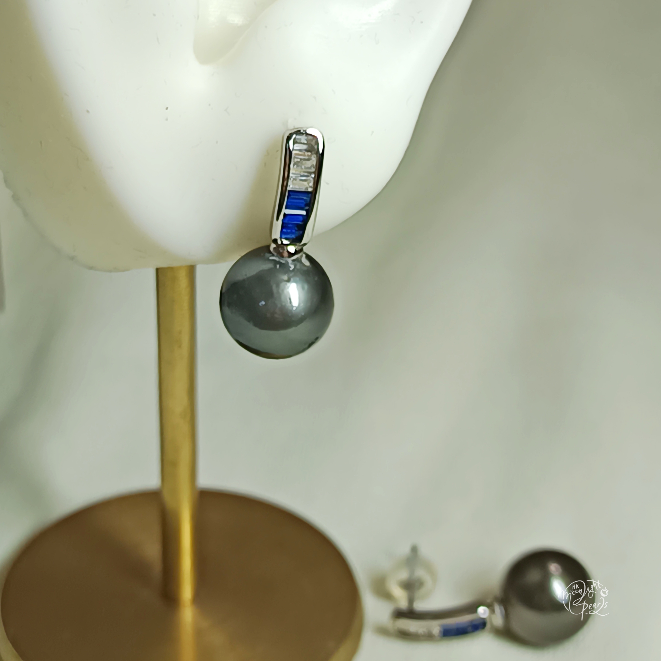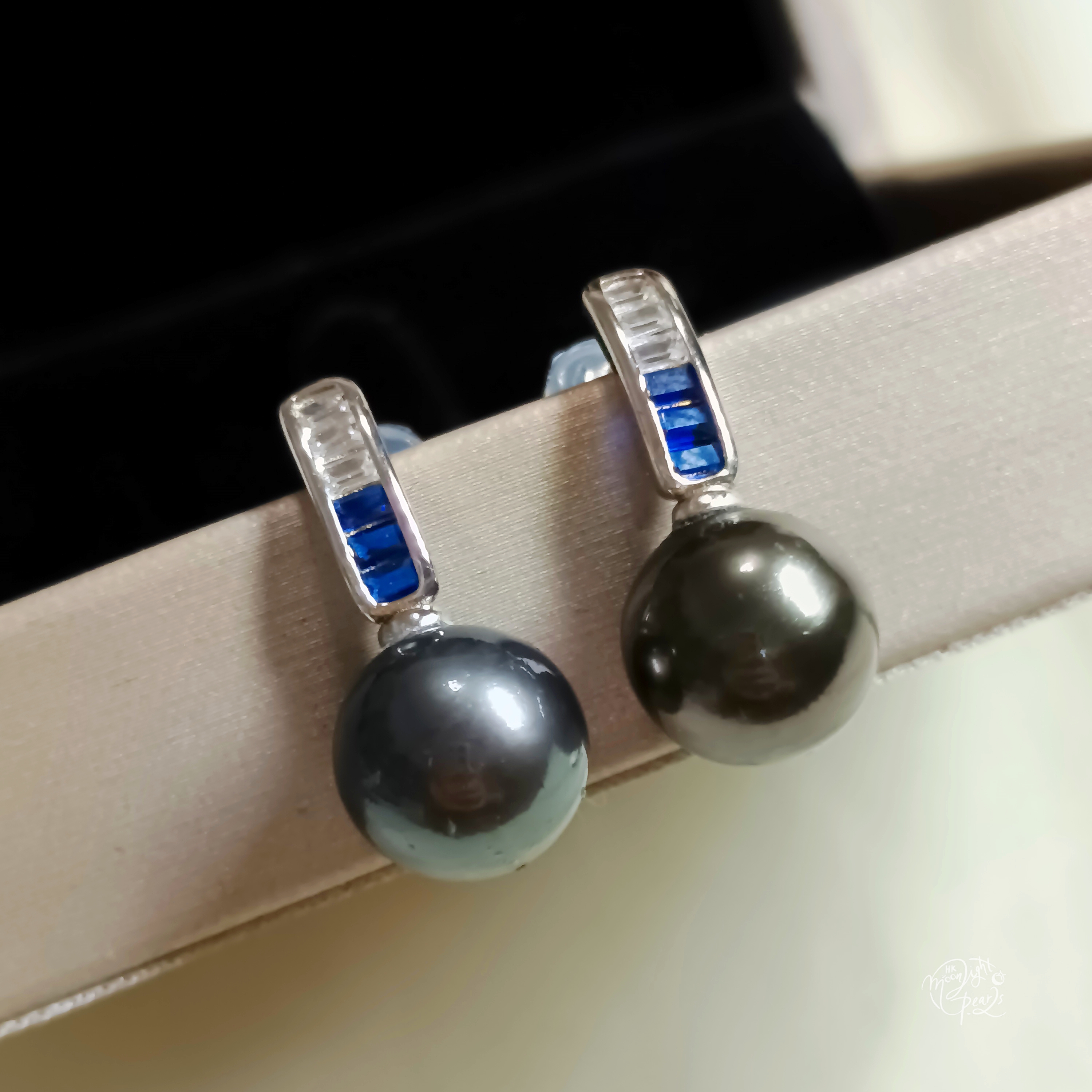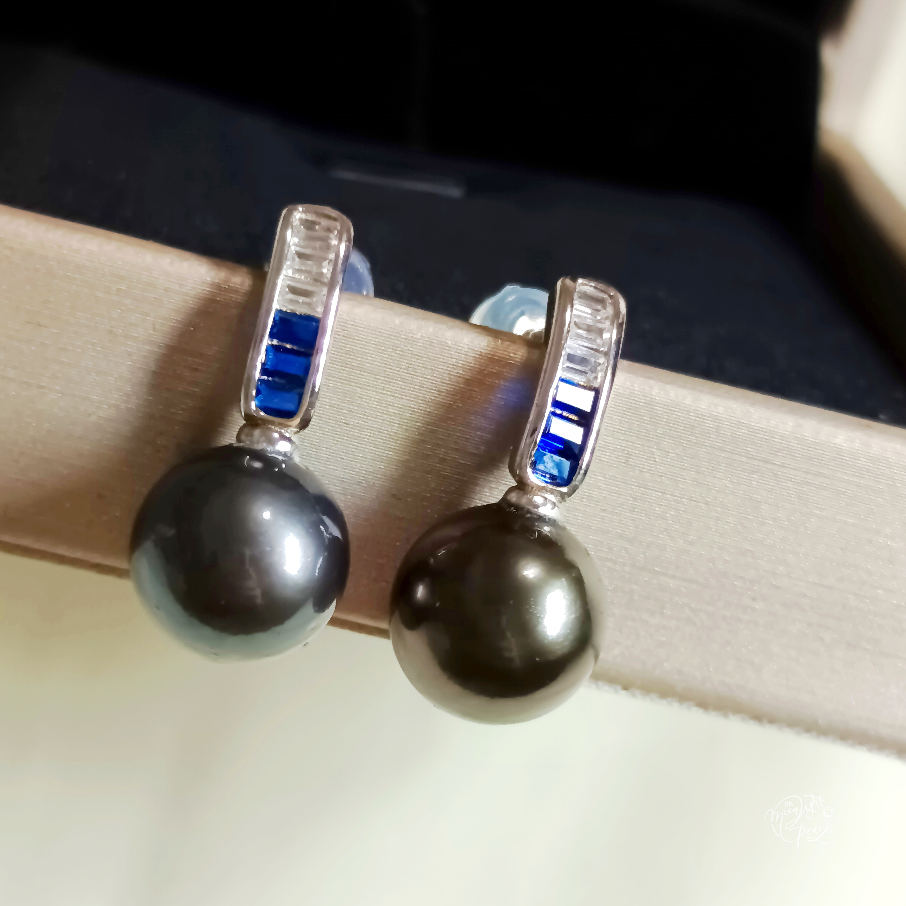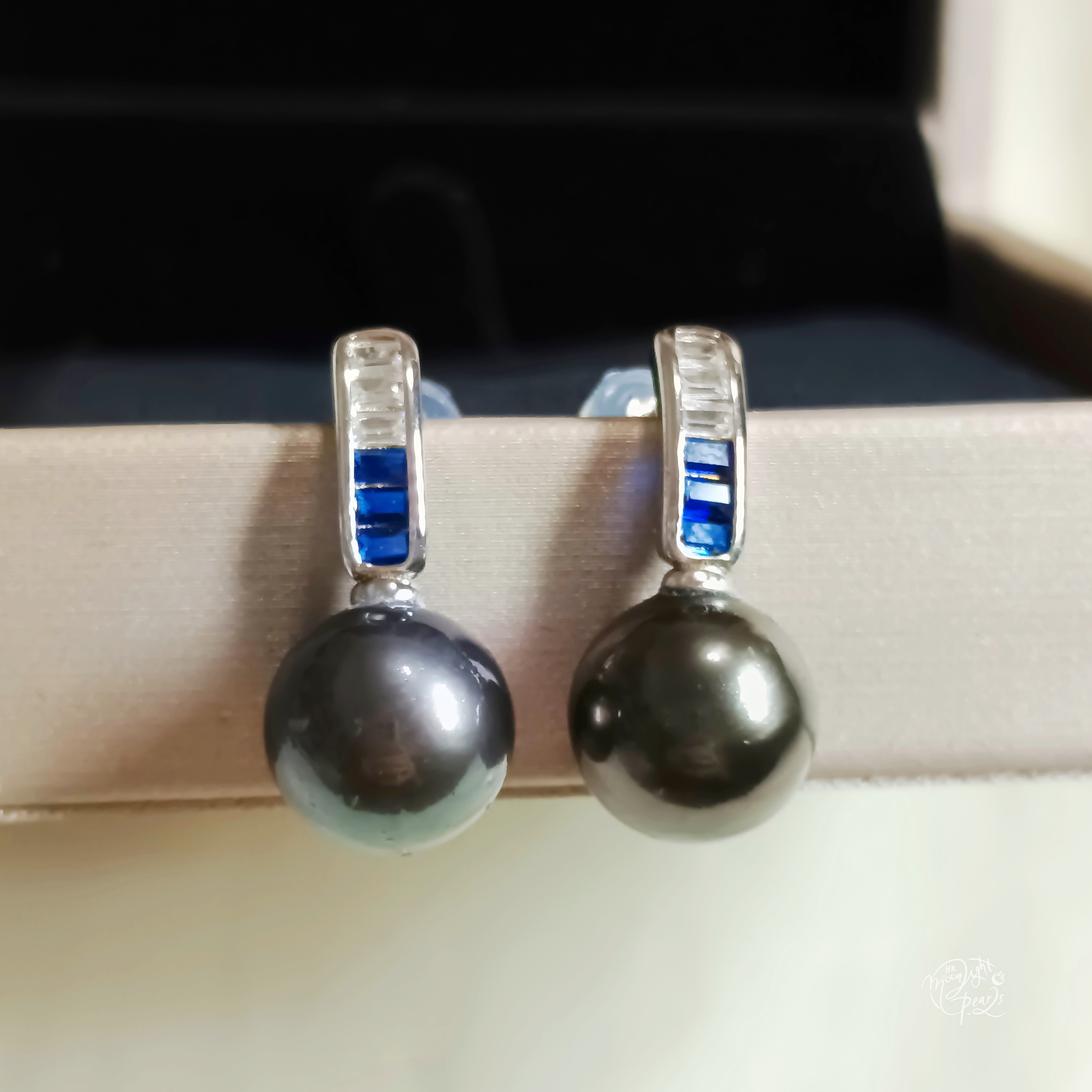 正圓強光大溪地海水珍珠精工s925銀微鑲藍鋯石耳環
