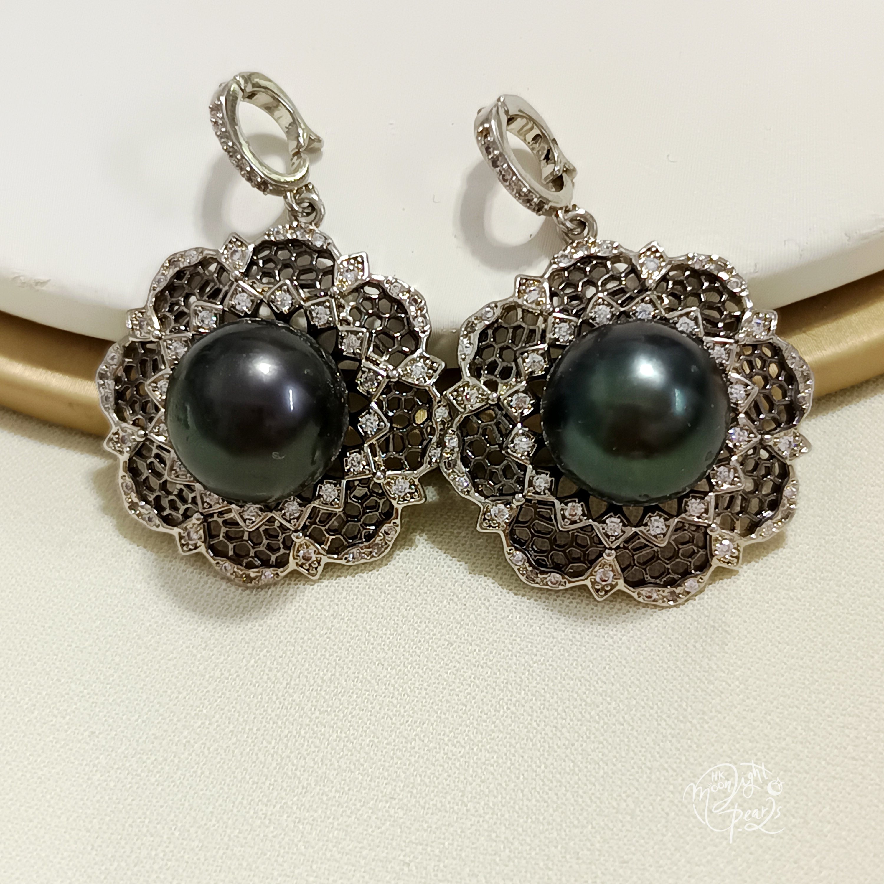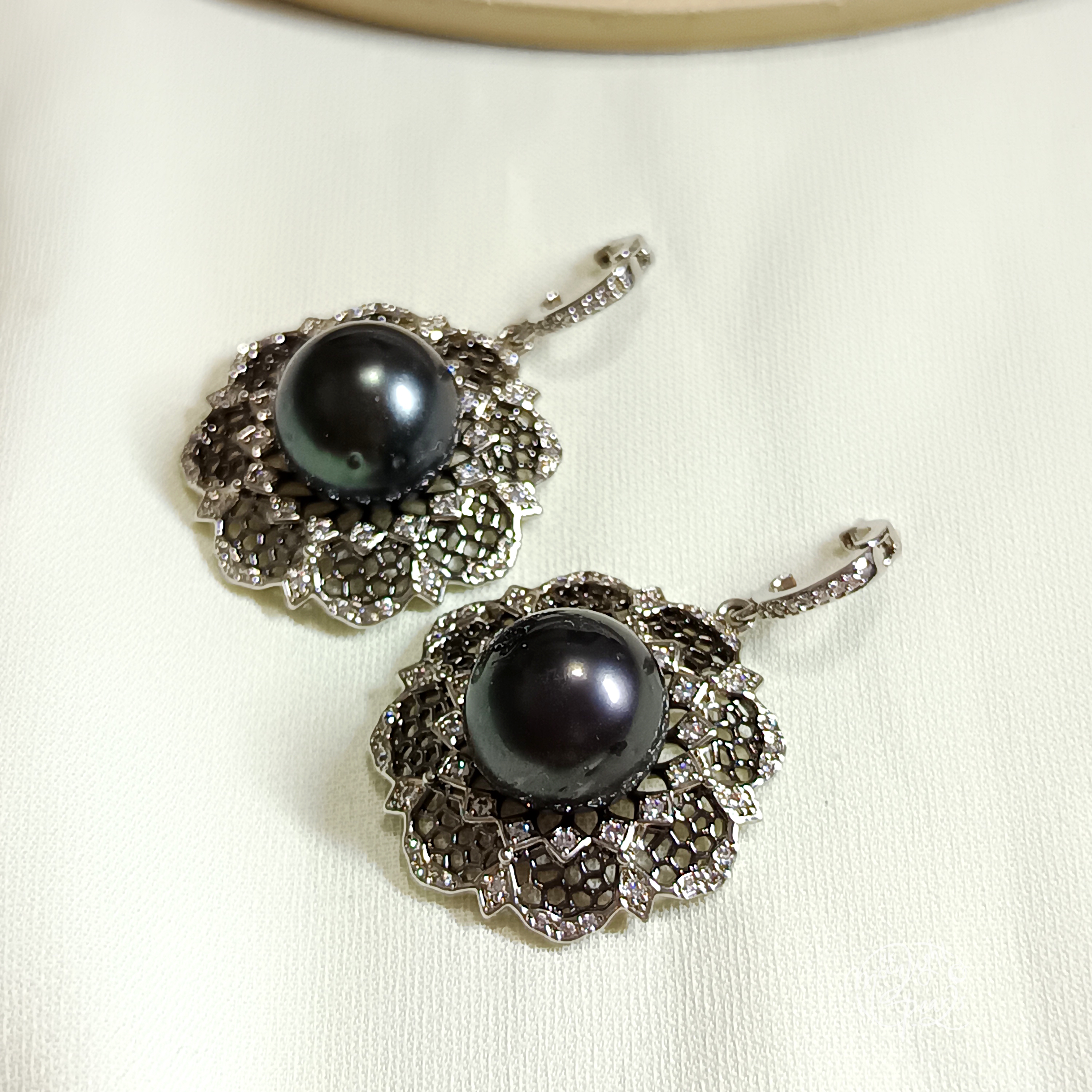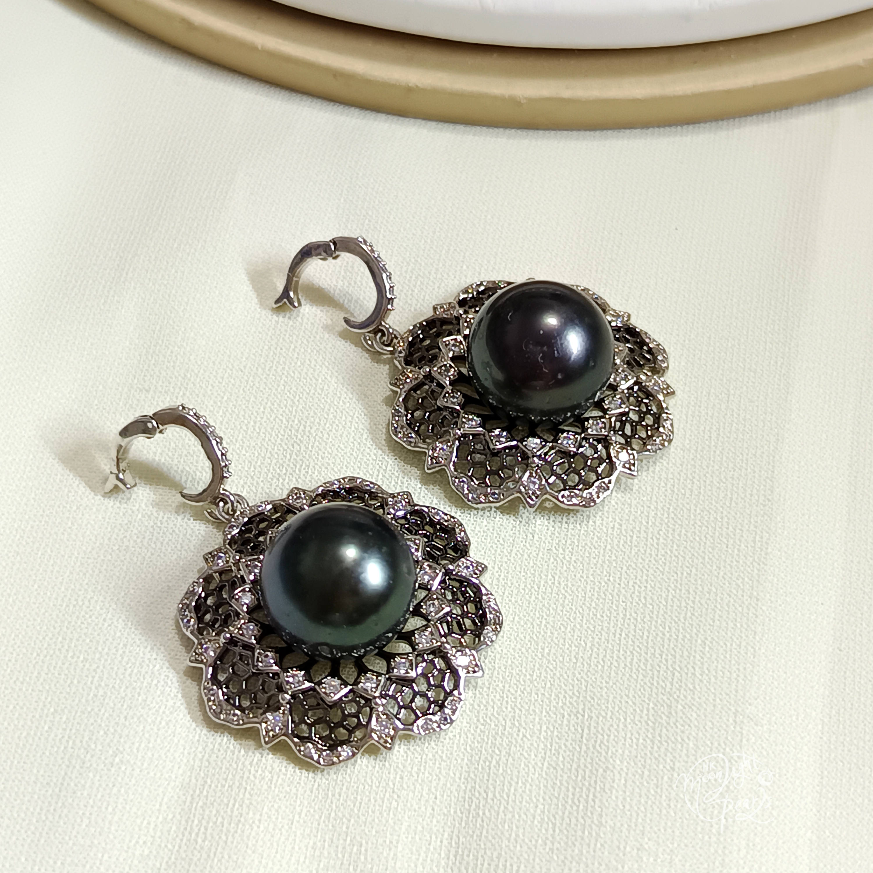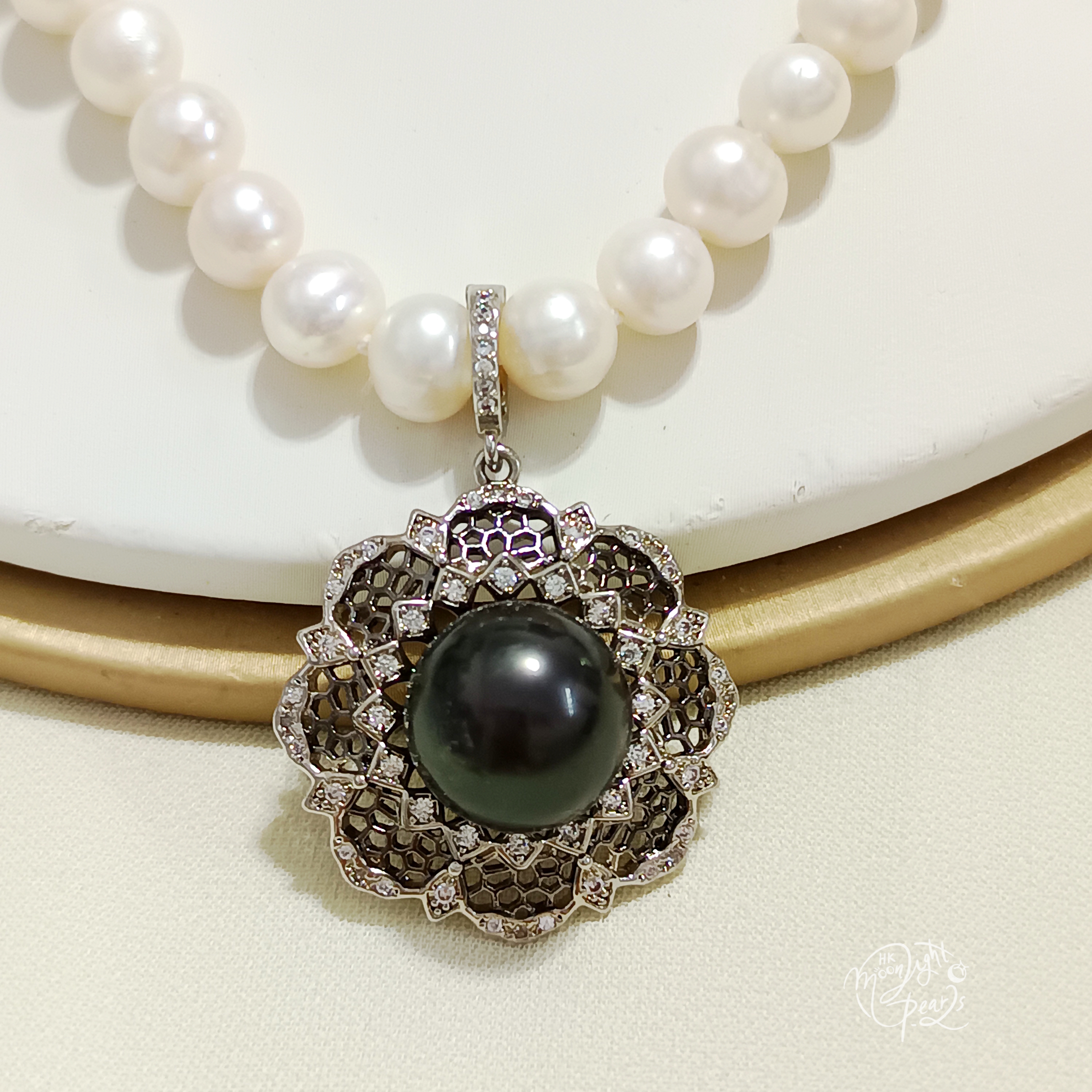 正圓強光大溪地鋼琴黑海水珍珠珠白金開口扣大花吊墜