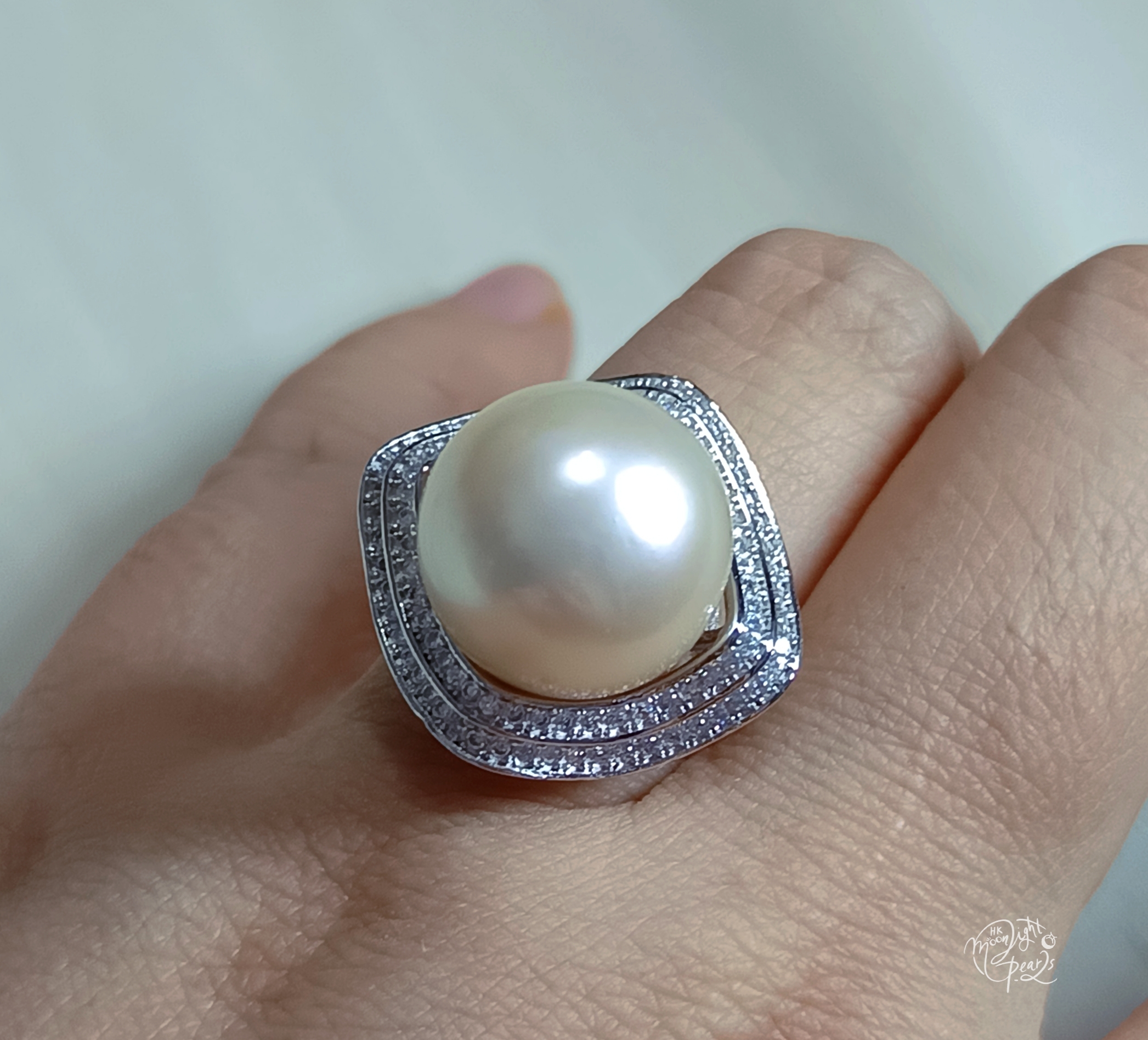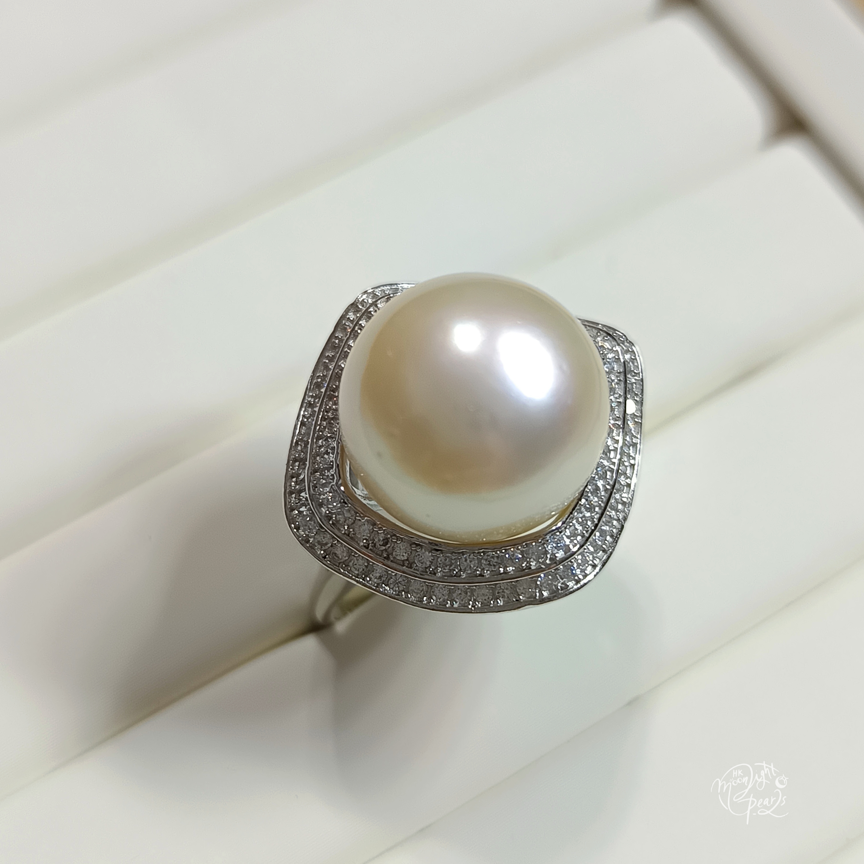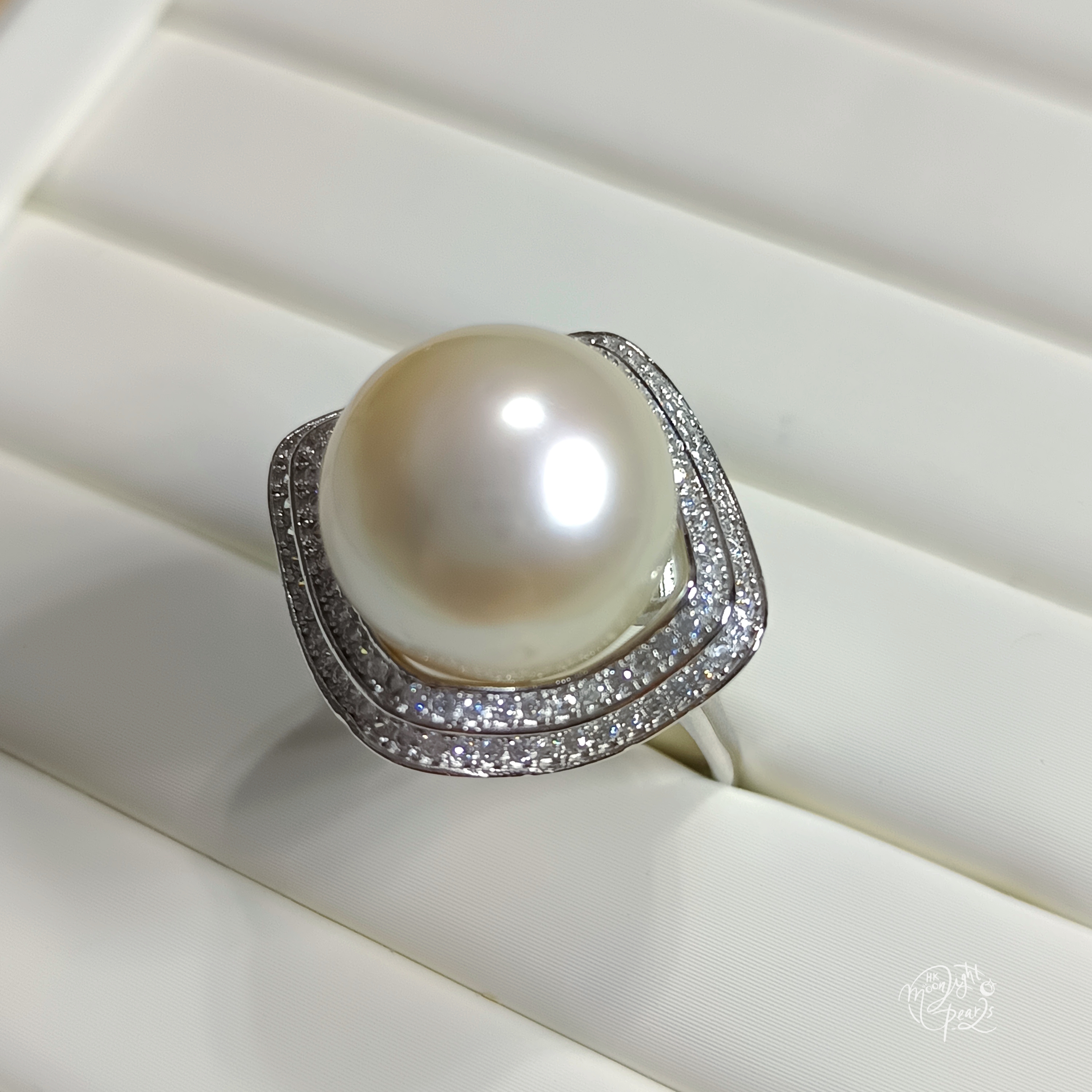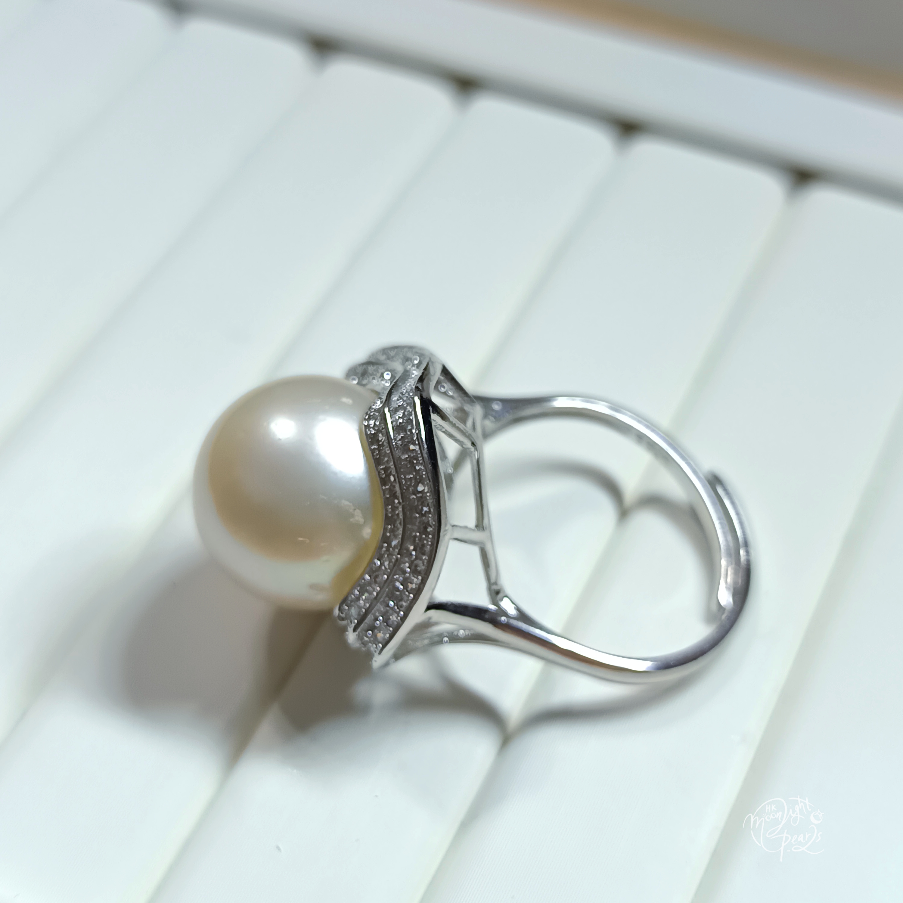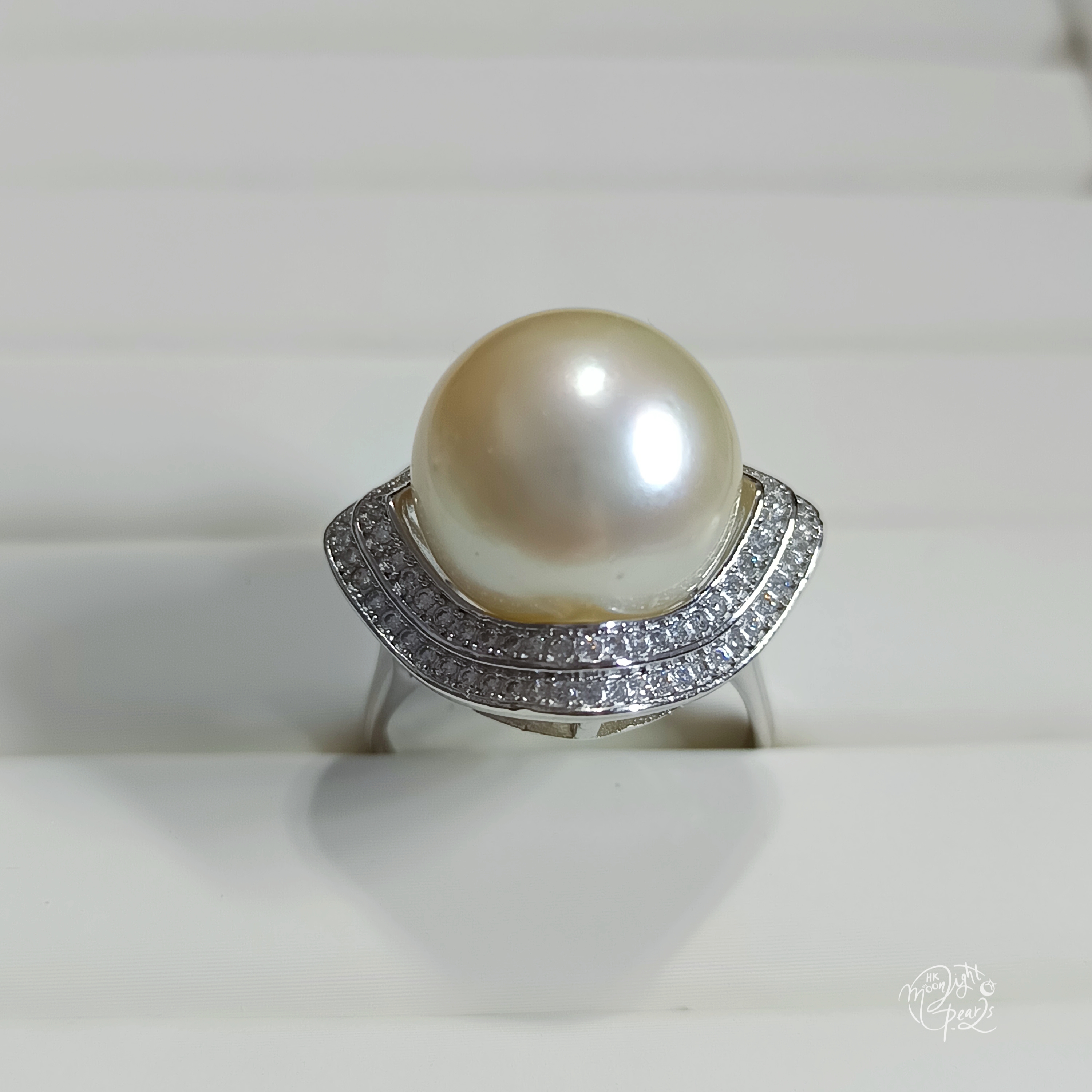 正圓強光淡金色南洋海水珠精工s925銀開口戒指