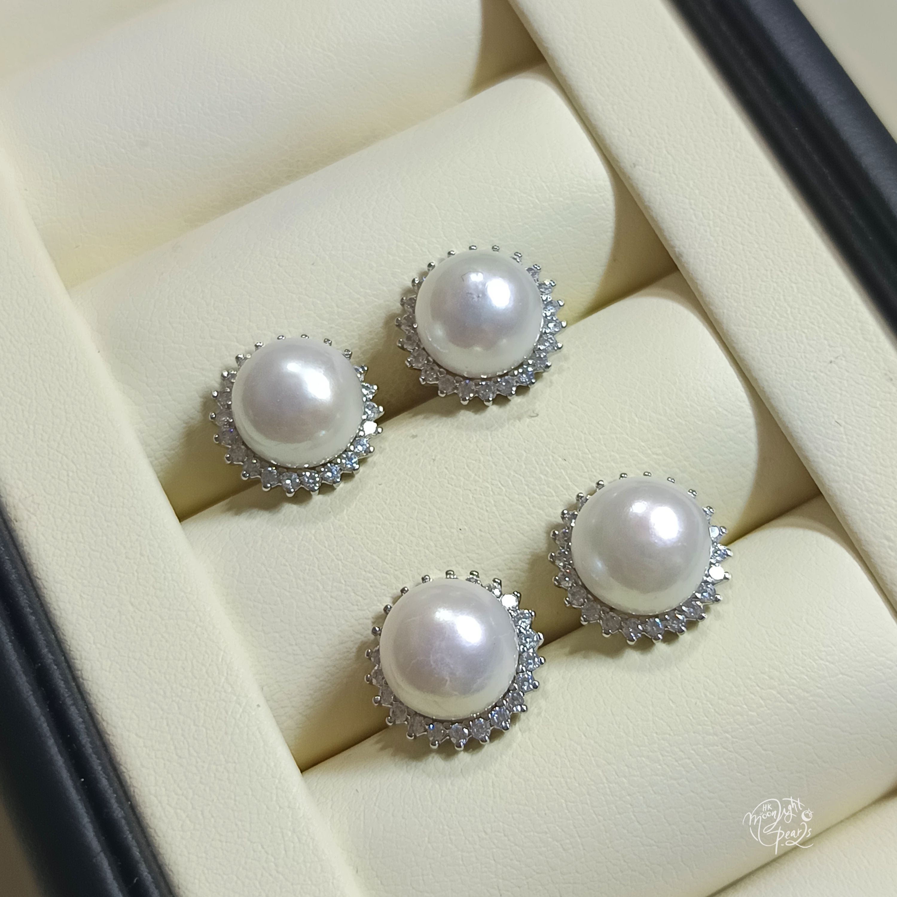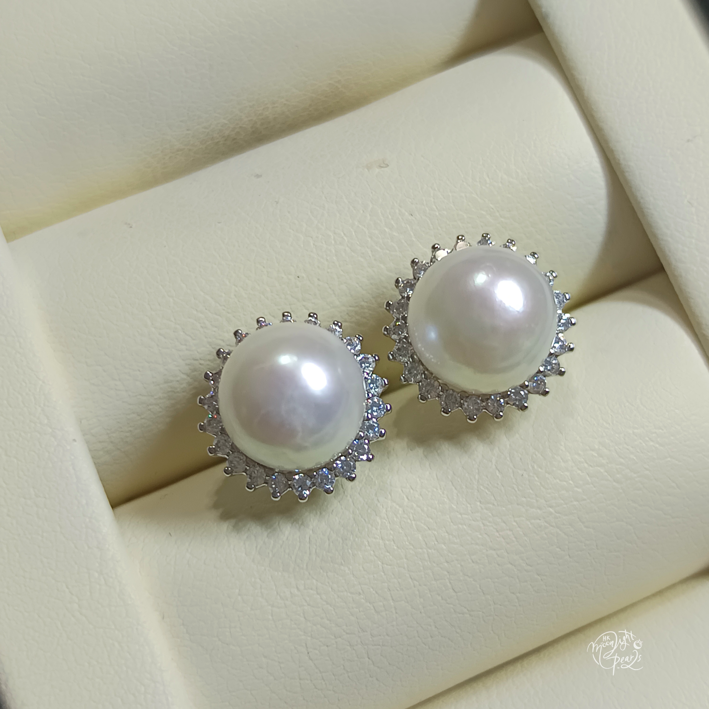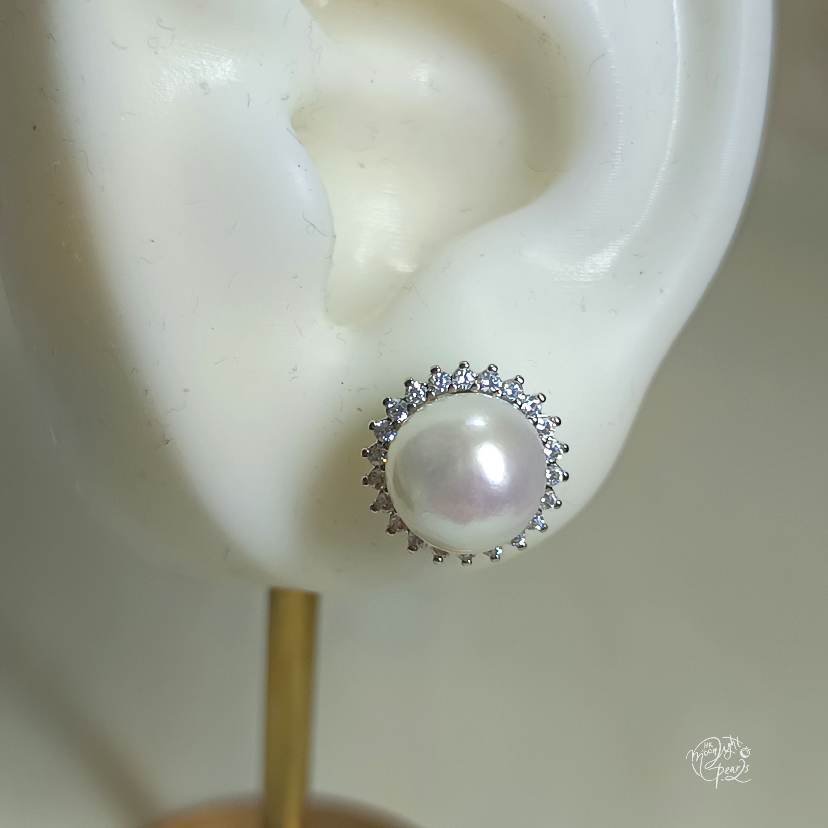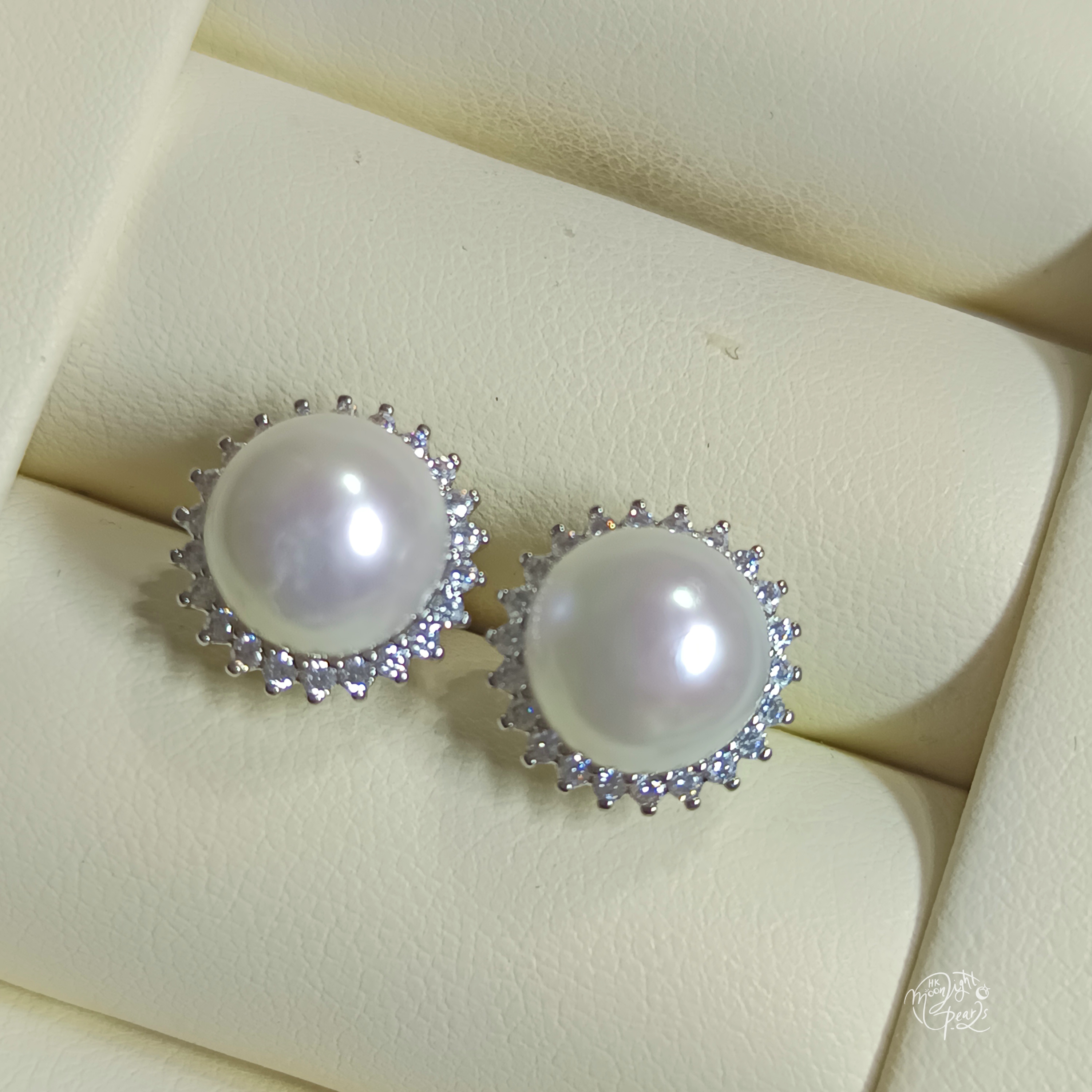 正圓極光愛迪生冷白透粉珍珠s925銀針鑲鋯石太陽花耳釘