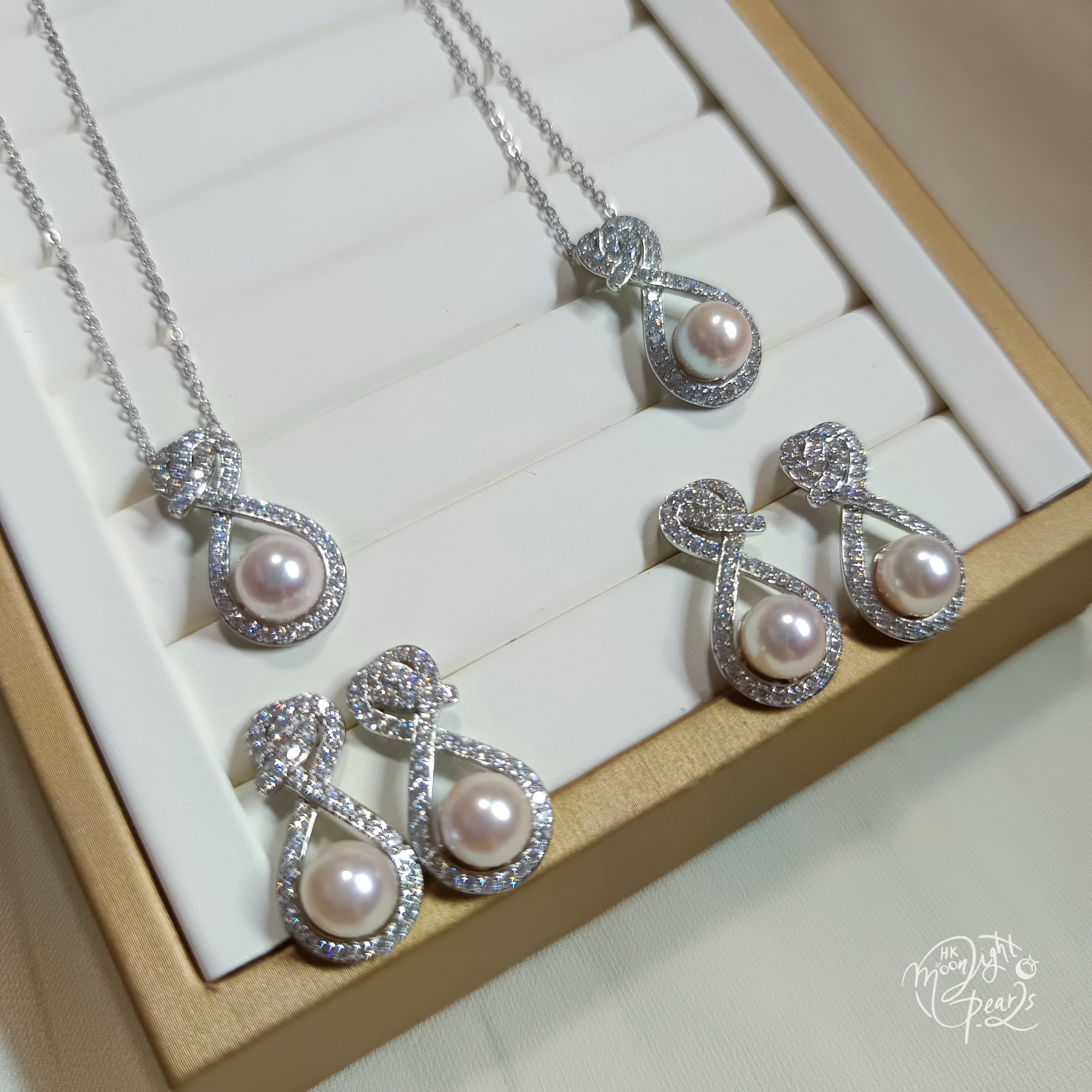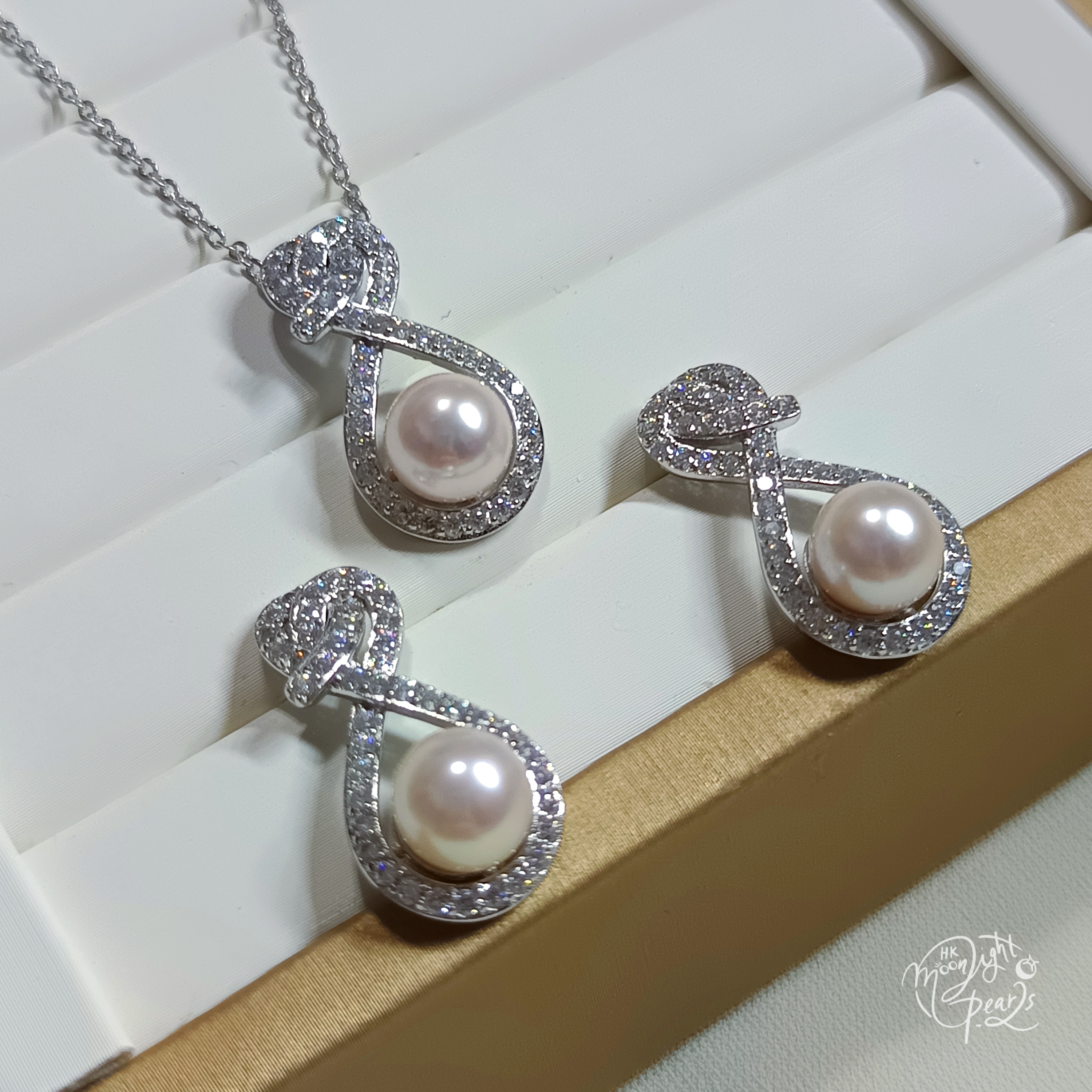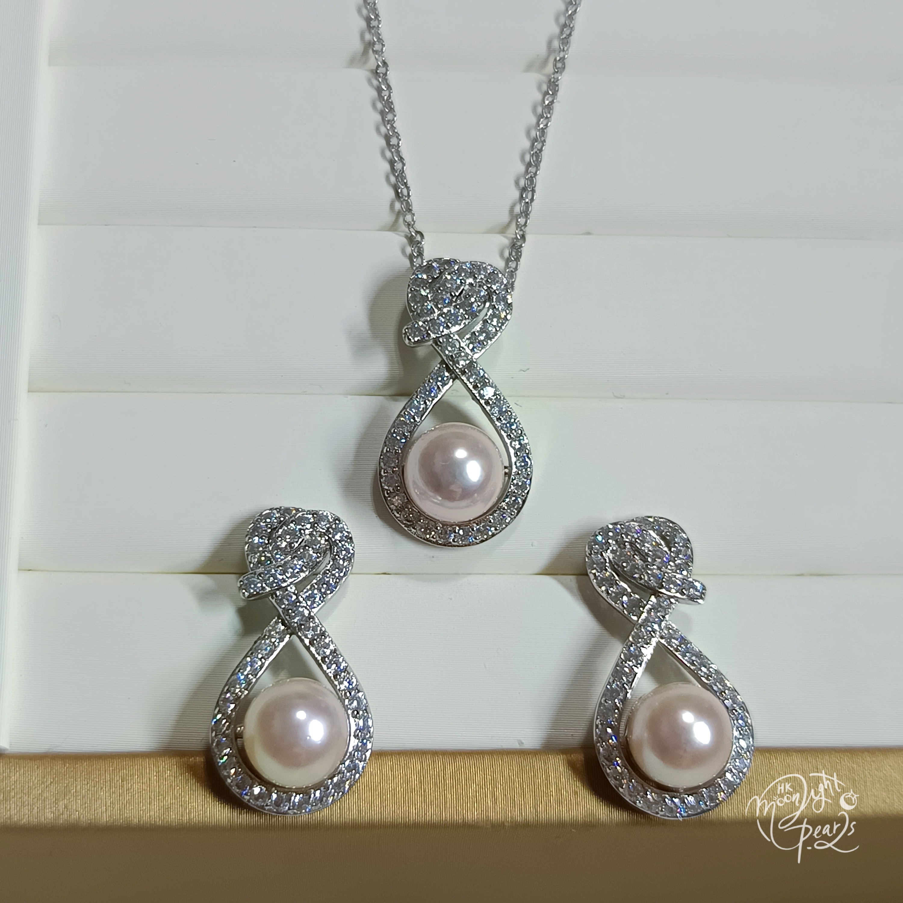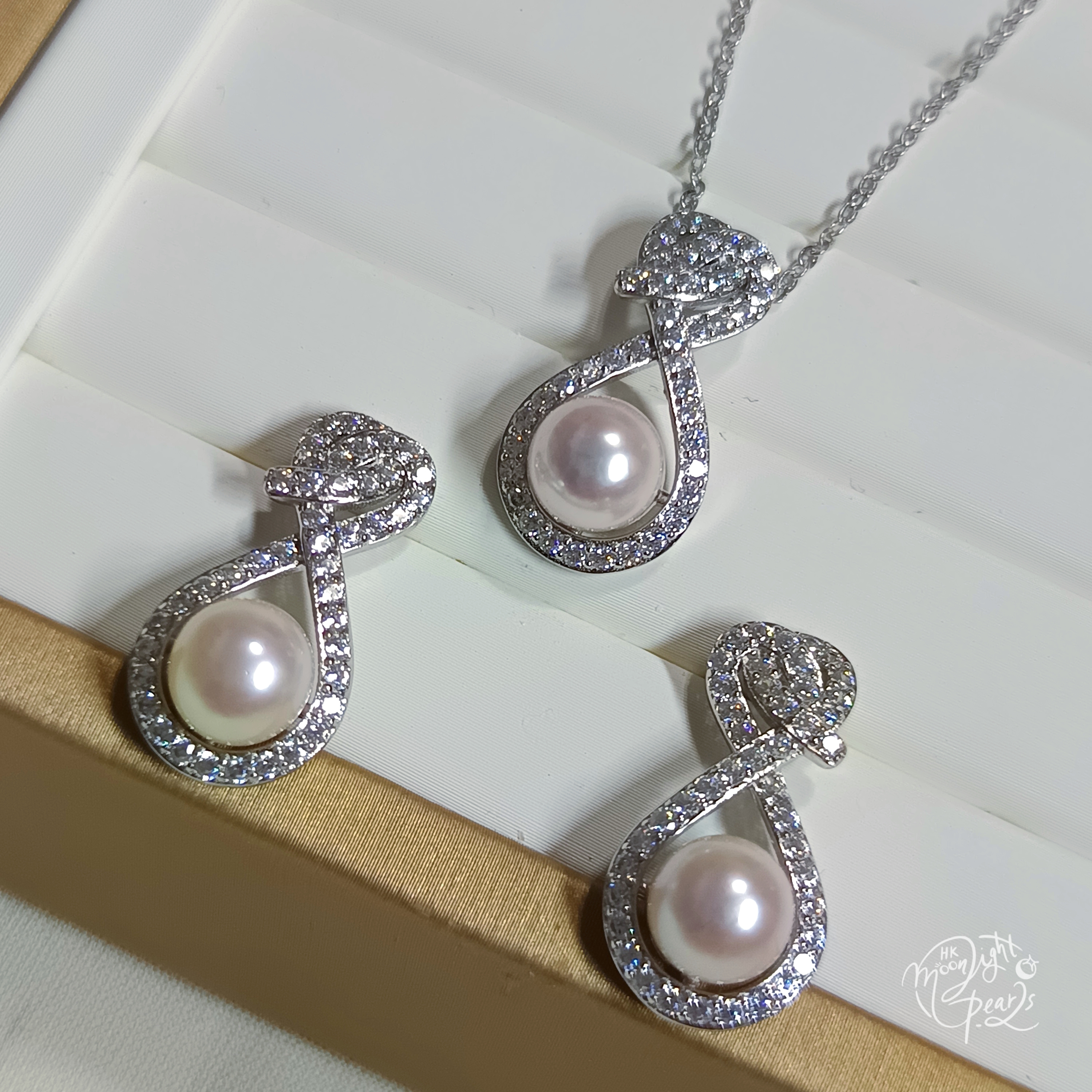正圓極光日本akoya 櫻花粉海水珍珠精工s925銀MIKIMOTO同款如意結墜鍊耳環套裝