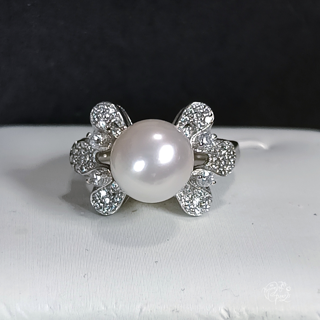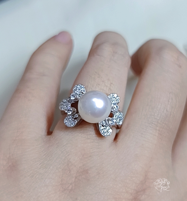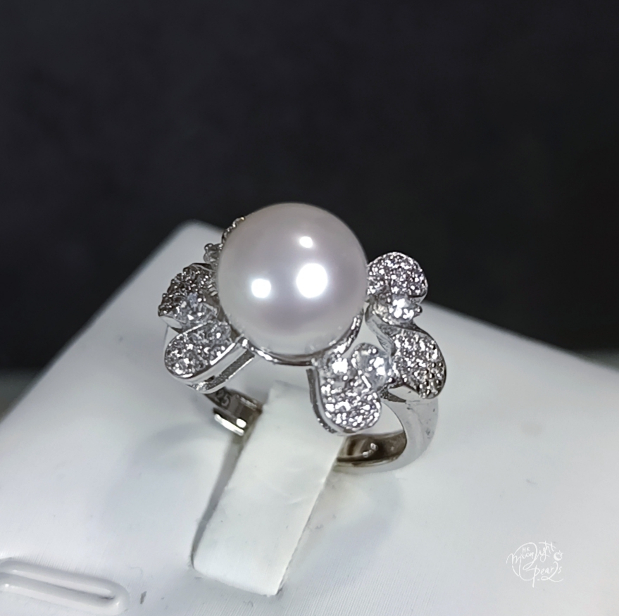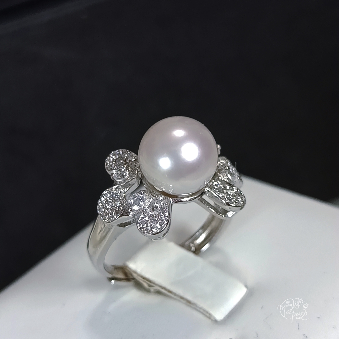 正圓極光銀白透粉澳白海水珍珠精工s925銀微鑲鋯石開口戒指
