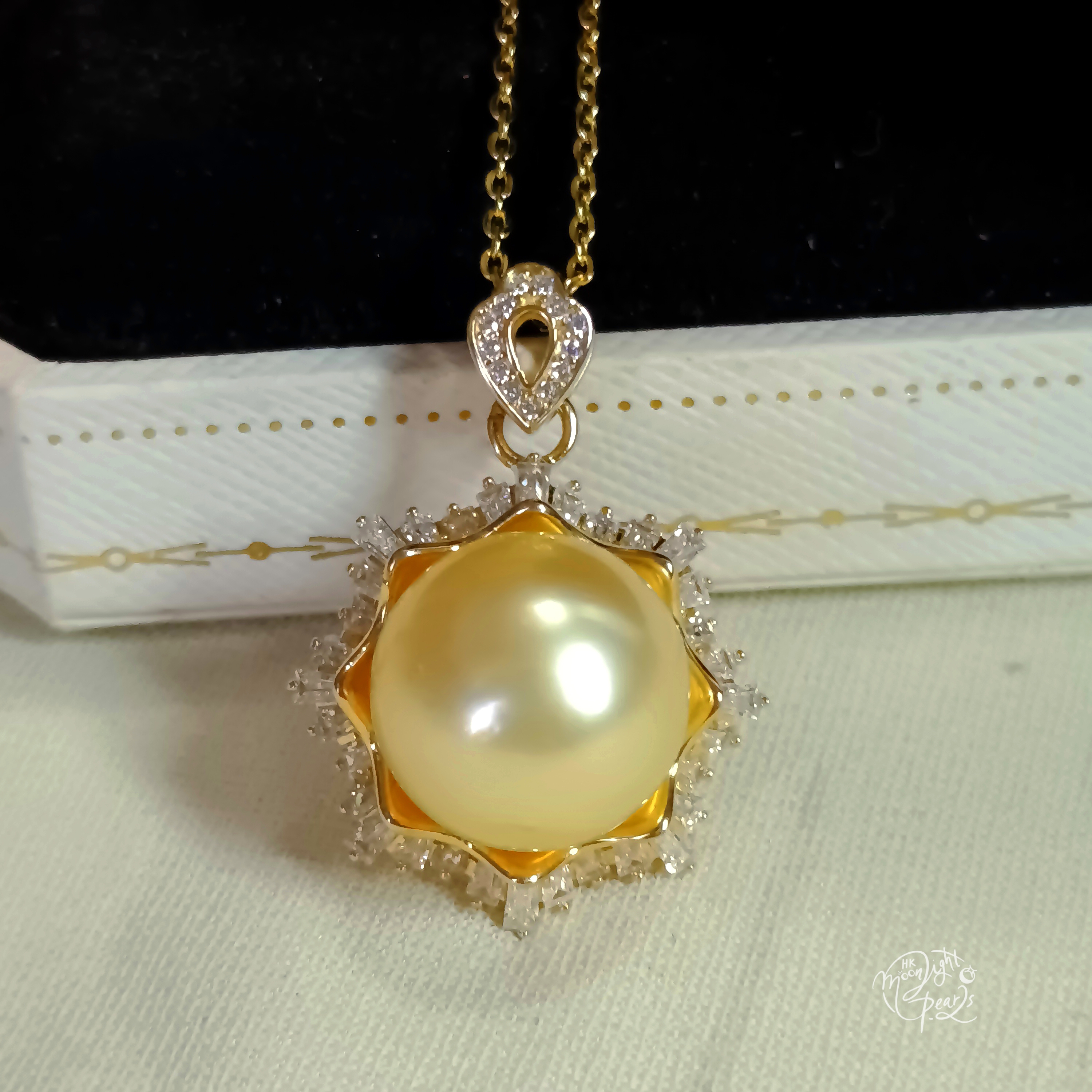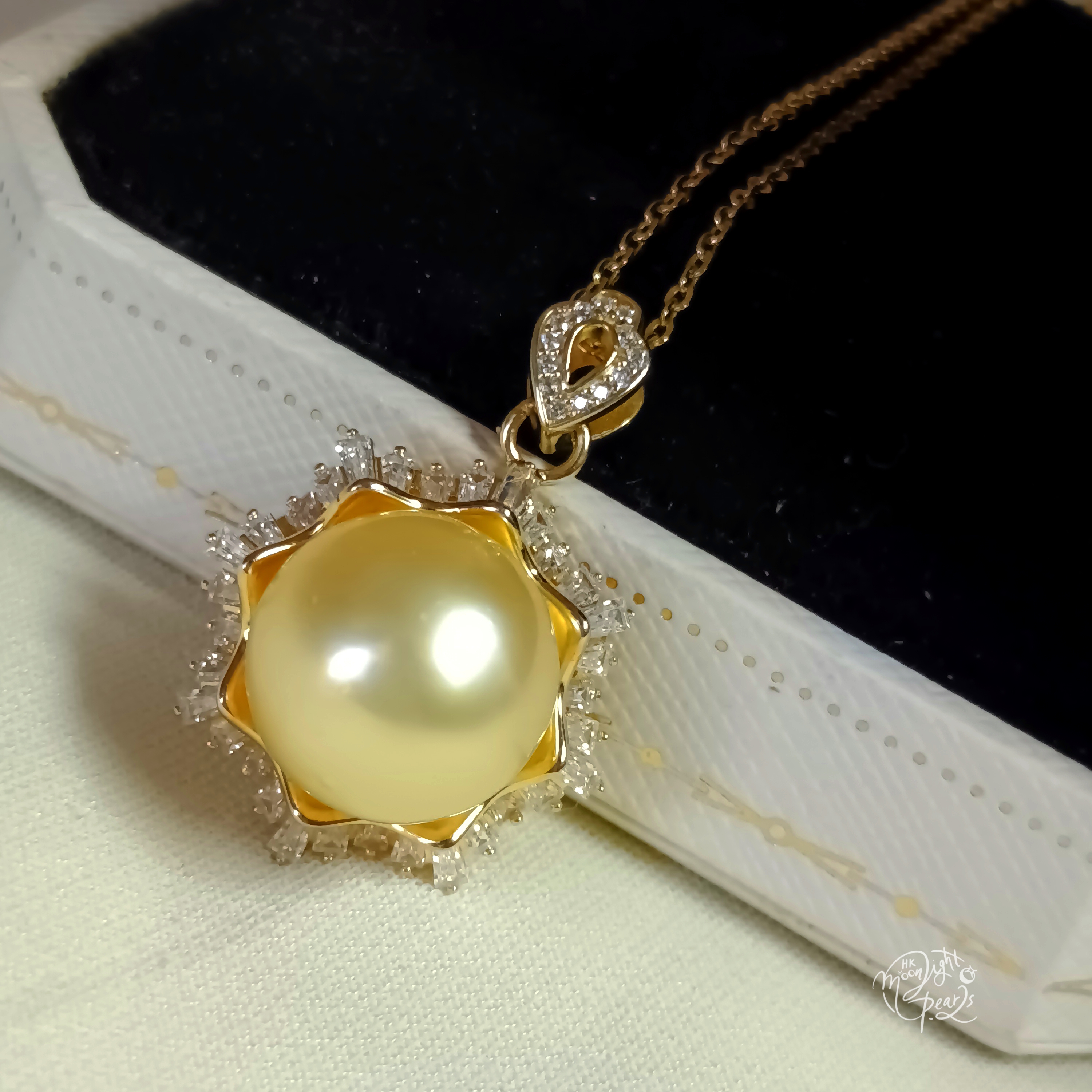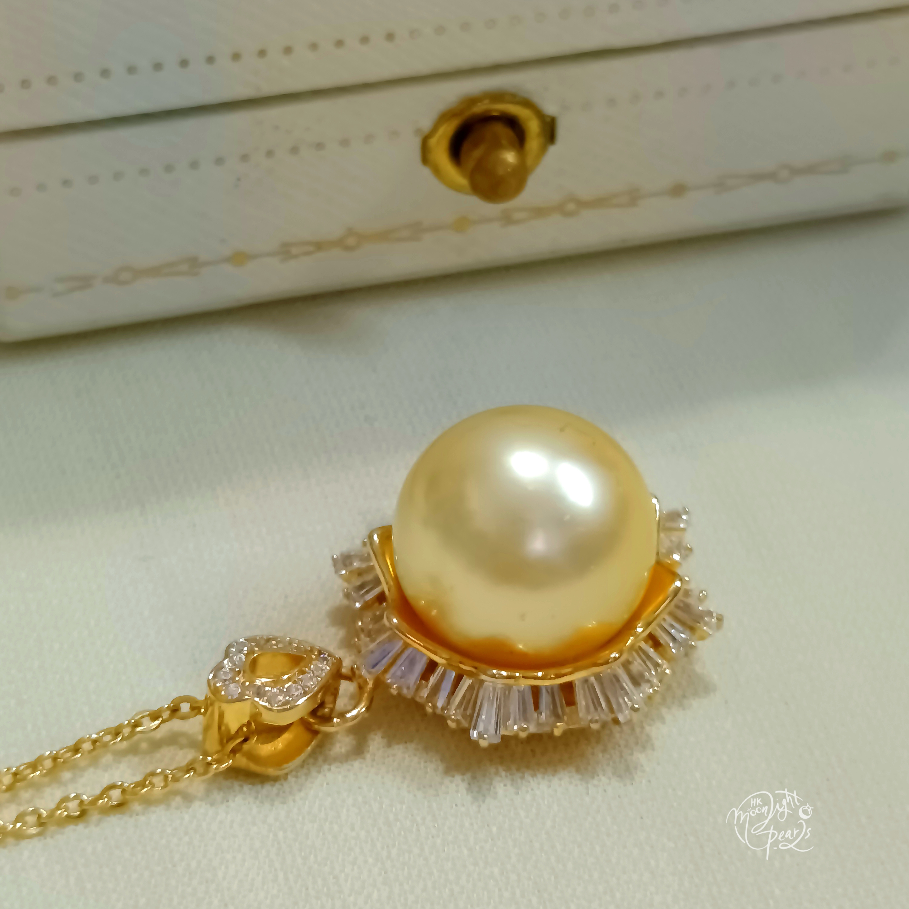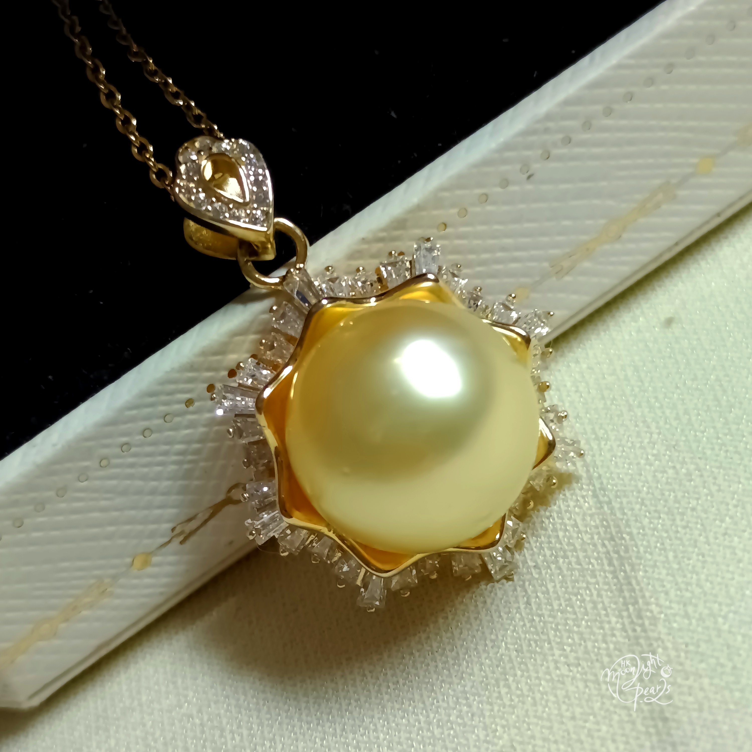 正圓極強光南洋中金色海水珍珠精工s925銀微鑲鋯石雪花吊墜(送注金鍊)