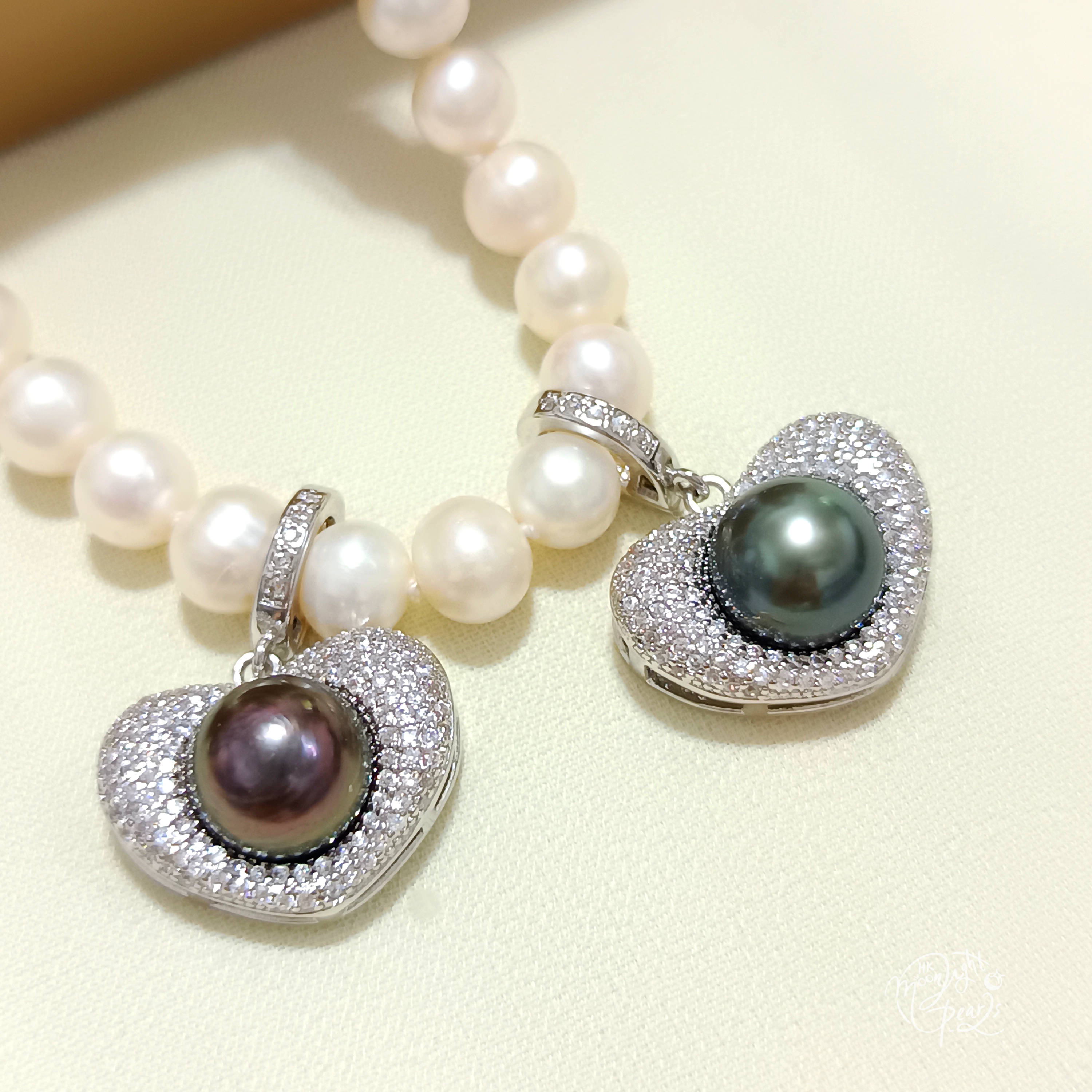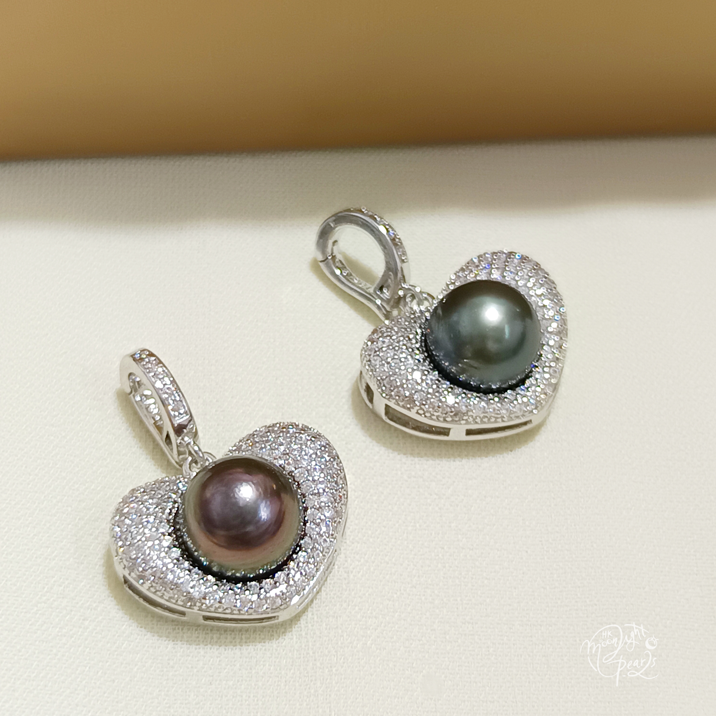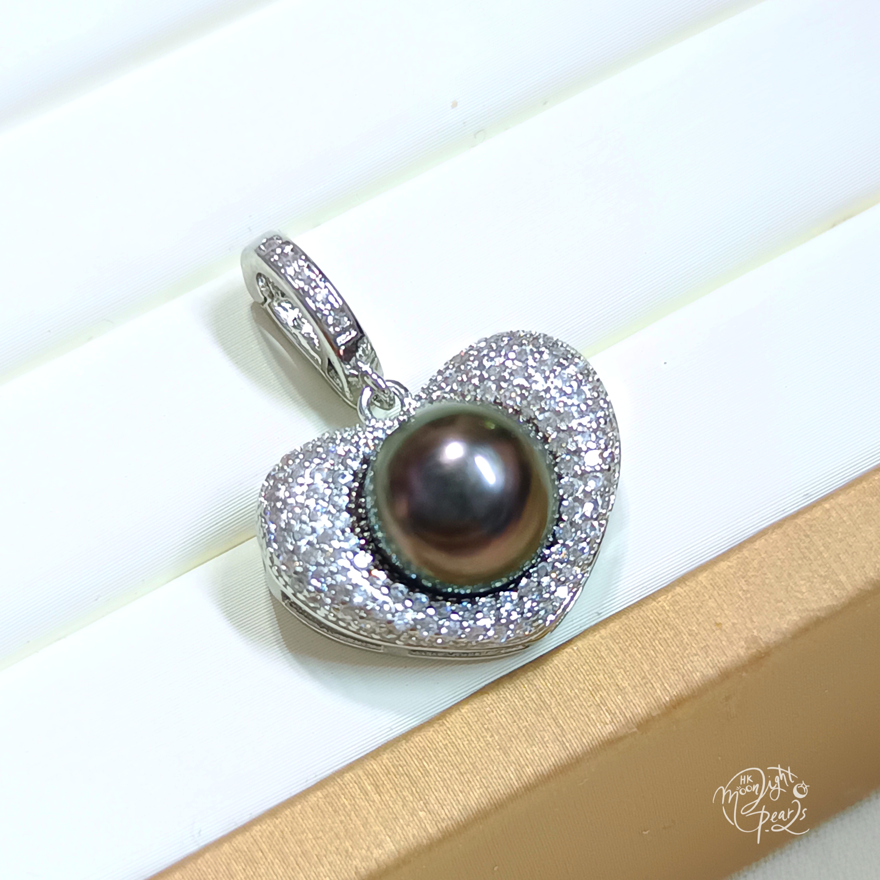正圓極強光大溪地孔雀綠/紫海水珍珠注白金鋯石愛心開口扣吊墜
