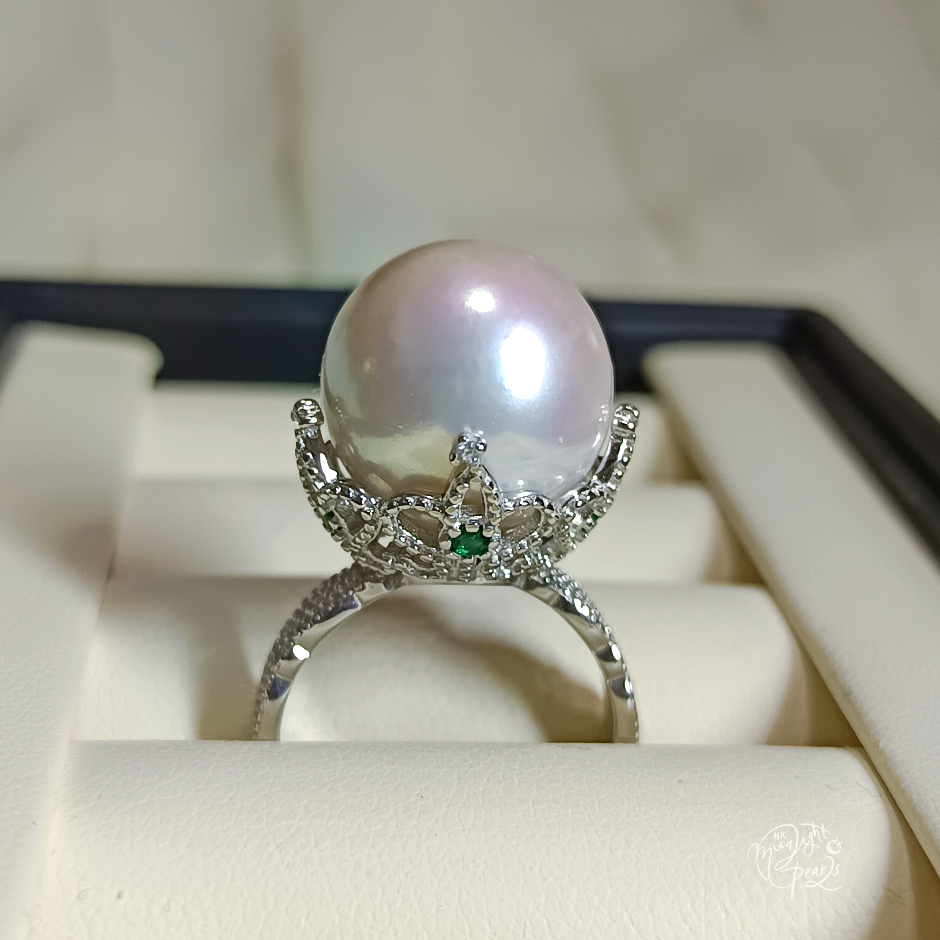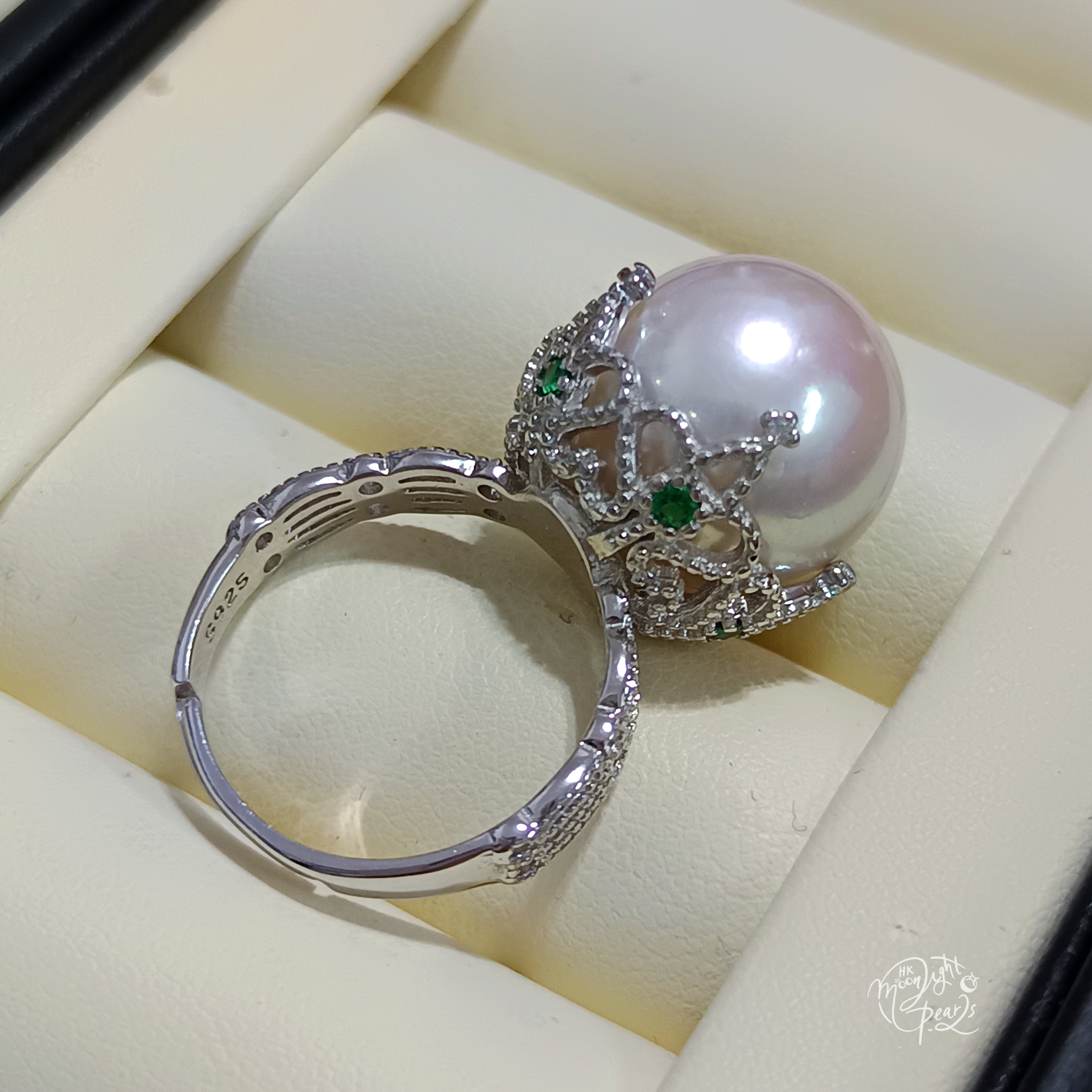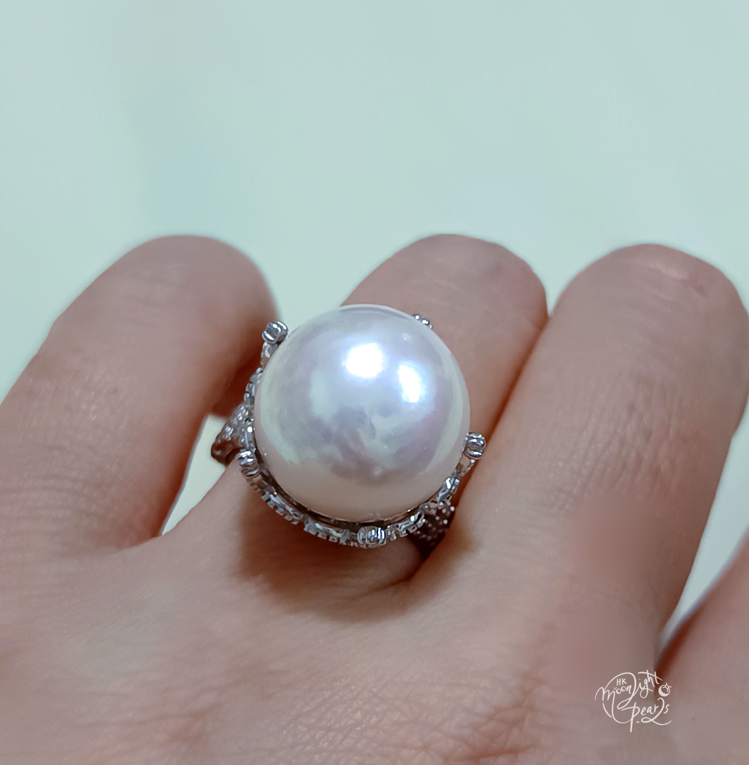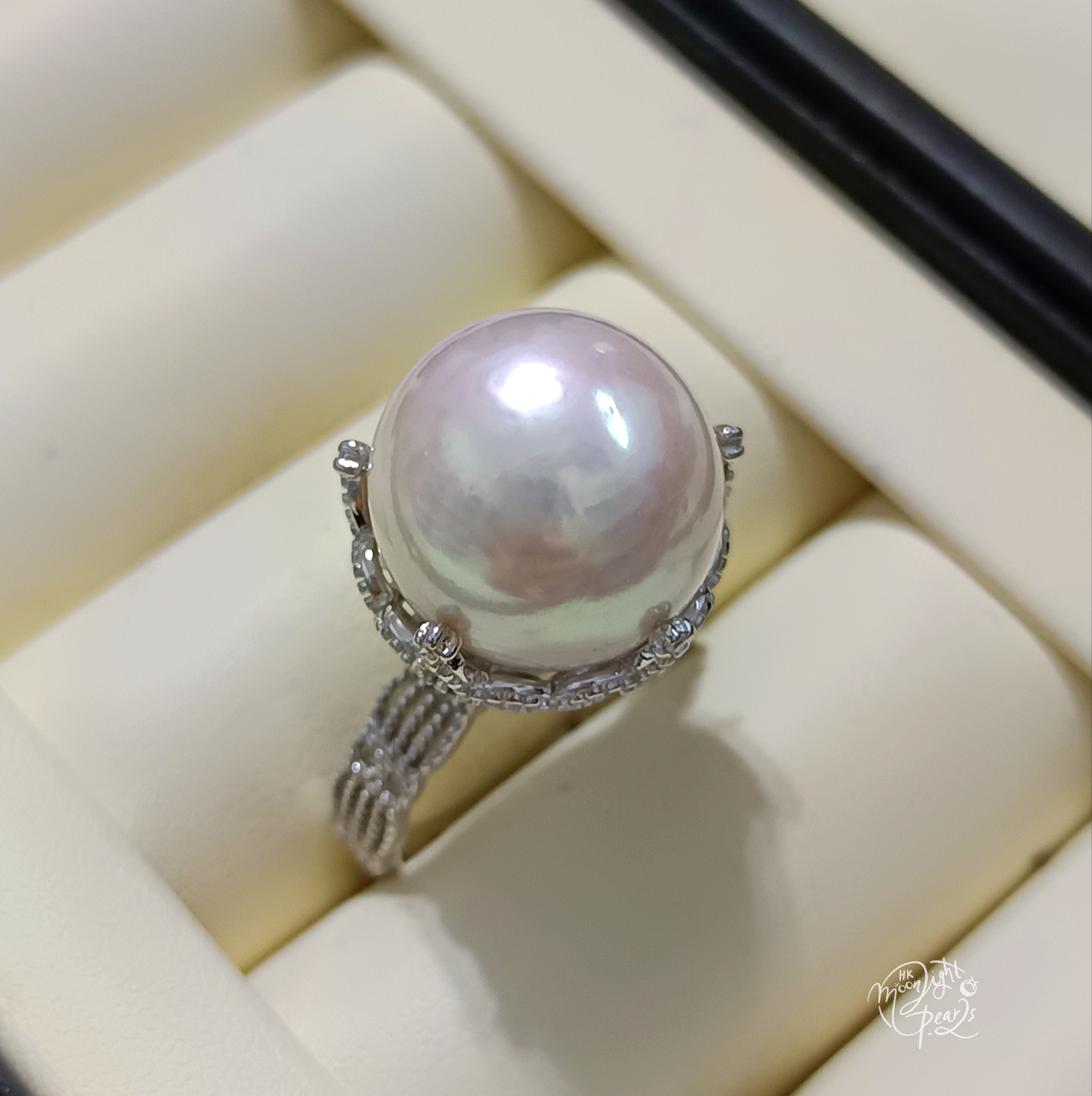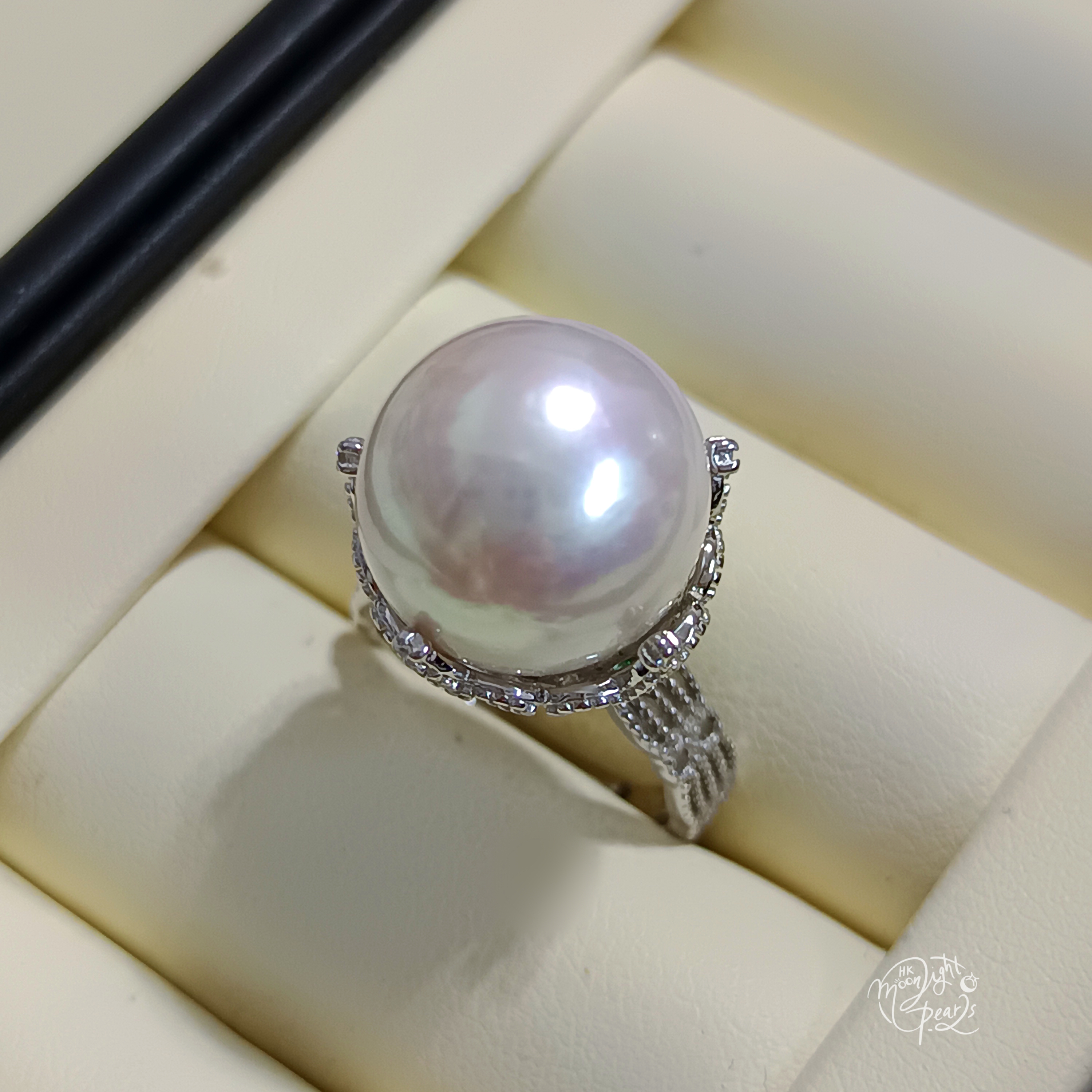 正圓極強光愛迪生冷白透強粉光珍珠精工s925銀開口戒指