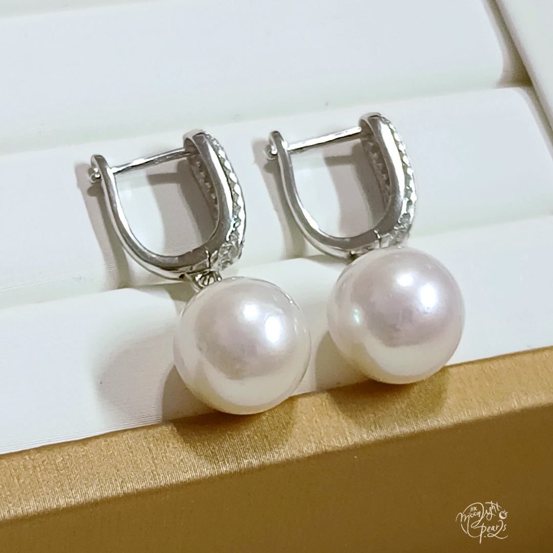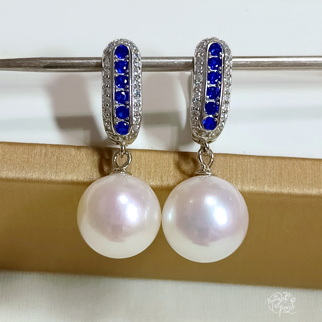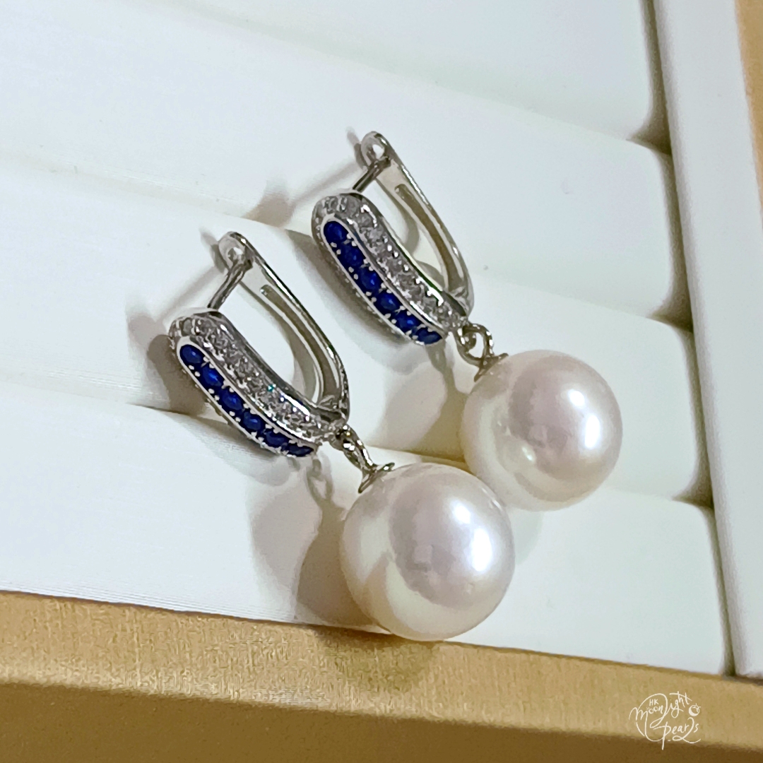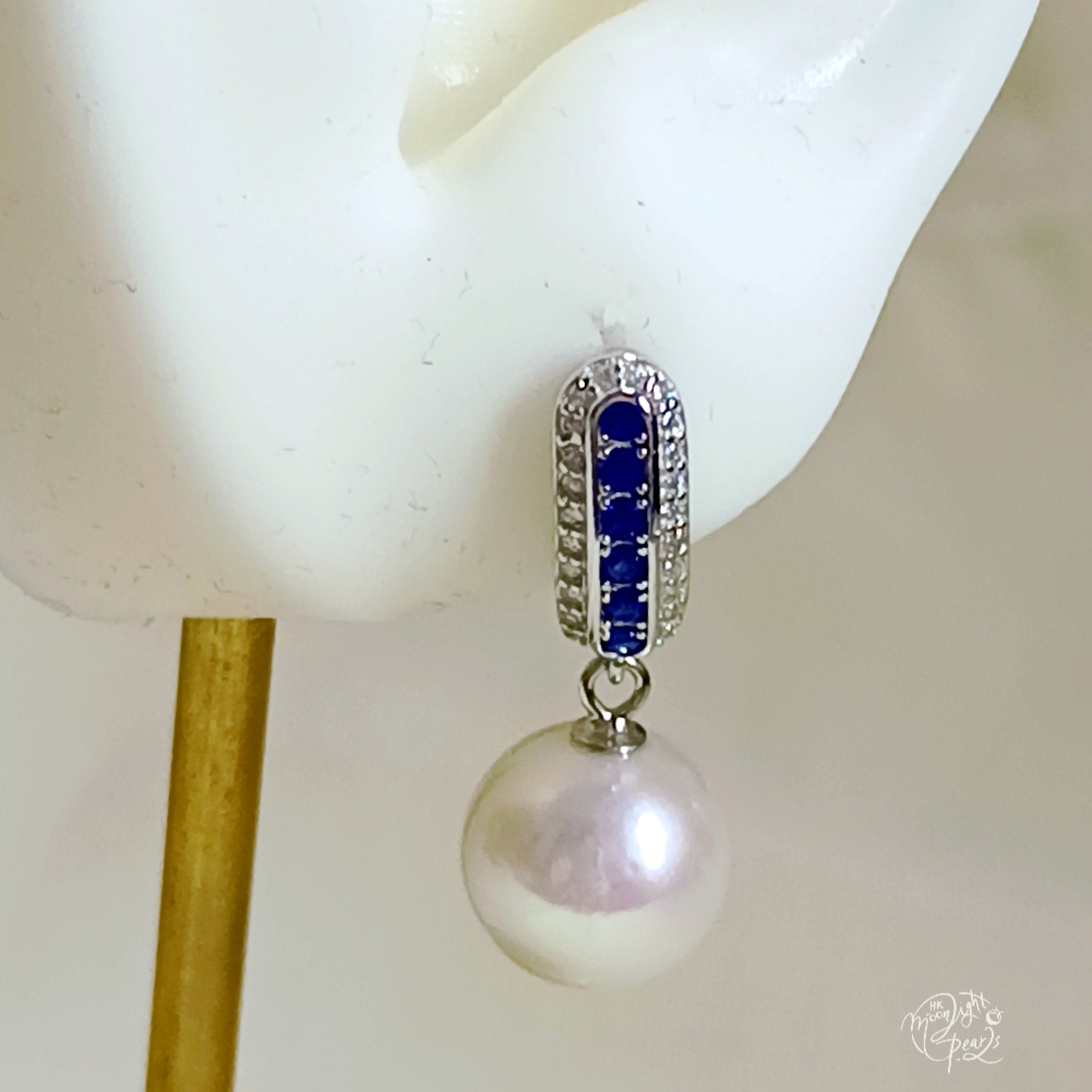 正圓極強光愛迪生白透粉珍珠精工s925銀微鑲藍鋯石耳扣