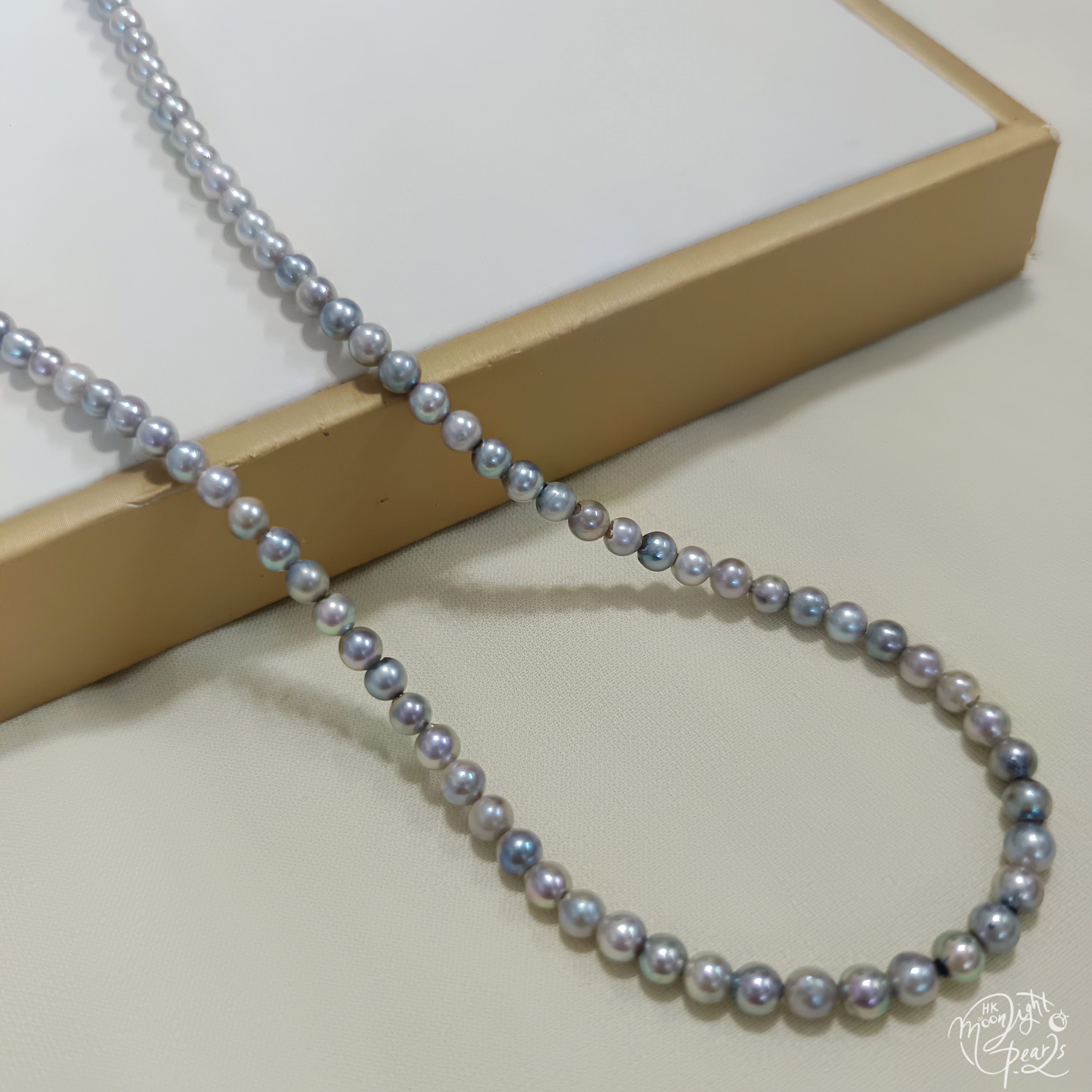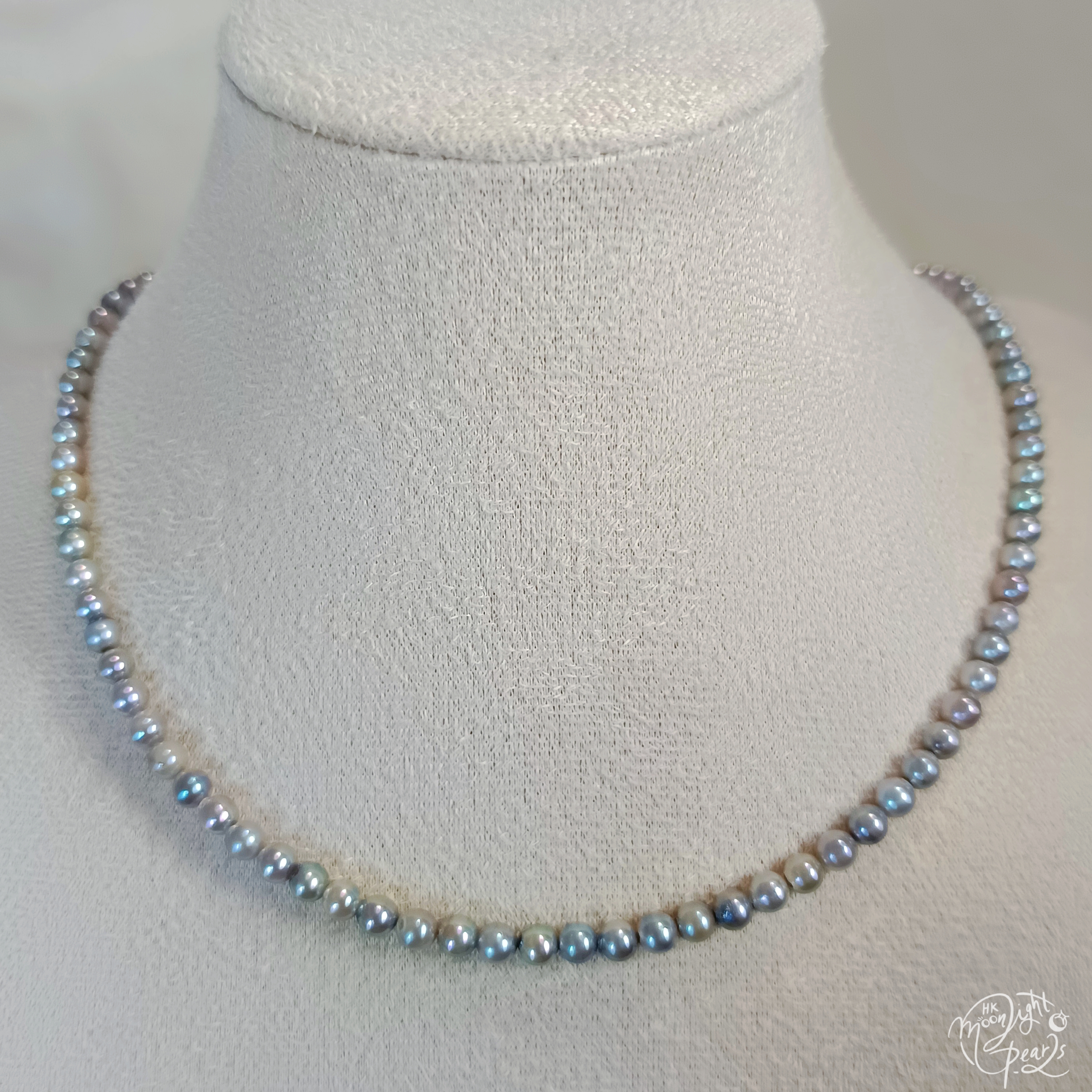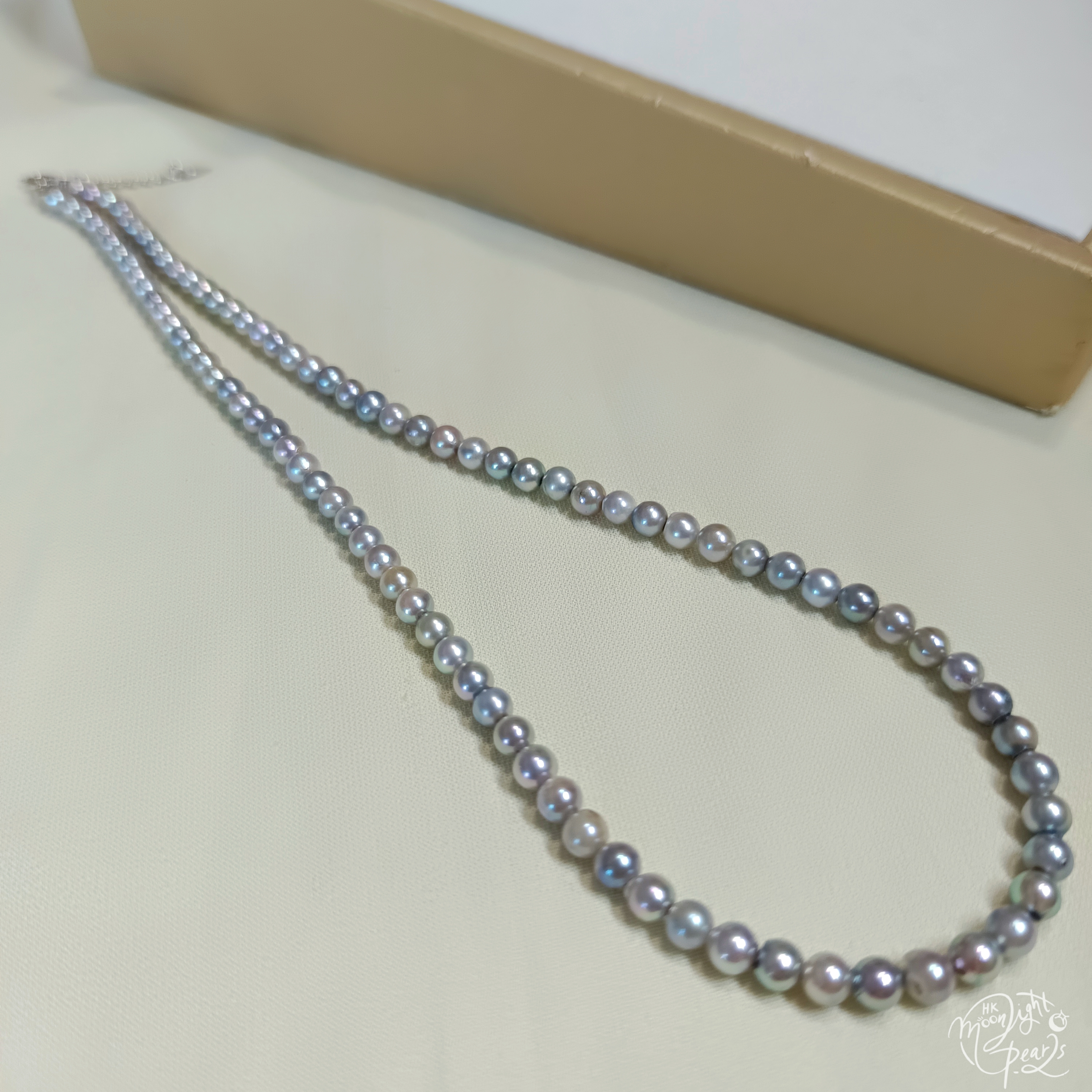 珍珠尺寸4-5mm 項鍊長度40+3cm尾鍊 正圓極強光日本真多麻海水珍珠,銀灰藍色,皮光絲滑透亮,基本看不到明顯瑕疵,佩戴時尚氣質,小價位靚貨!