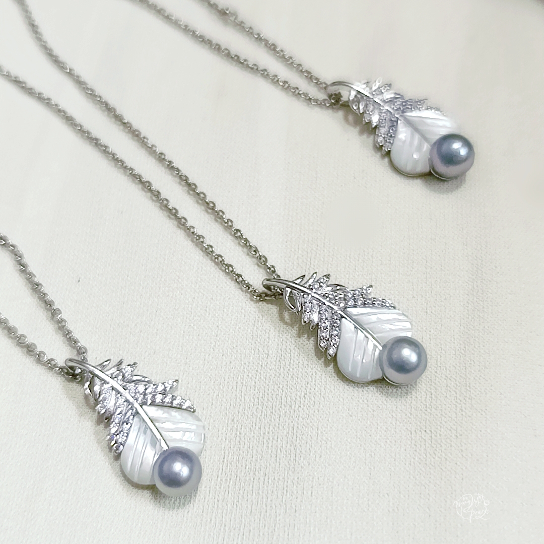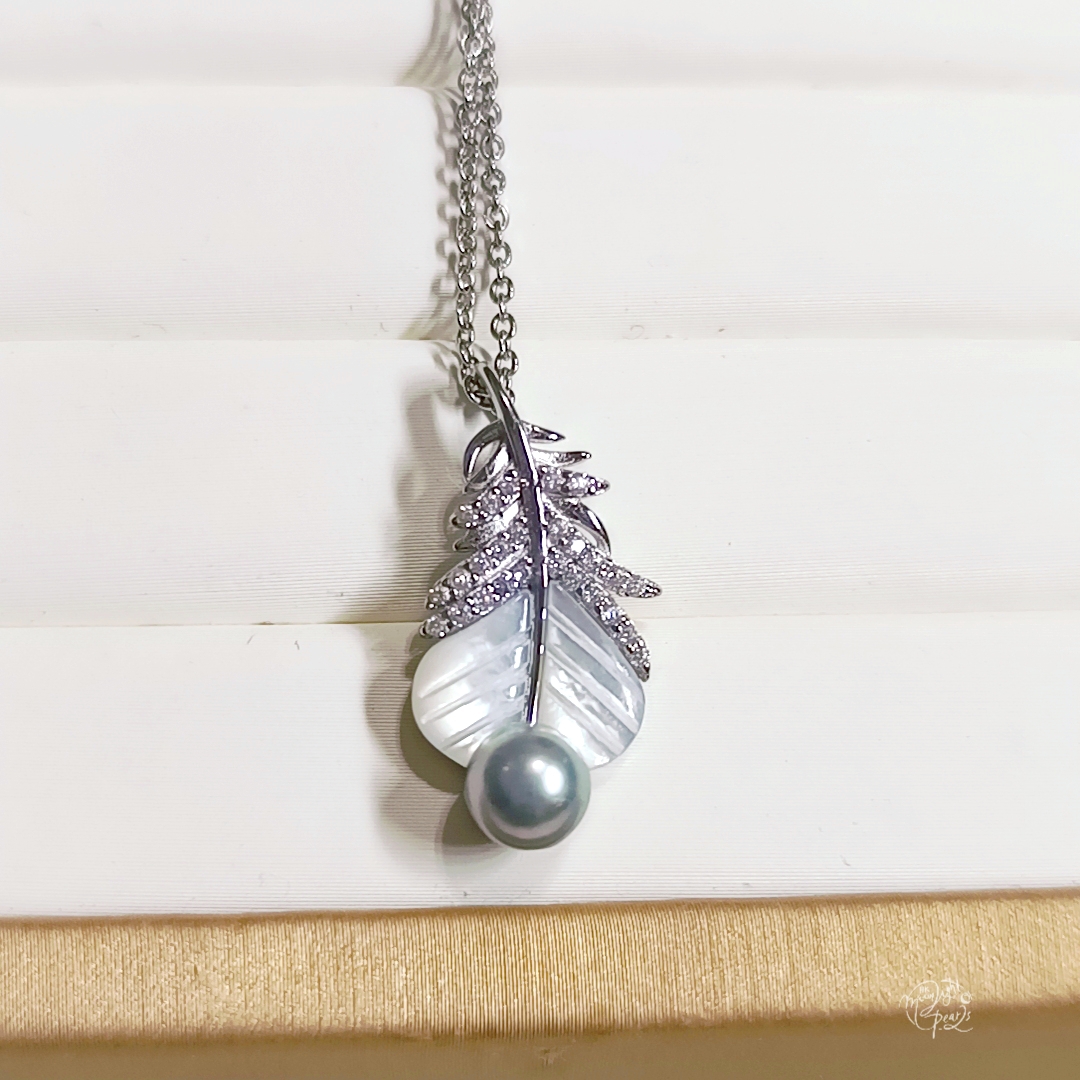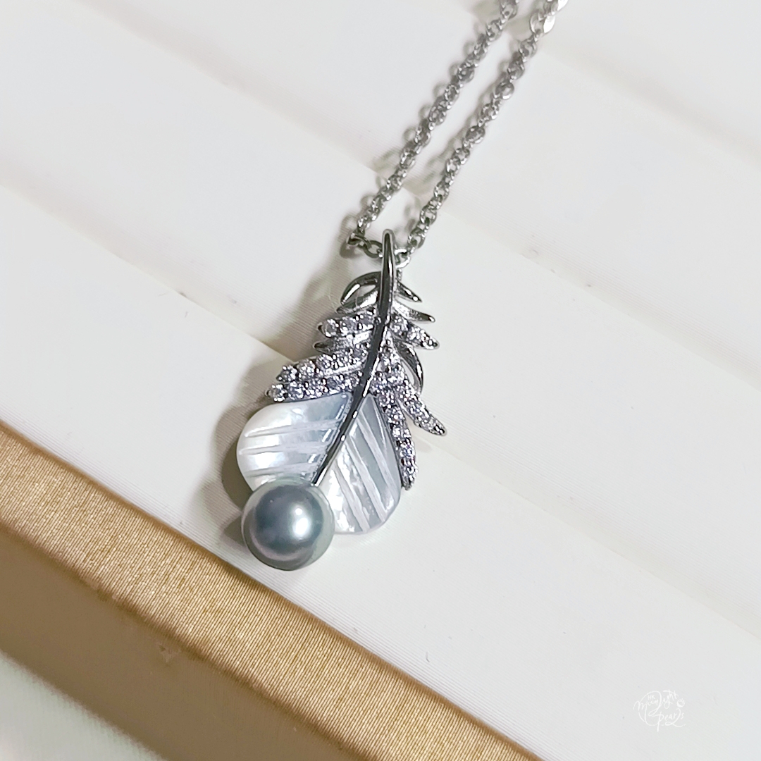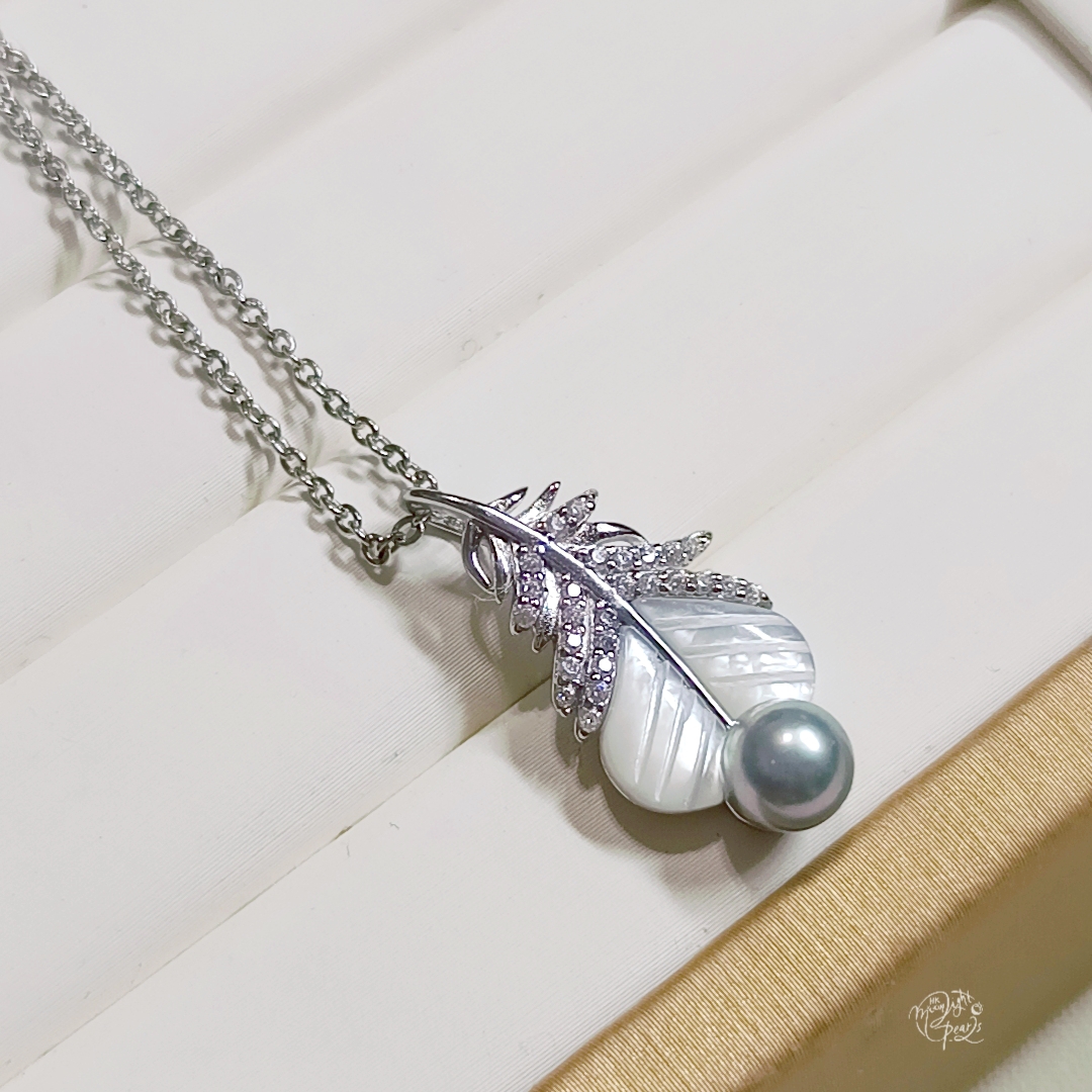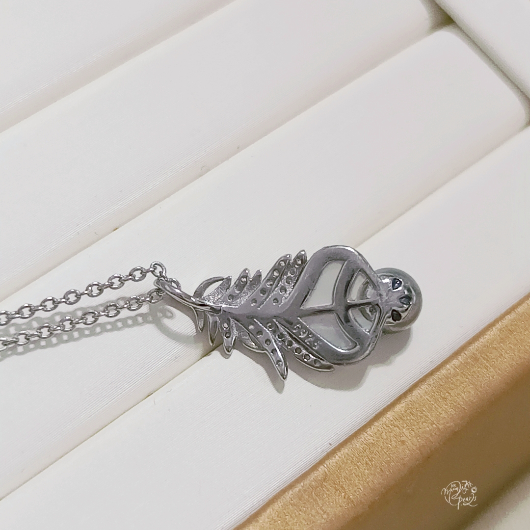 正圓極強光日本真多麻海水珍珠精工s925銀微鑲鋯石母貝羽毛吊墜(送注白金鍊)