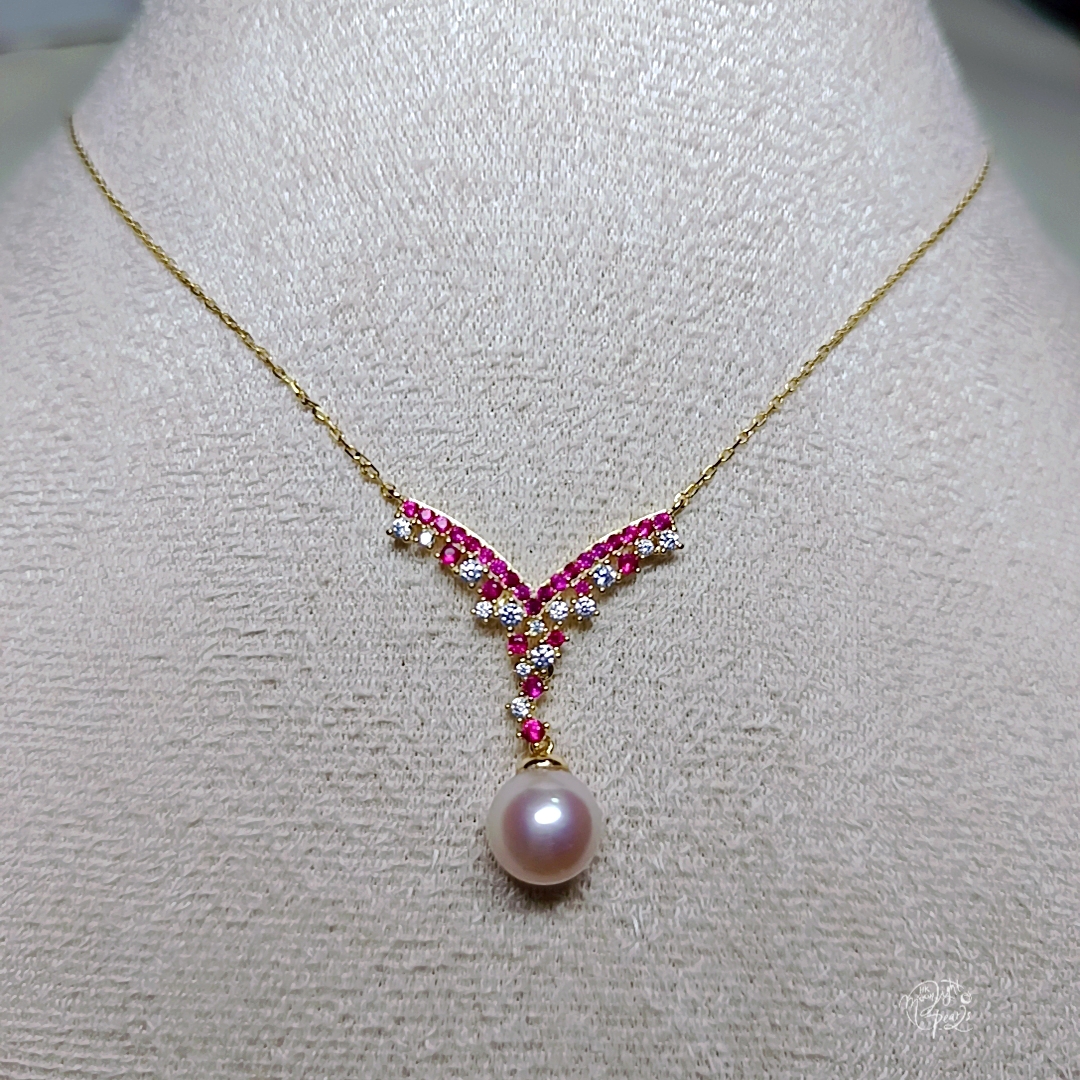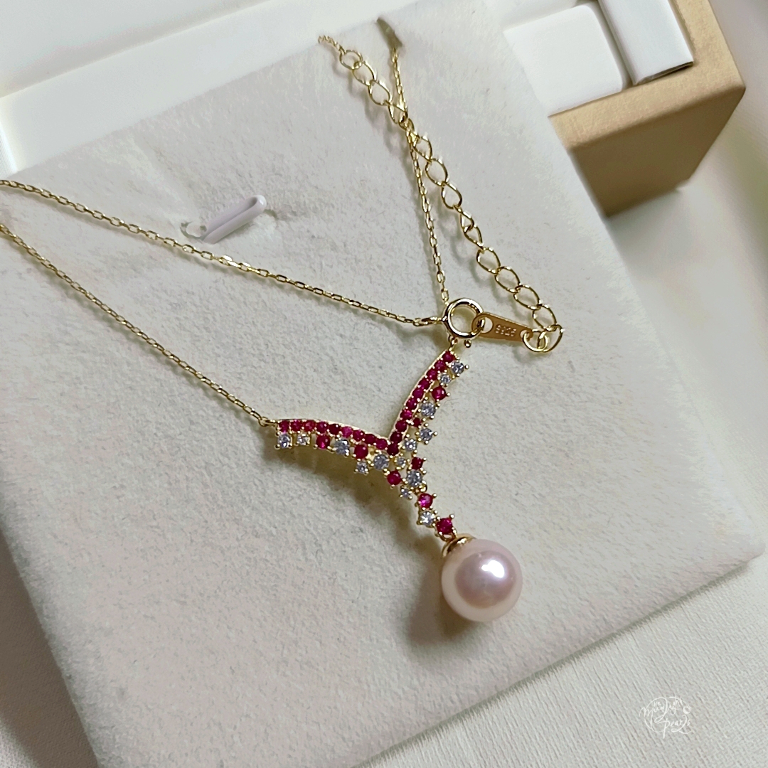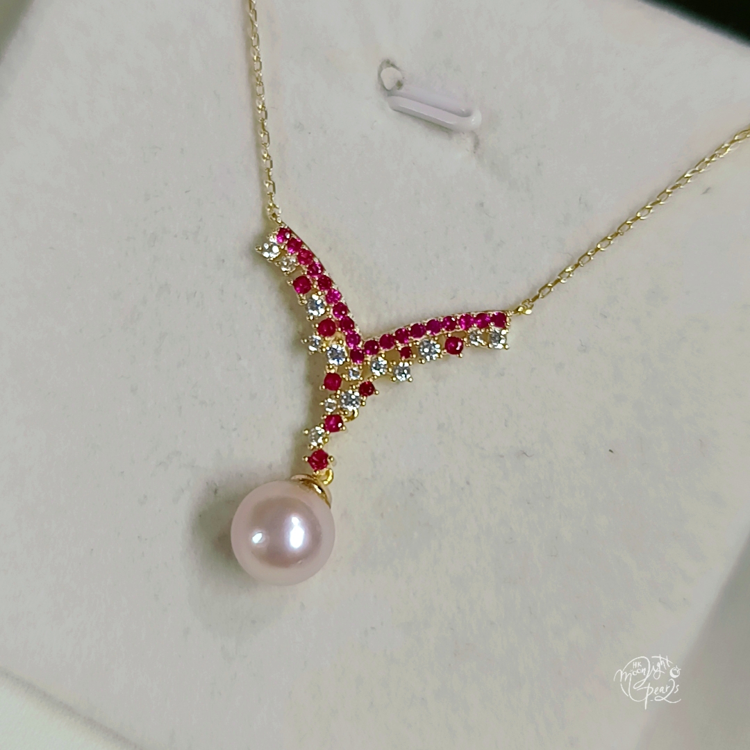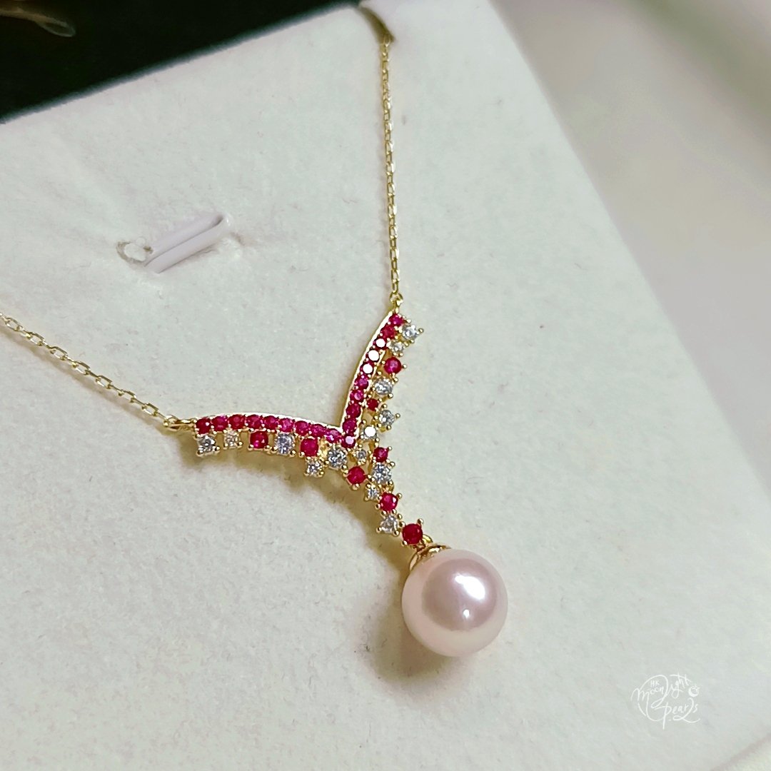 正圓極強光日本akoya櫻花粉海水珠精工s925銀微鑲紅鋯石公主套鍊