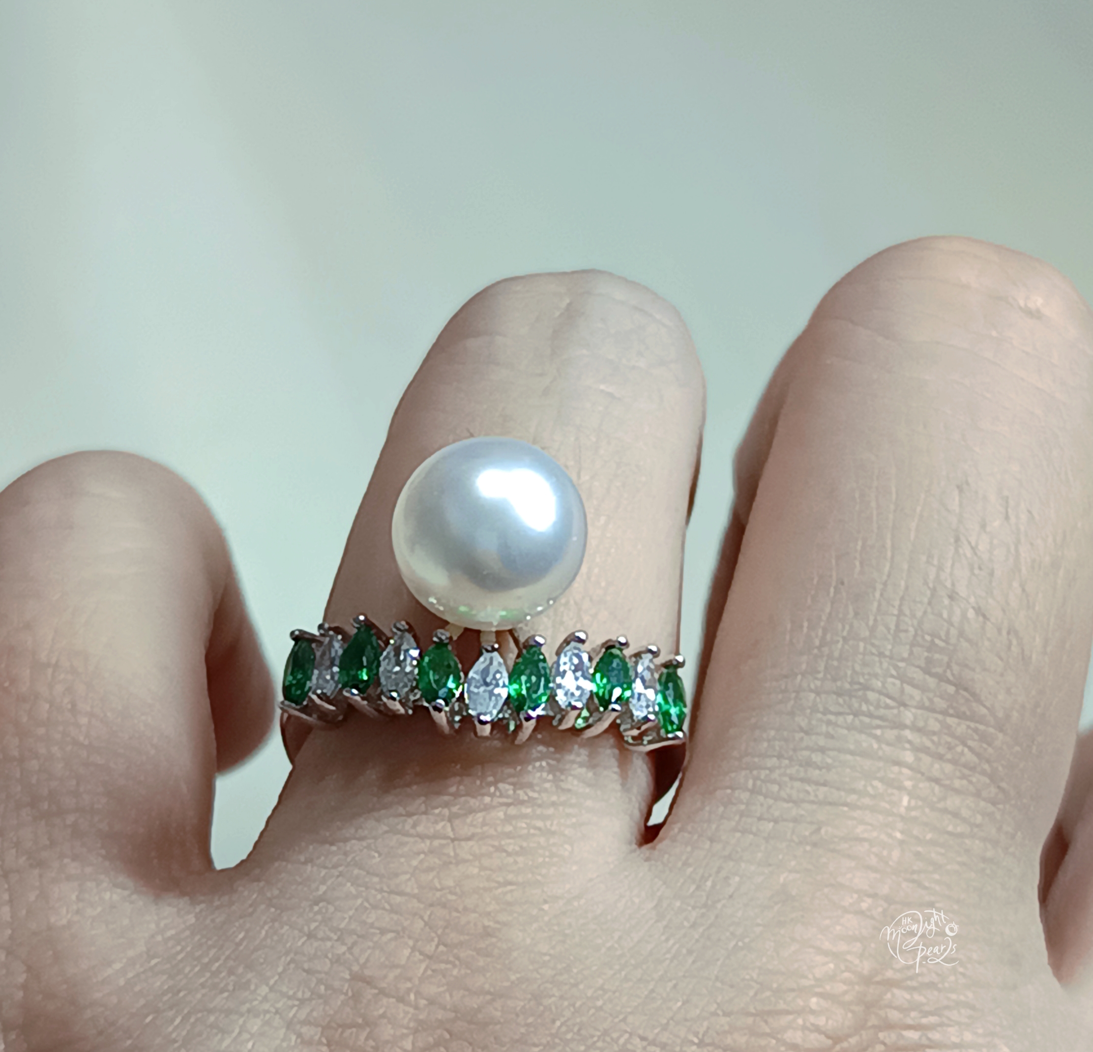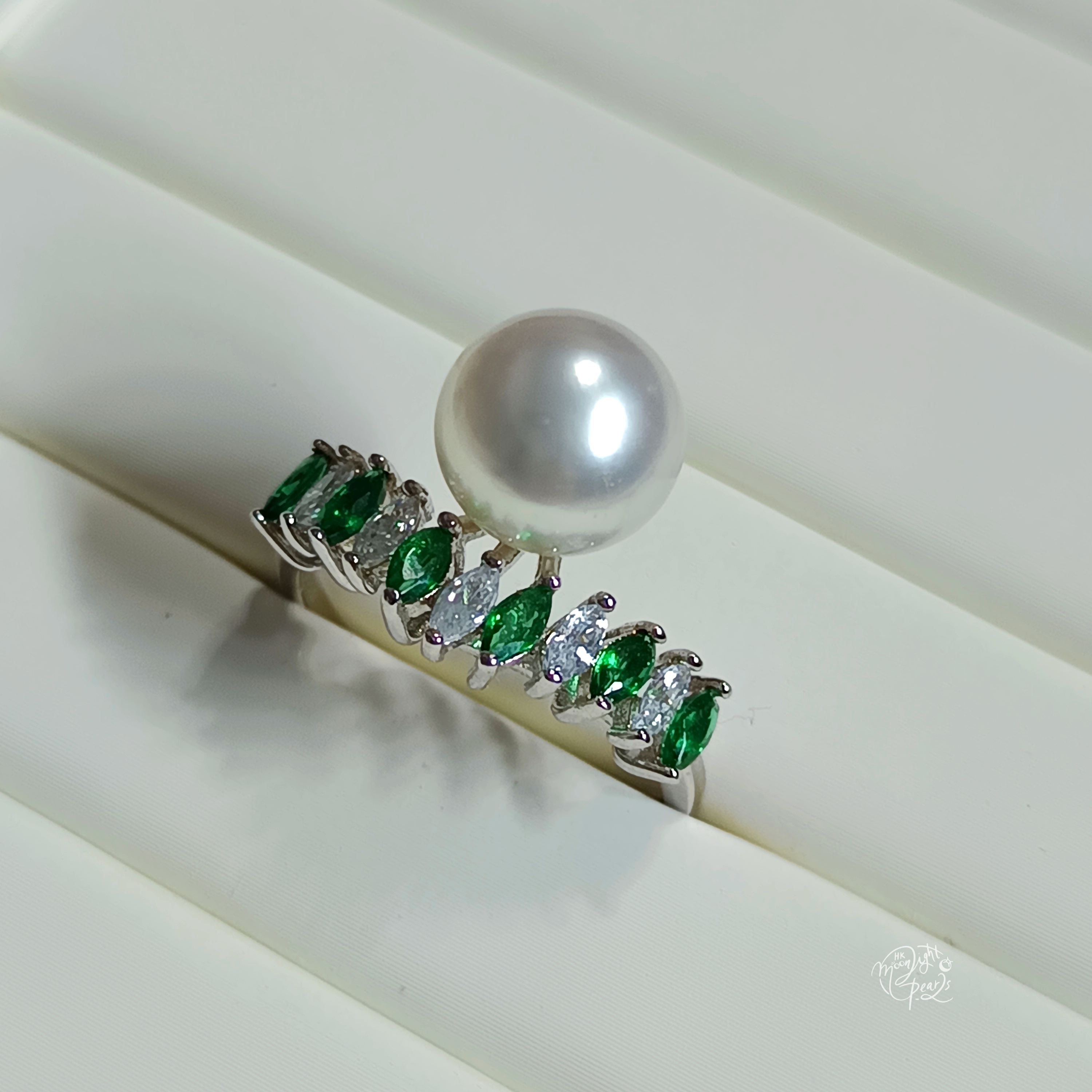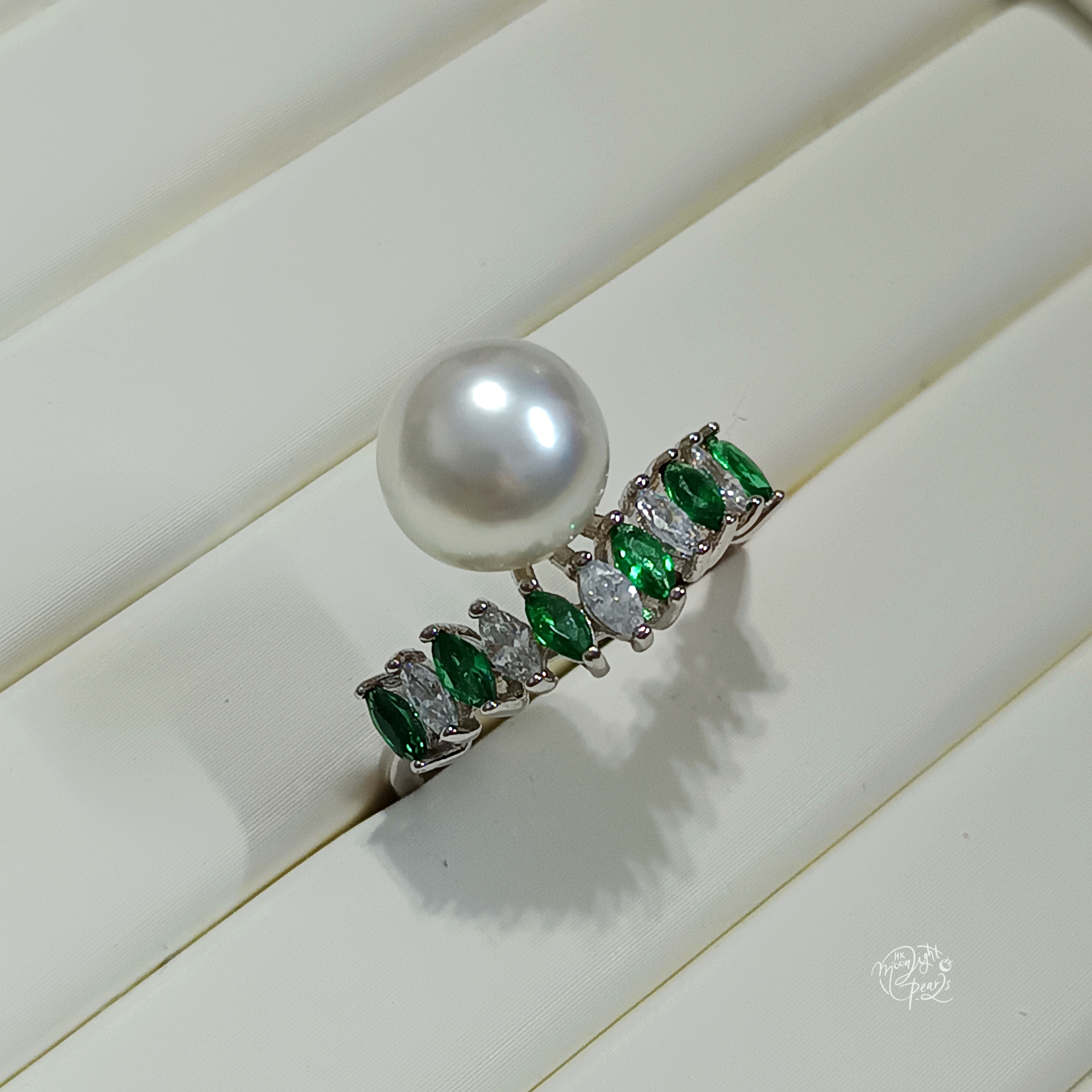 正圓銀白冷光澳白海水珍珠精工s925銀微鑲祖母綠色鋯石開口戒指