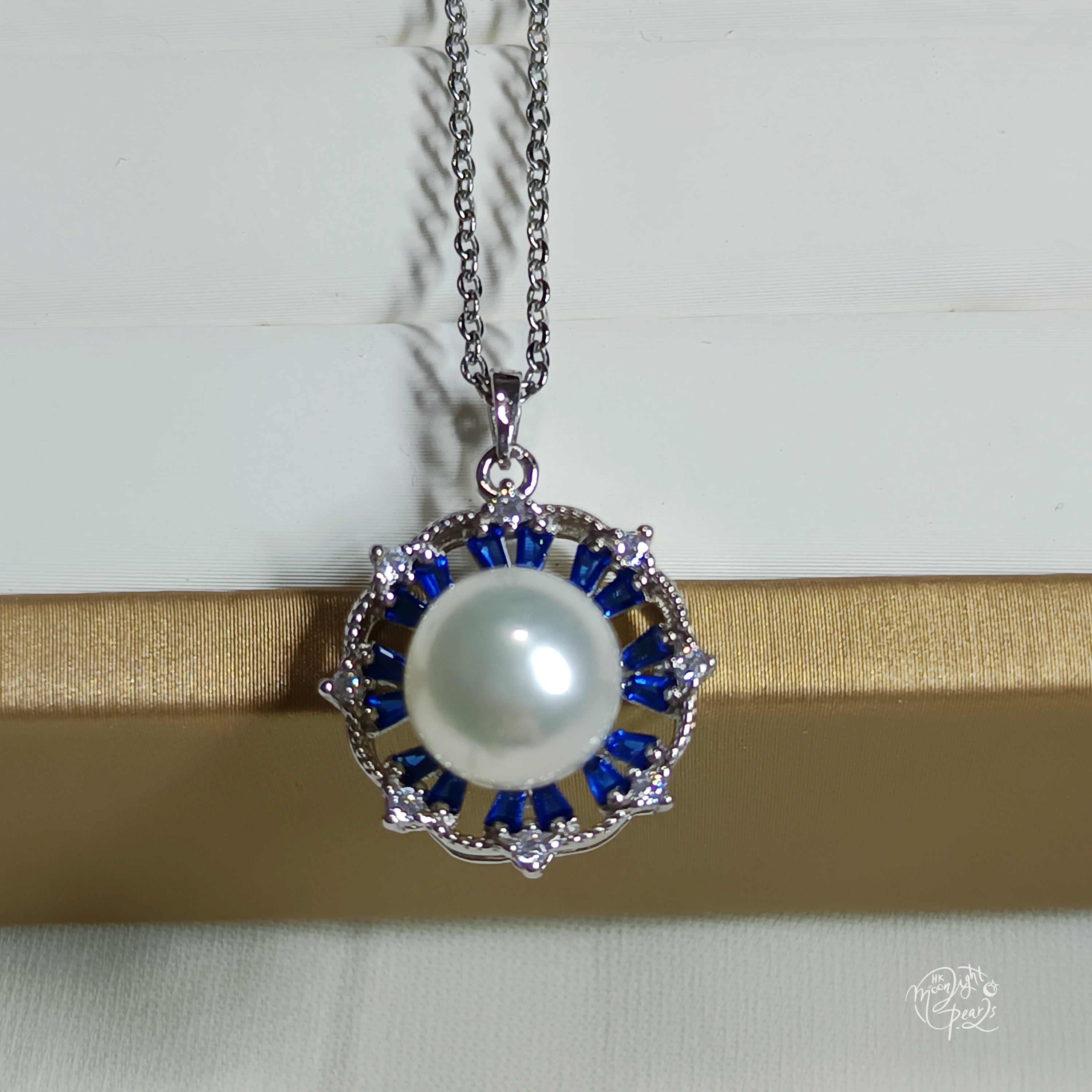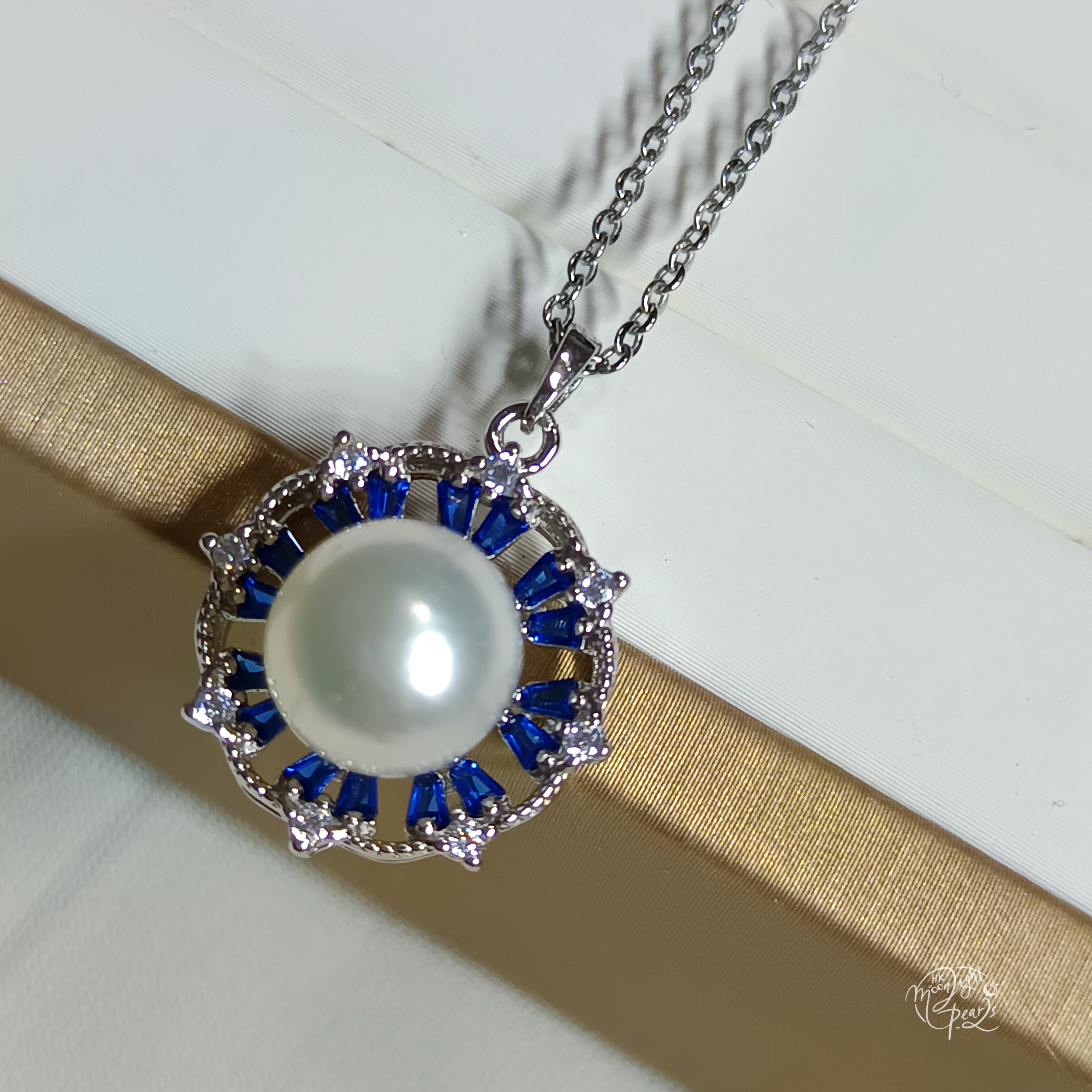 正圓銀白冷光澳白海水珍珠精工s925銀微鑲藍鋯石吊墜(送注白金鍊)
