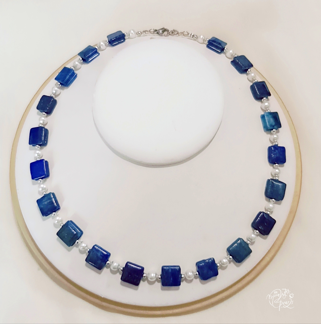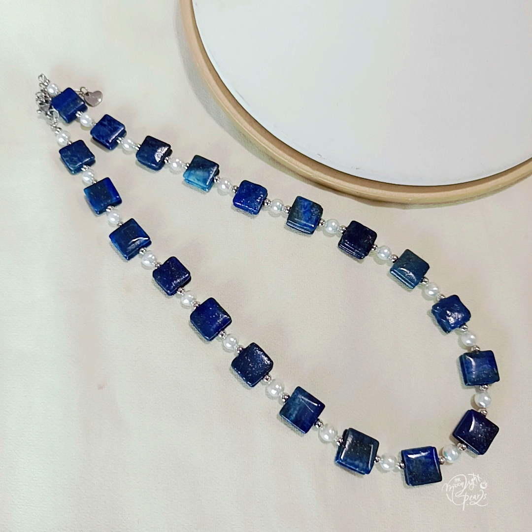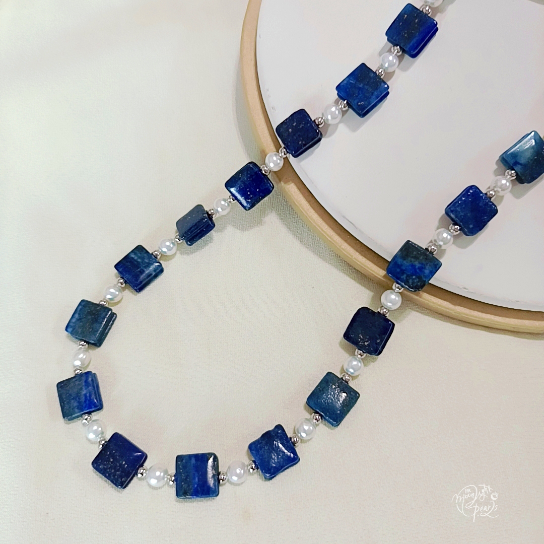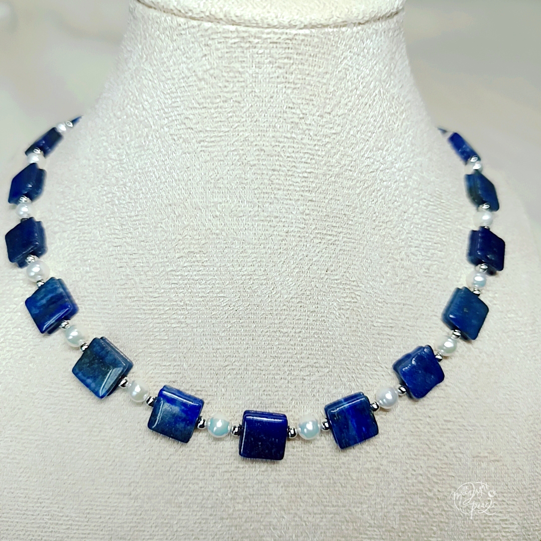珍珠尺寸5-5.5mm, 青金石尺寸10mm 項鍊長度42+5cm尾鍊 精品淡水AK白細胞珍珠,滑皮強光無瑕,配搭天然青金石,色系時尚,佩戴時尚個性氣質