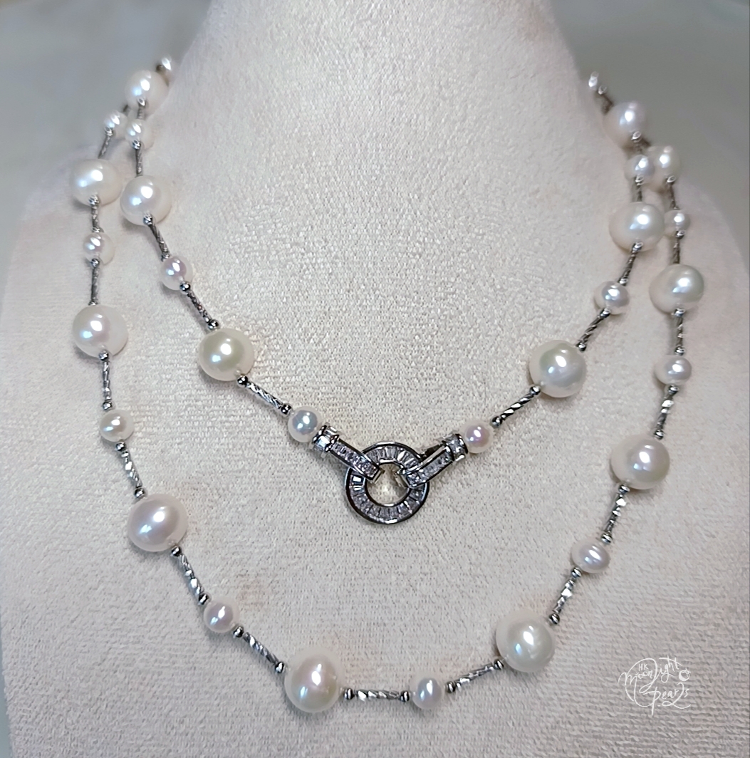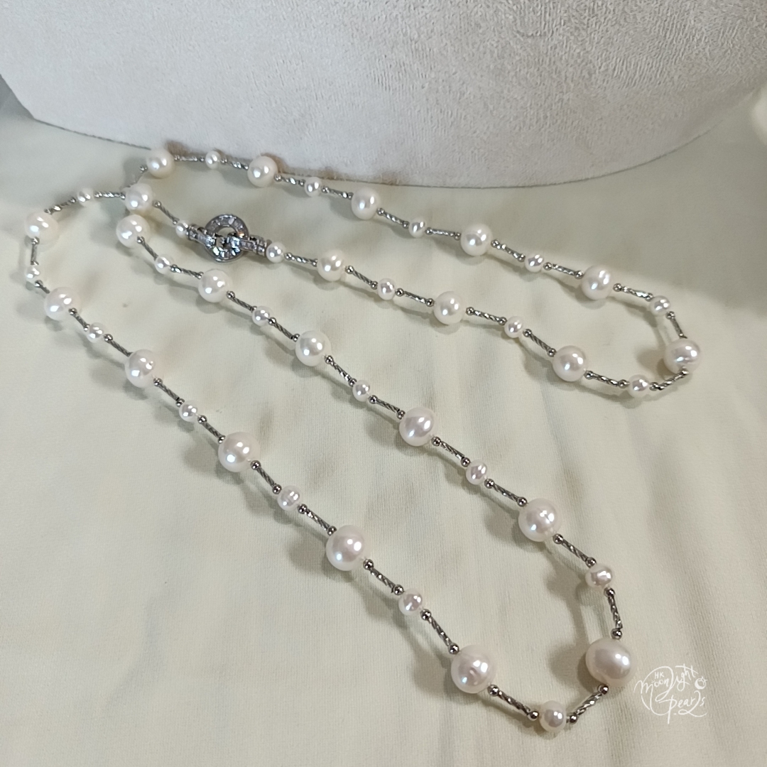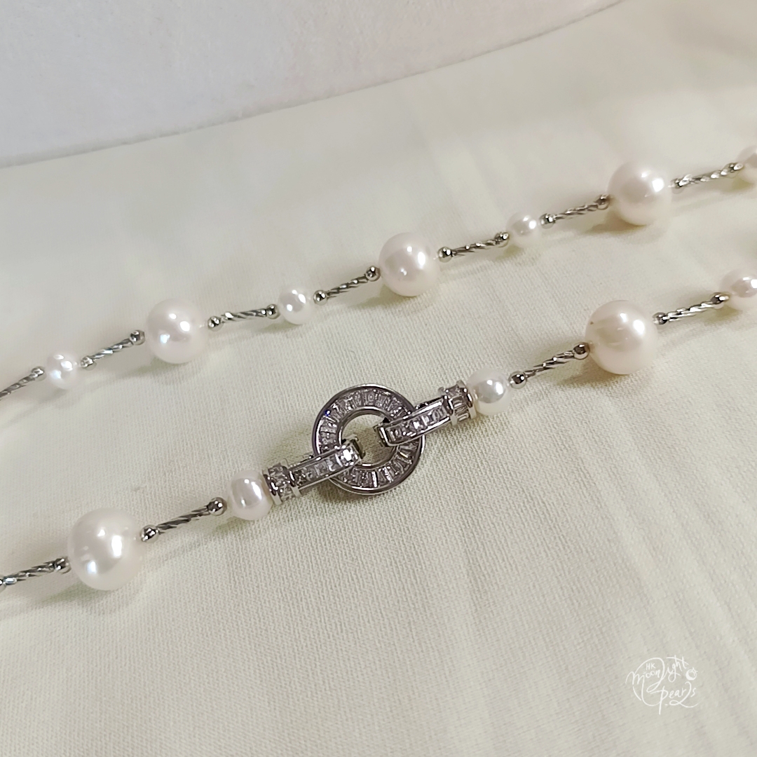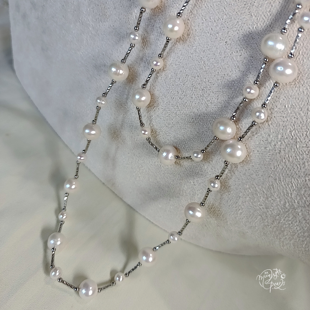 近圓強光淡水無核珍珠注白金扣滿天星款毛衣鍊