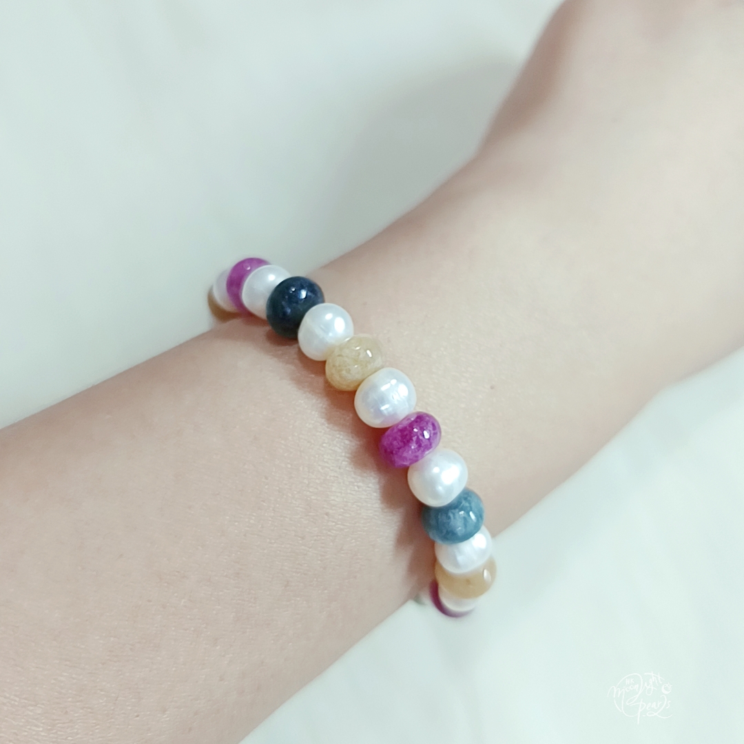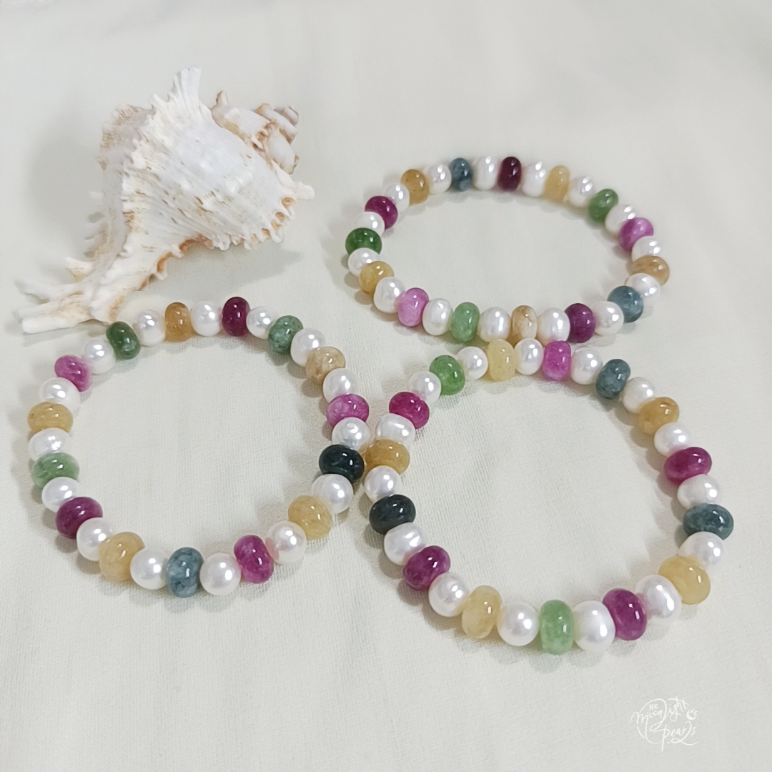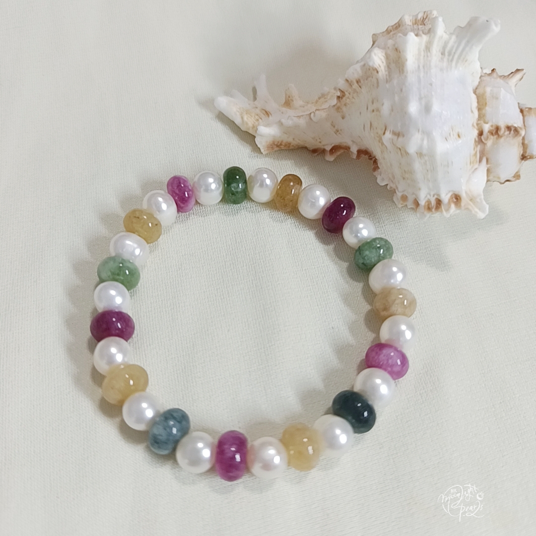近圓強光淡水珍珠+天然糖果碧璽彈力手鍊