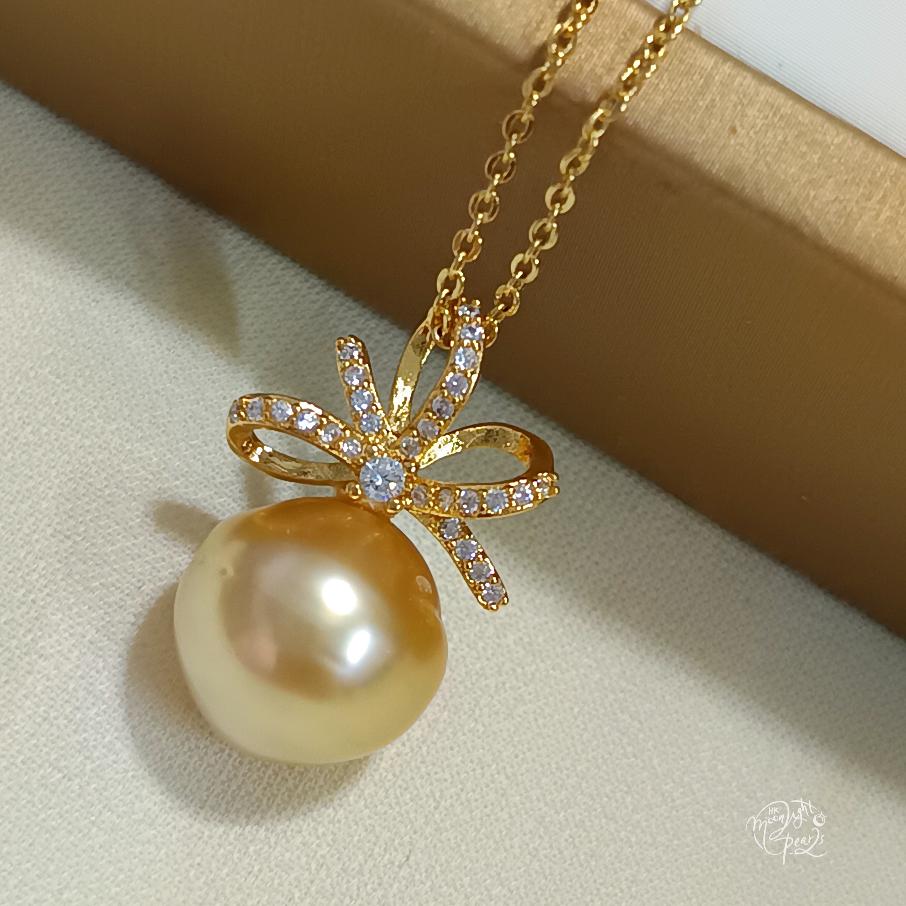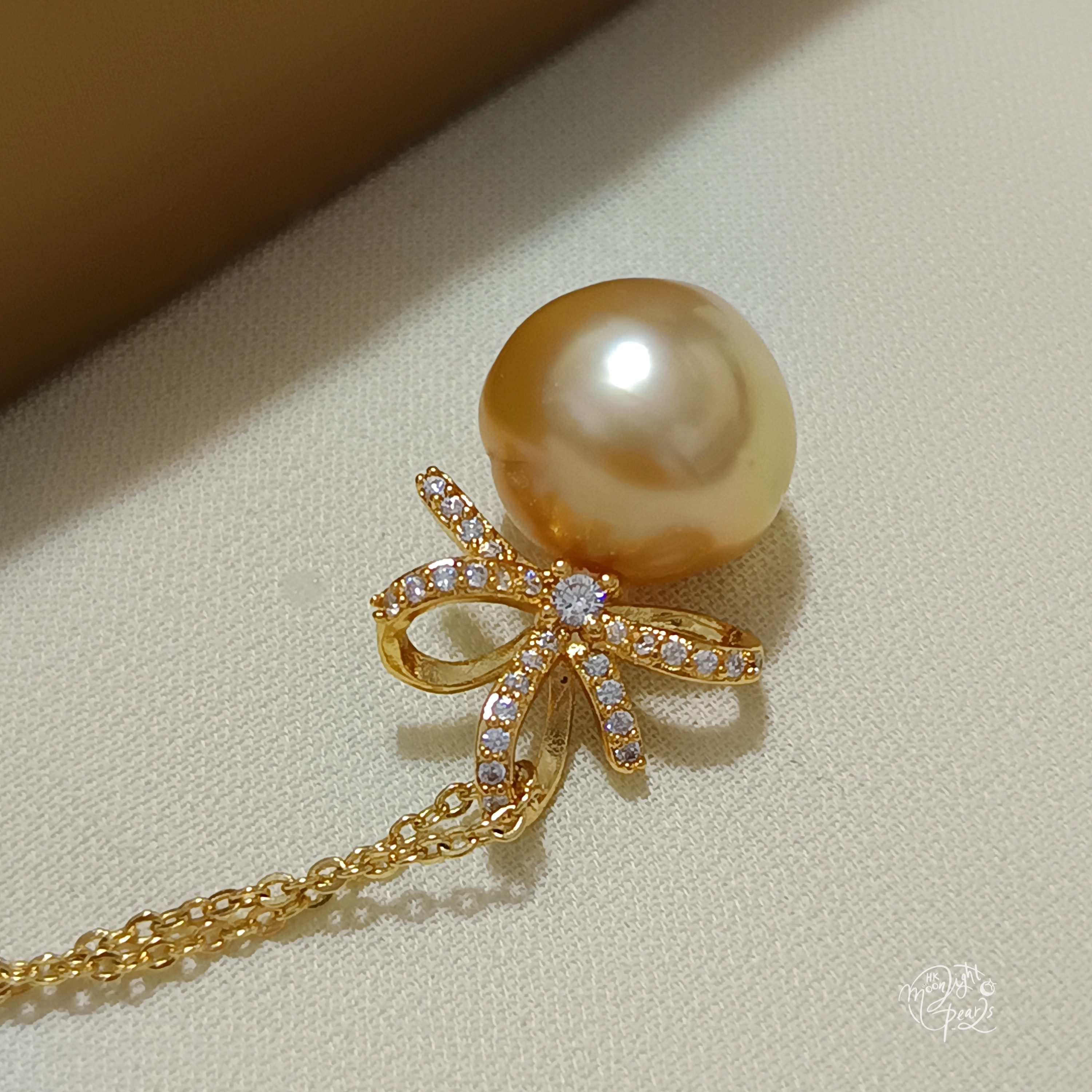 特價品‼️近圓強光濃金色南洋海水珠注金蝴蝶結吊墜(送注金鍊)