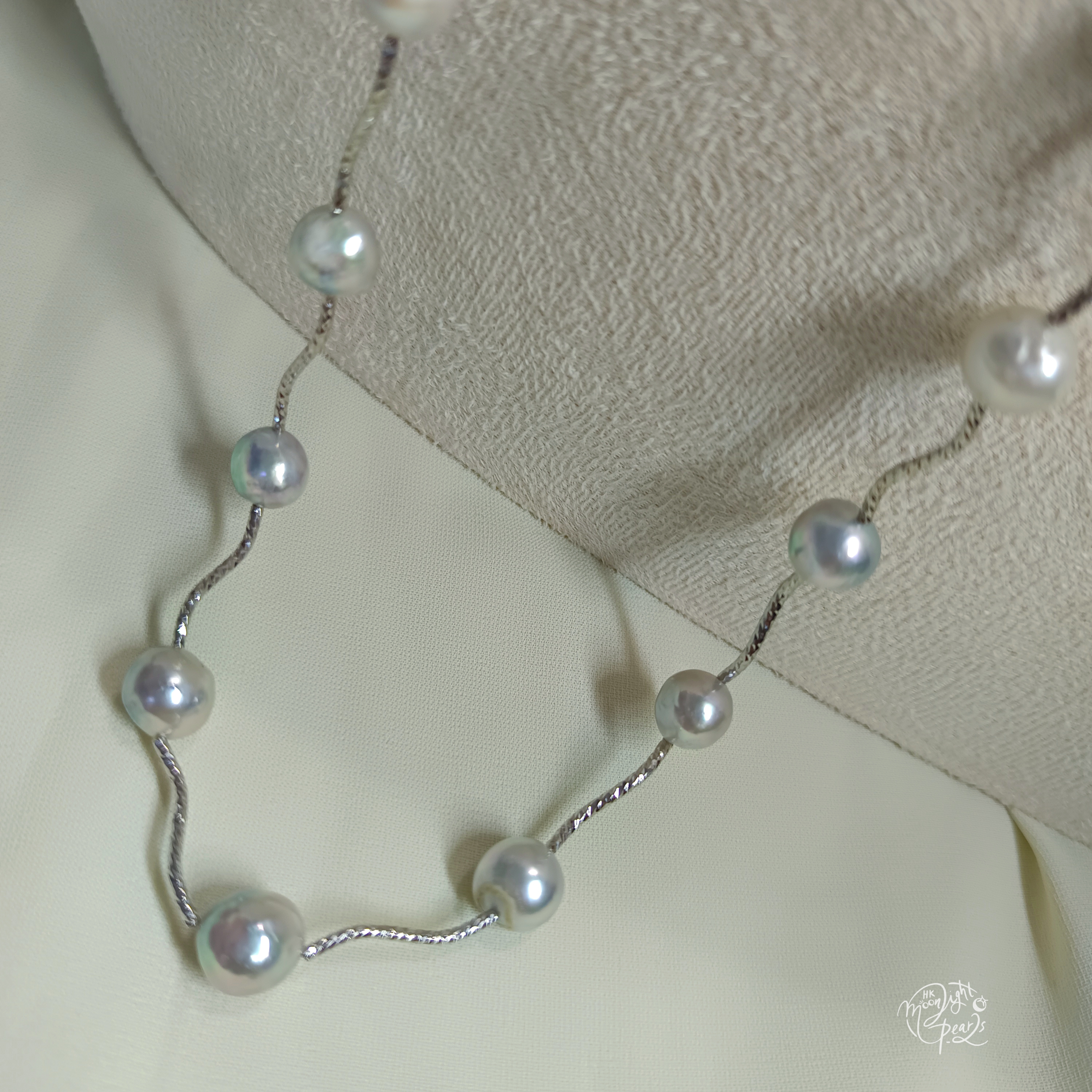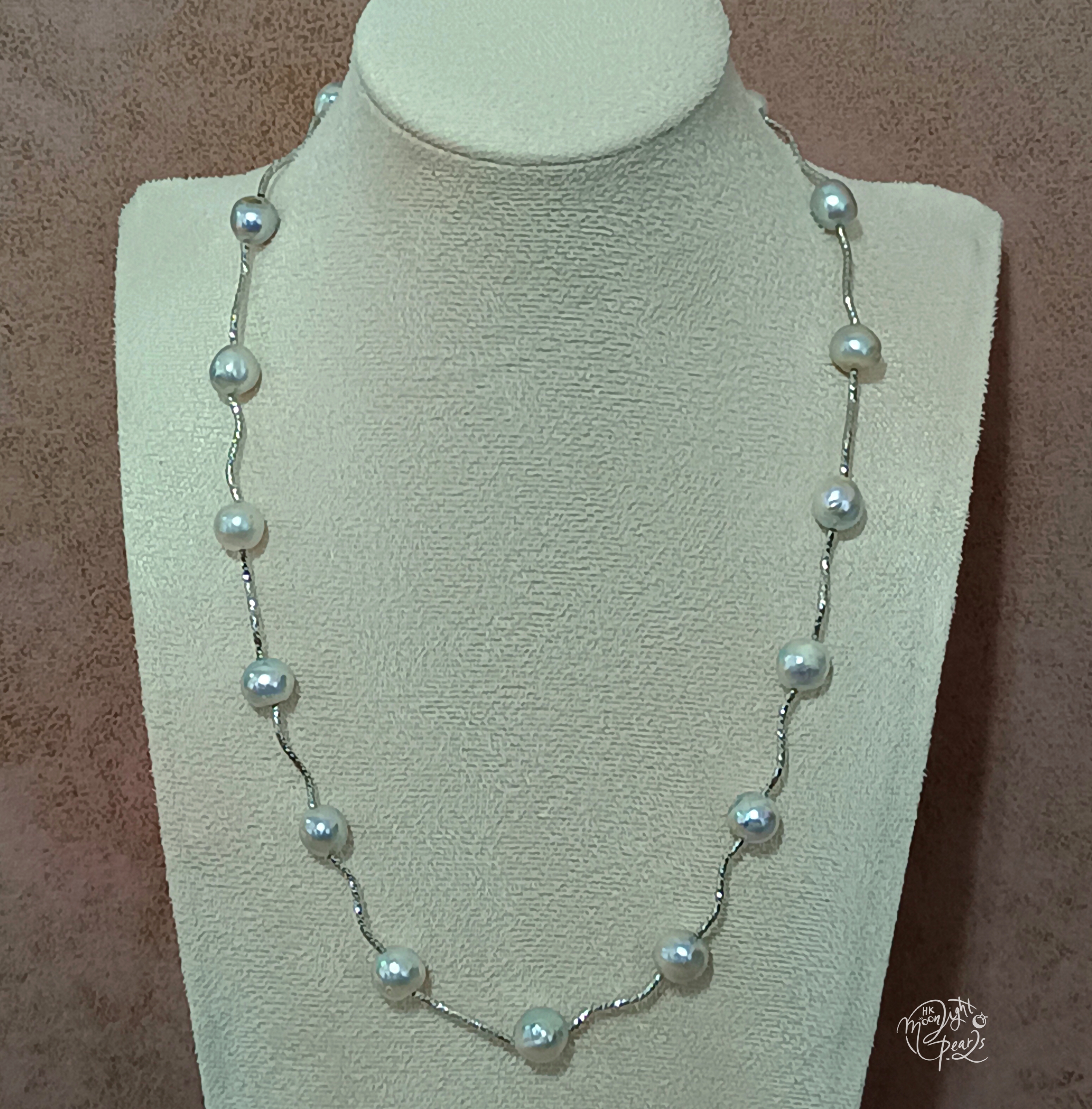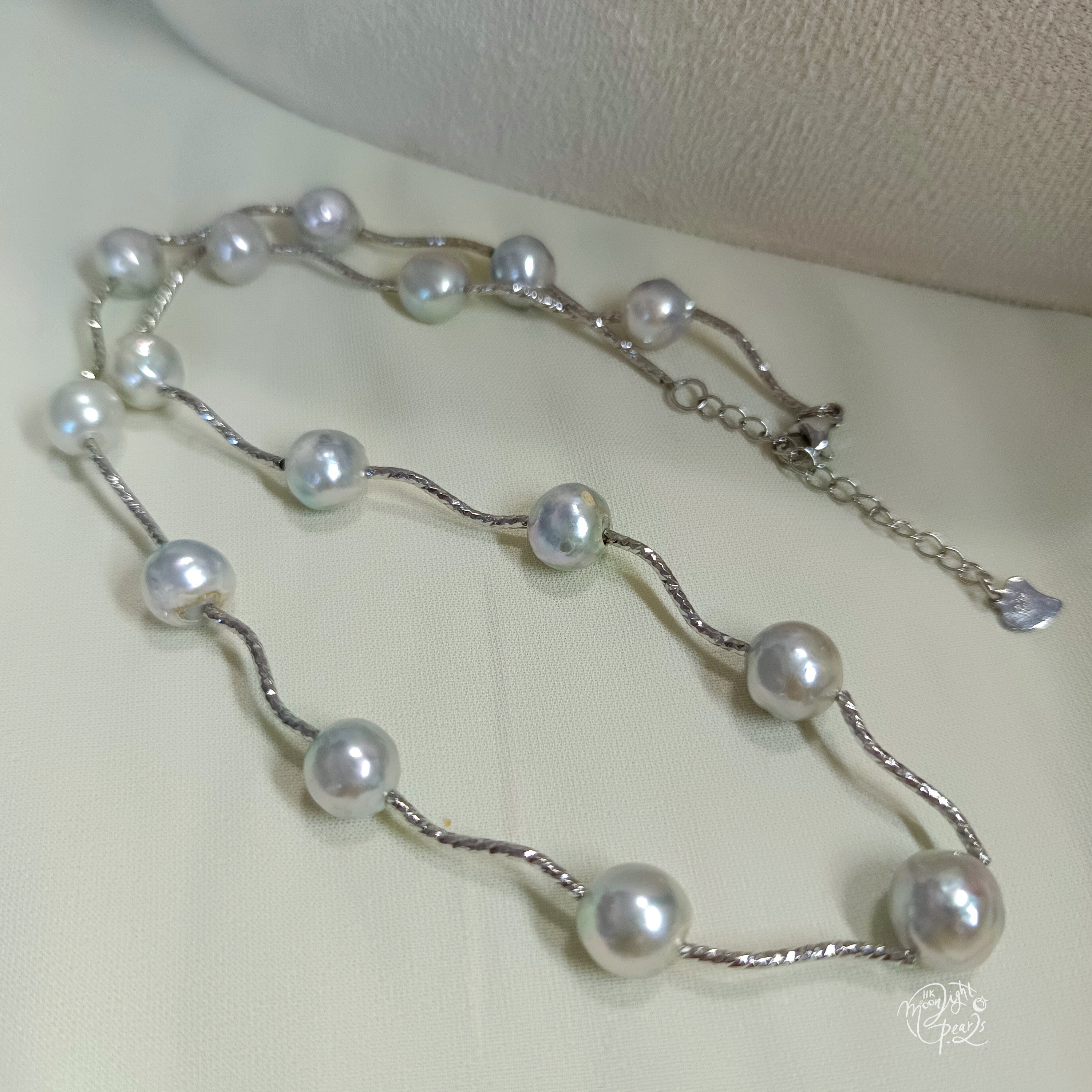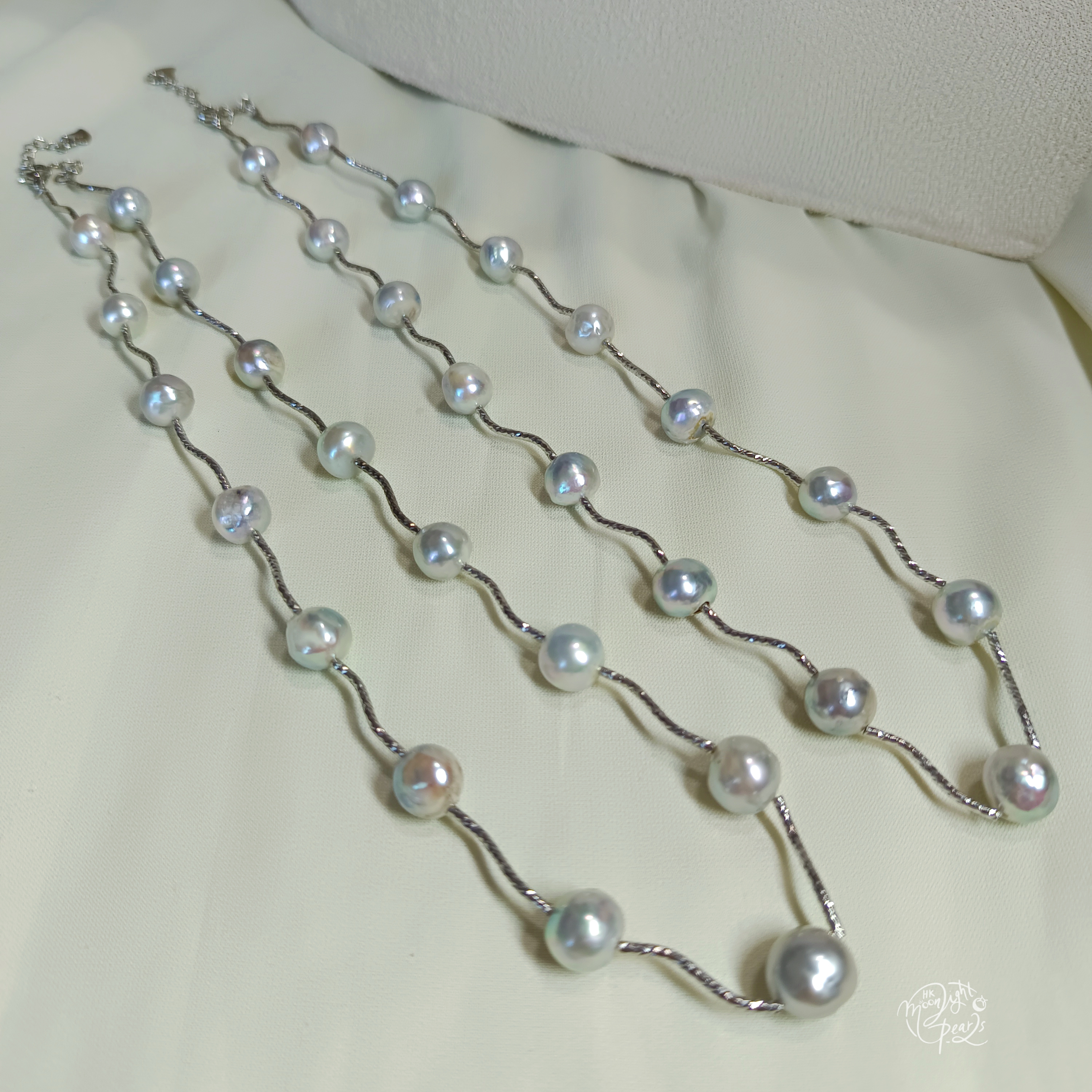 珍珠尺寸9-10mm 項鍊長度48+5cm尾鍊 日本近圓真多麻巴洛克海水珍珠,珠光靚,銀藍灰炫彩,細微生長紋/瑕疵佩戴不明顯,秋冬配深色毛衣超靚👍,上身時尚氣質!
