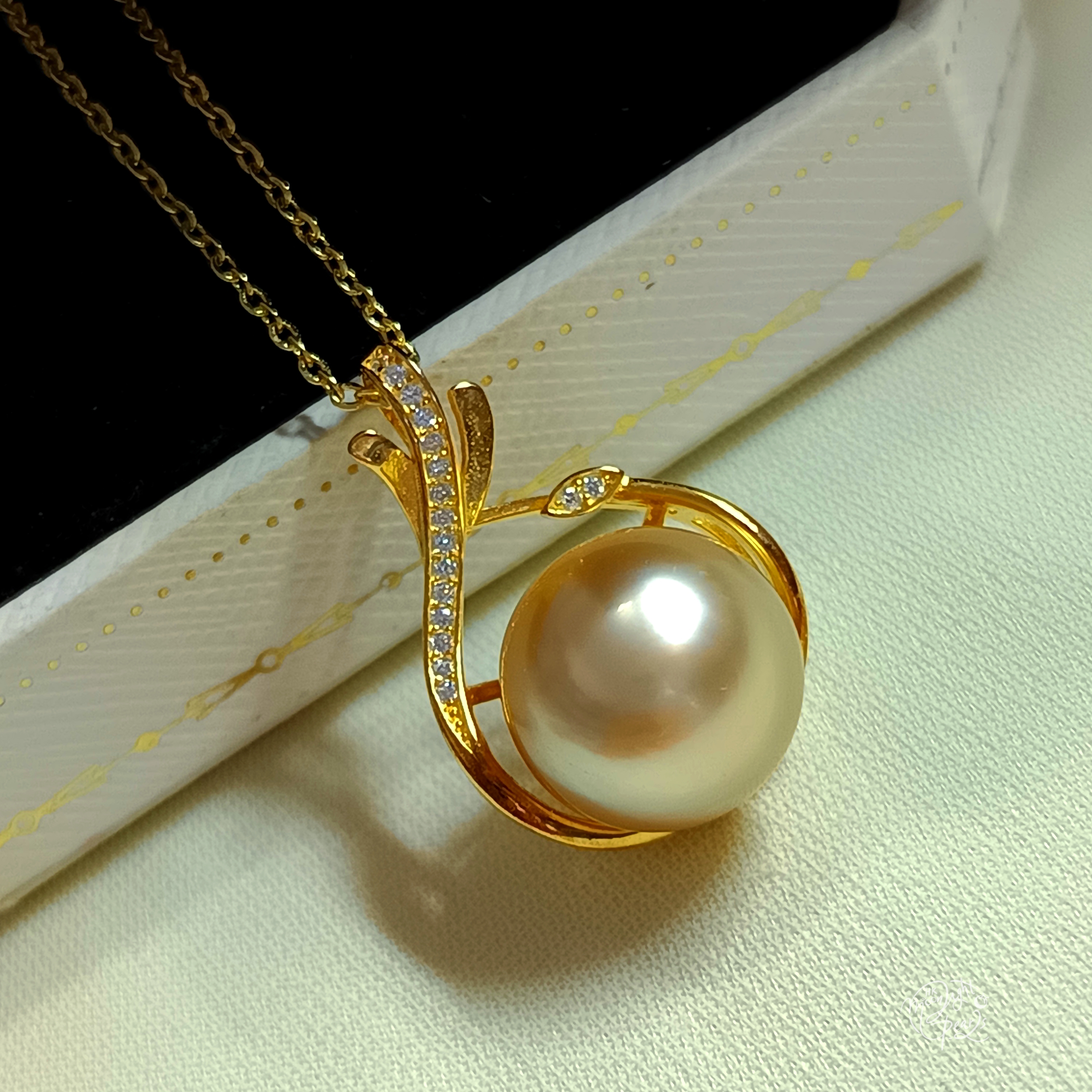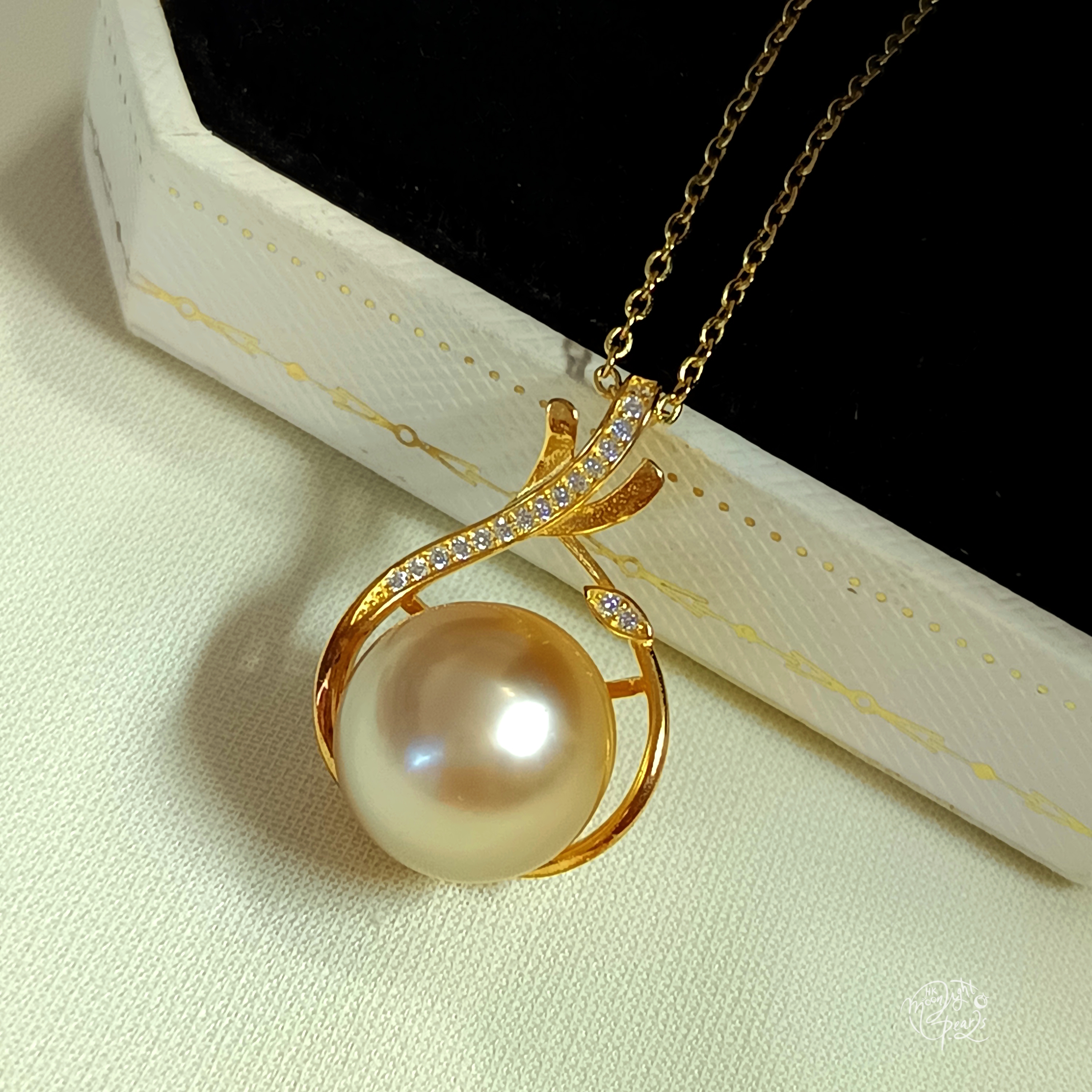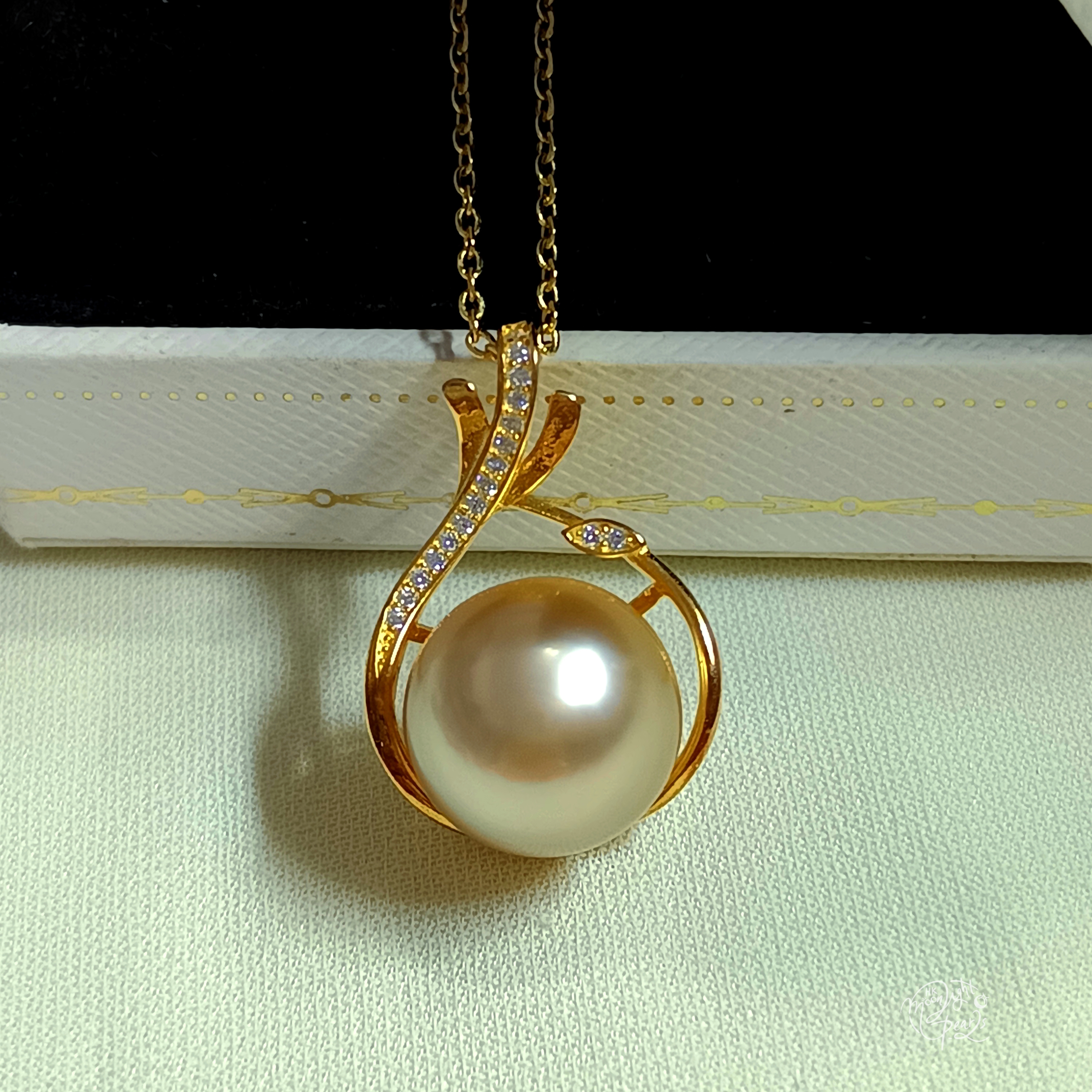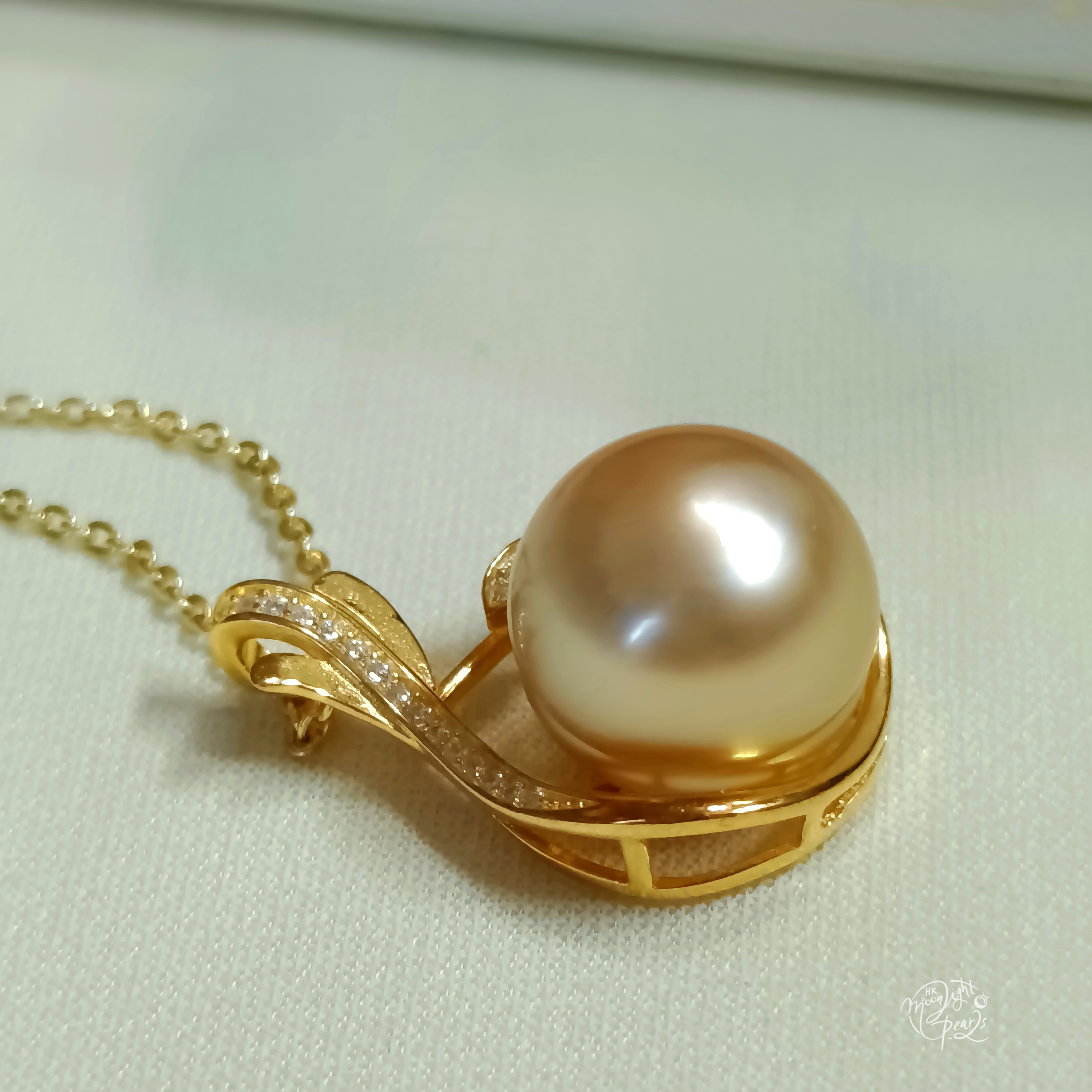 近圓極強光南洋濃金海水珍珠精工s925銀微鑲鋯石吊墜(送注金鍊)