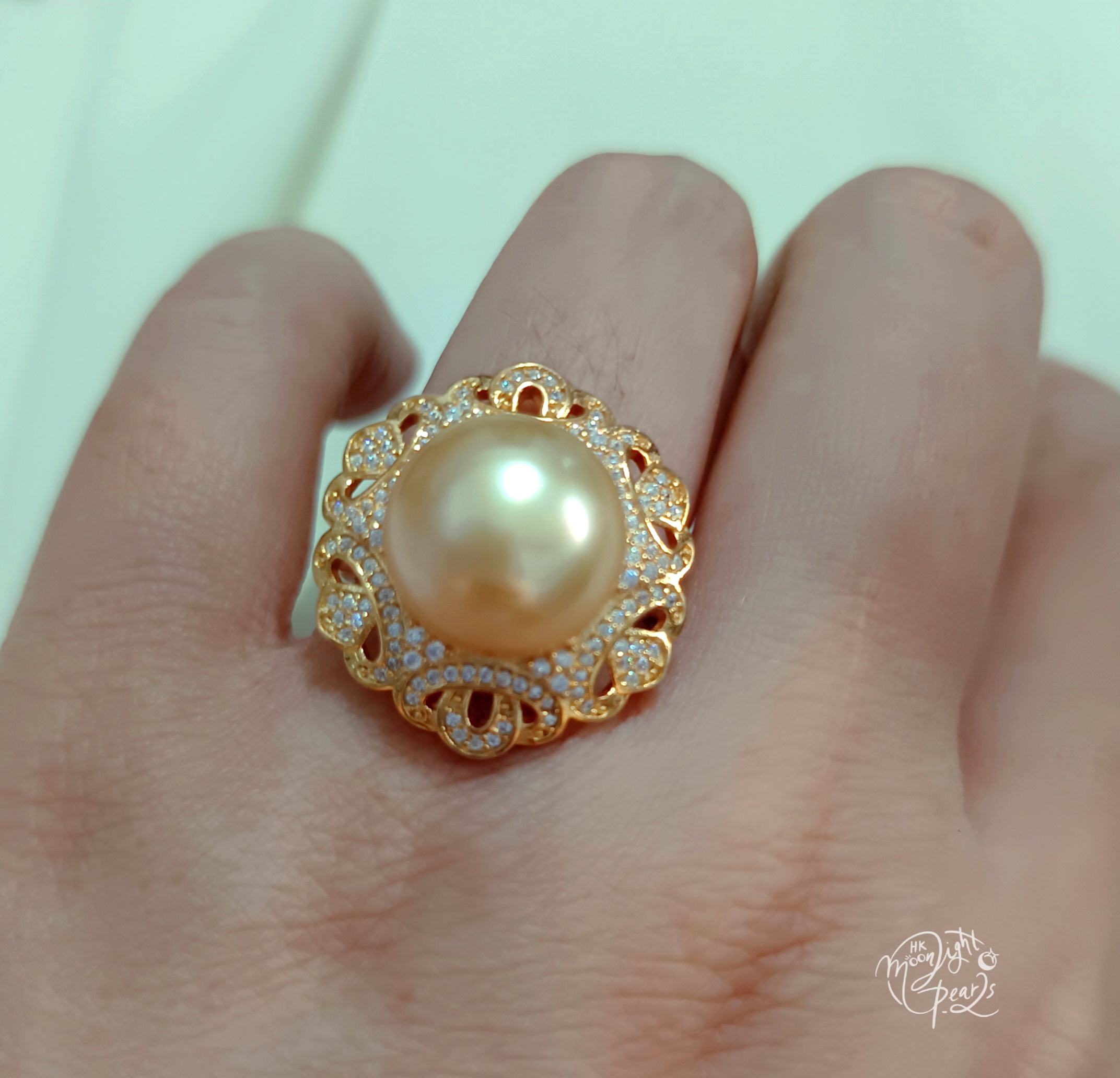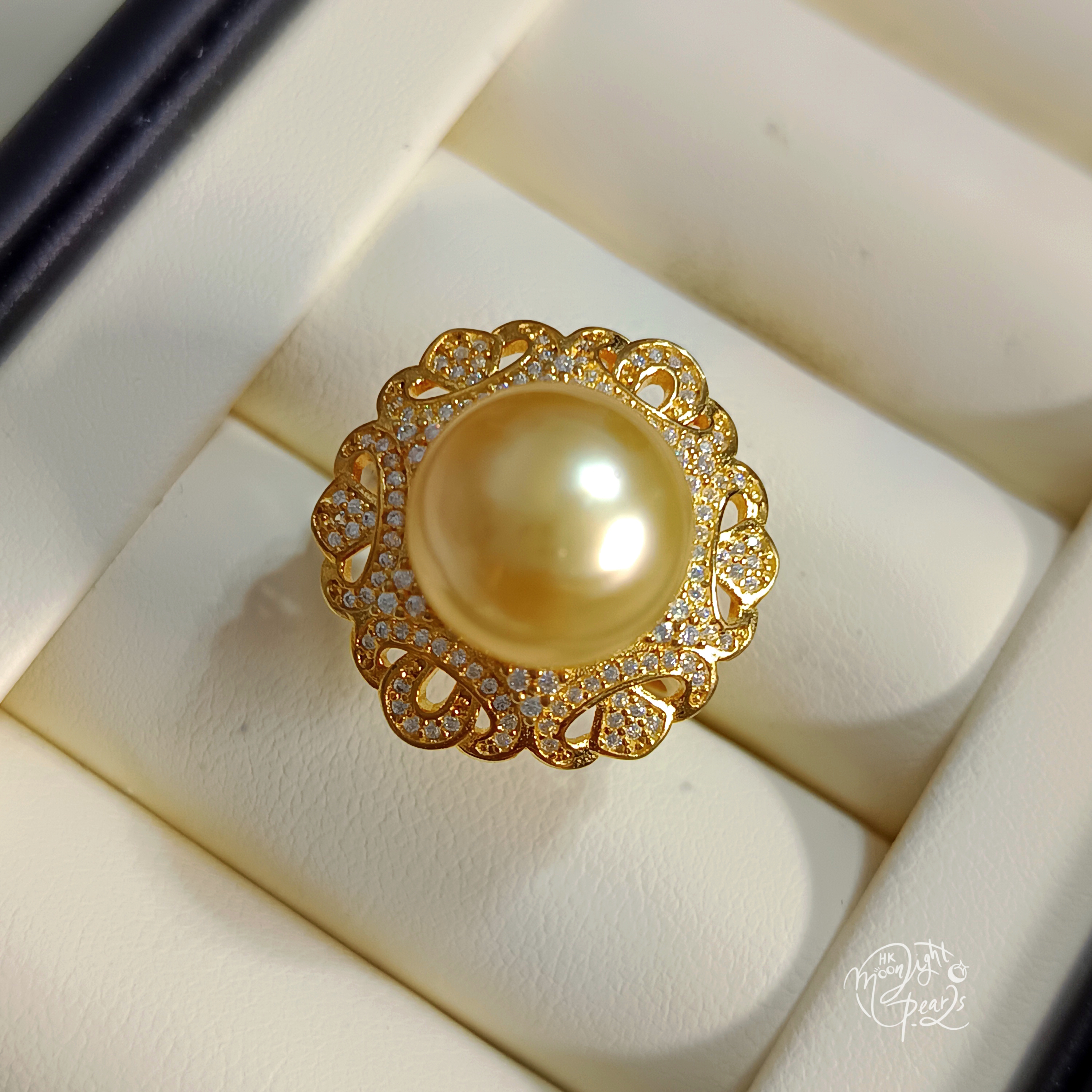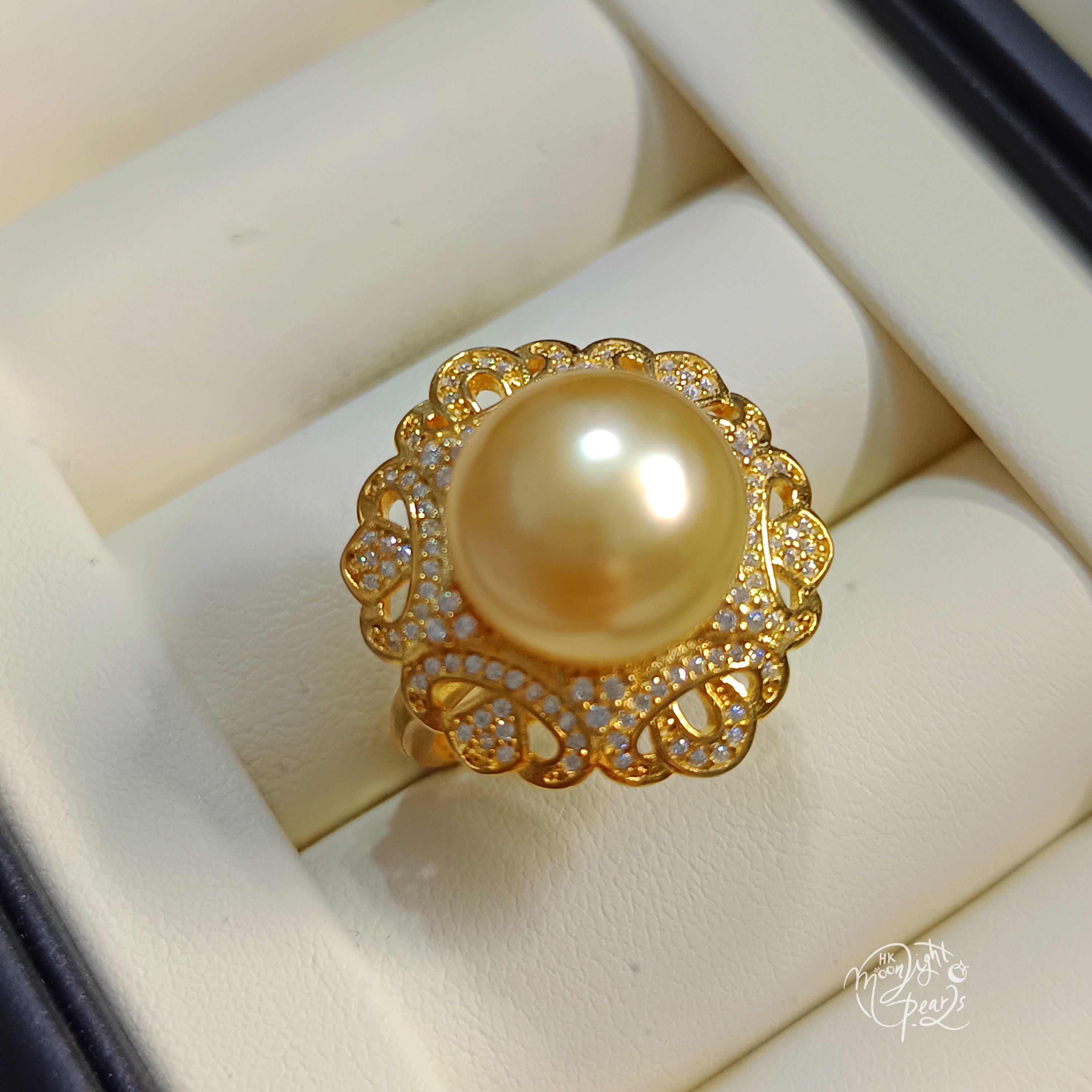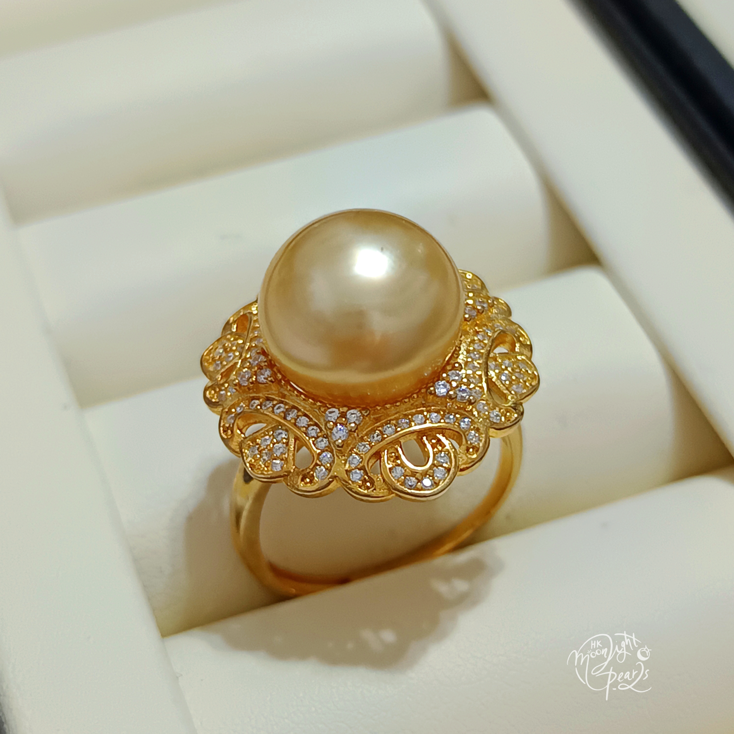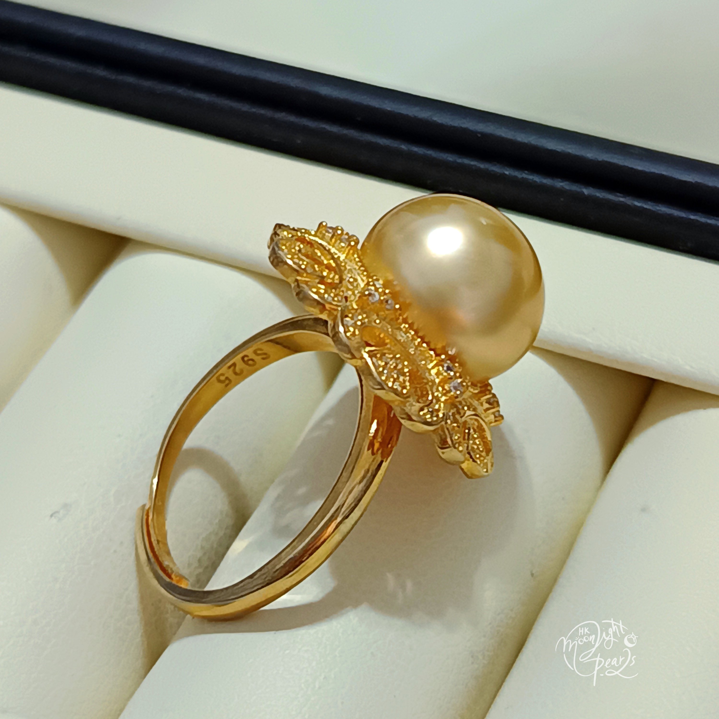 近圓極強光南洋濃金海水珍珠精工s925銀微鑲鋯石開口戒指