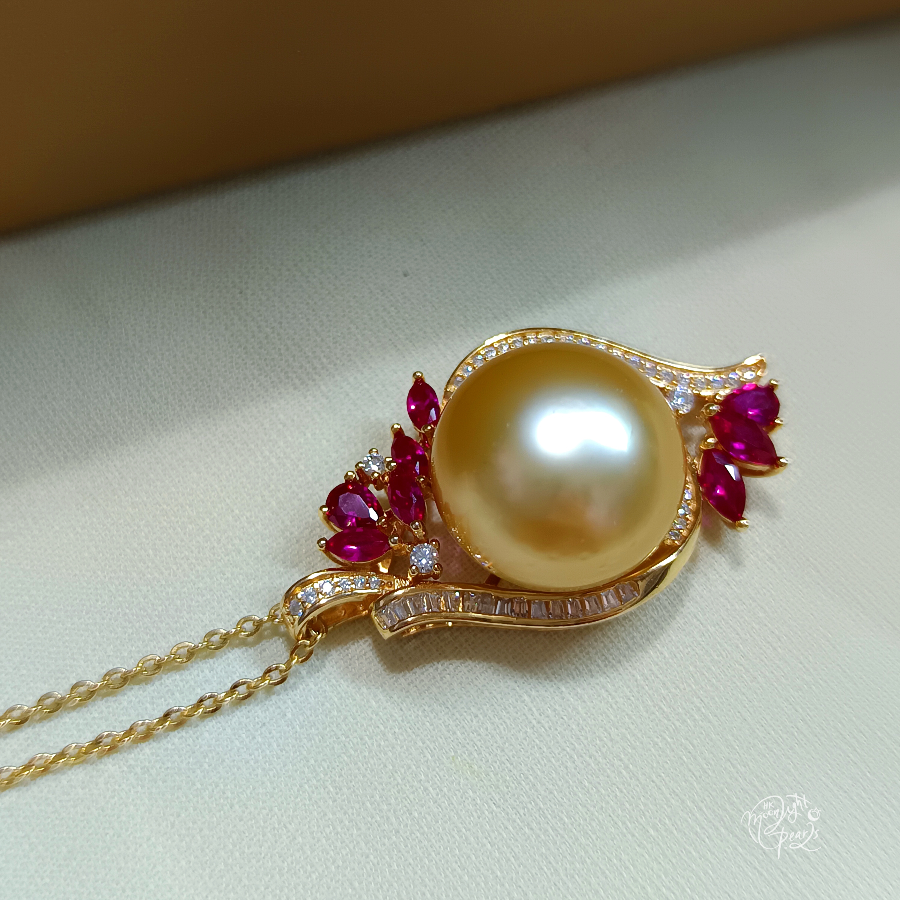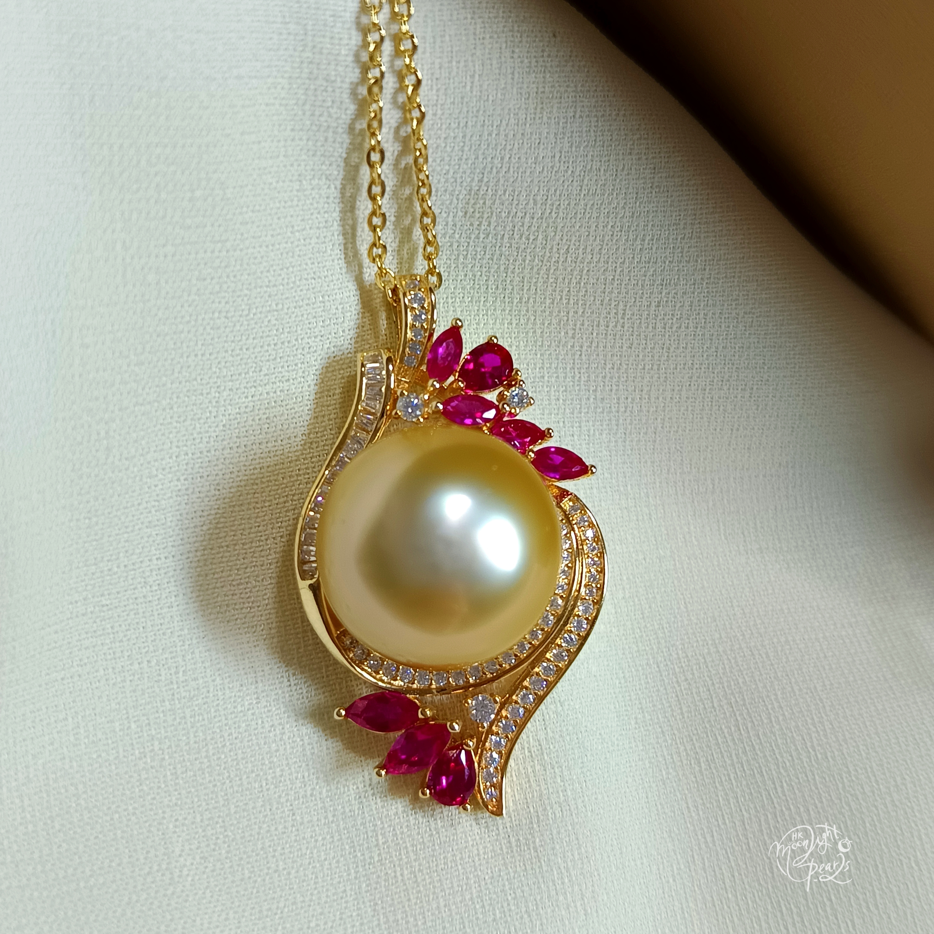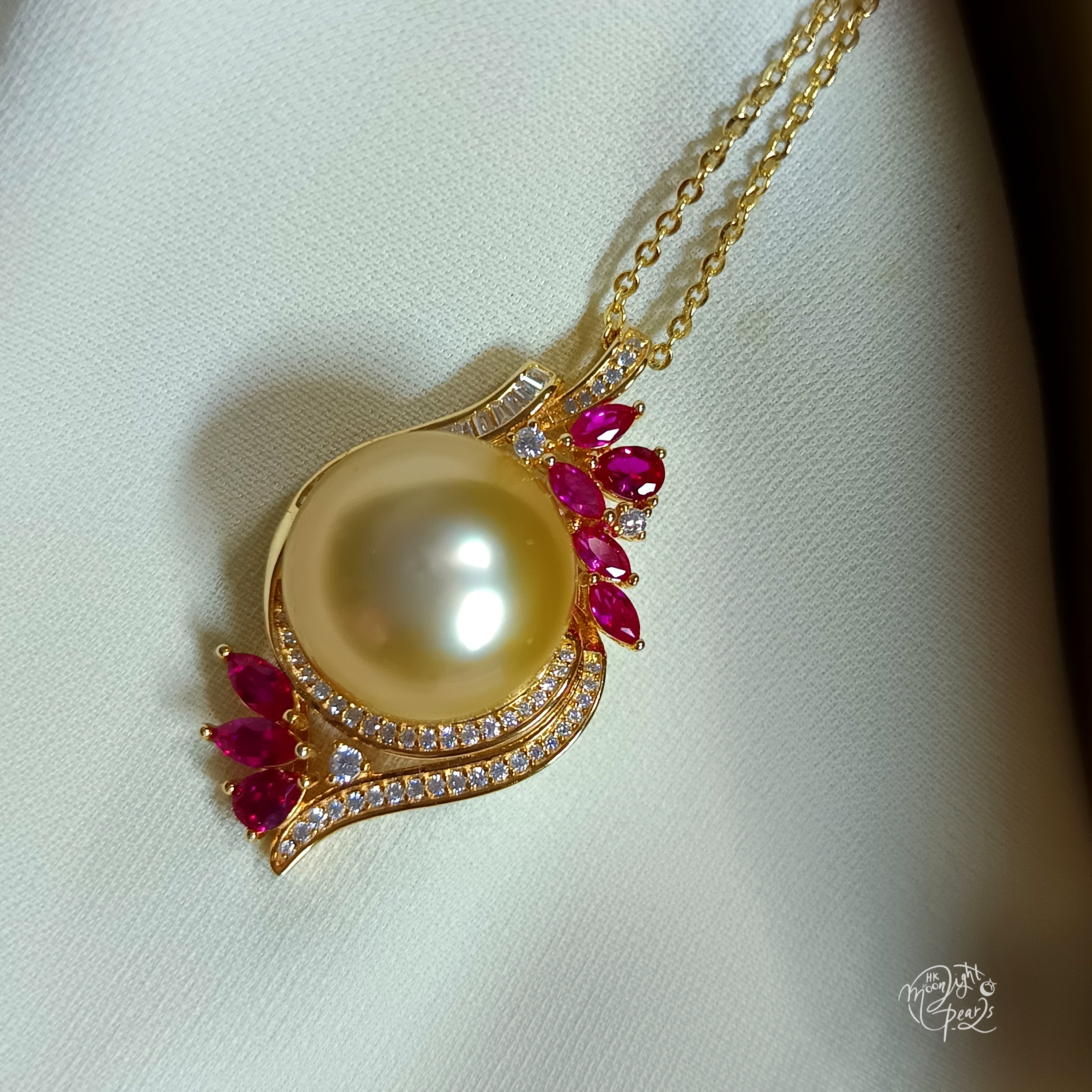 近圓極強光南洋濃金海水珠精工s925銀微鑲紅鋯石吊墜(送注金鍊)