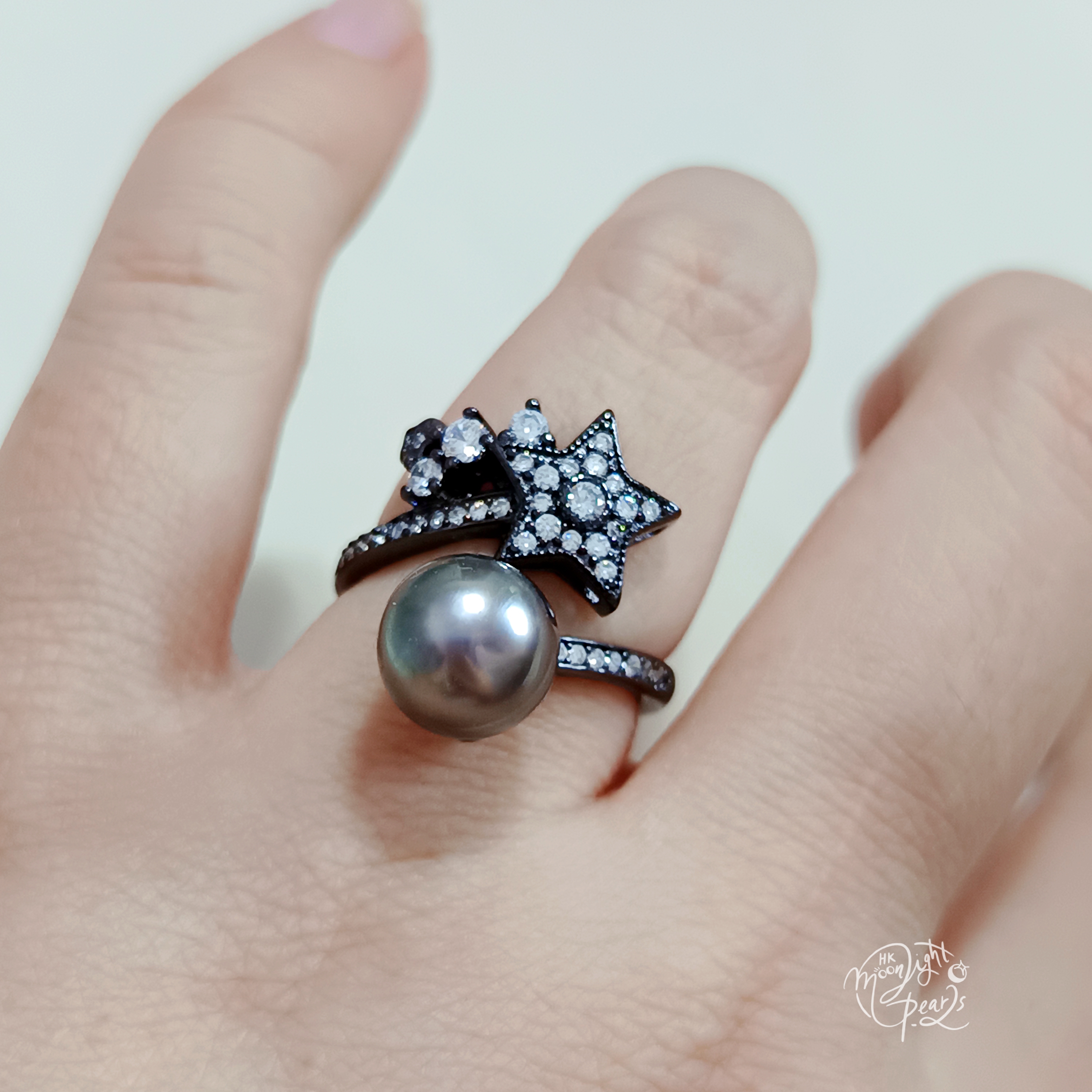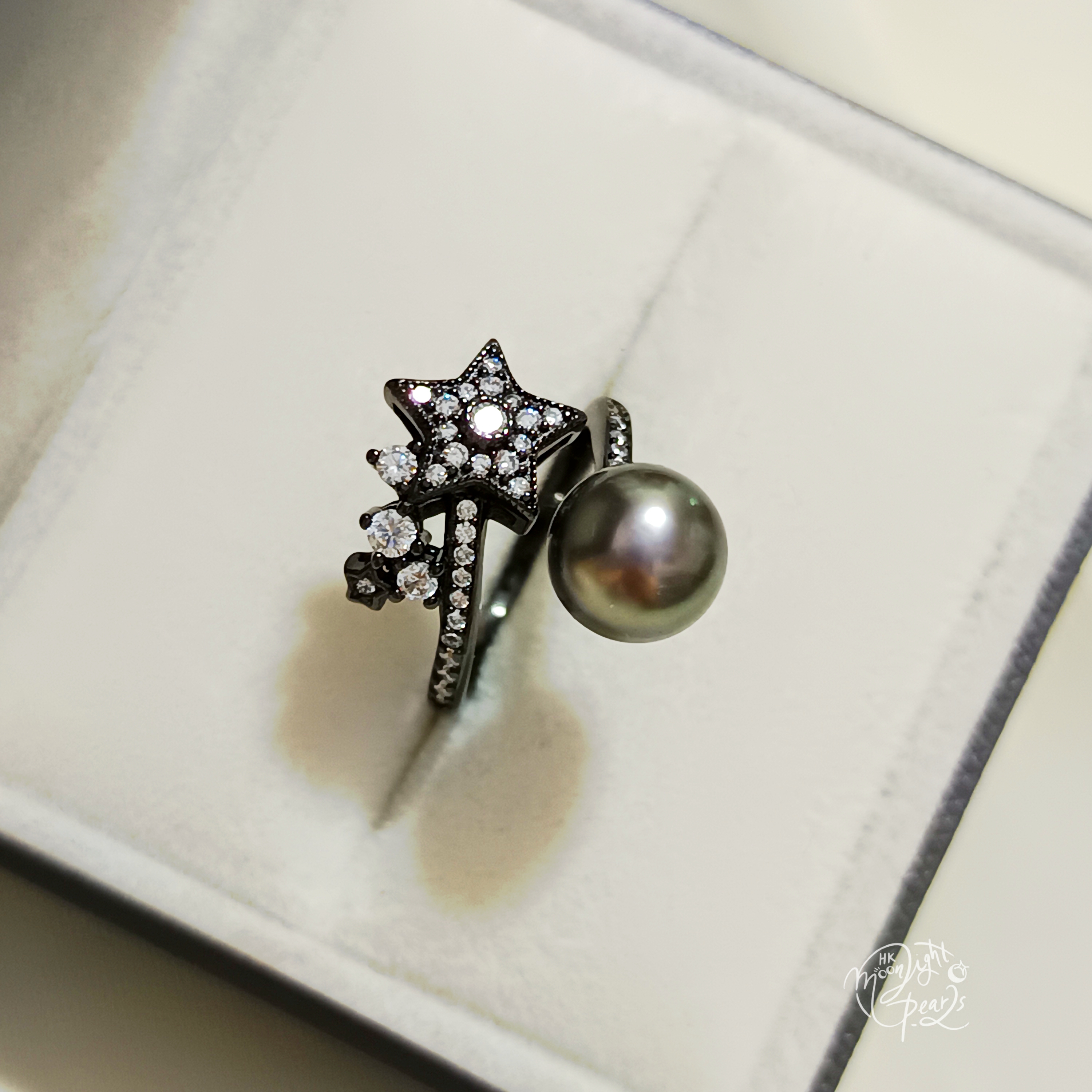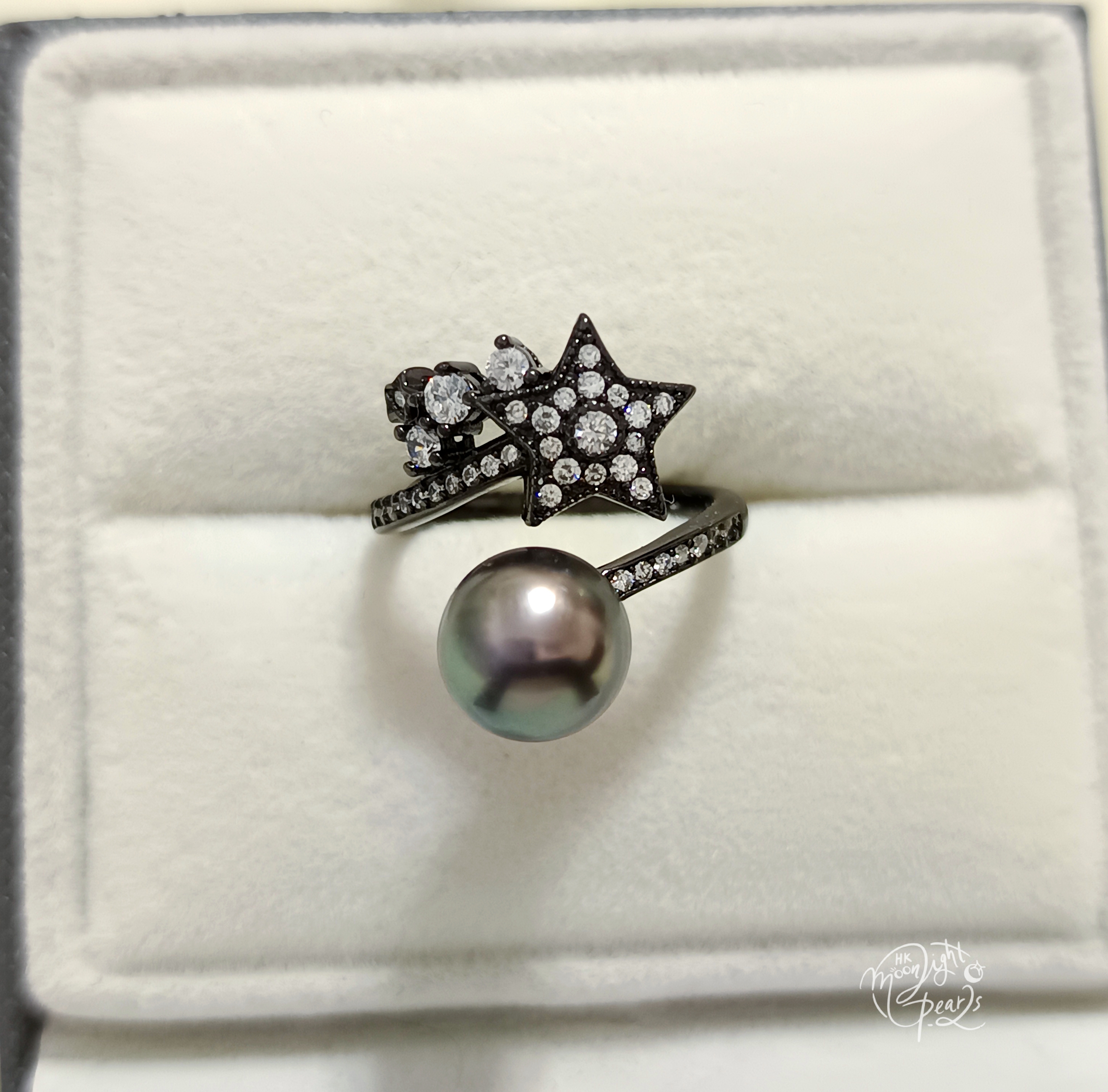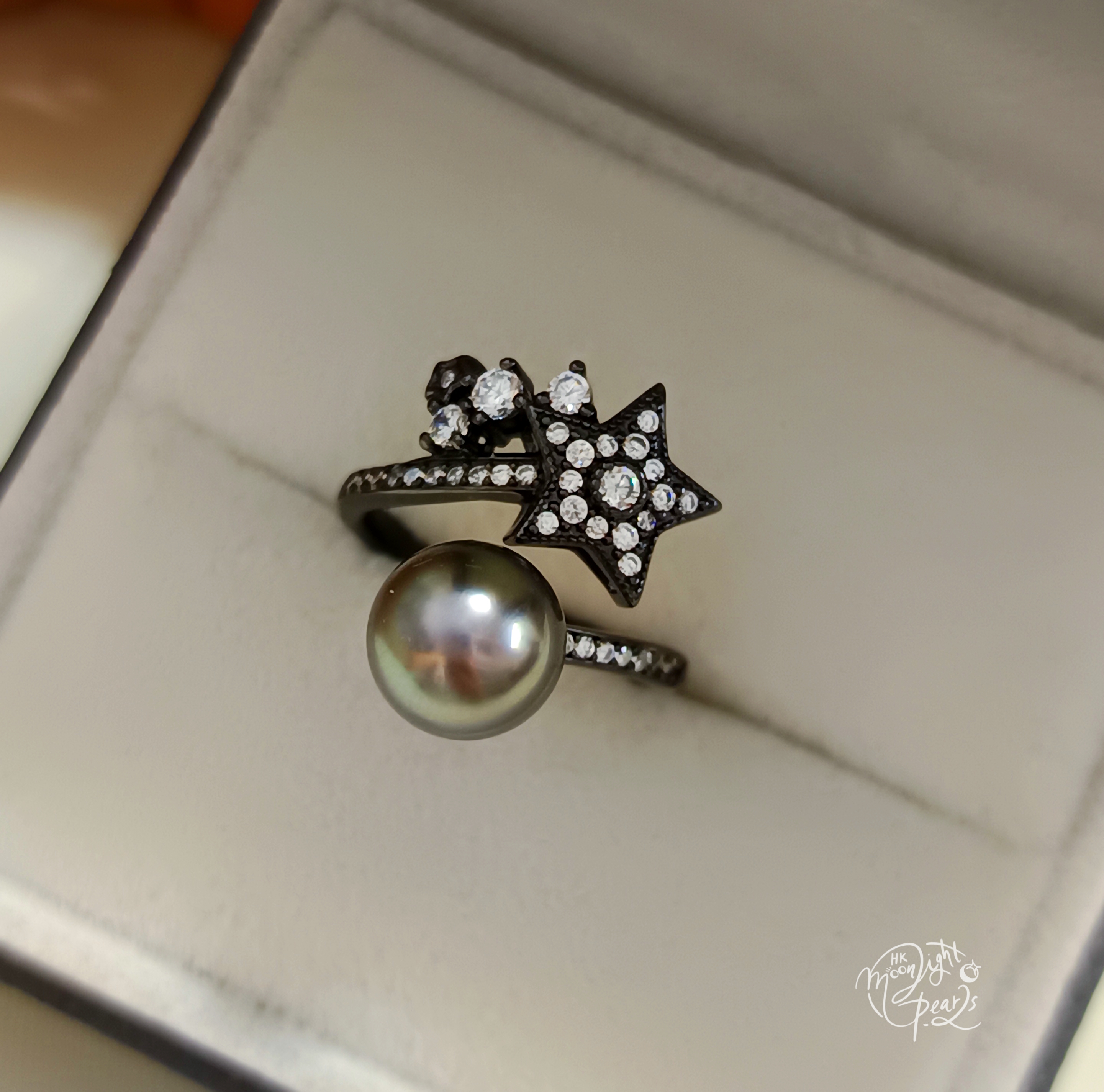 近圓極強光大溪地孔雀綠炫彩海水珍珠精工s925銀微鑲鋯石星星暗黑元素開口戒指