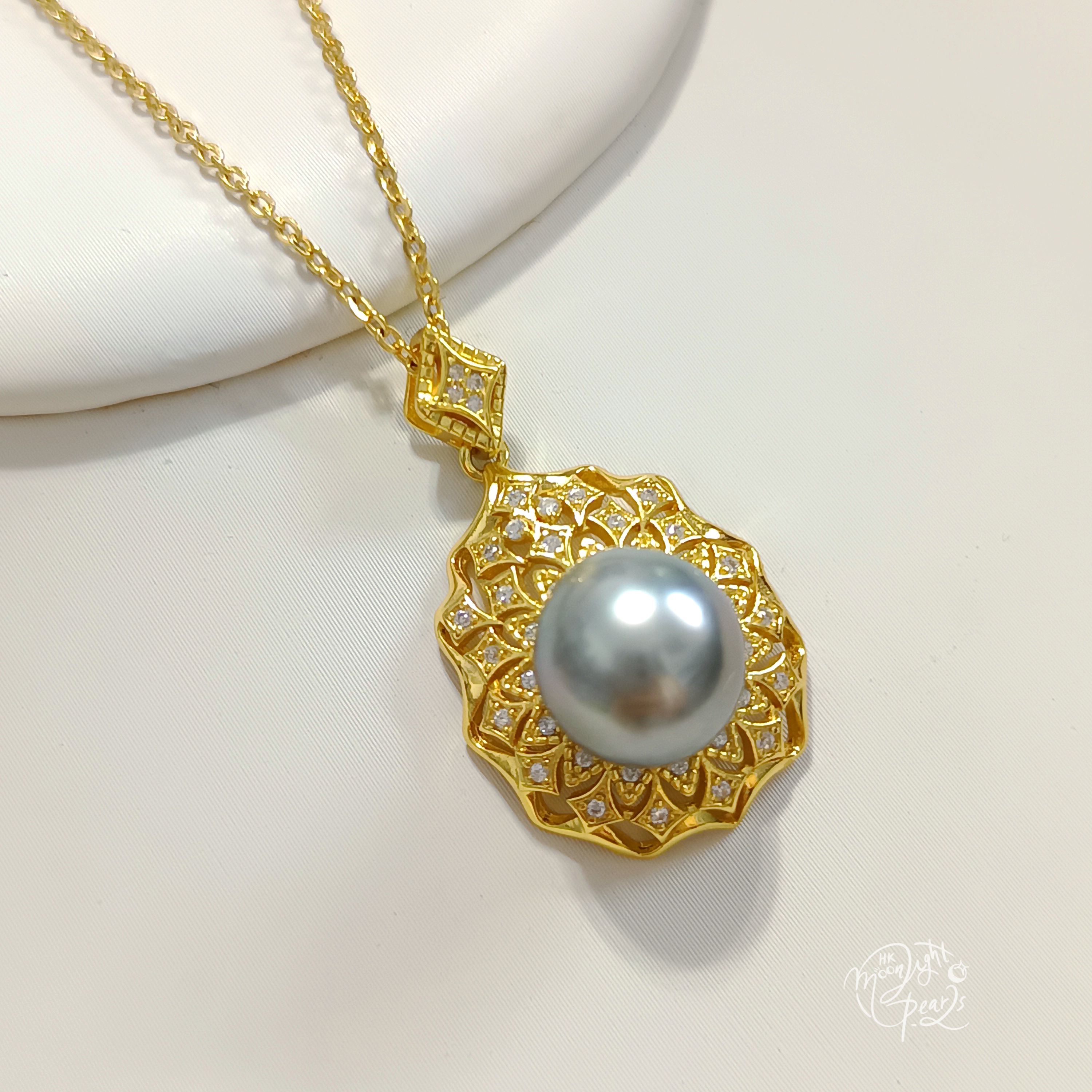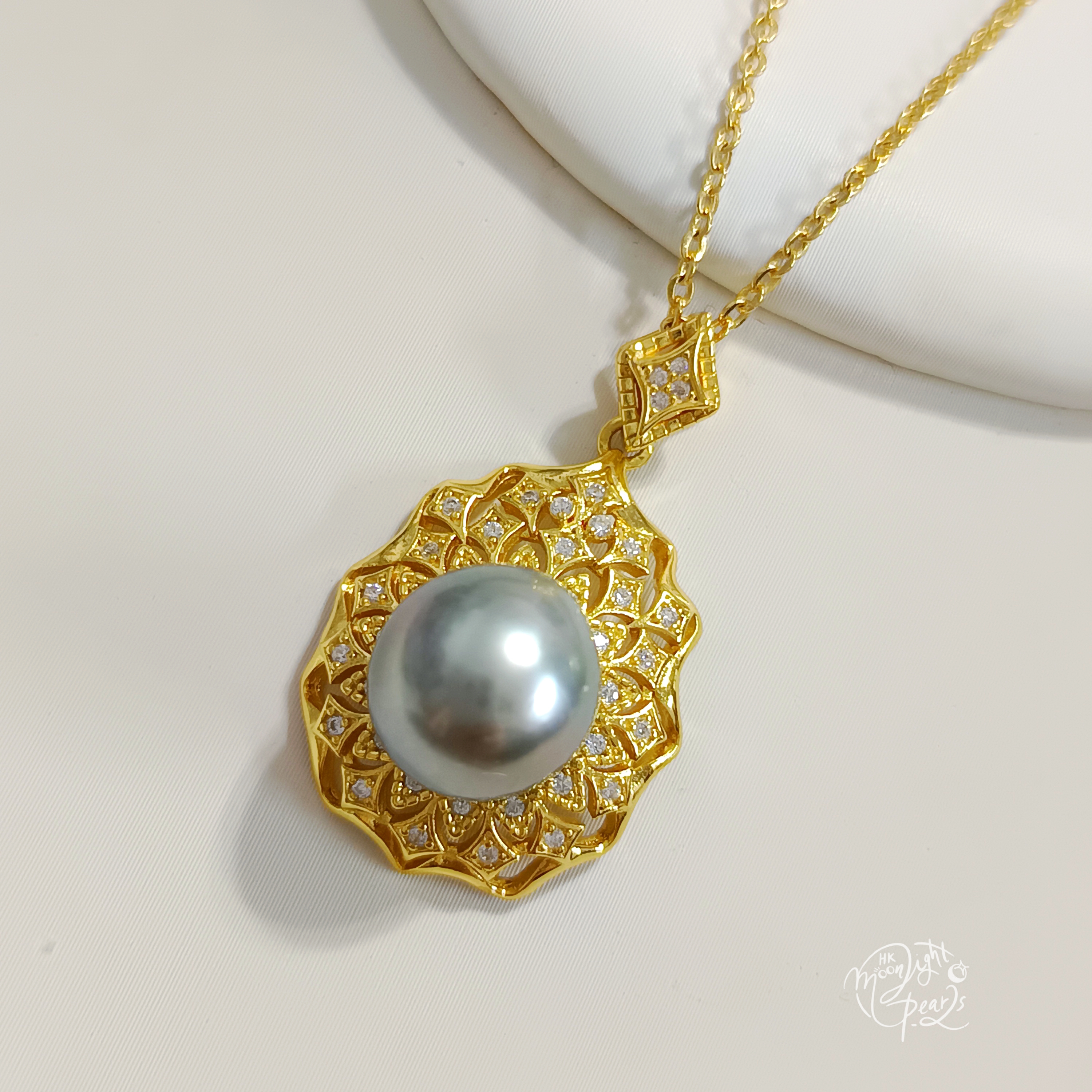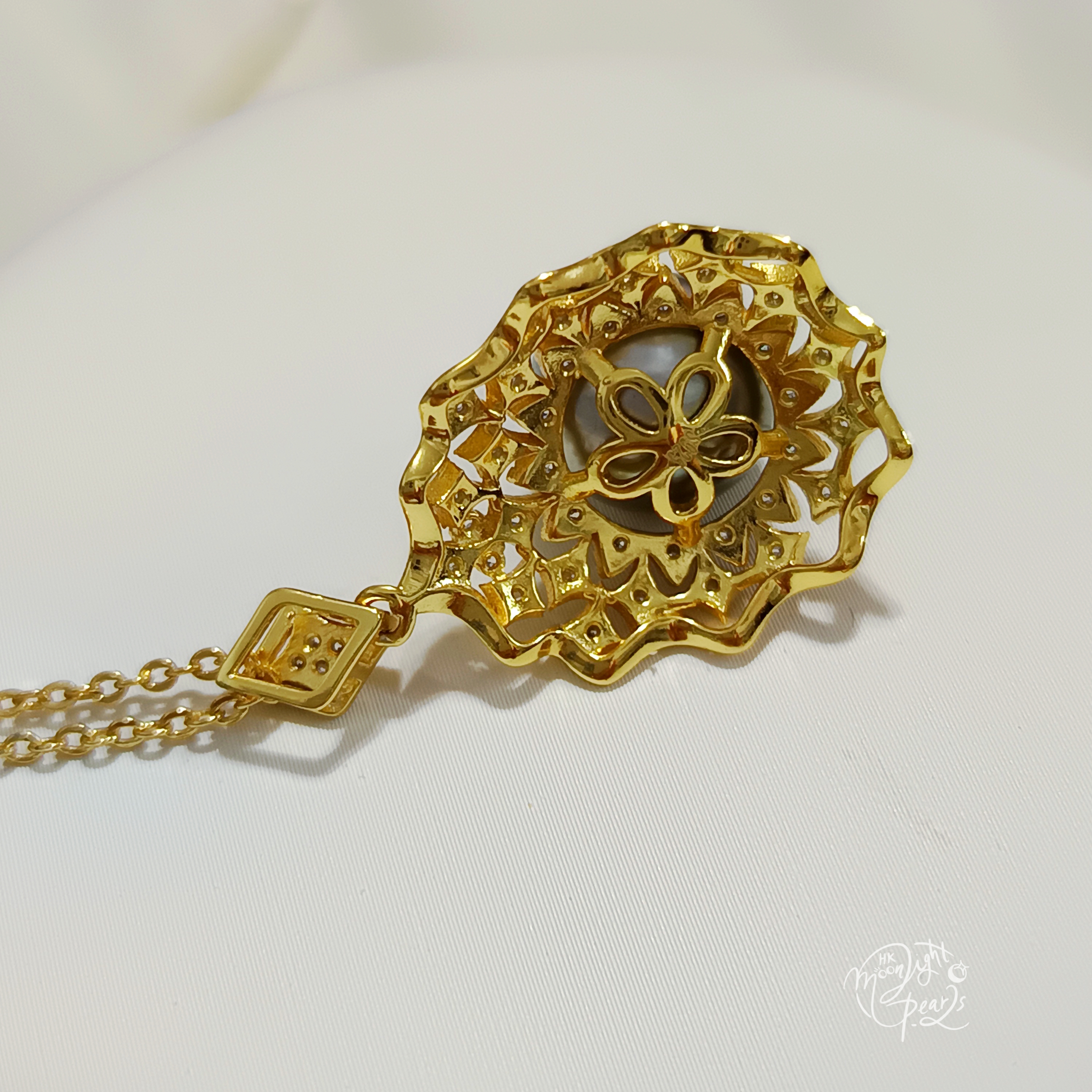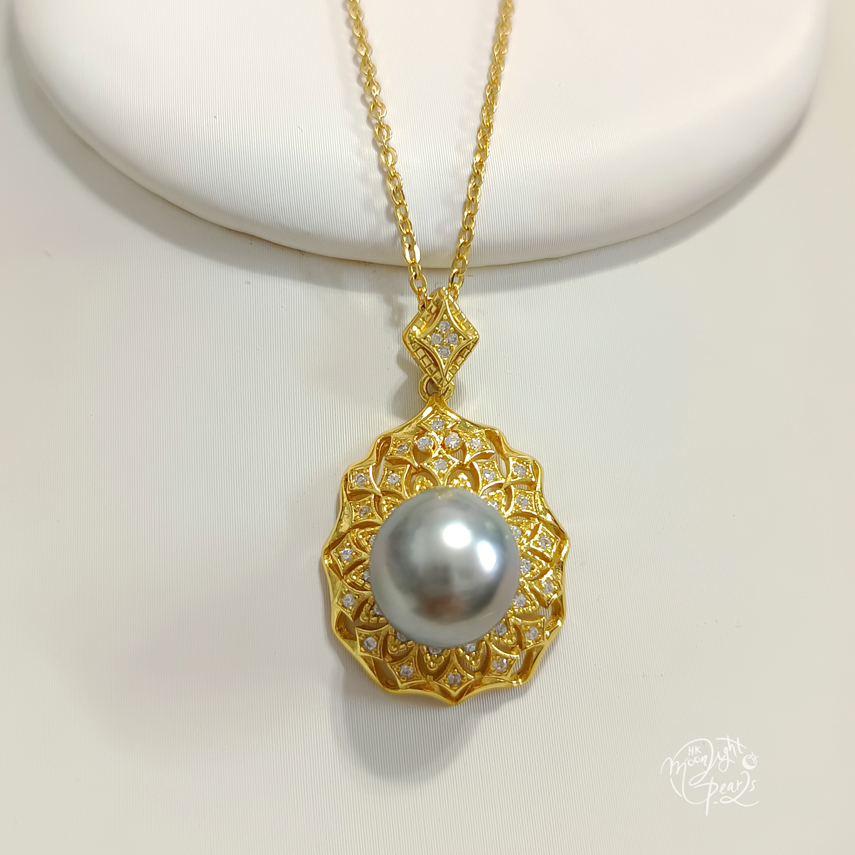 近圓極強光大溪地鉑金灰海水珍珠精工s925銀微鑲鋯石拜占庭復古吊墜(送注金鍊)