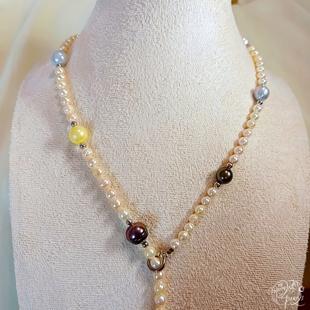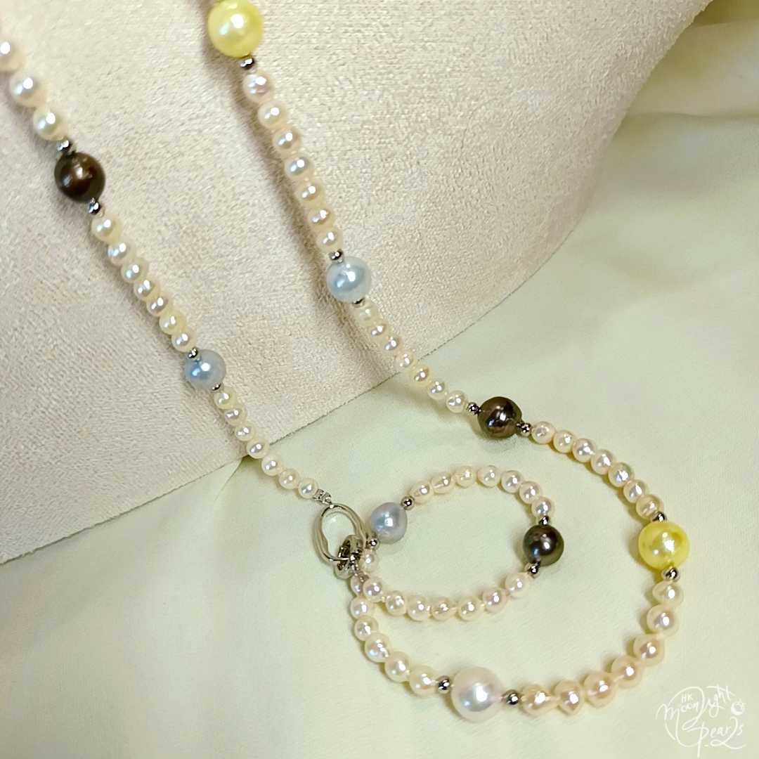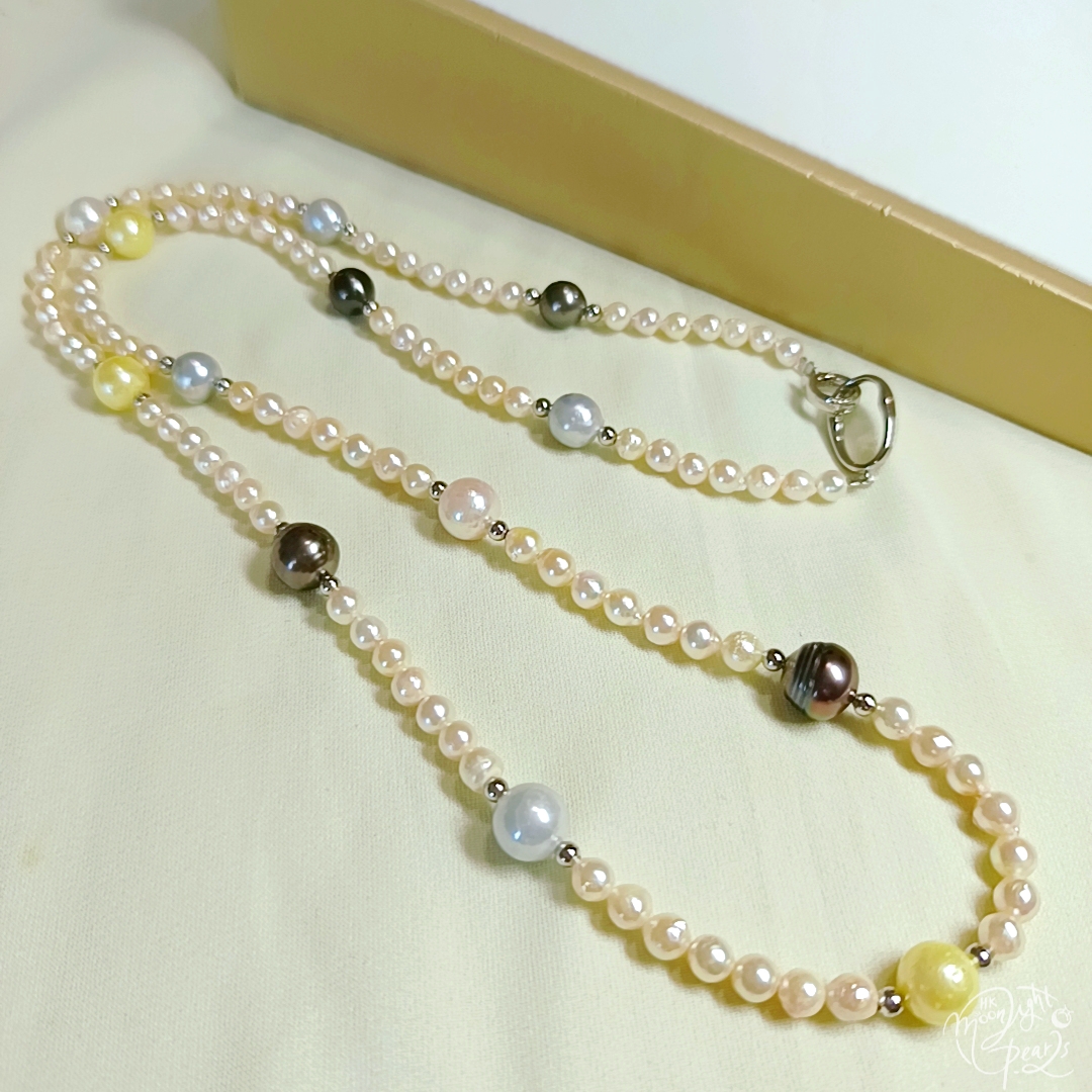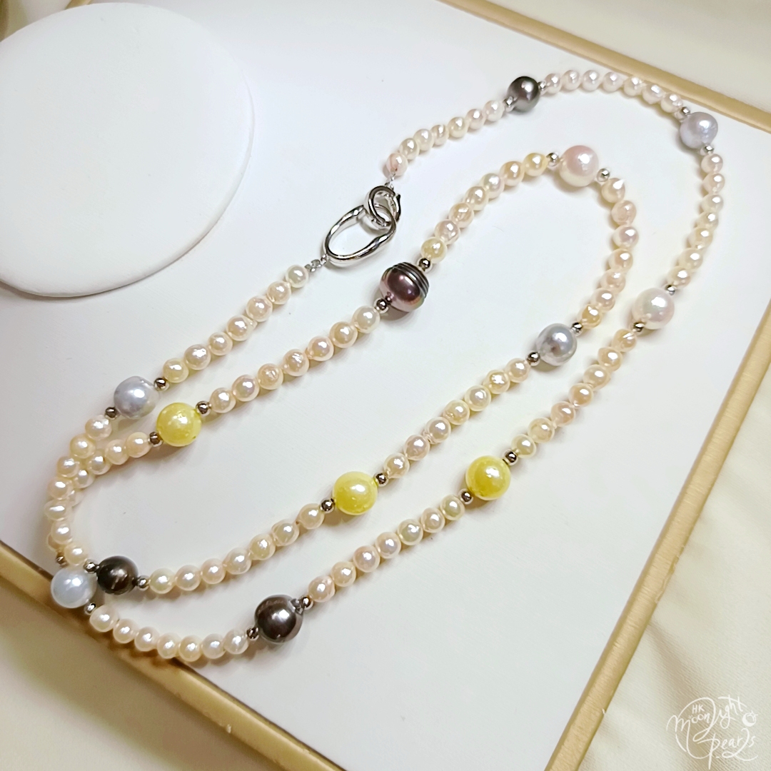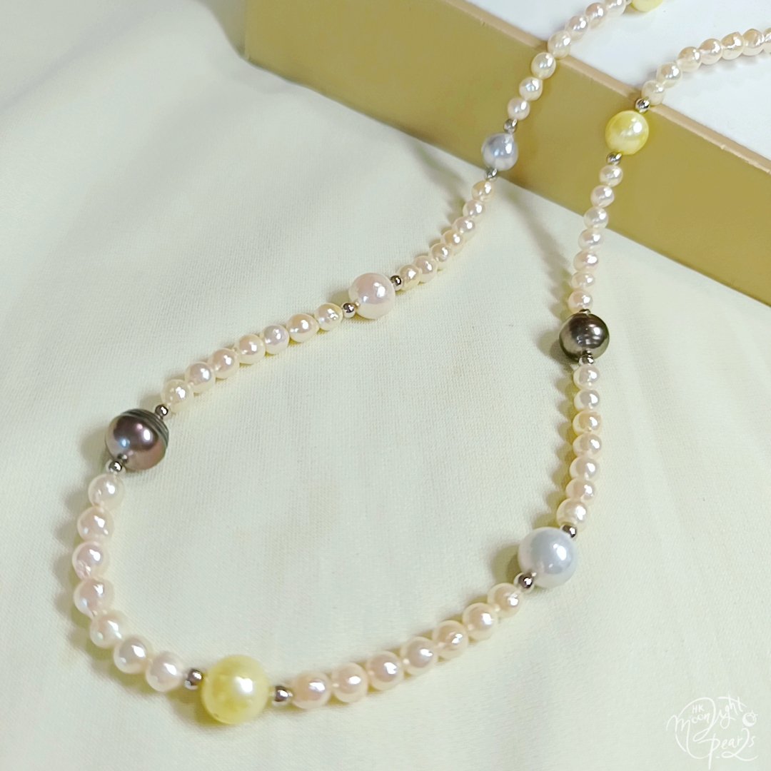 近圓極強光akoya 糖果色海水珍珠+大溪地珍珠滿天星款注白金扣毛衣鍊