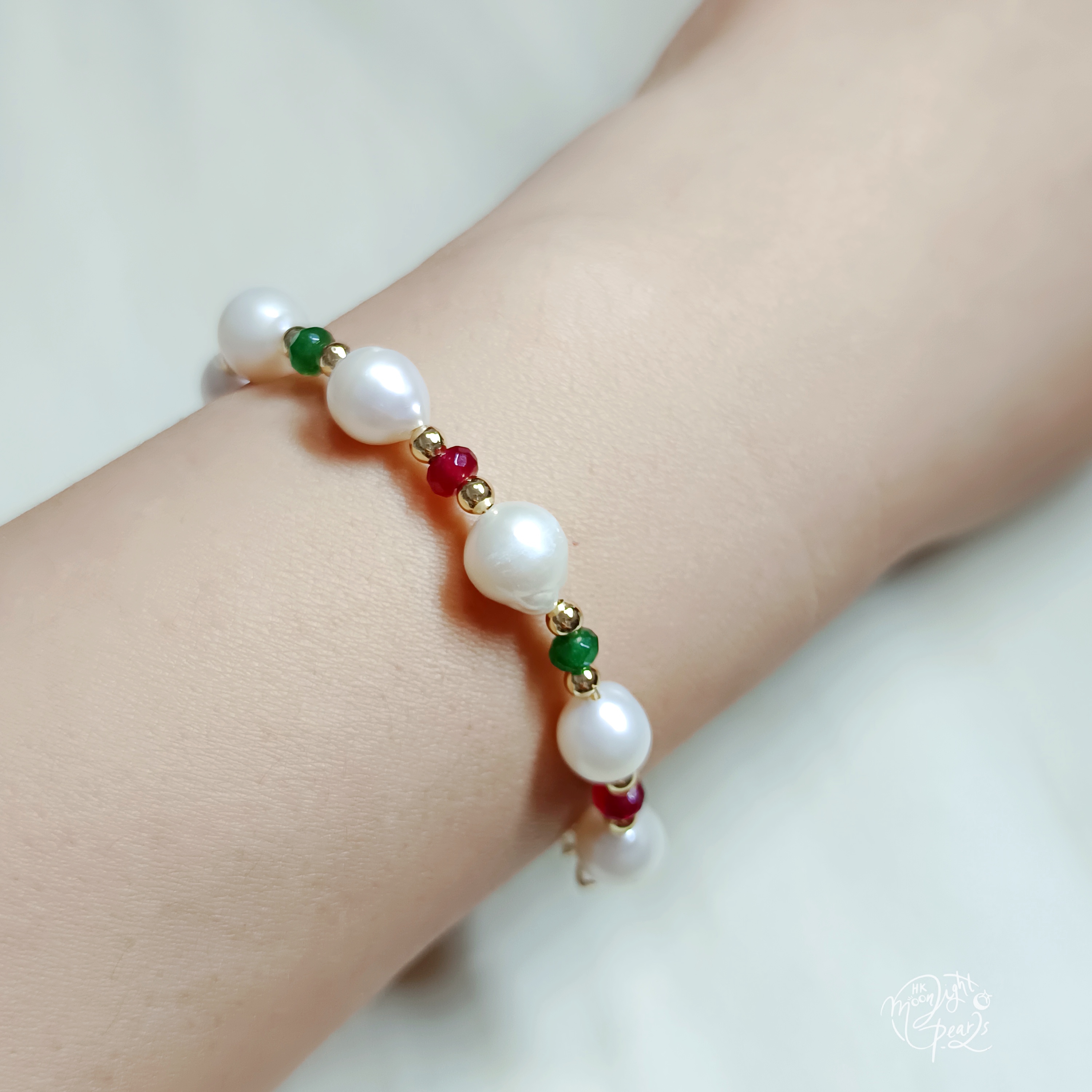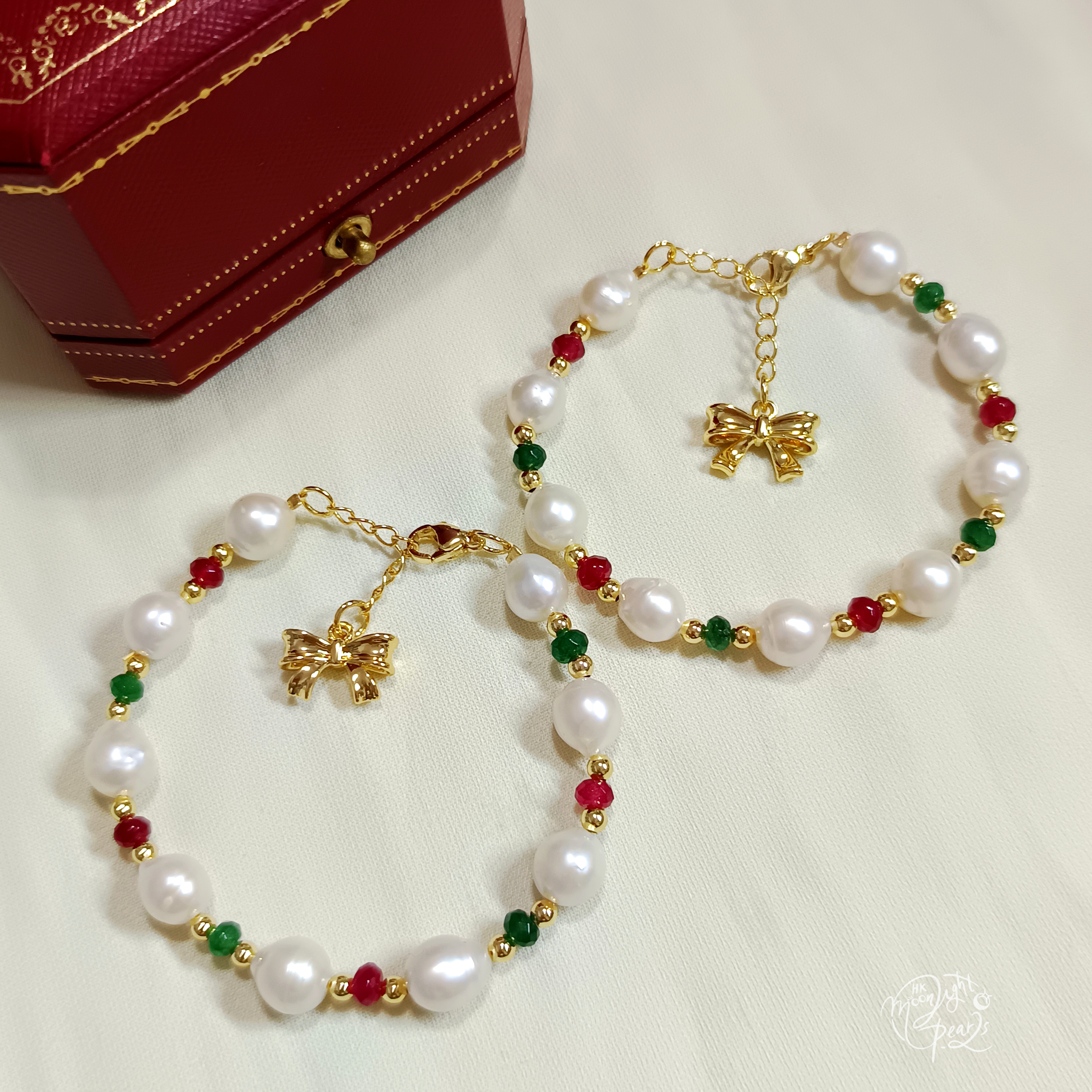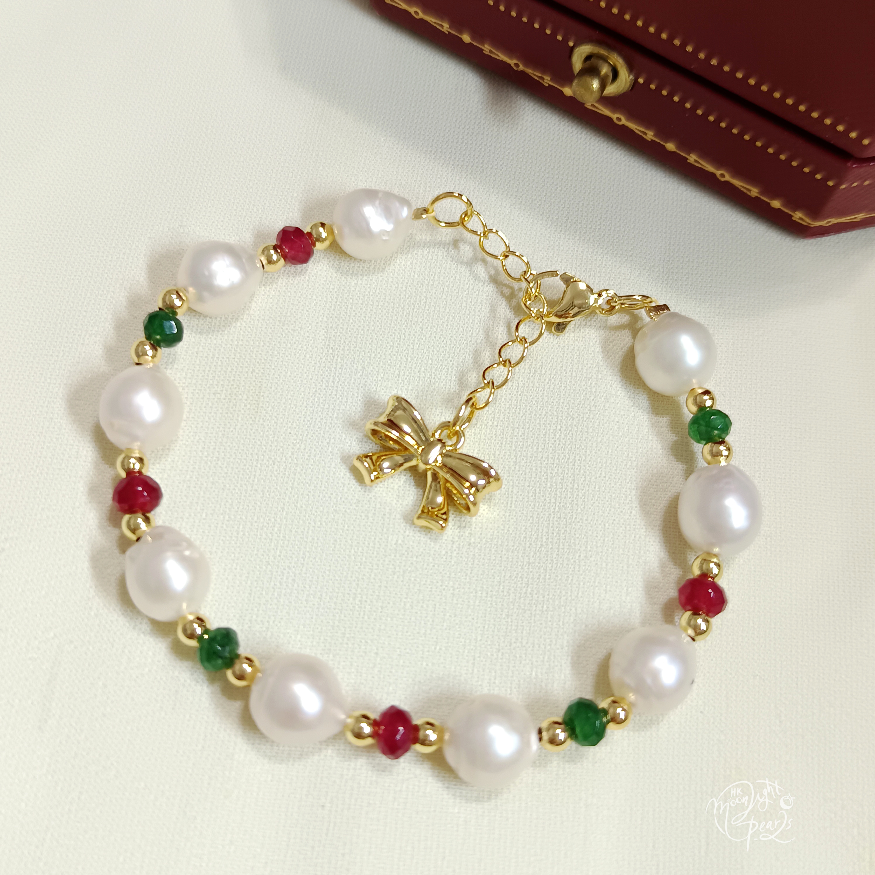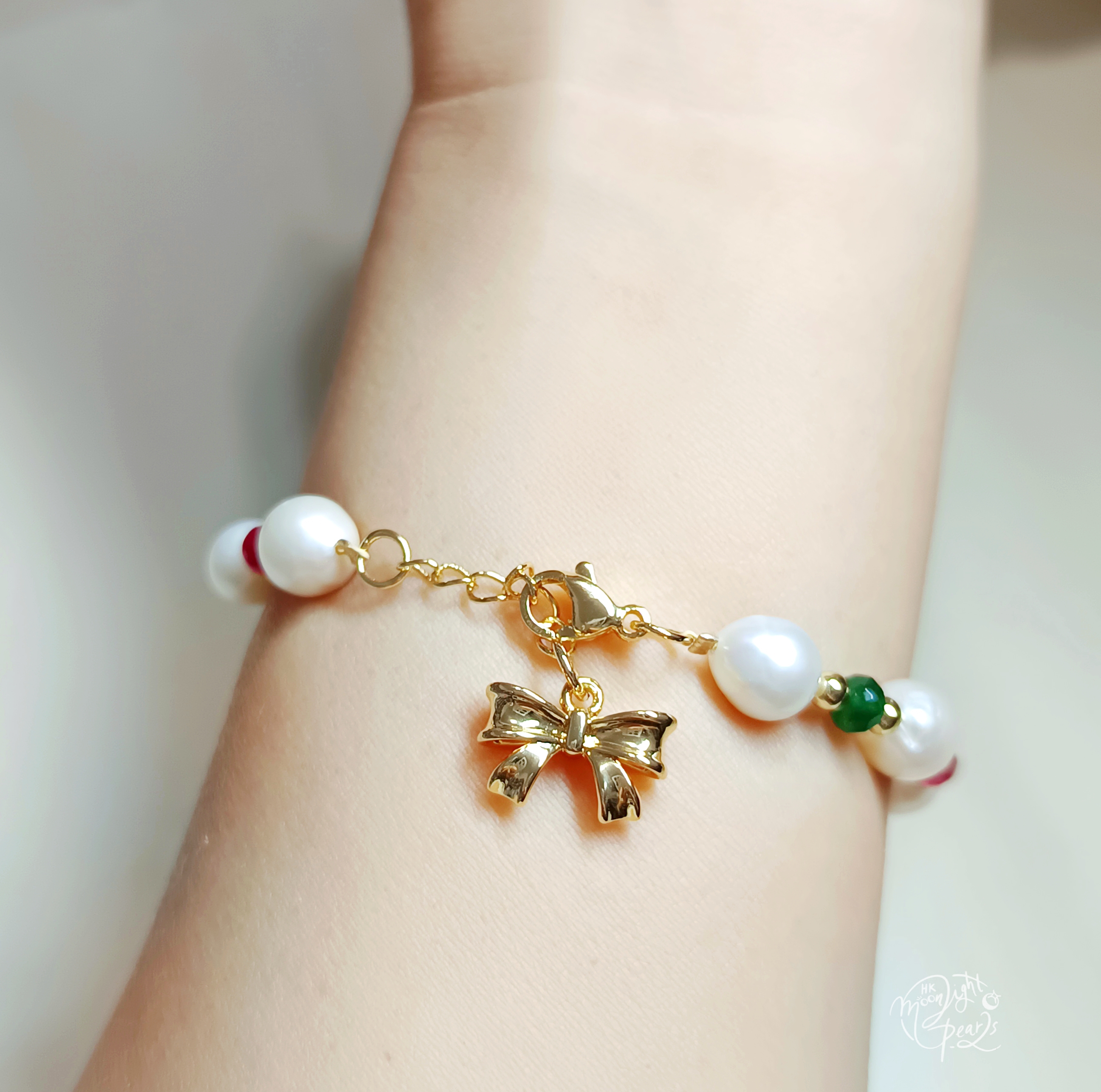 近圓水滴形淡水愛迪生珍珠+紅綠瑪瑙注金蝴蝶結尾鍊扣聖誕手鍊