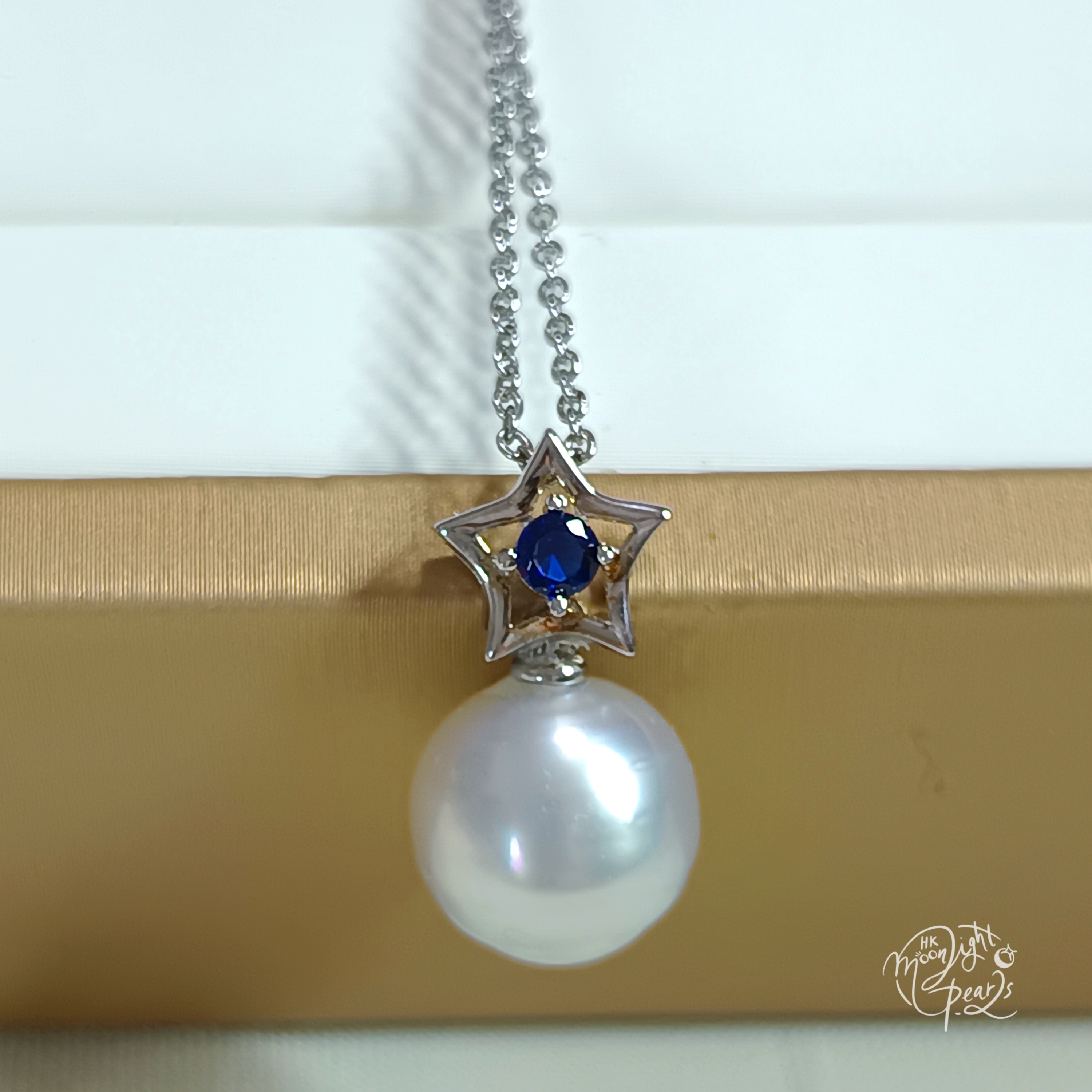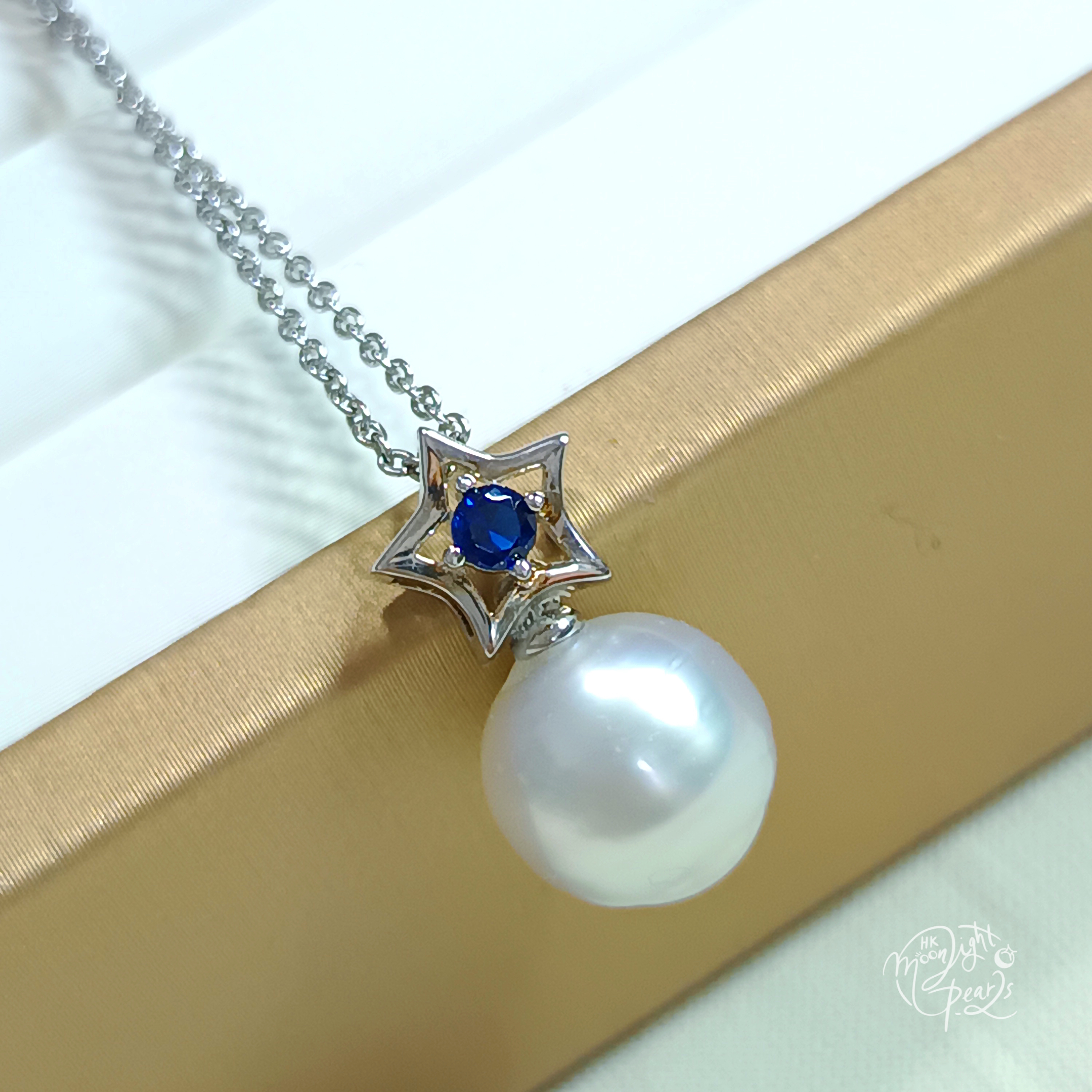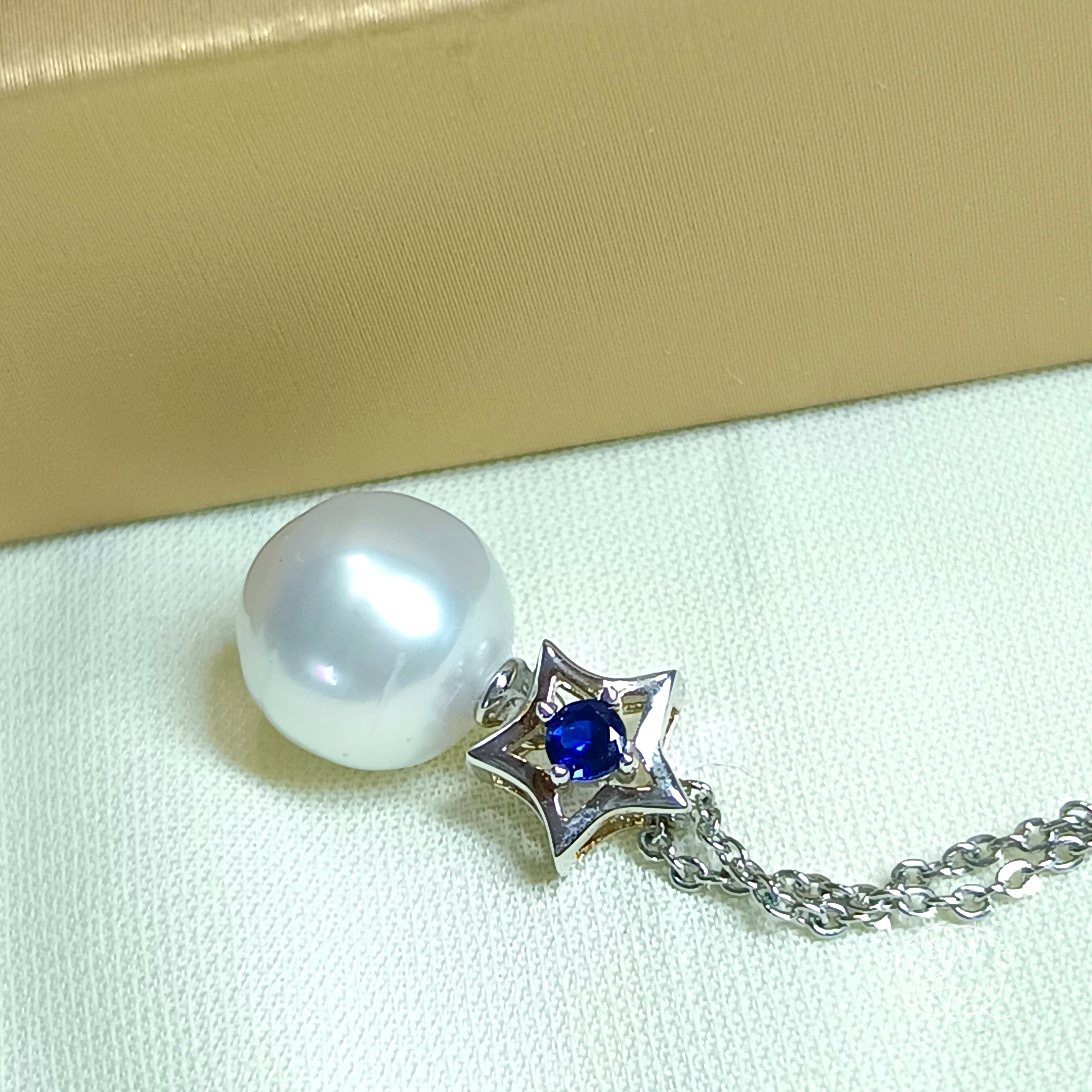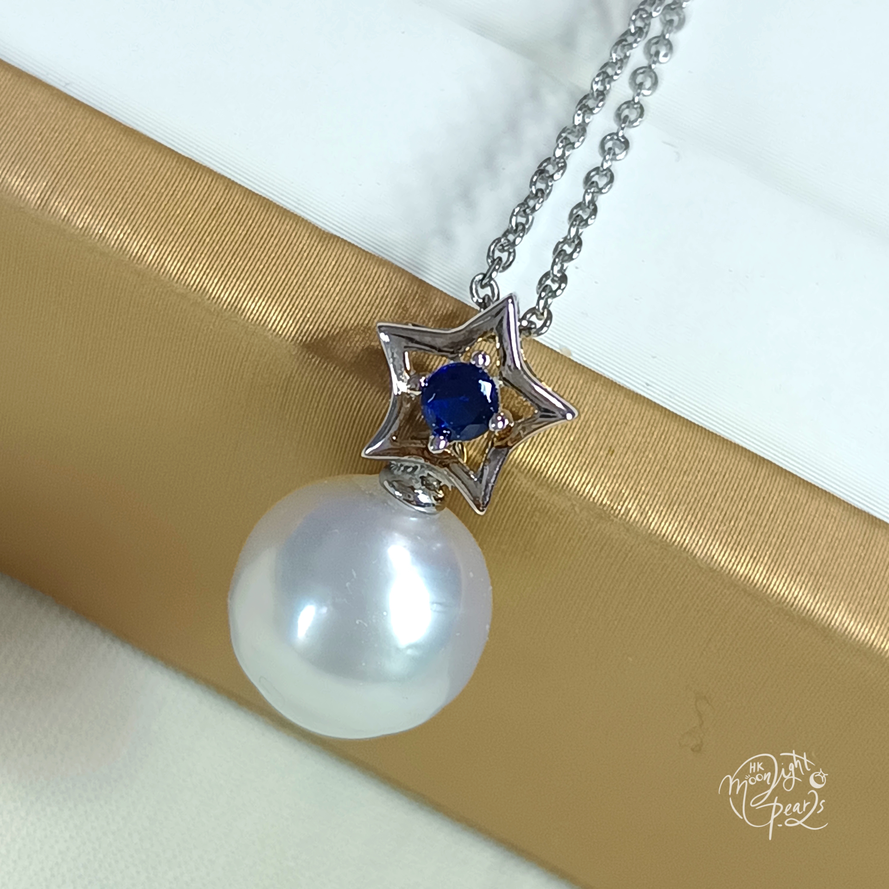 近圓澳白銀白冷光海水珍珠精工s925銀微鑲藍鋯石星星吊墜(送注白金鍊)