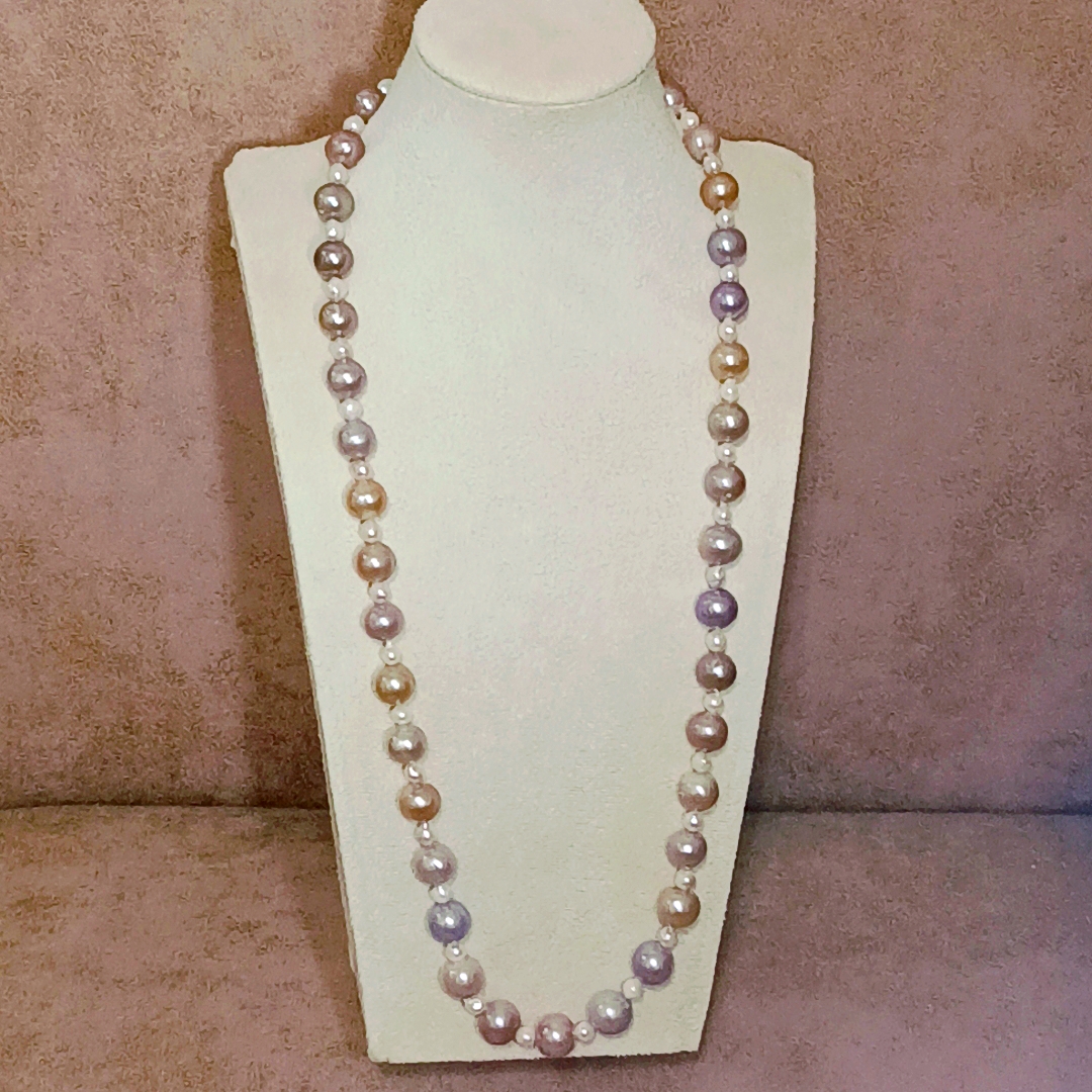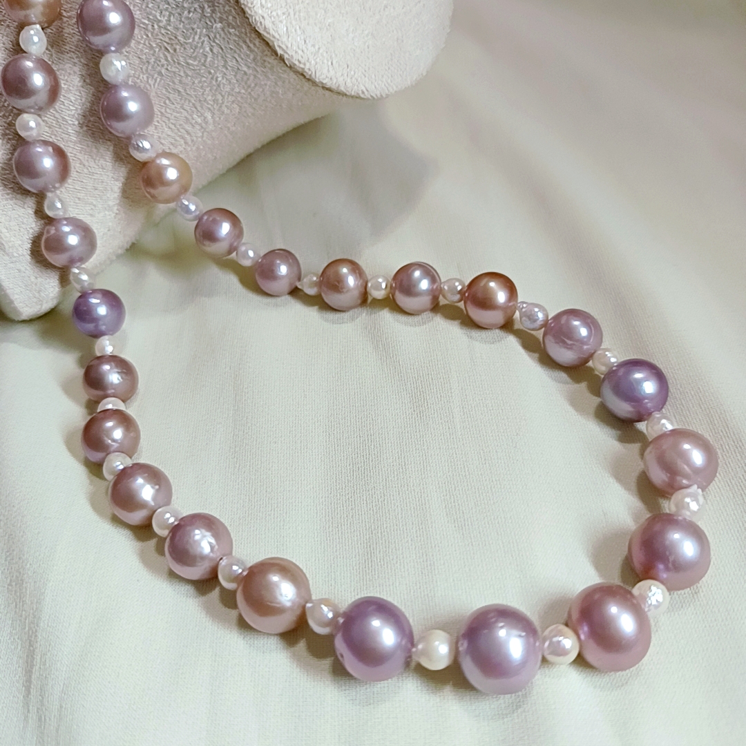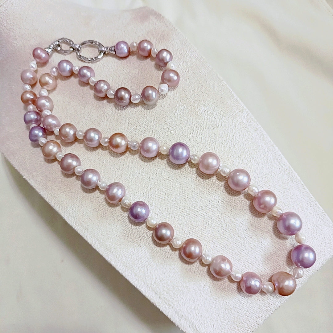 愛迪生珍珠尺寸11-13mm 淡水AK巴洛克珍珠5-6mm 項鍊長度68cm 愛迪生近正圓強光糖果色珍珠,皮光絲滑透亮,微瑕/生長紋佩戴不顯,上身時尚氣質!