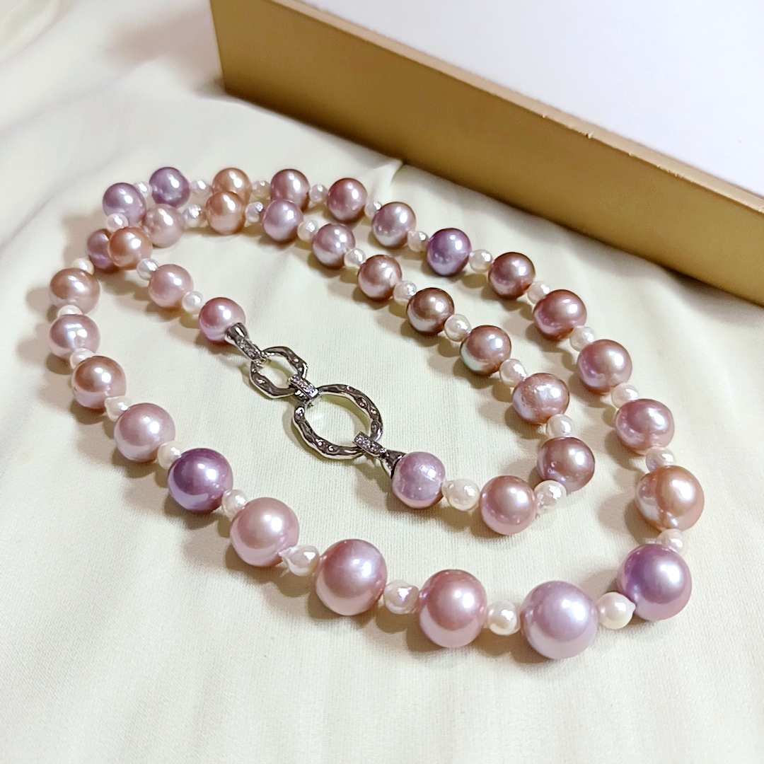 近正圓強光愛迪生糖果色珍珠+淡水AK巴洛克珍珠注白金微鑲鋯石雙扣毛衣鍊