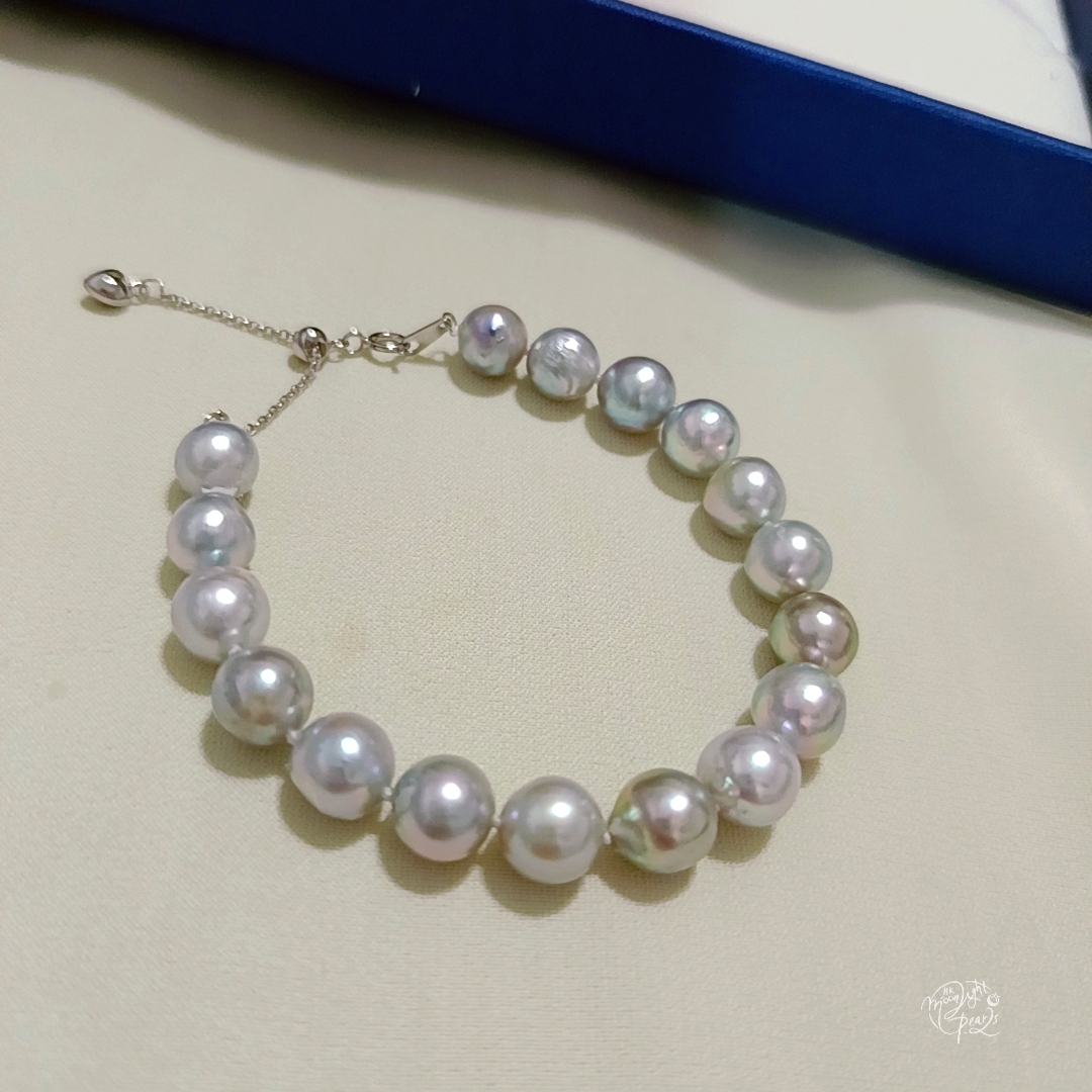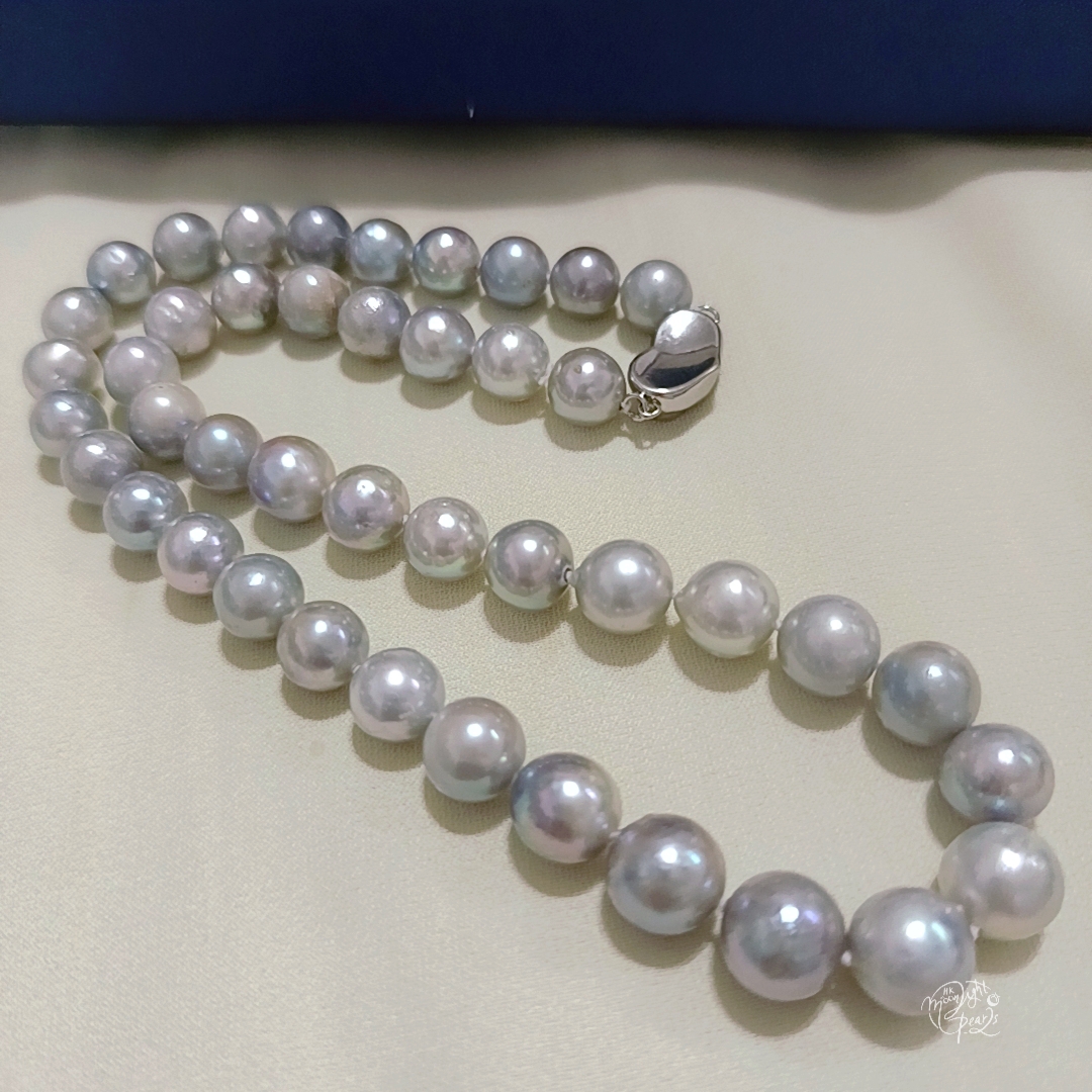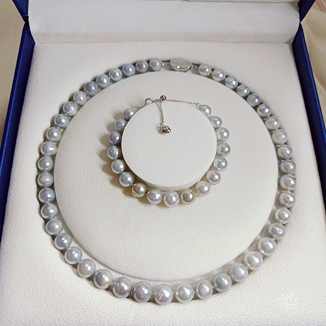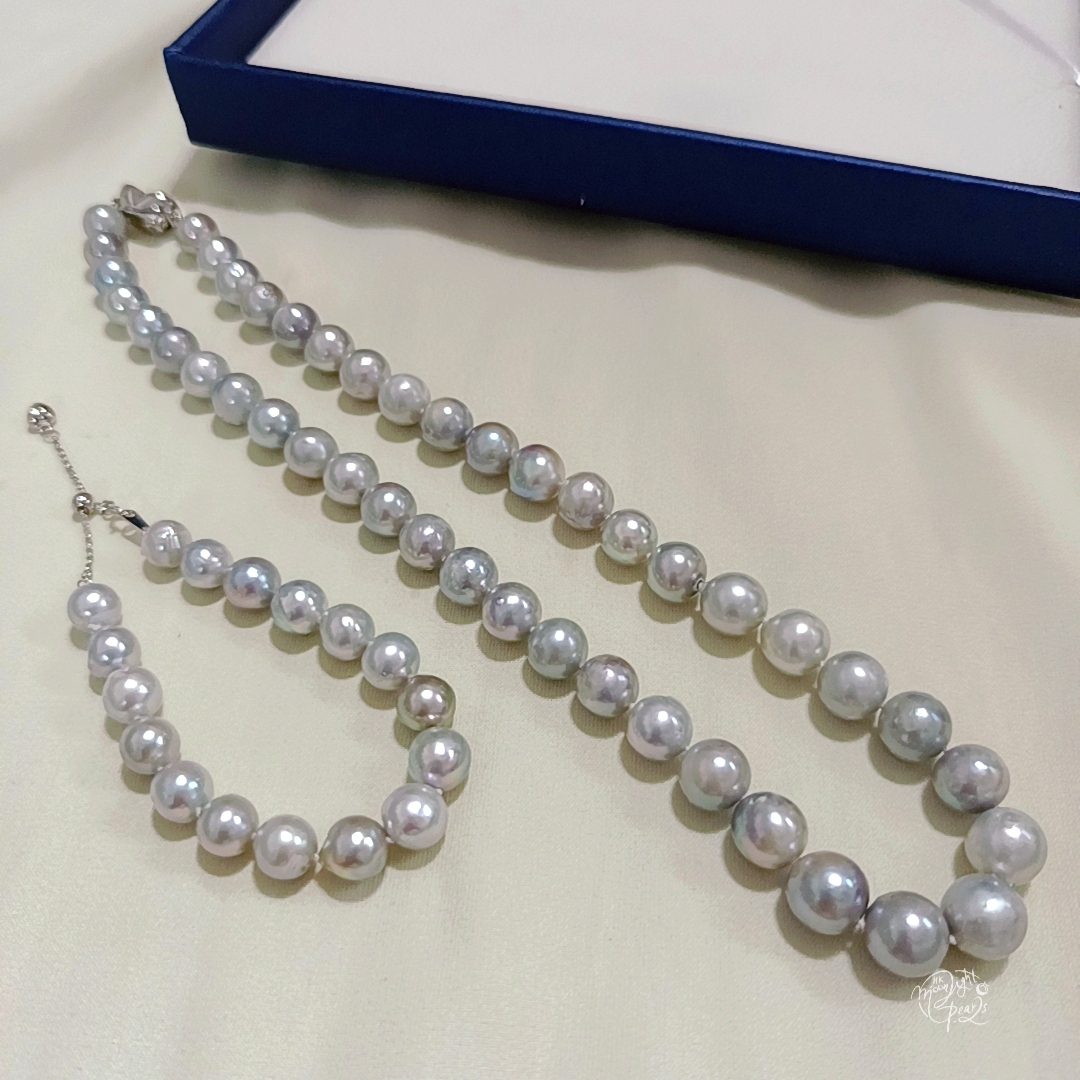 項鍊珍珠尺寸9-10mm 項鍊長度45cm 手鍊珍珠尺寸8-9mm 手鍊長度16+5cm尾鍊 近正圓強光日本真多麻海水珍珠,天然無調色銀藍灰,微瑕疵/生長紋,佩戴時尚氣質