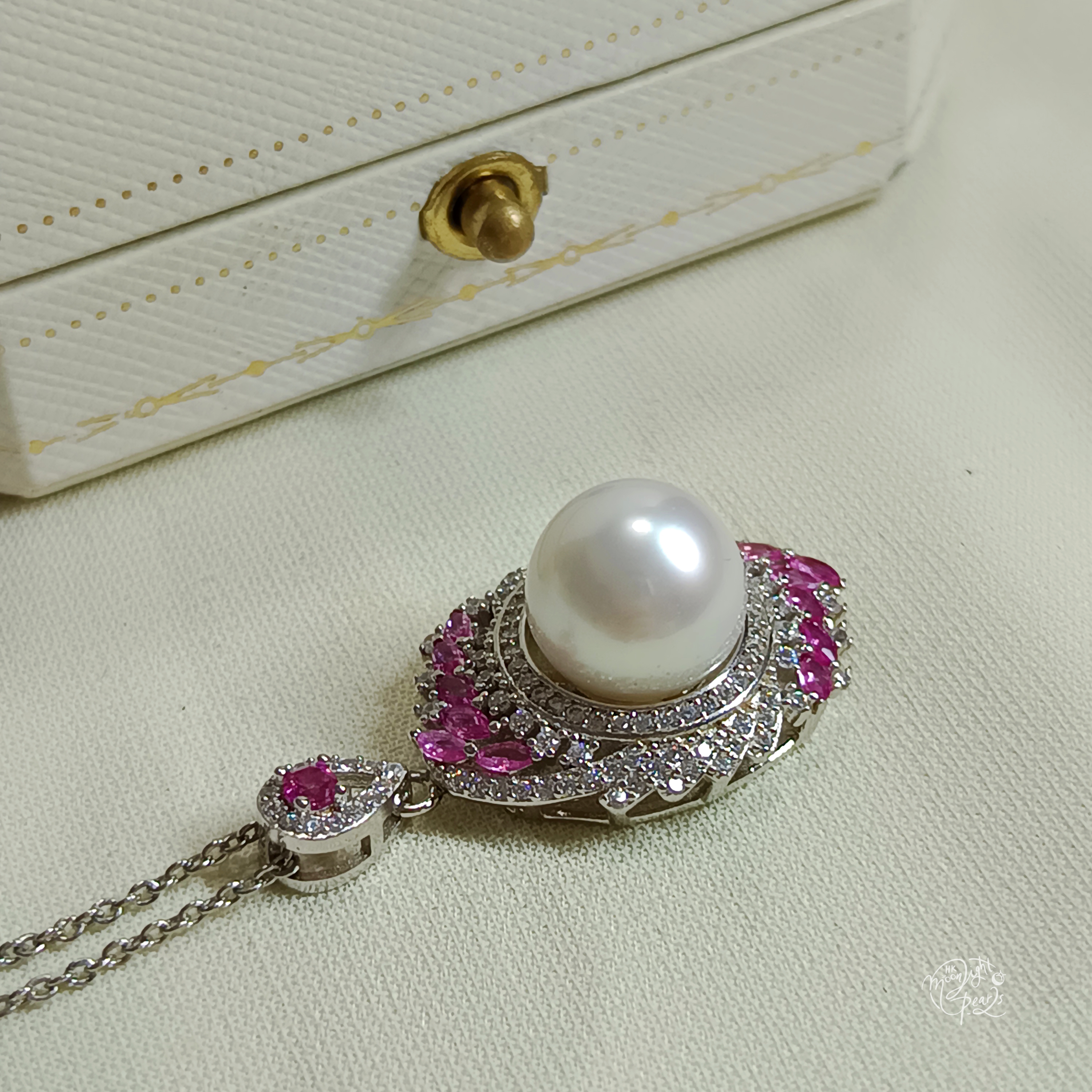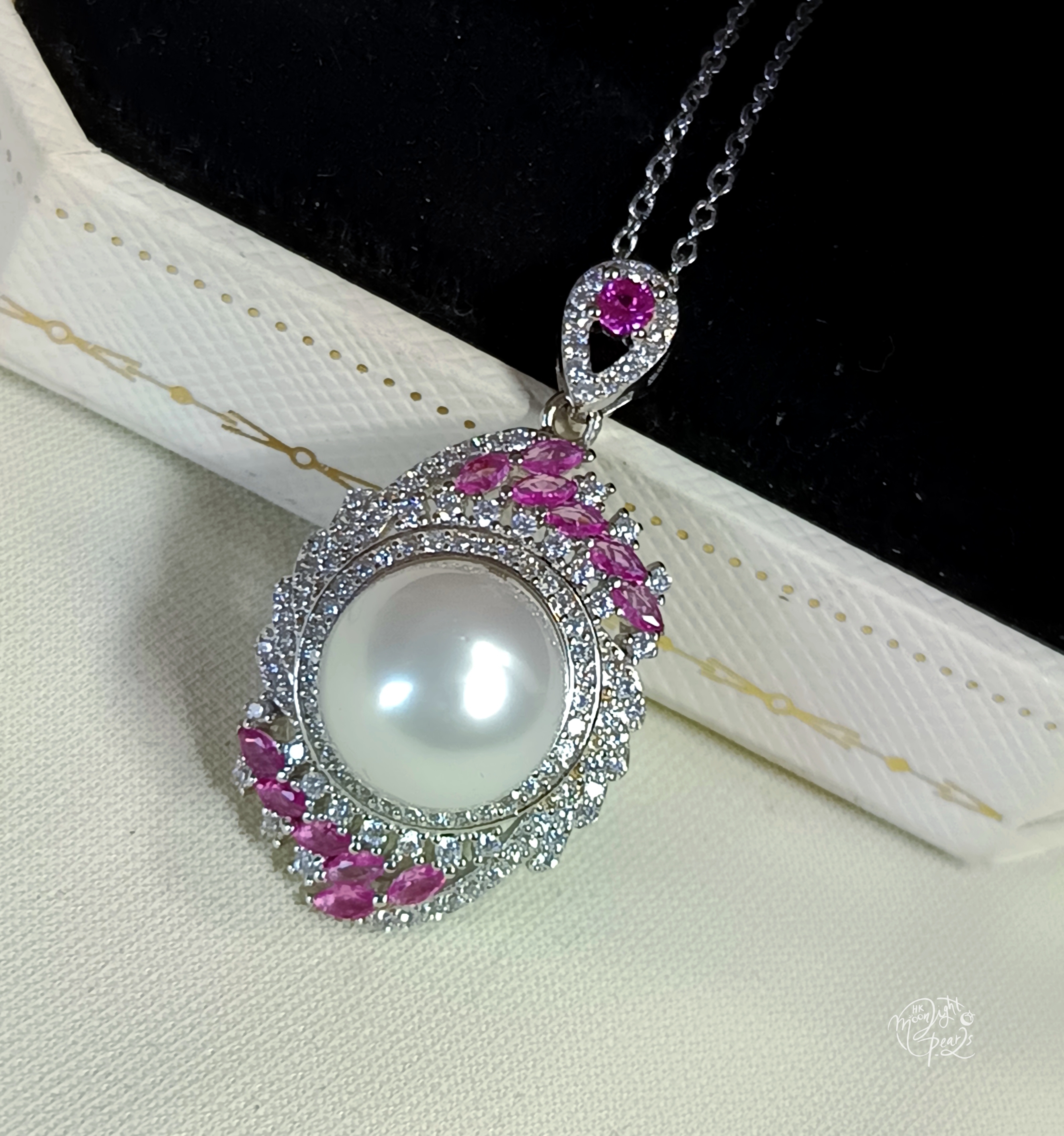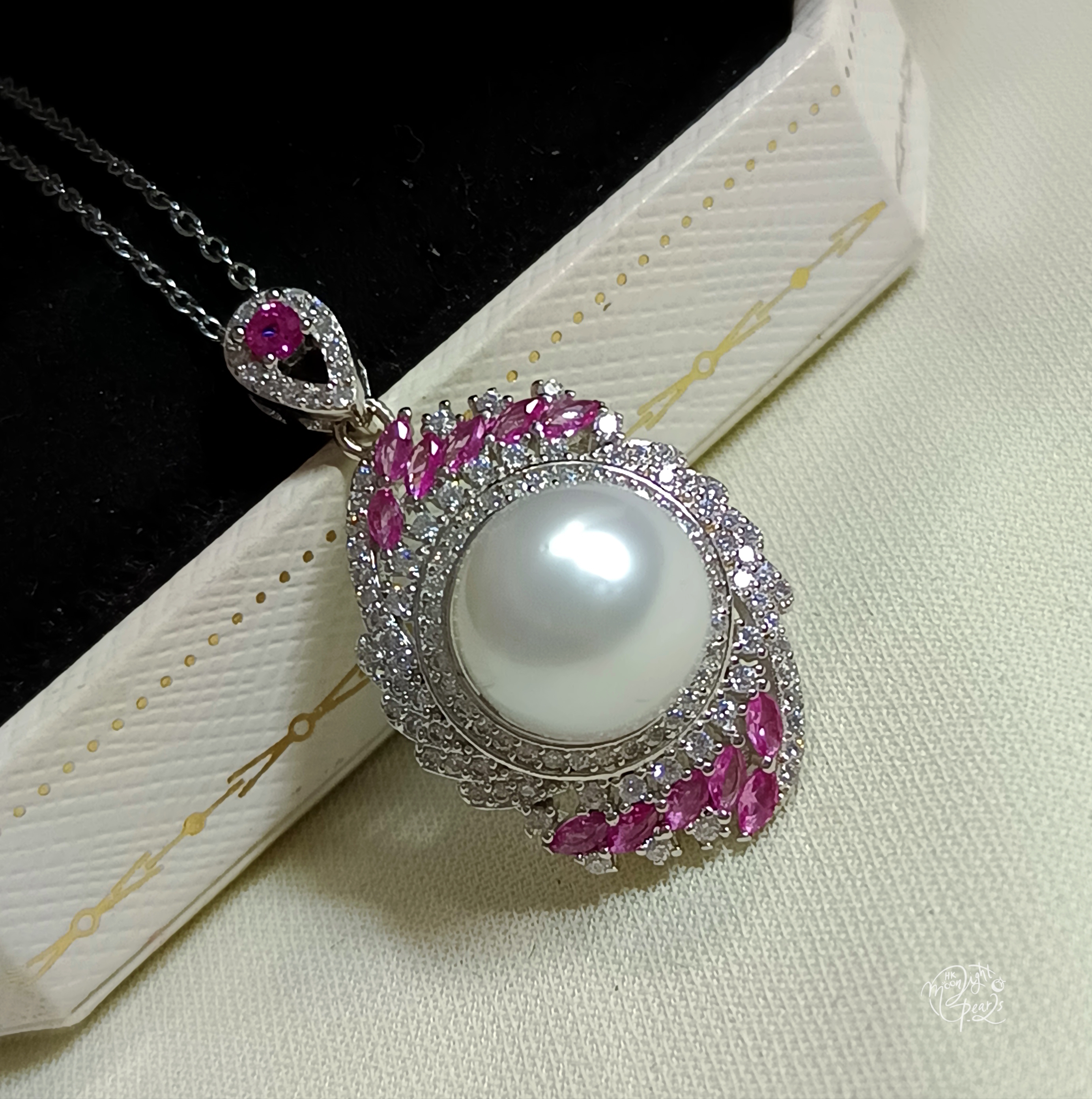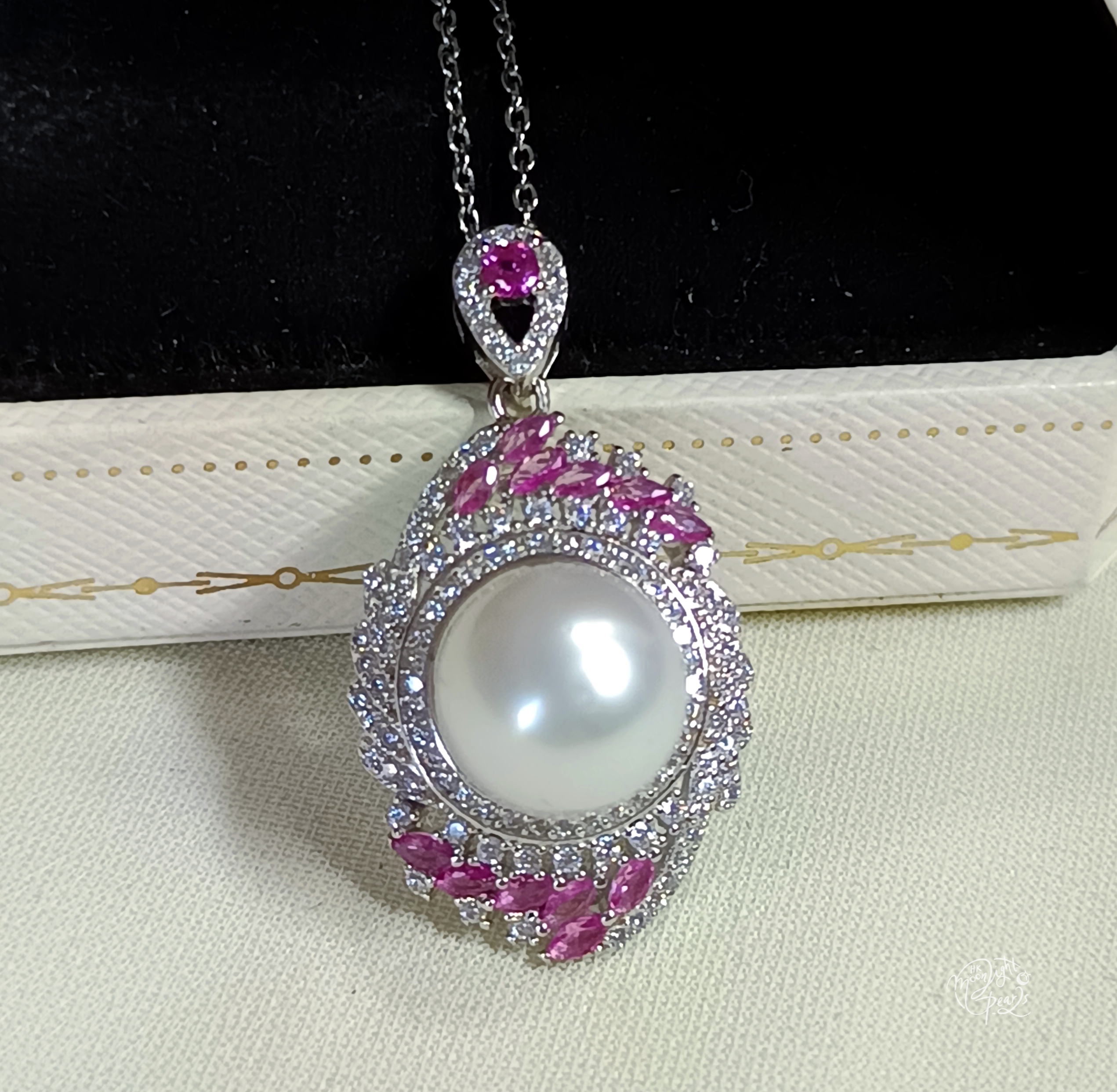 近正圓強光銀白冷光澳白海水珍珠精工s925銀鑲粉鋯石吊墜