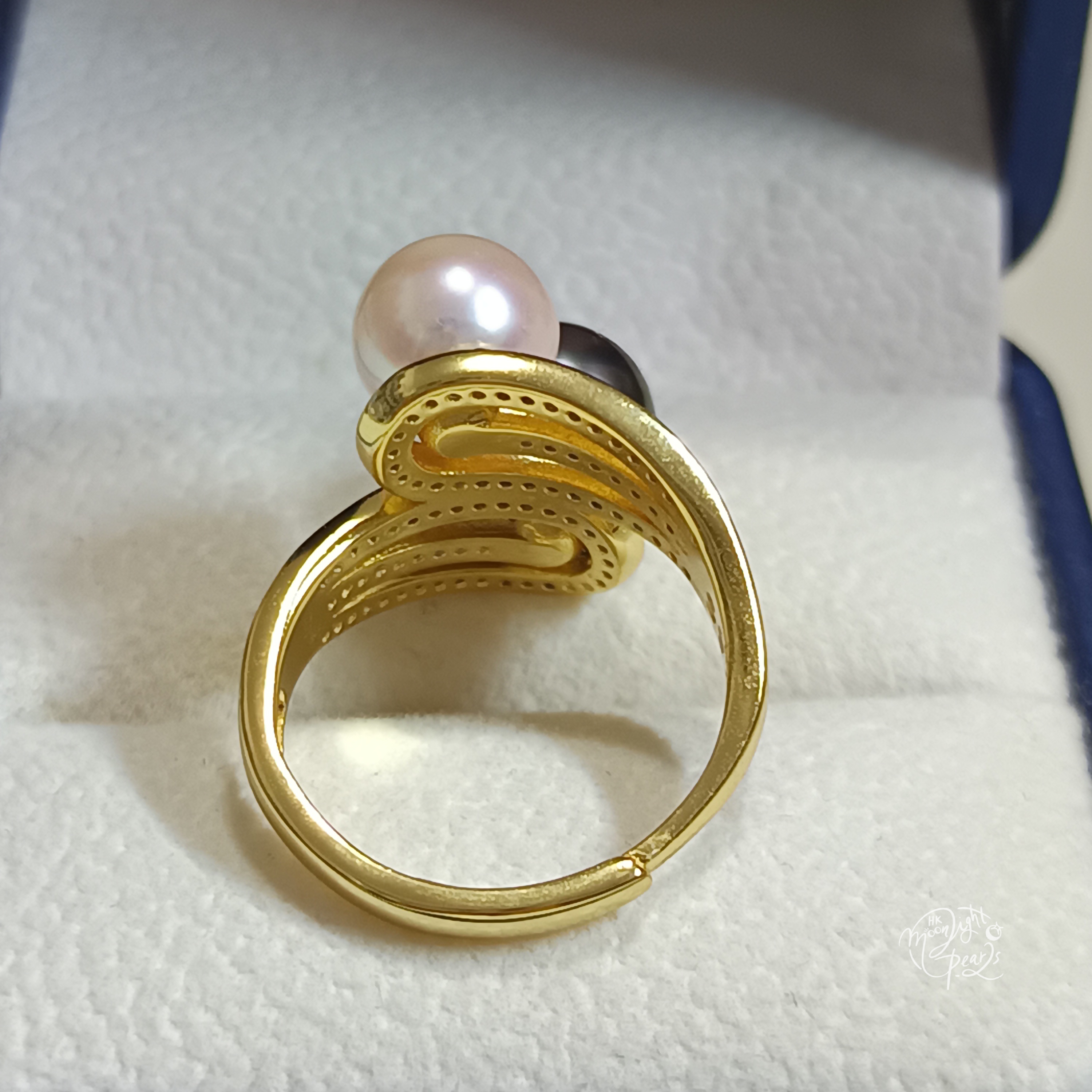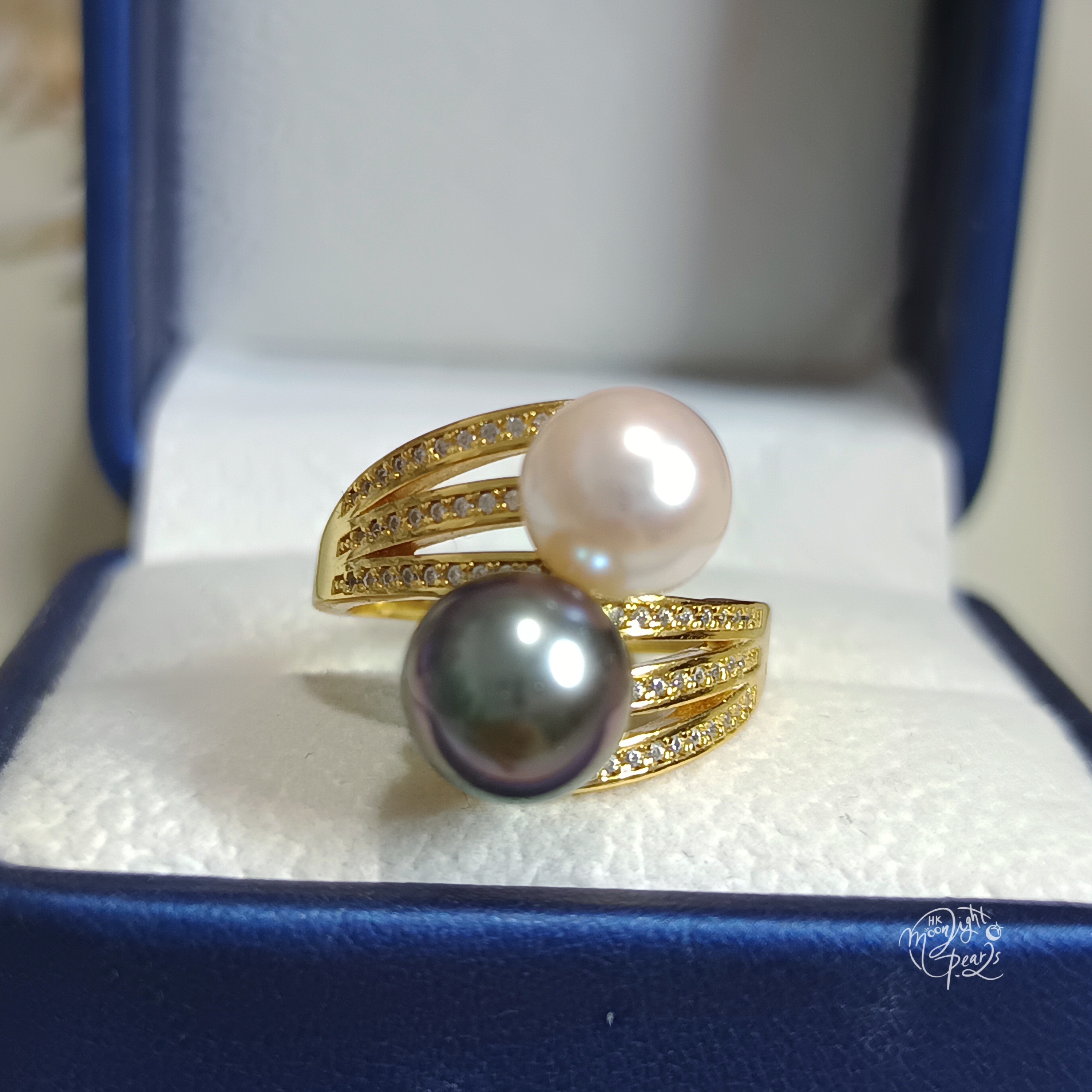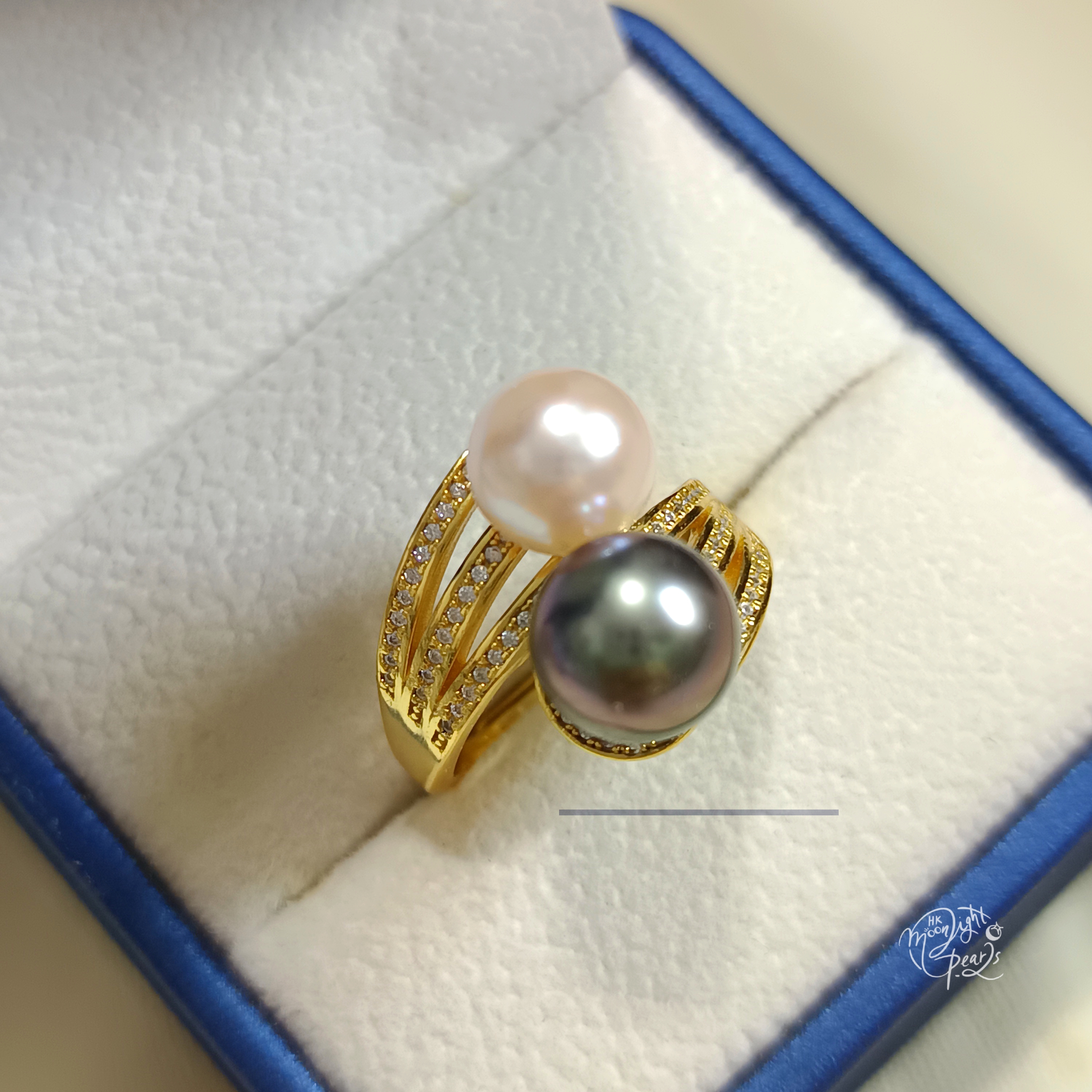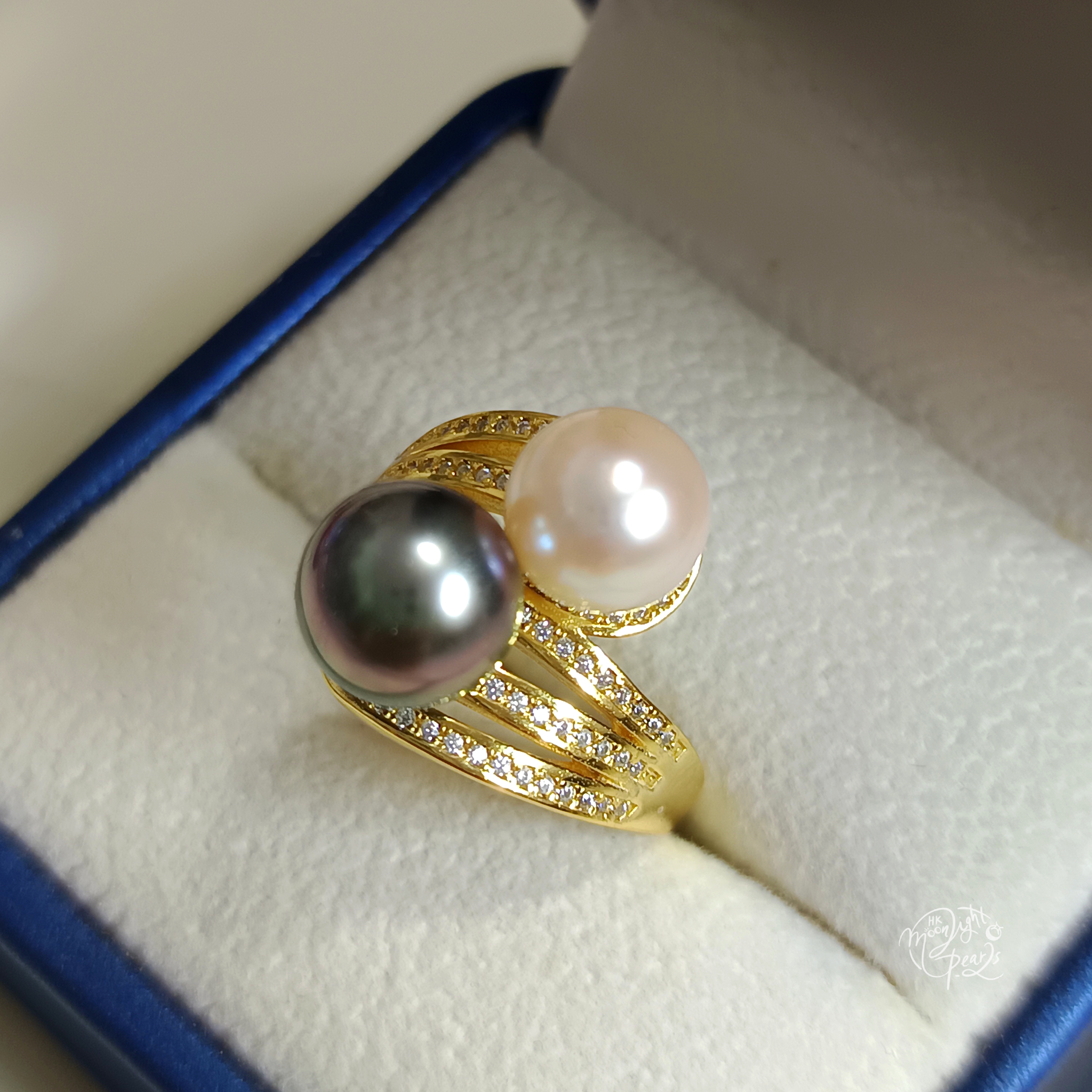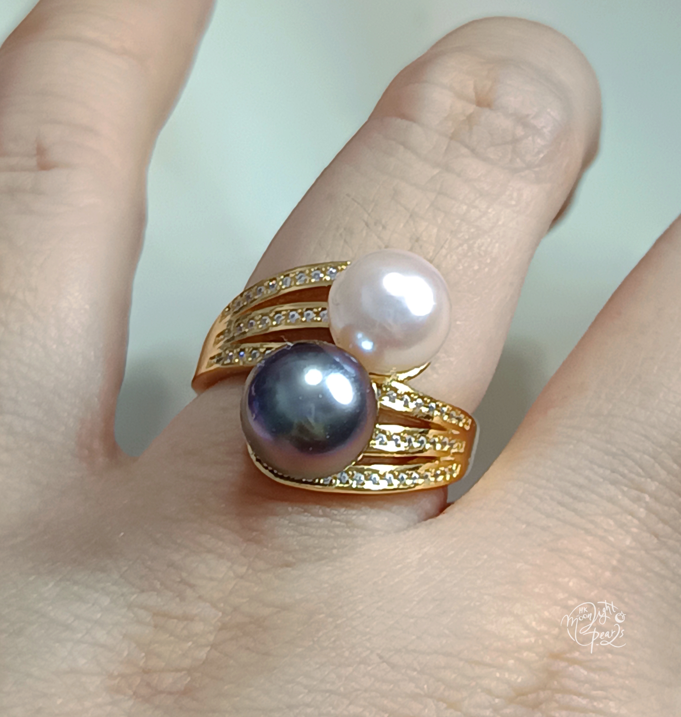 近正圓極光日本akoya櫻花粉海水珍珠+大溪地孔雀紫海水珍珠精工s925銀微鑲鋯石雙珠開口戒指
