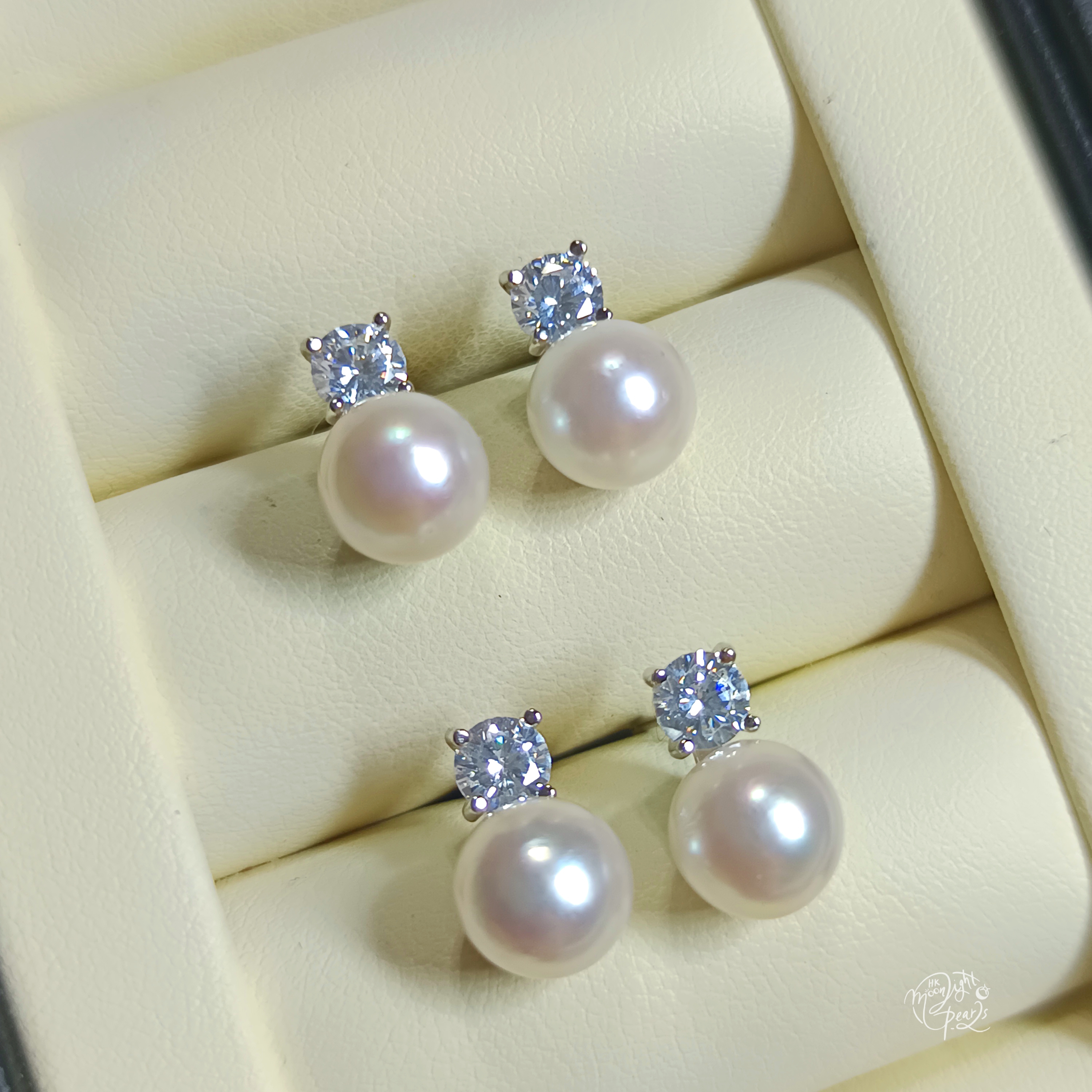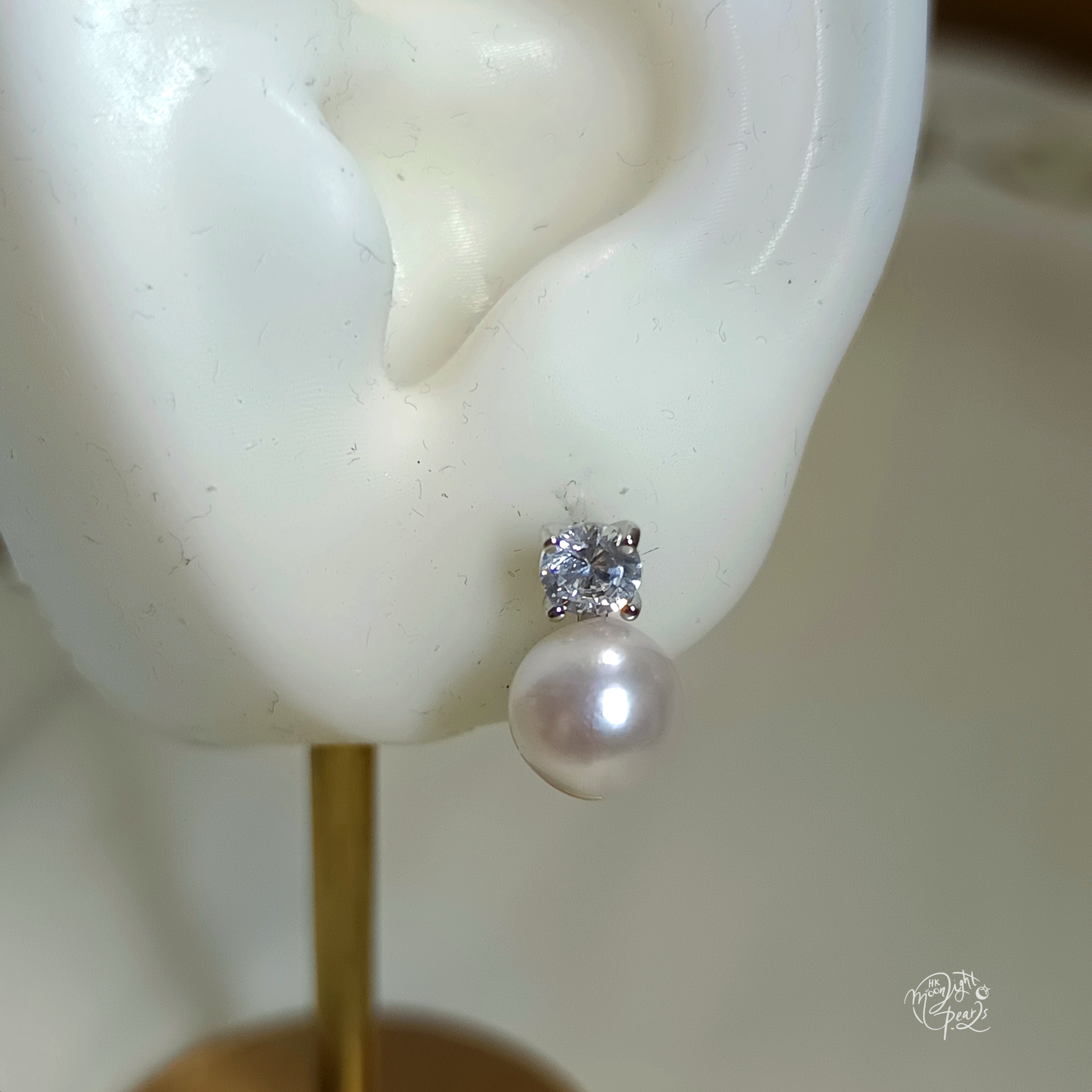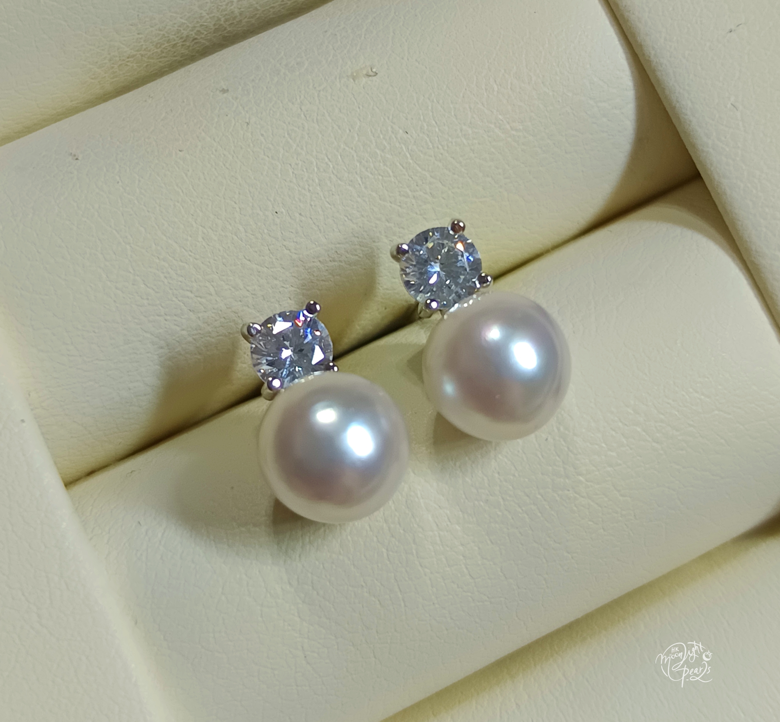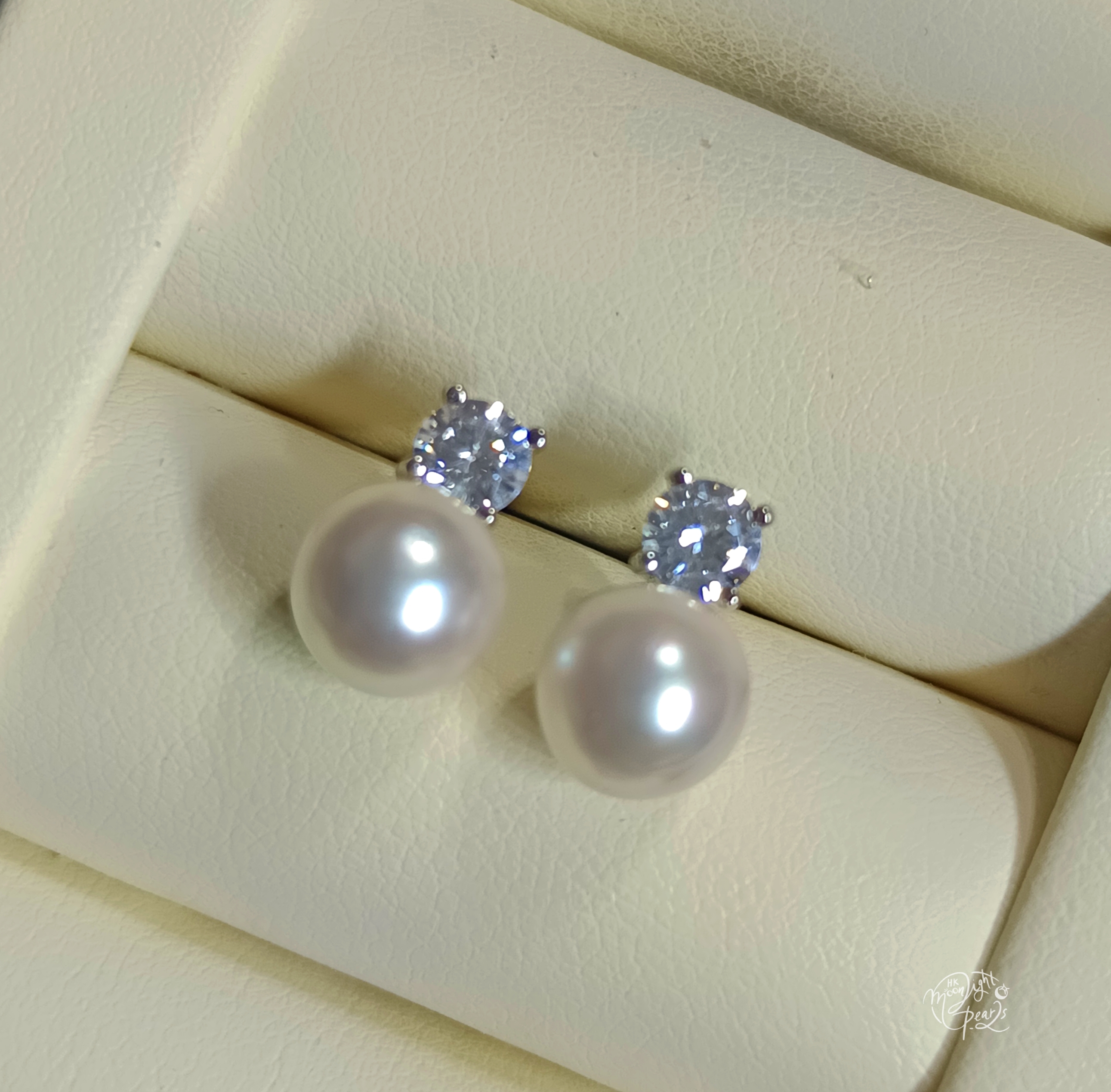 近正圓極光日本akoya櫻花粉海水珍珠精工s925銀微鑲鋯石王妃款耳釘