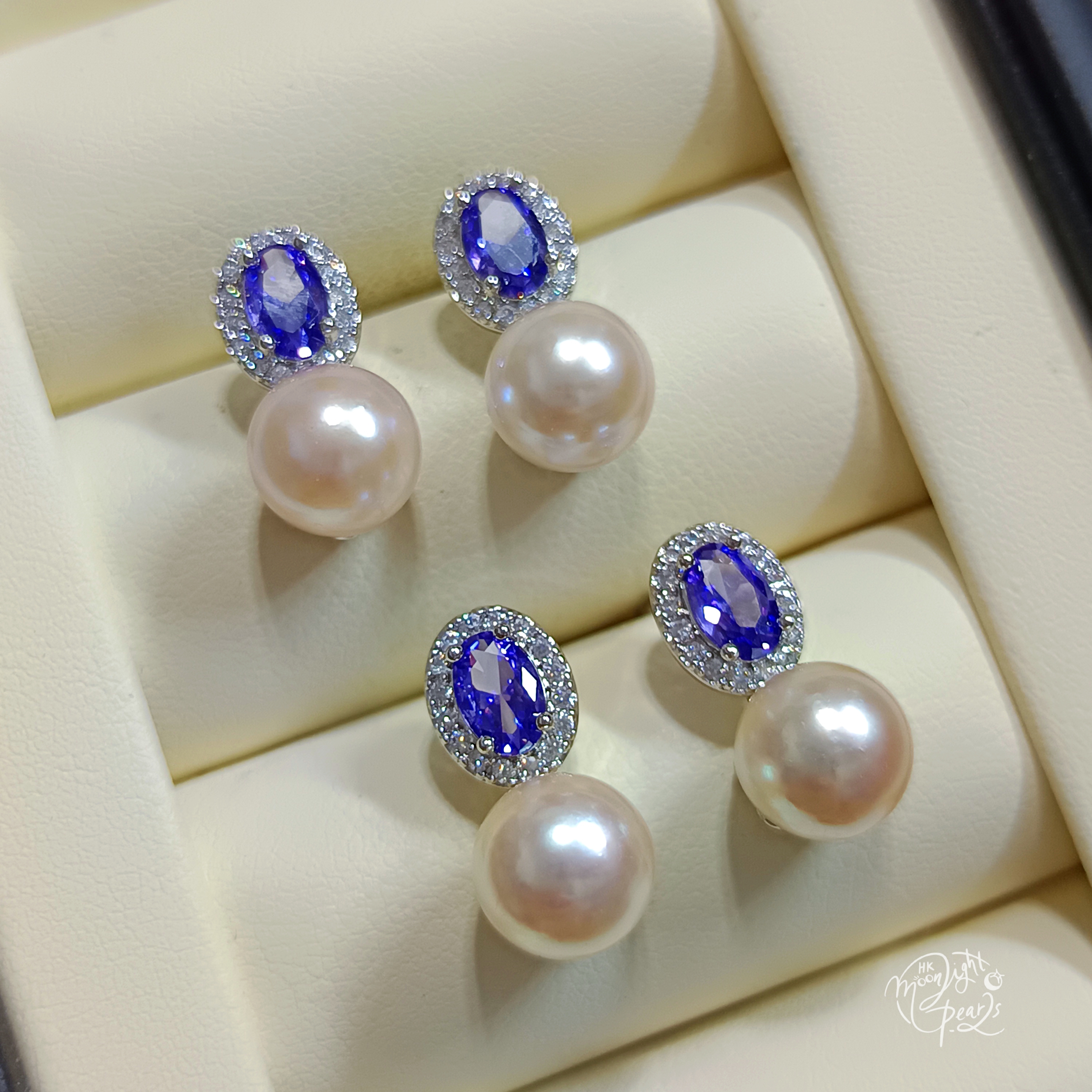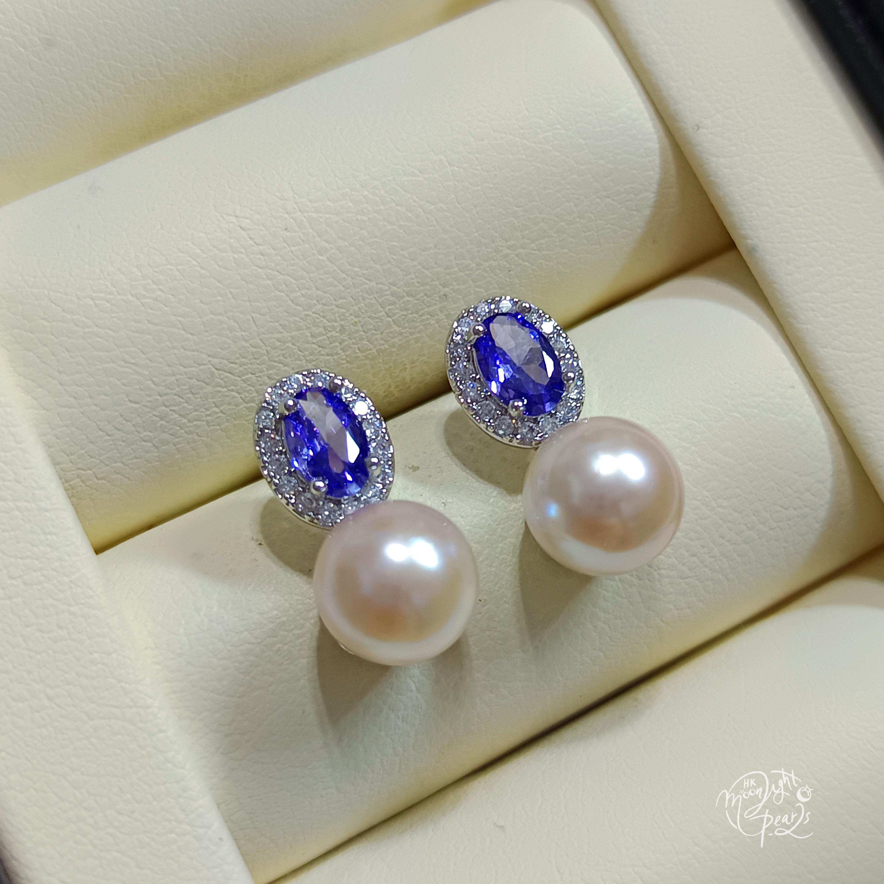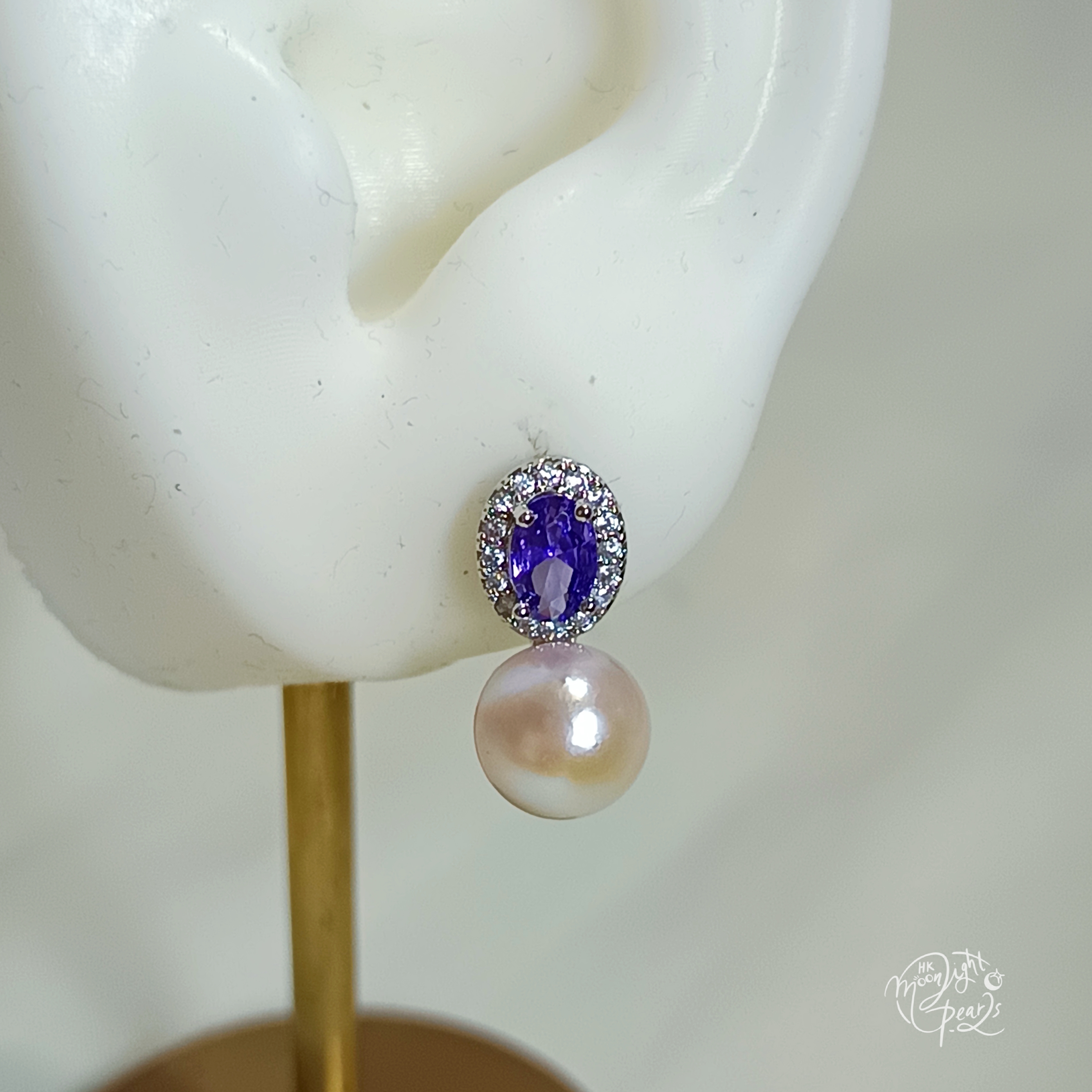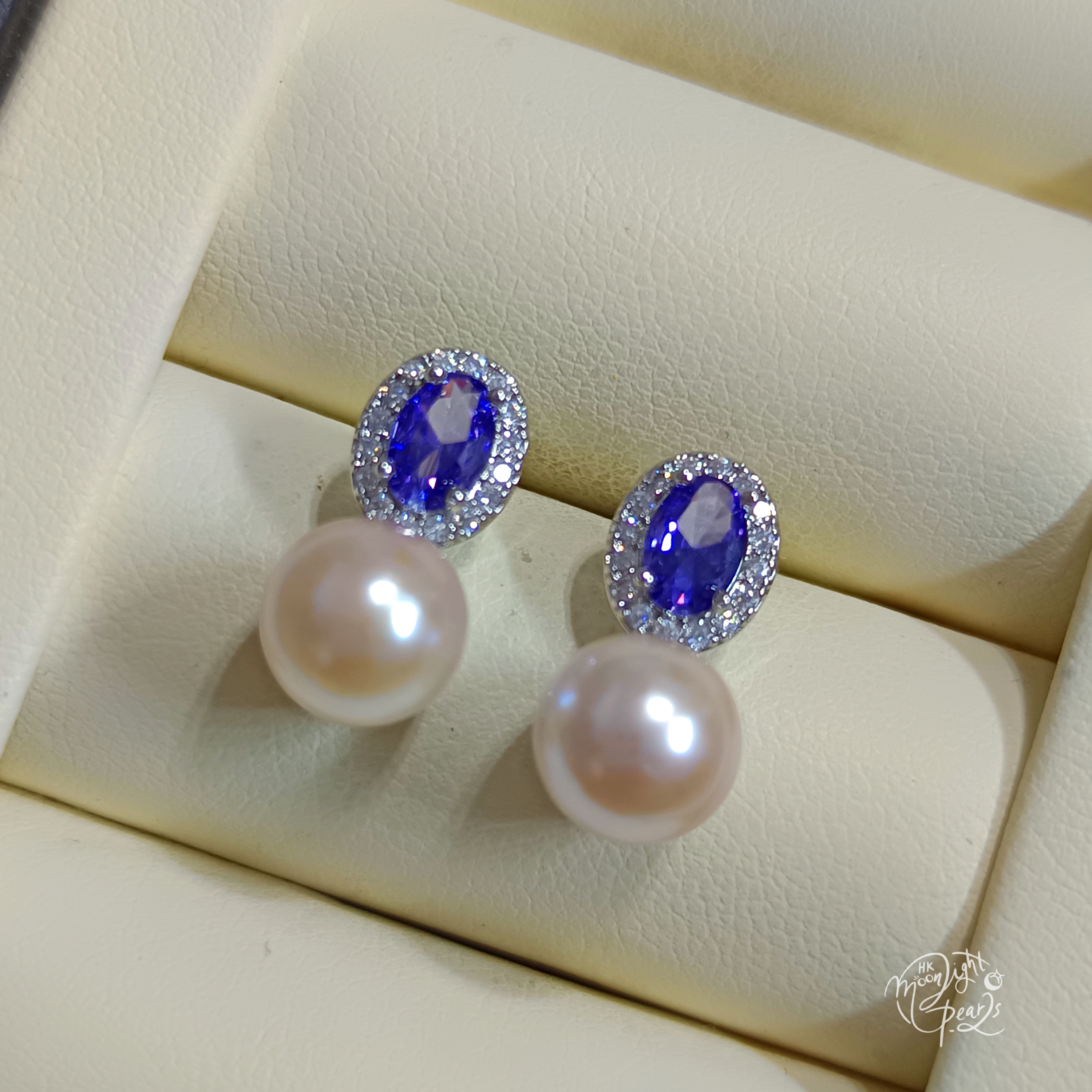 近正圓極光日本akoya超強櫻花粉海水珍珠s925銀針紫水晶耳釘