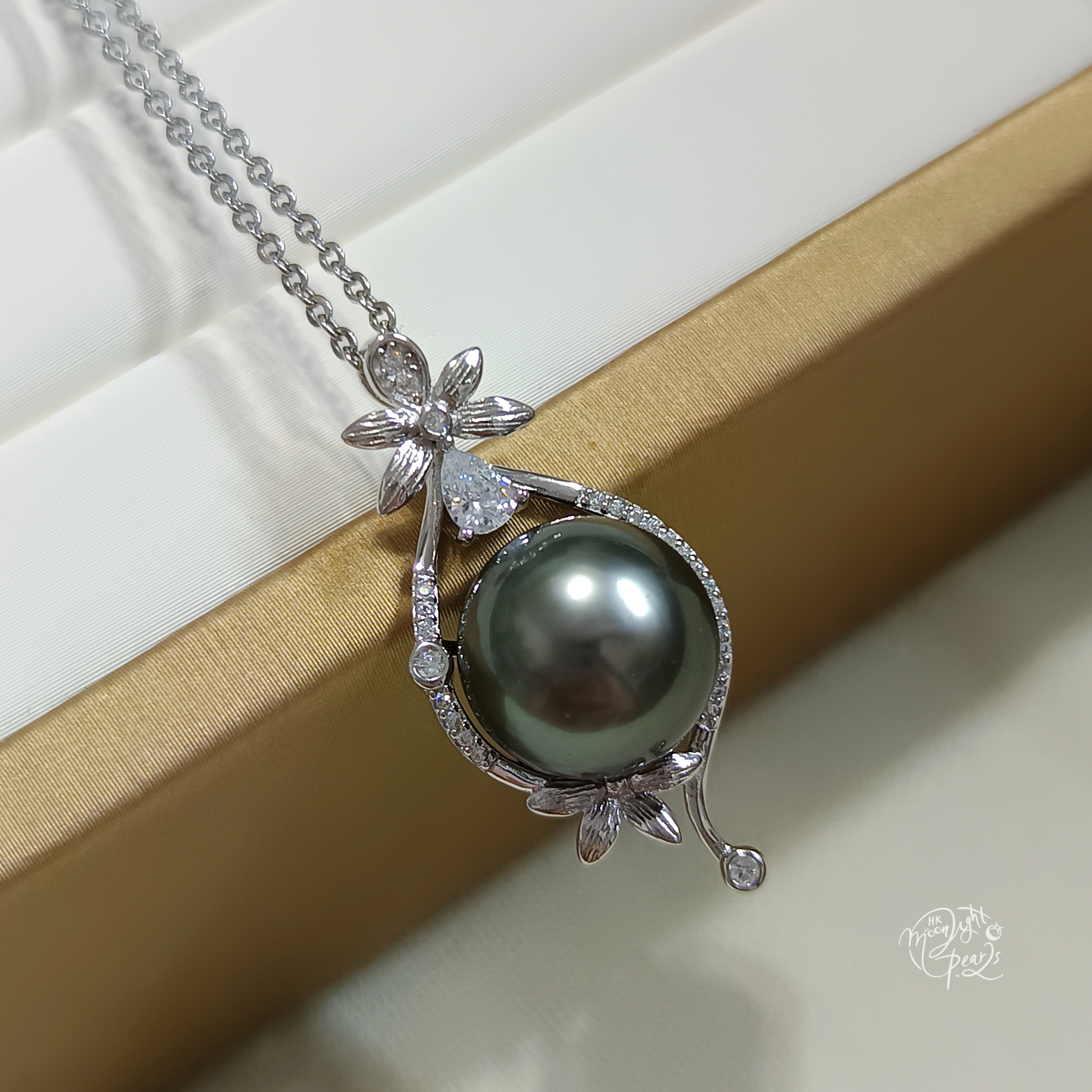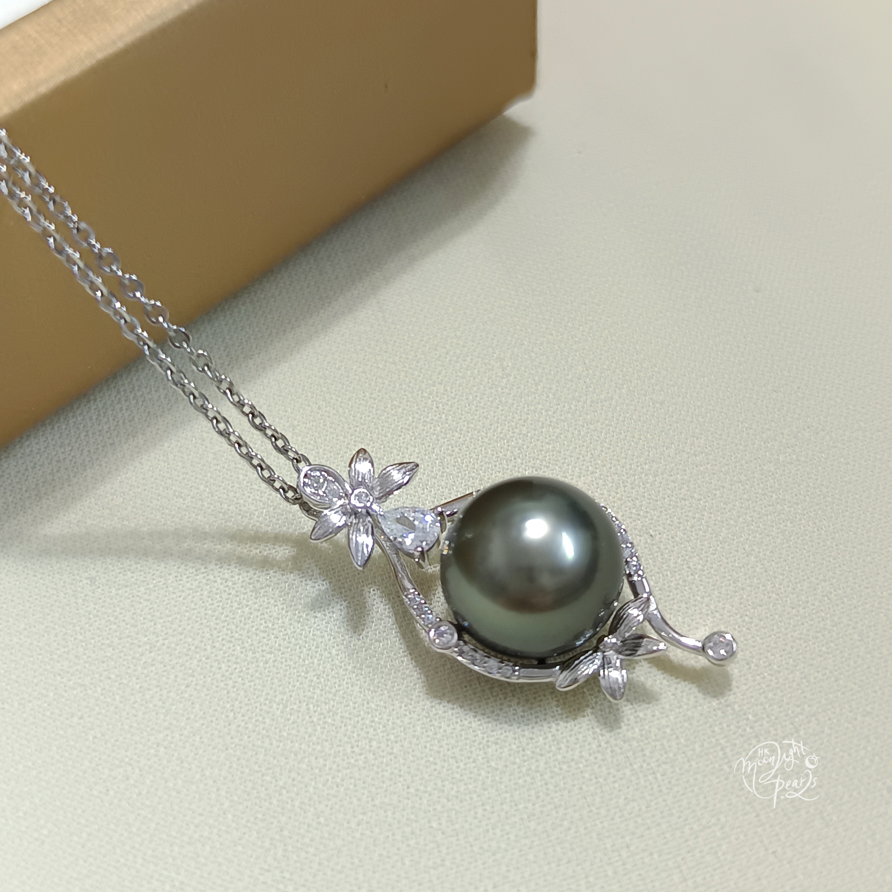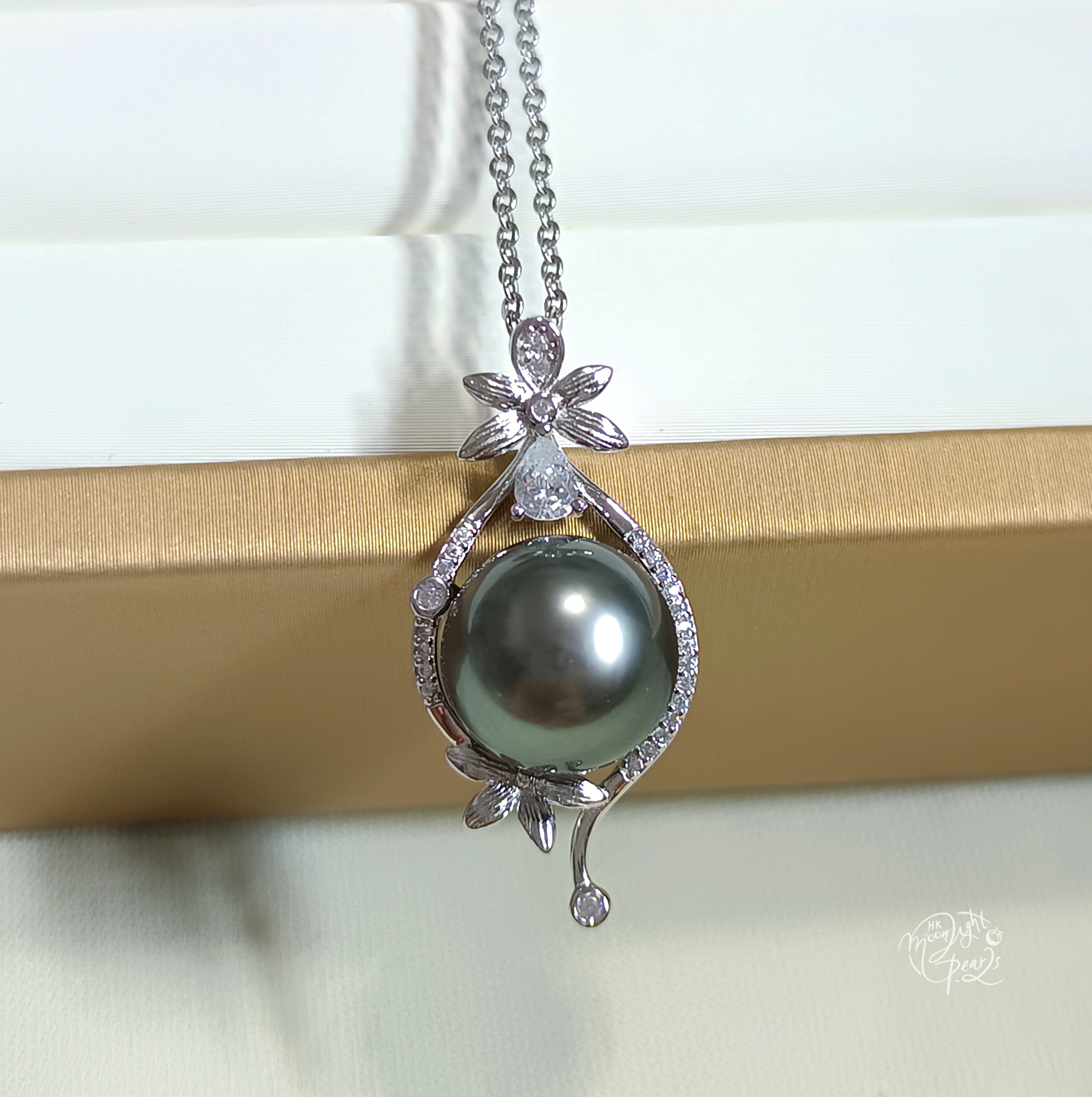 近正圓極強光大溪地黑透綠海水珍珠精工s925銀微鑲鋯石吊墜(送注白金鍊)