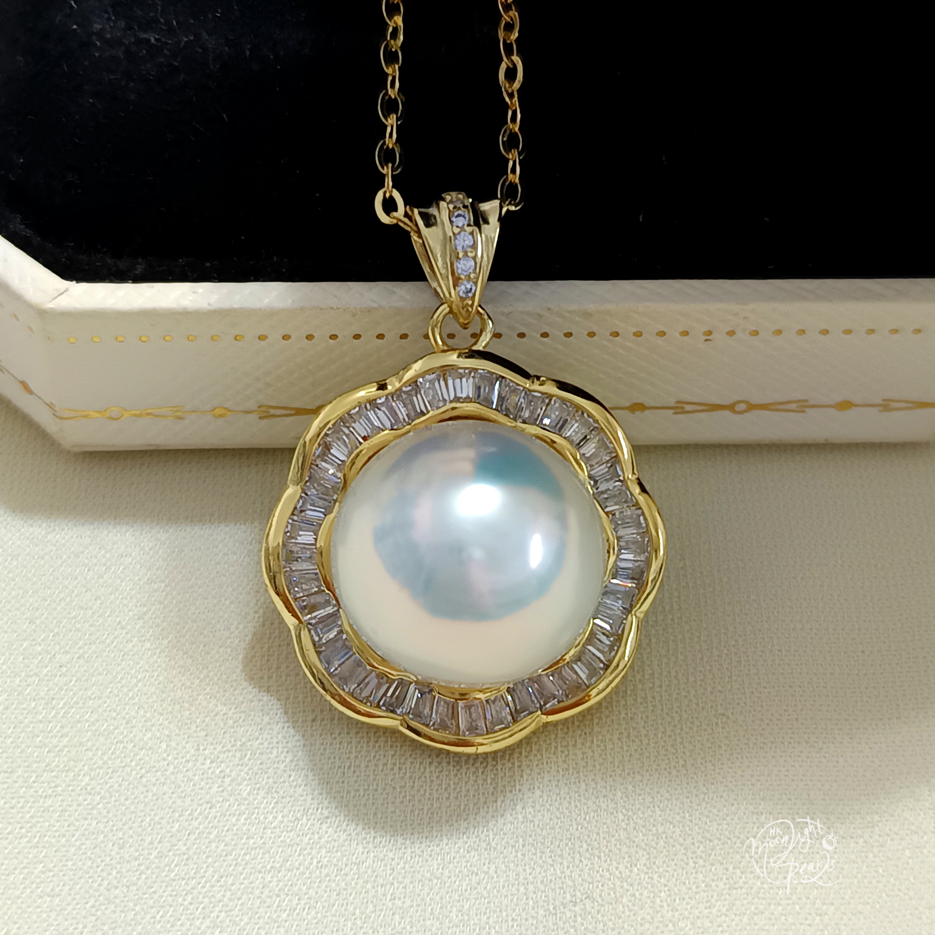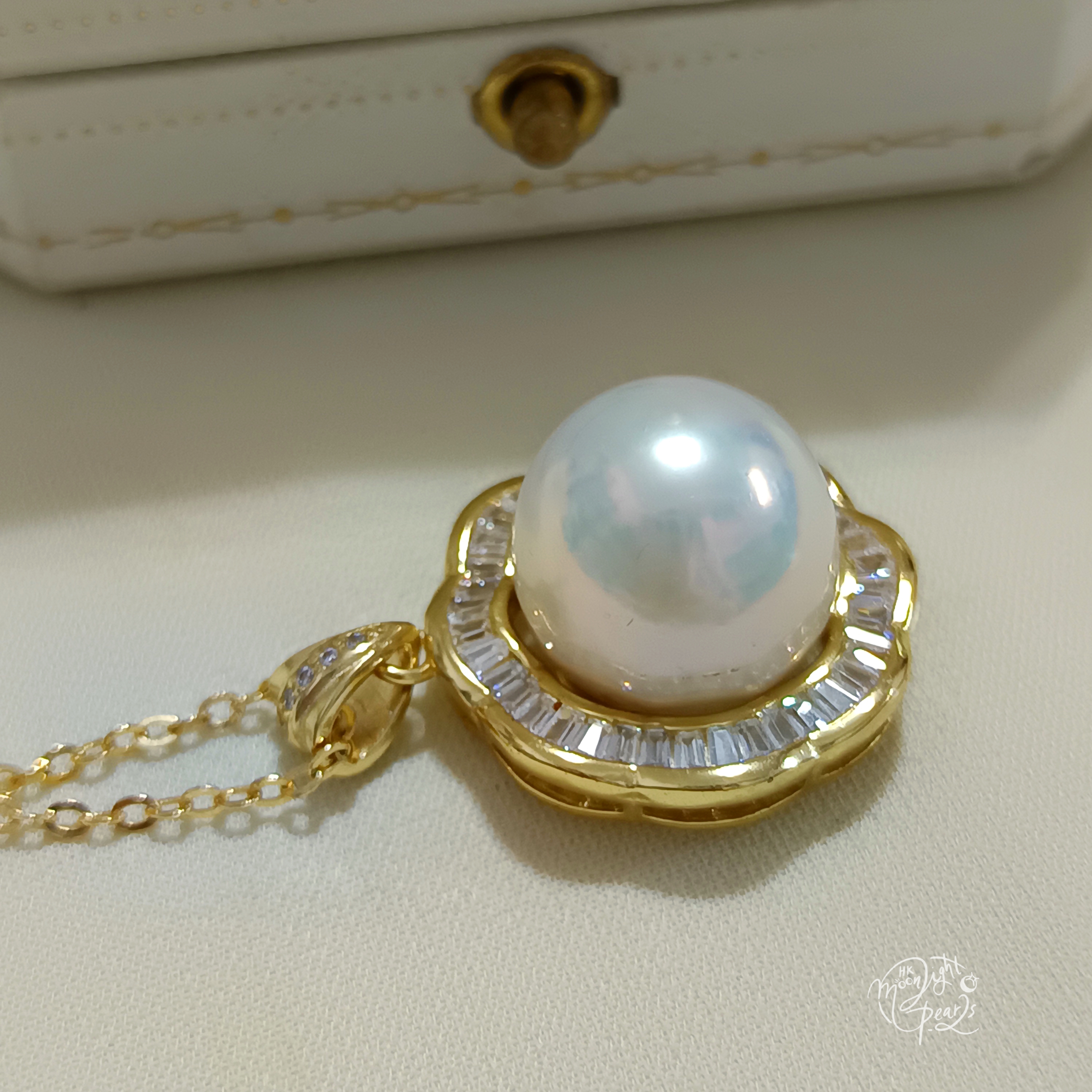 近正圓極強光愛迪妖白透青冷光珍珠鑲鋯石925銀吊墜(送注金鍊)