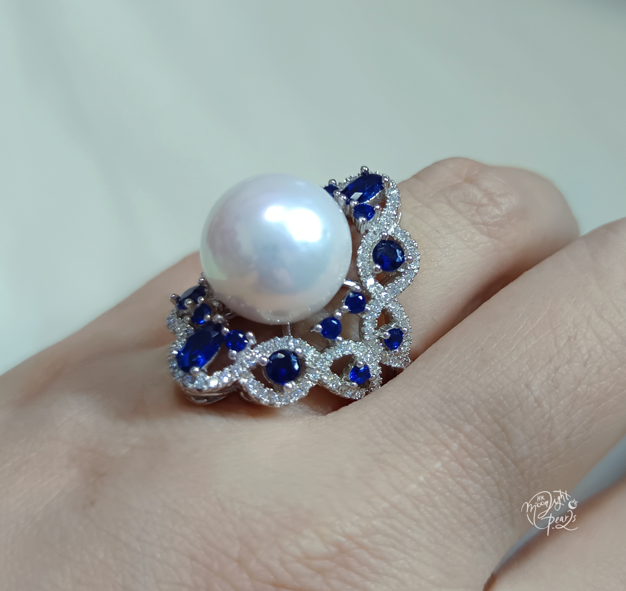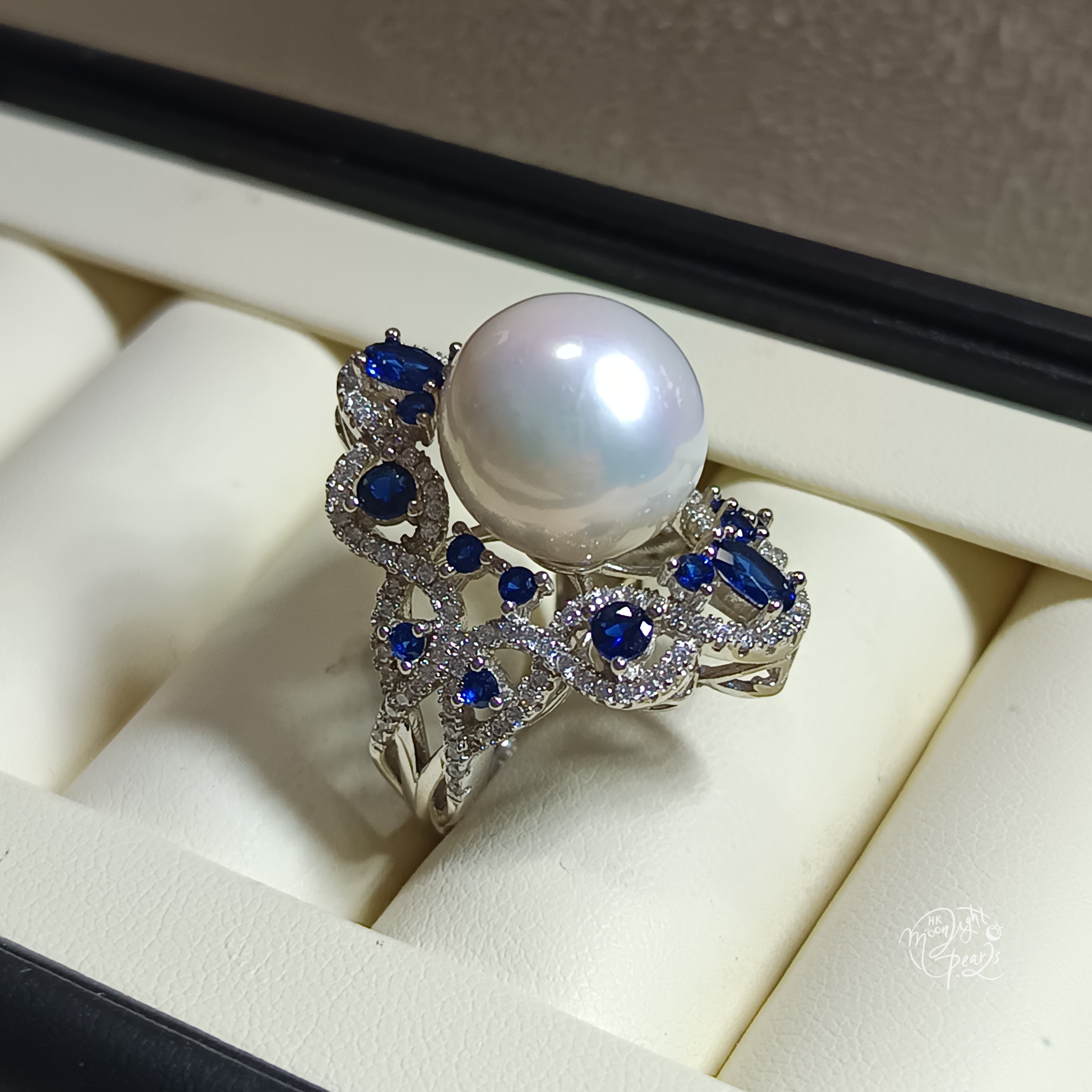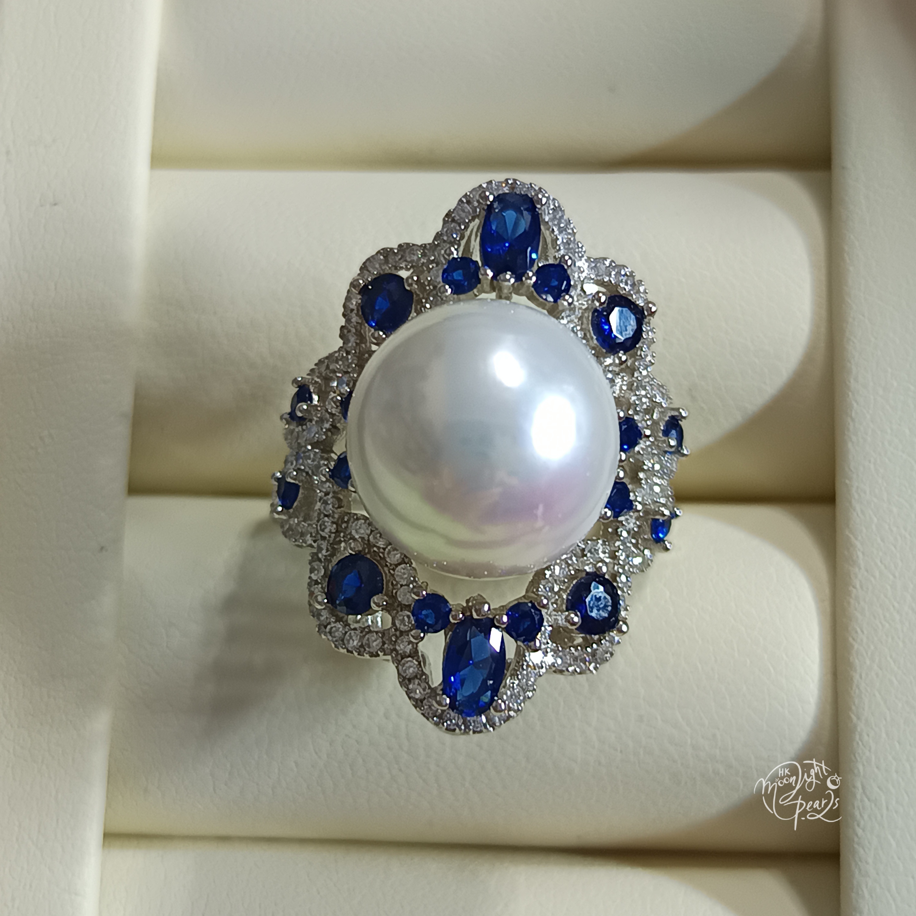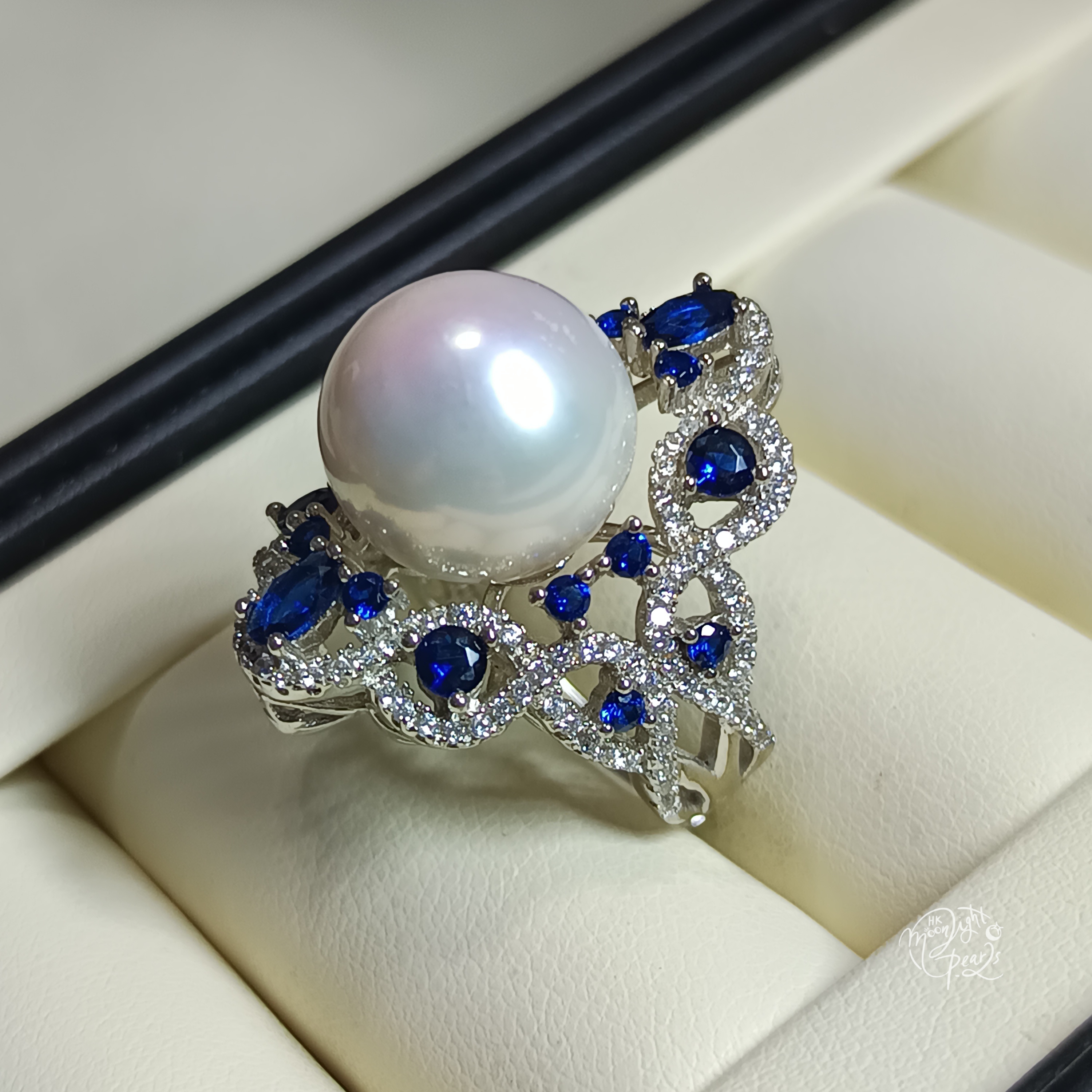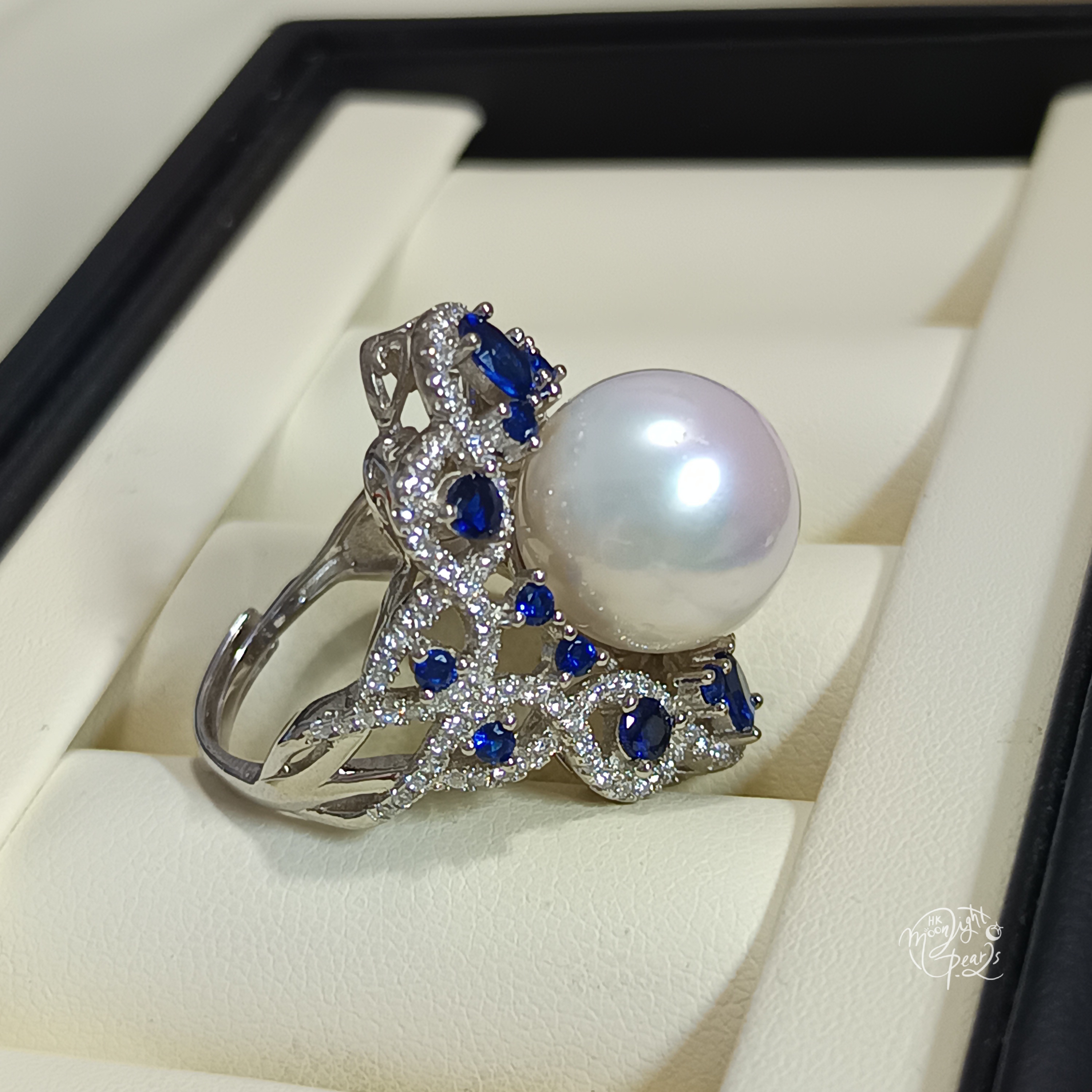 近正圓極強光愛迪生冷白透微色珍珠精工s925銀鑲藍鋯石奢華開口戒指