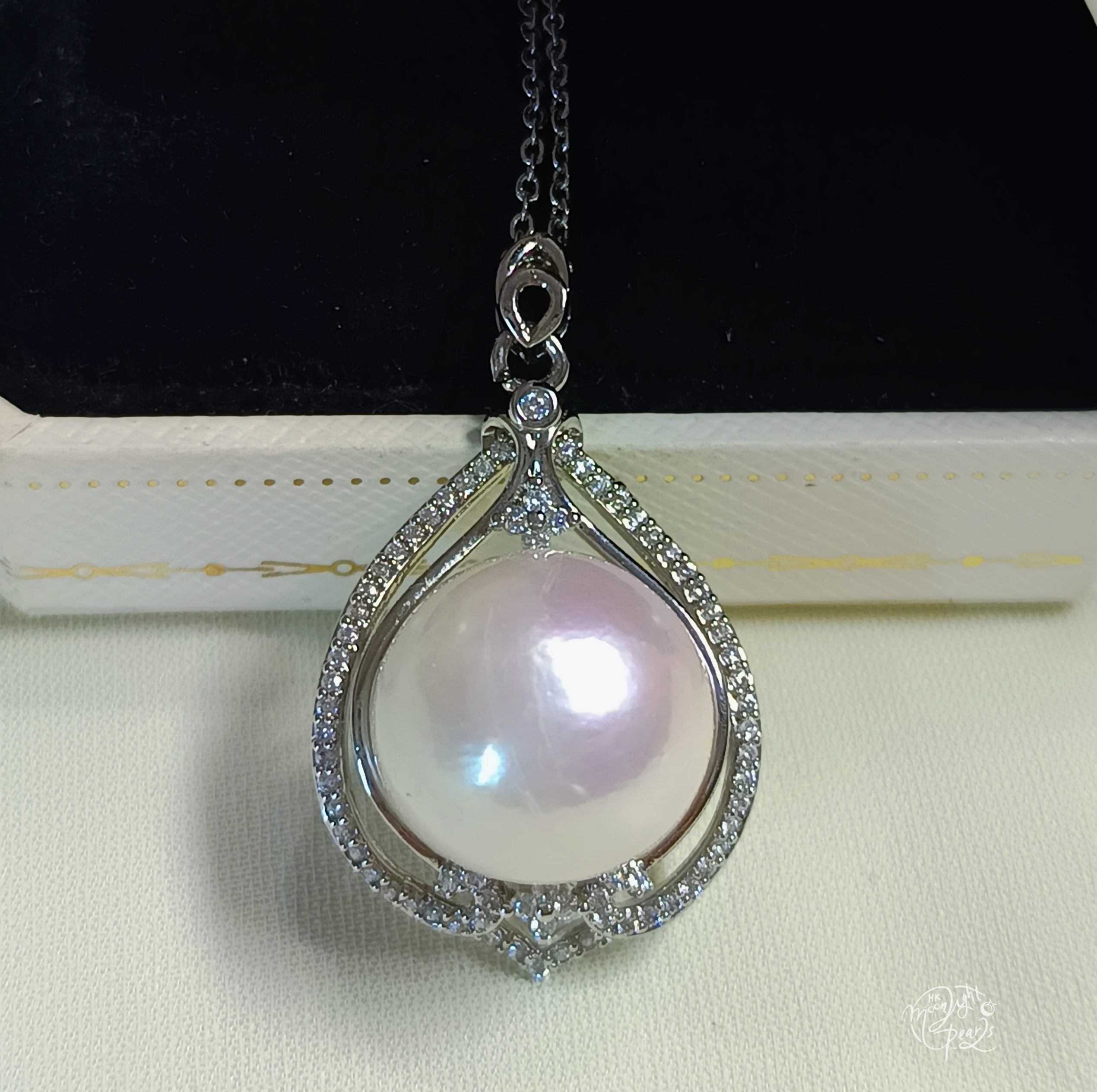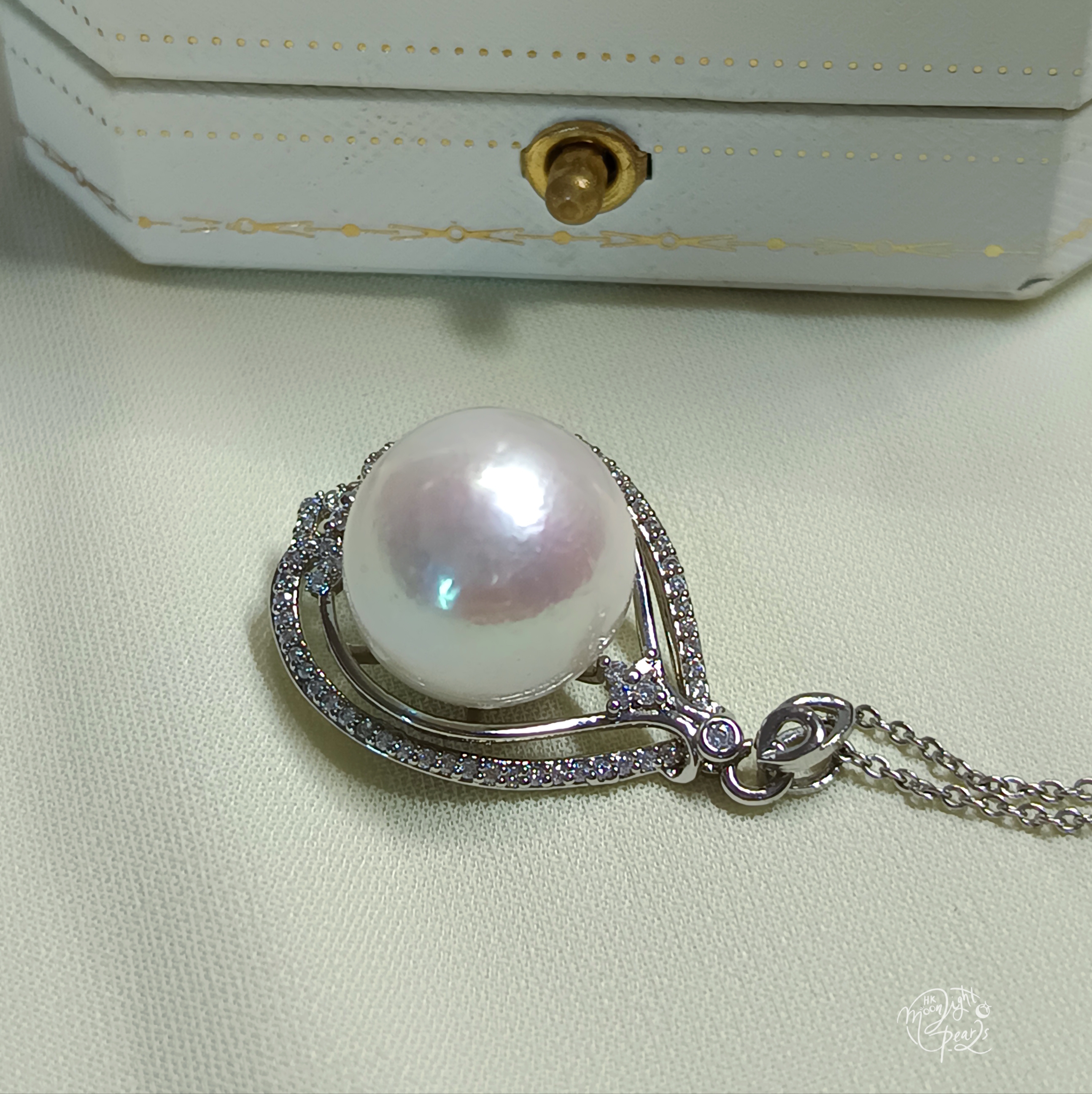 近正圓極強光愛迪生冷白透粉光珍珠鑲鋯石注白金吊墜(送注白金鍊)