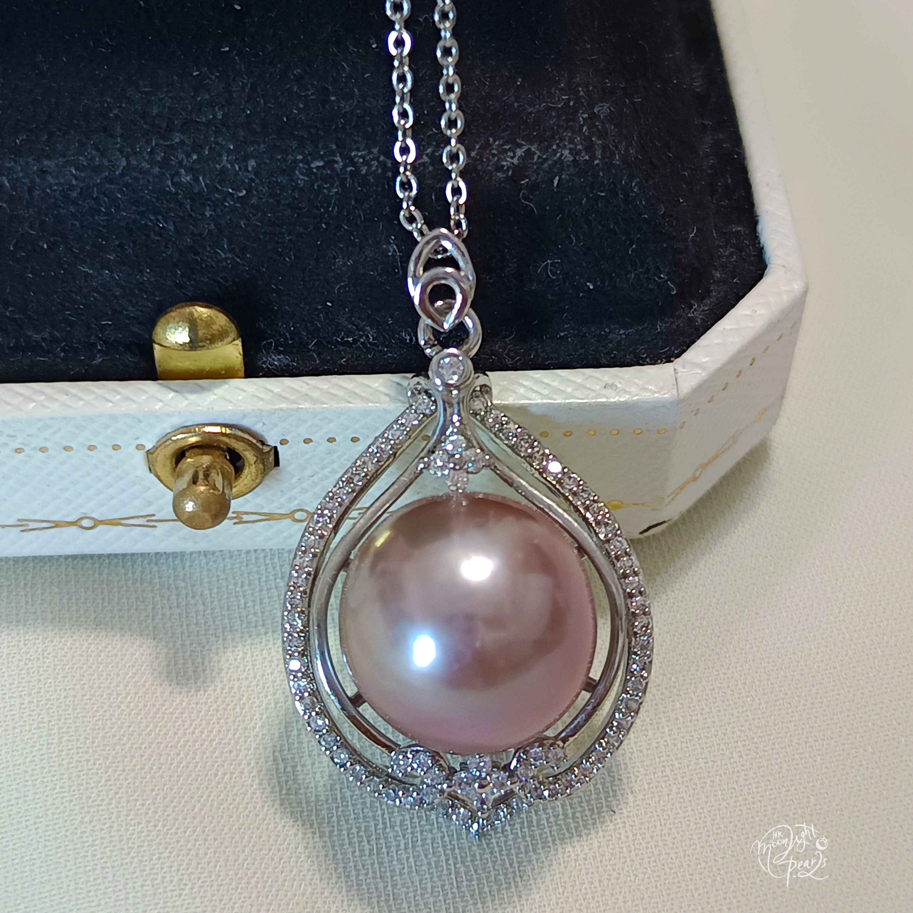 近正圓極強光愛迪生炫彩粉紫色珍珠鑲鋯石注白金吊墜(送注白金鍊)
