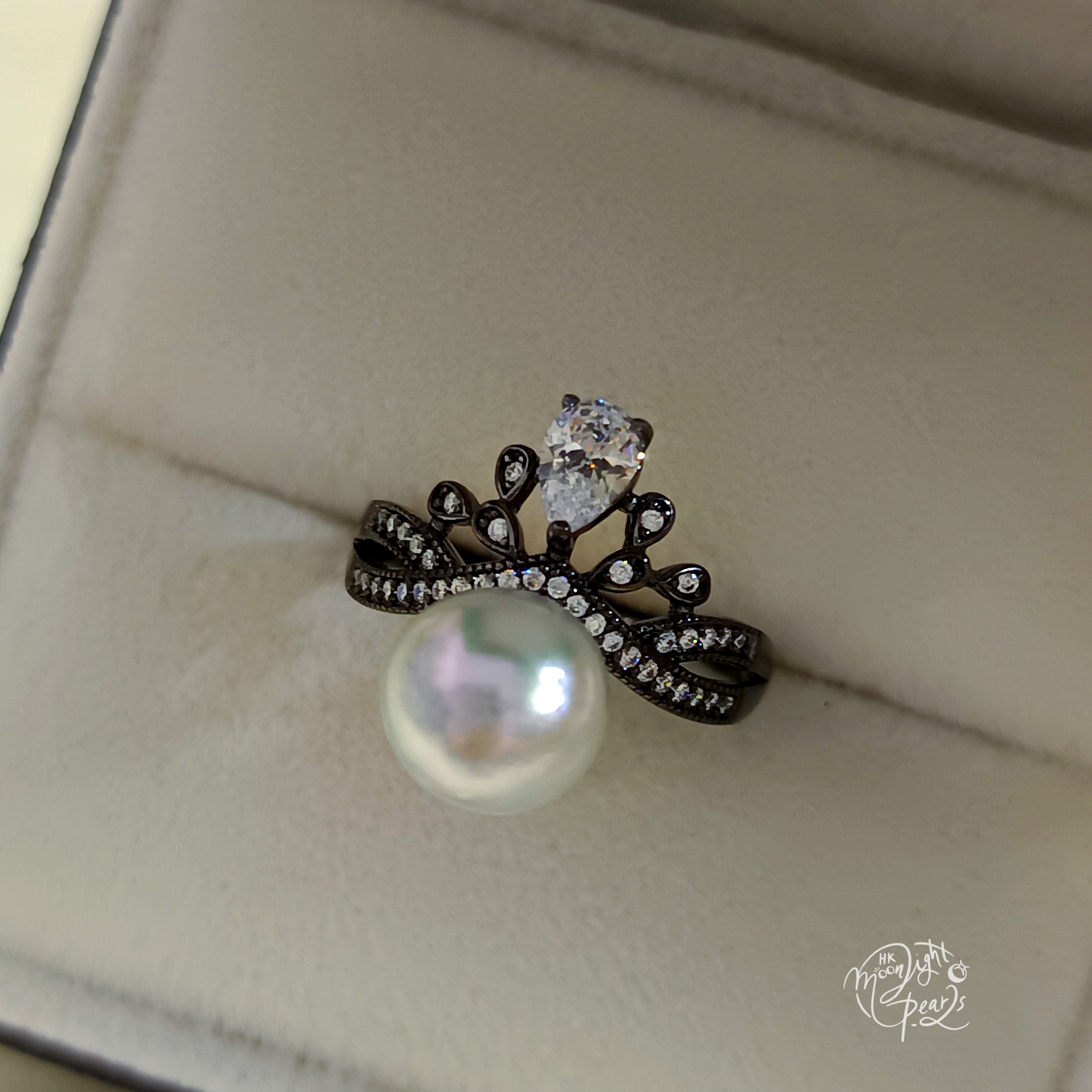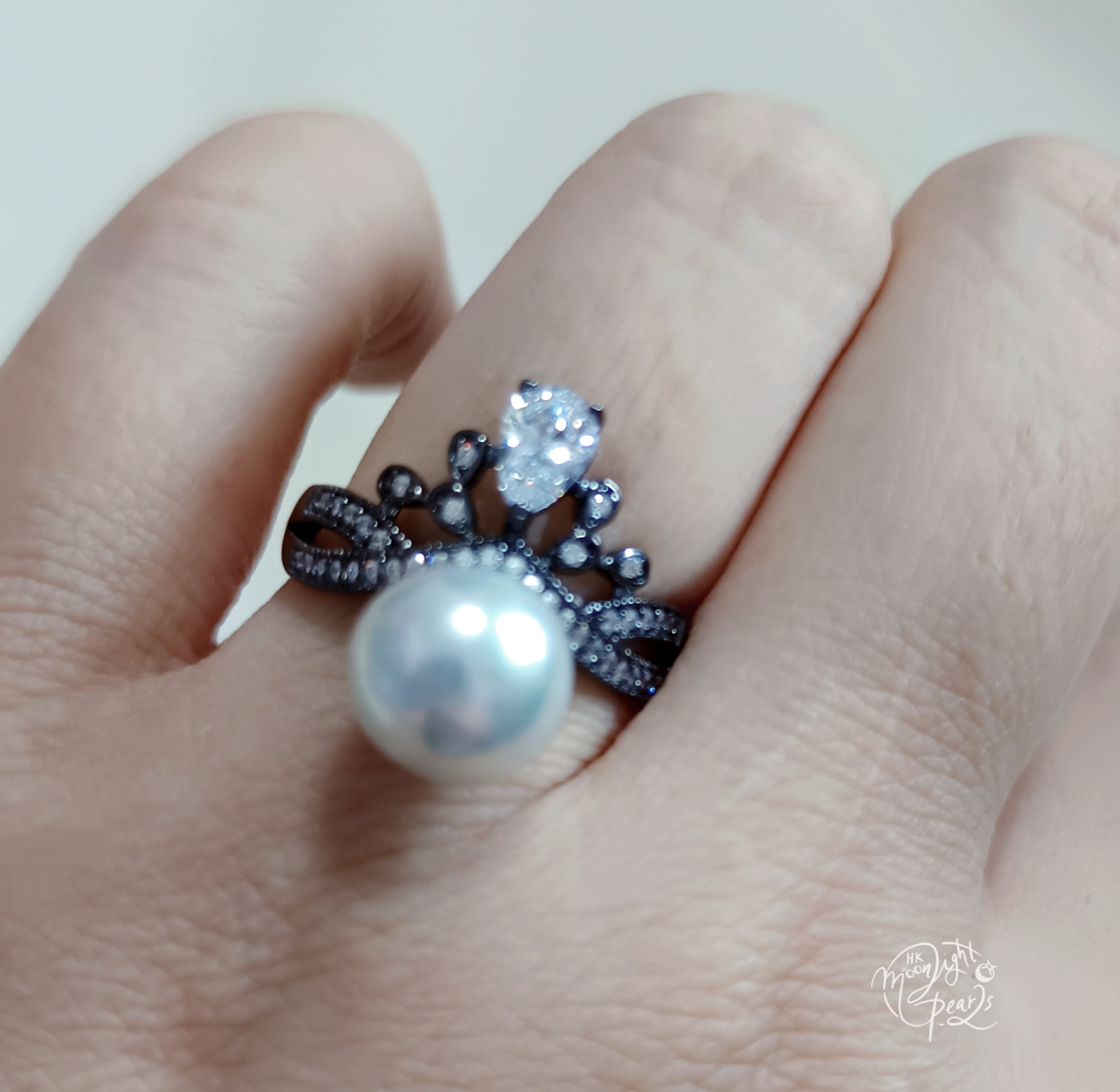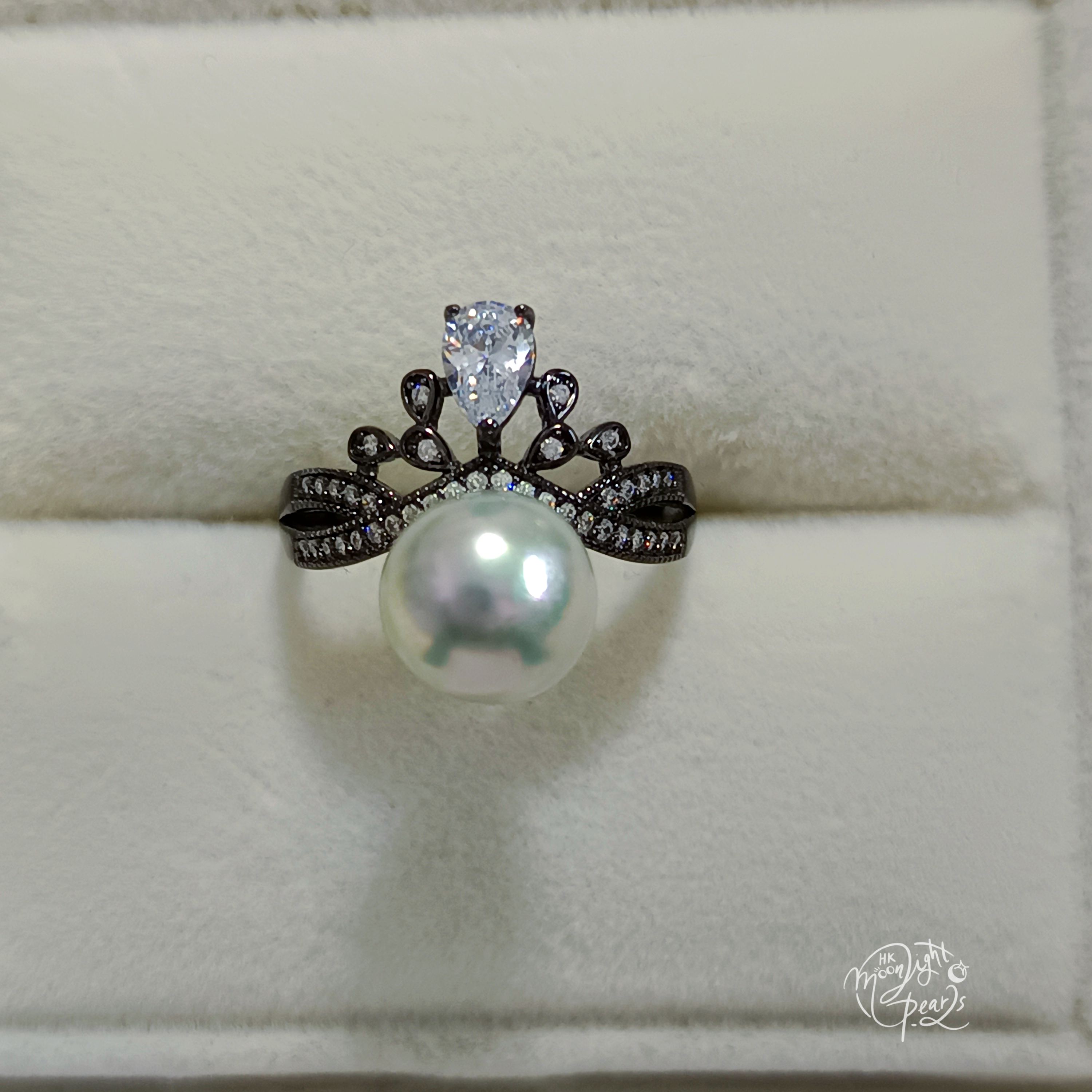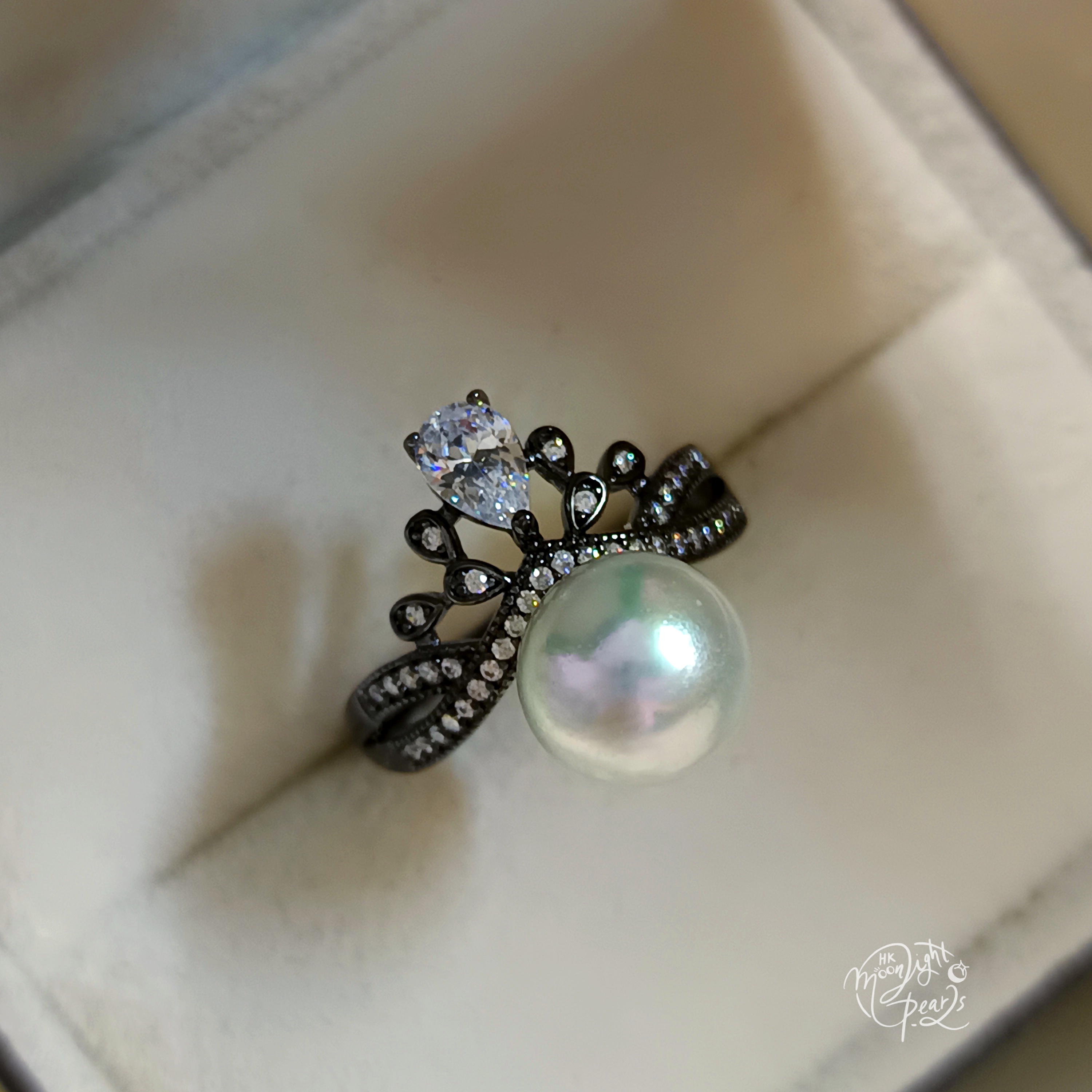 近正圓極強光日本無調色真多麻海水珍珠精工s925銀微鑲綠鋯石暗黑元素口戒指