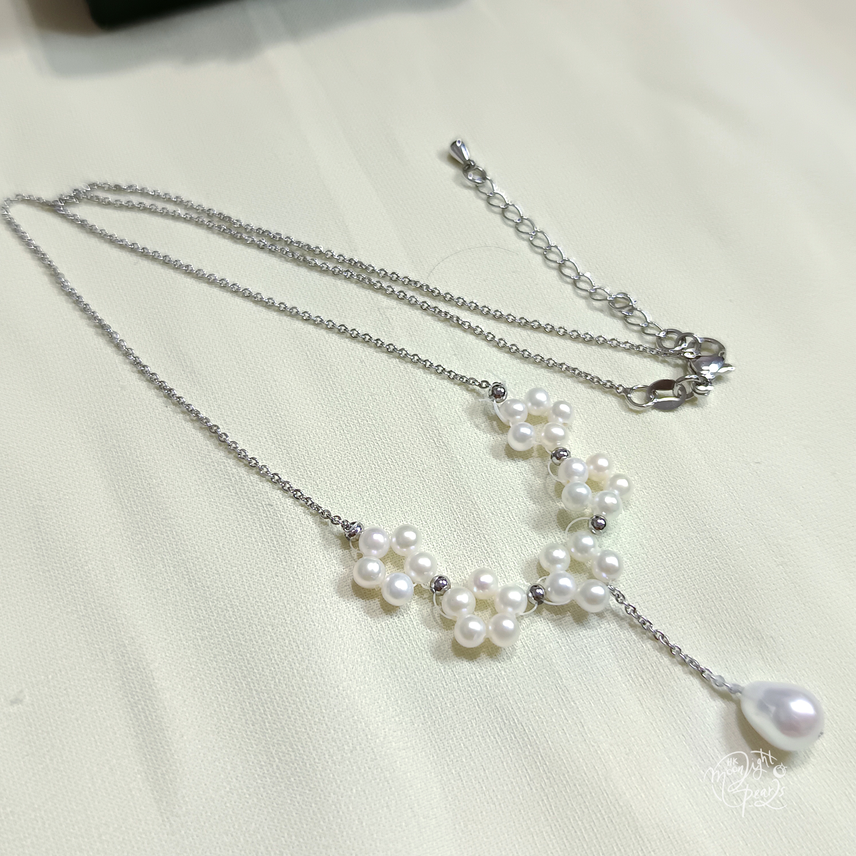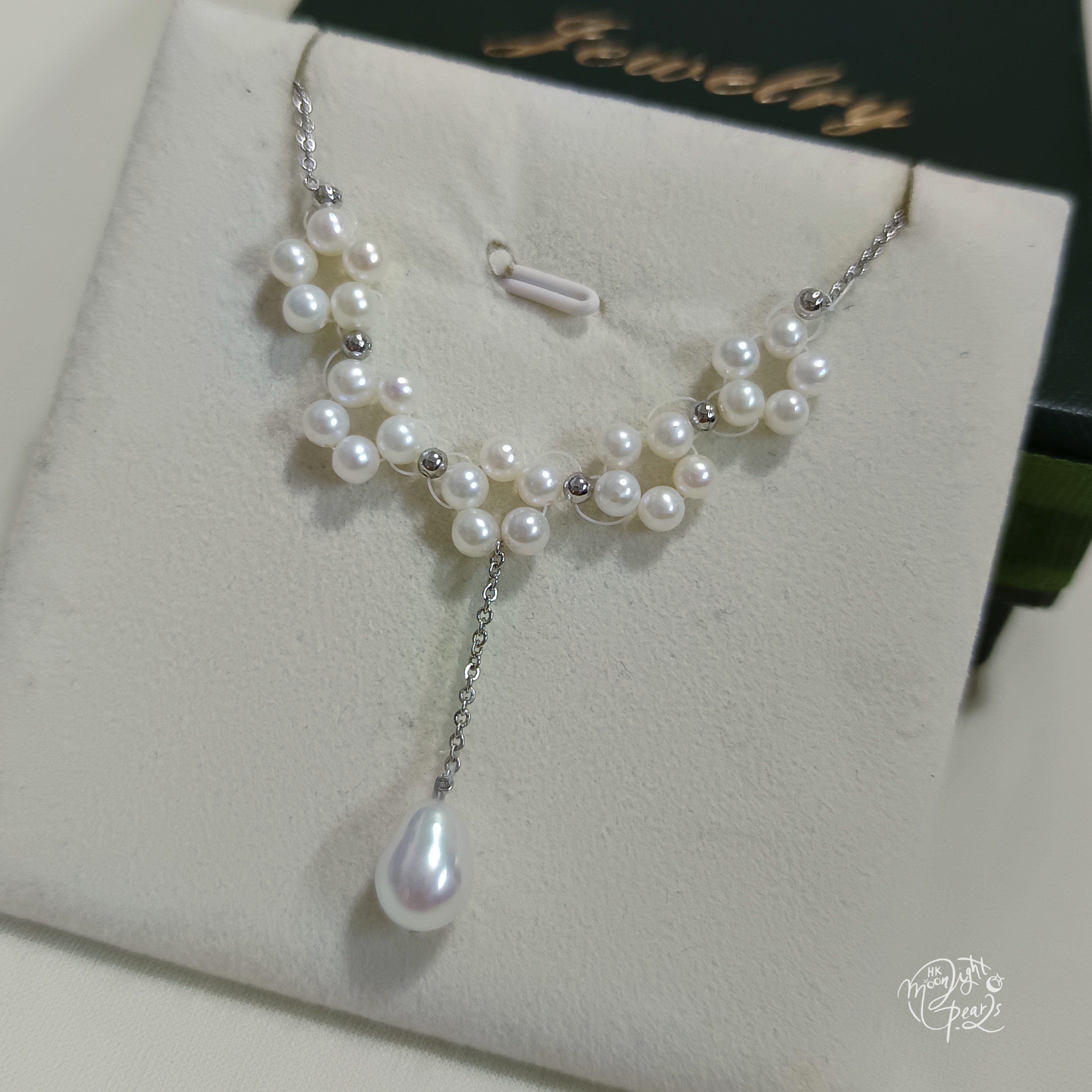 近正圓極強光淡水AK 白細胞珍珠手工編織五朵小花注白金時尚甜美項鍊