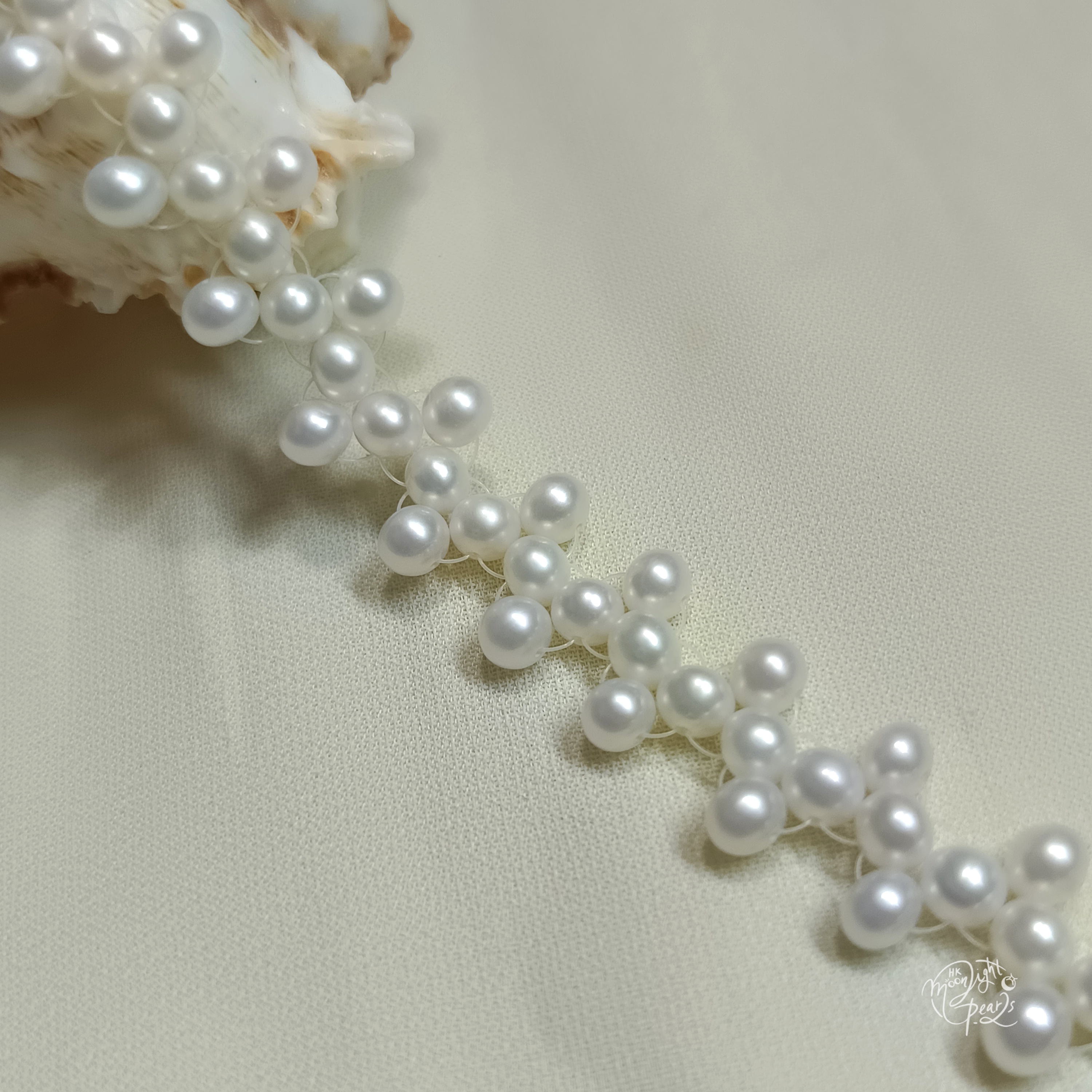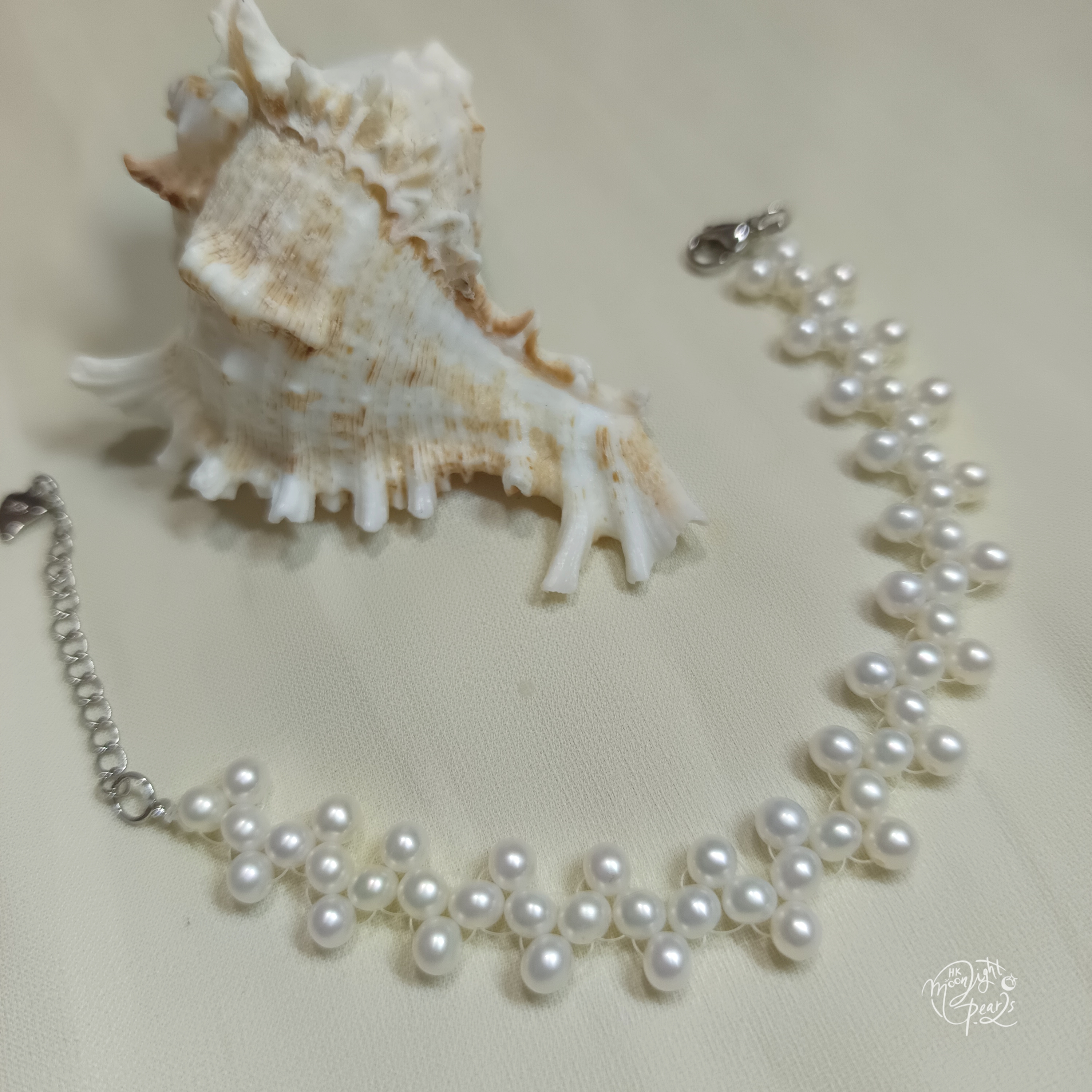 近正圓極強光淡水AK 白細胞珍珠手工編織波浪款注白金尾鍊扣手鍊